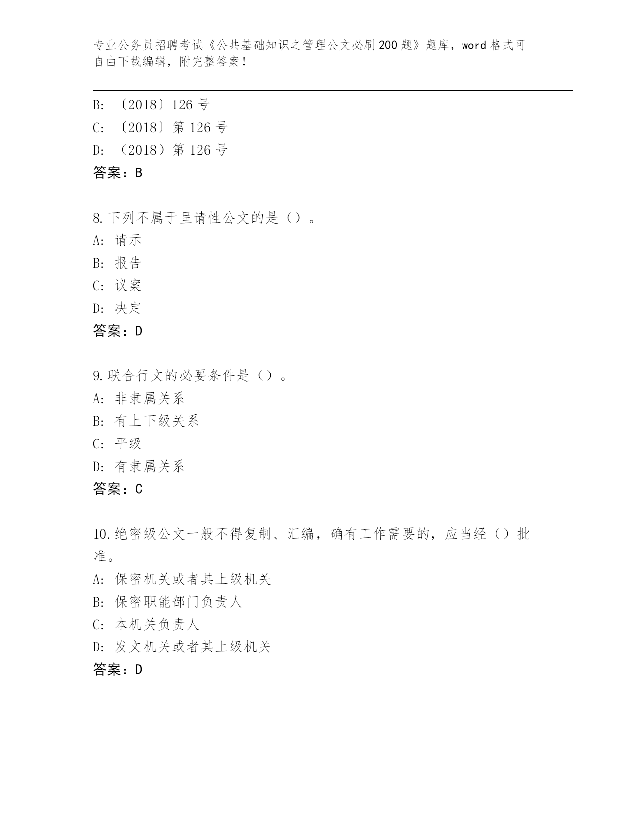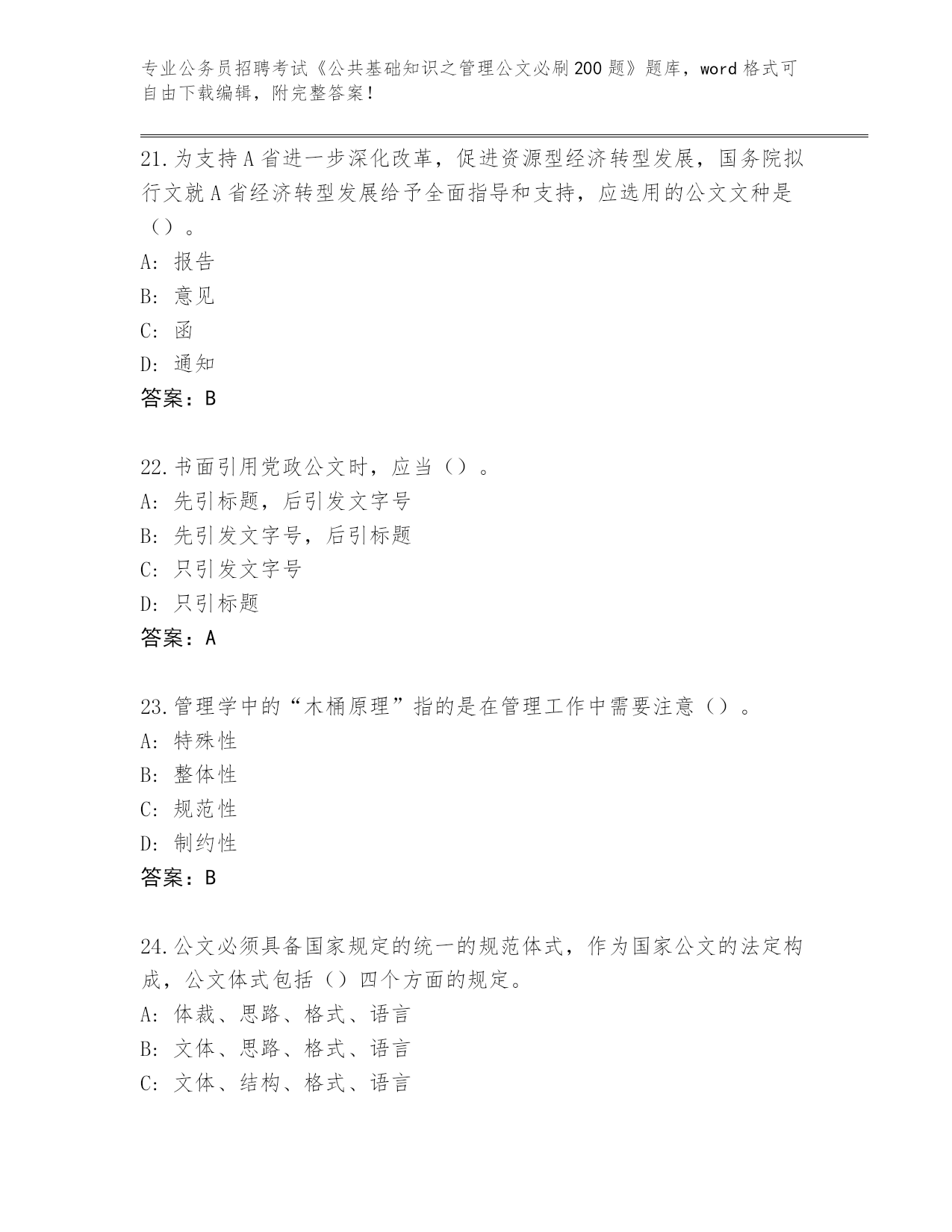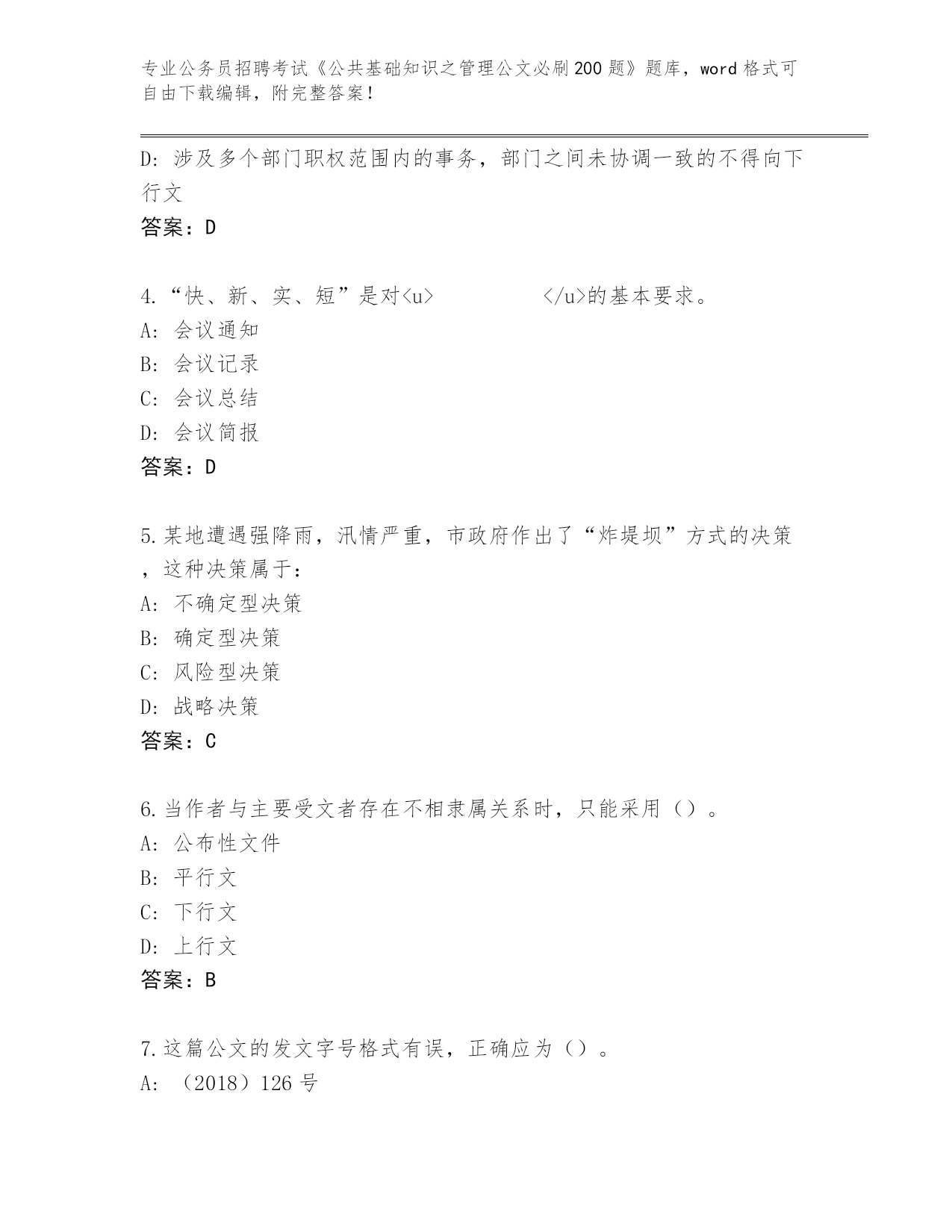 甘肃省宁县公务员招聘考试《公共基础知识之管理公文必刷200题》完整题库及答案【历年真题】