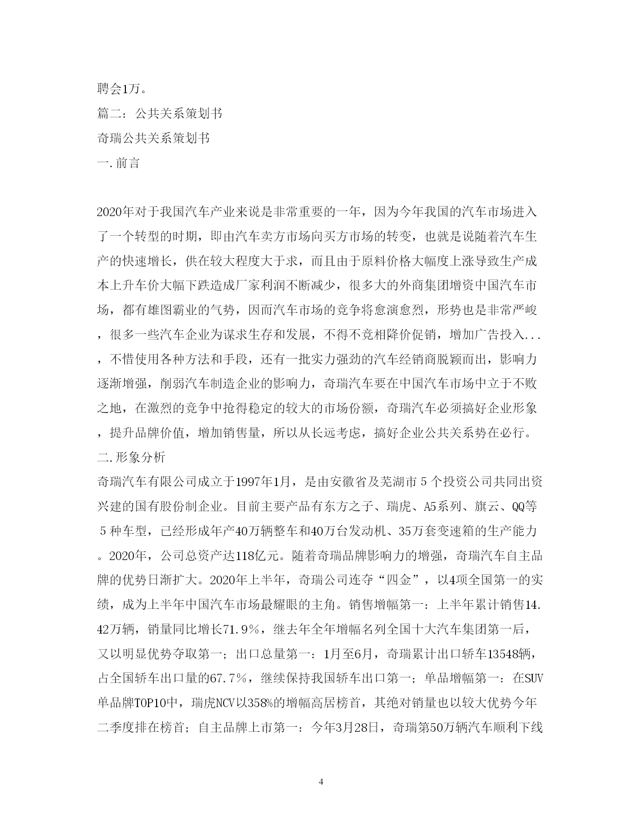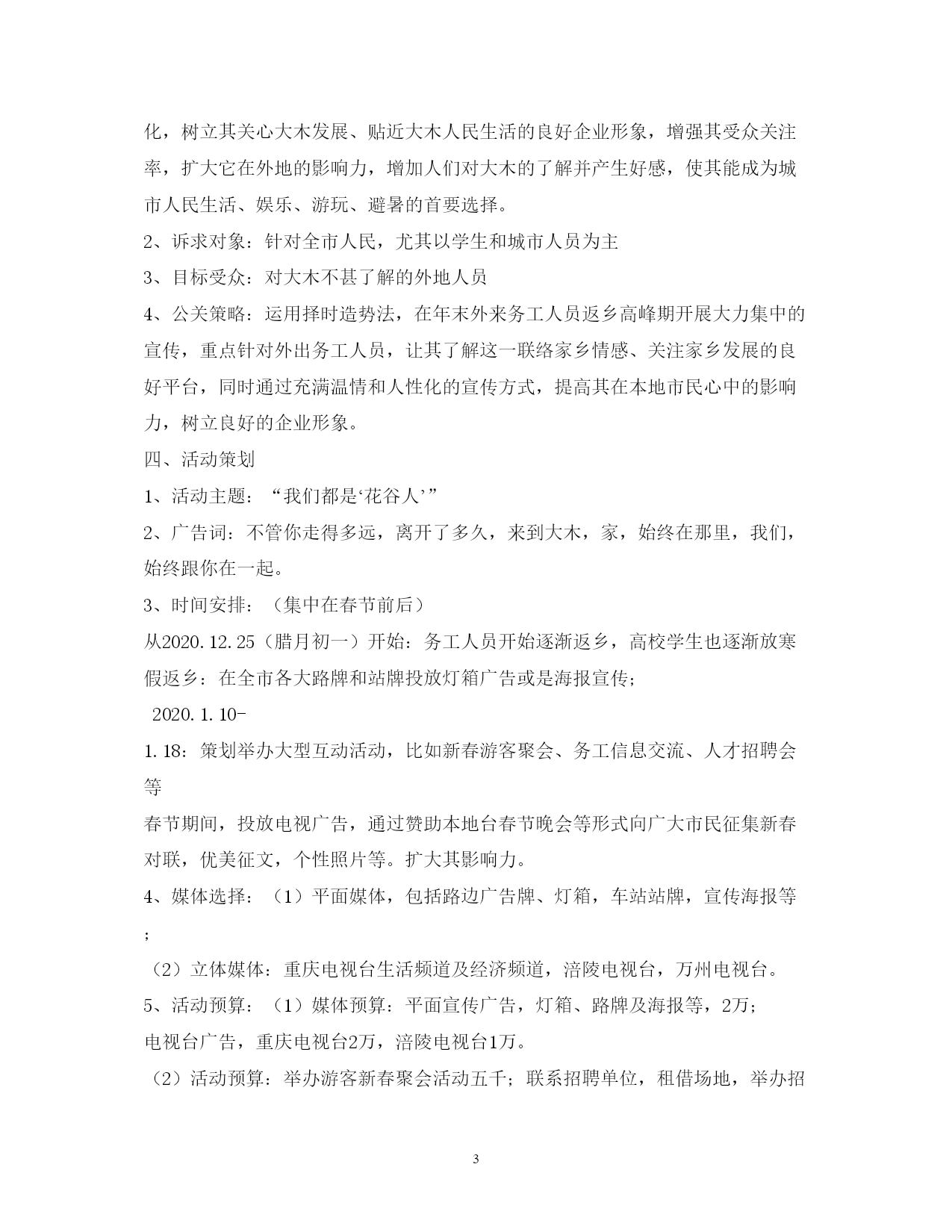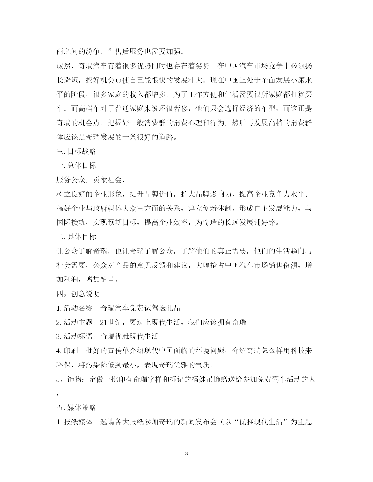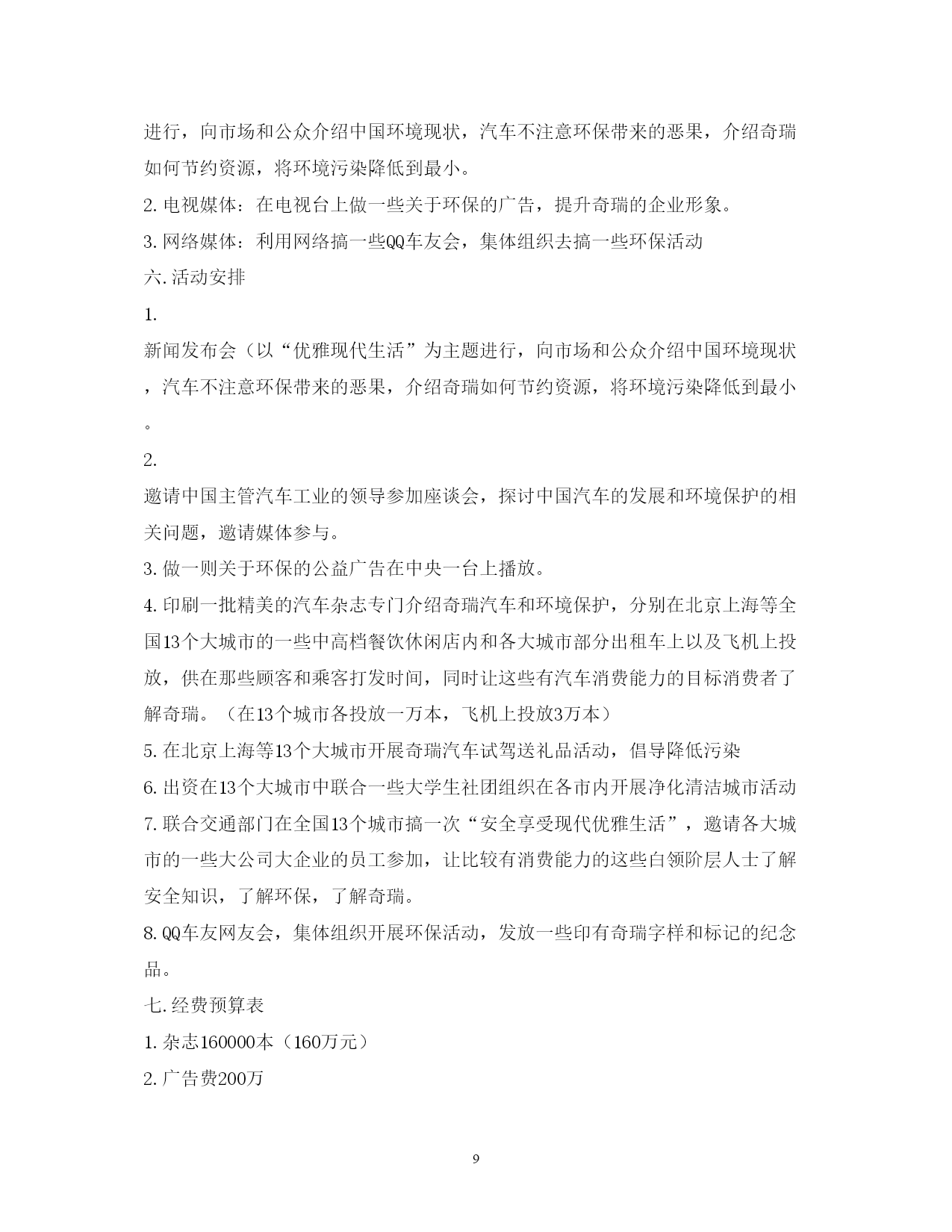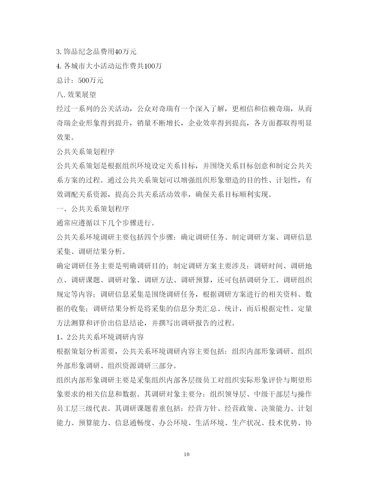 此资料由网络收集而来,如有侵权请告知上传者立即删除。资料共分享,我们负责传递知识。PAGEPAGE15公共关系策划书篇一:公关策划书格式范文公共关系活动策划书学院:应用技术学院班级:2020级市场营销班小组成员:邓伟舒晓莉谭国美大木花谷公共关系活动策划书一、大木花谷背景“2008涪陵大木花谷·葵花季”活动启动仪式在美丽的大木花谷举行,“葵花季”活动以“浪漫之旅、清凉之地、健康之源、美丽之谷、城乡统筹之星”为主题,是重庆乡村旅游100项重大活动之一。大木乡境内拥有武陵山国家森林公园,是全市唯一的环境优美乡,生态旅游观光农业基本成型,是区城乡统筹示范乡之一。培植有大木牌无公害蔬菜,是涪陵地区的高山反季蔬菜生产基地。在广大游客的支持下,经过三年的发展,目前大木已成为涪陵旅游的金牌。作为我市旅游界的“黑马”,曾经“养在深闺人未识”的大木花谷如今已成为涪陵的一张新名片,每年吸引着数十万人前往参观。作为我市唯一的高山花卉主题公园和最热门的婚纱摄影外景基地,大木花谷究竟有什么样的独特魅力?花海:全市唯一的高山花卉主题公园,1000亩花海摄影:最热门的婚纱摄影外景基地,听到最多的是:“哎呀,相机又没电了”避暑:海拔约1000米,七八月白天平均温度27℃,夜间20℃,非常适合露营,看星星。二、大木乡花谷的市场概况1、总体情况:随着经济飞速发展和服务业的广泛普及,人们的生活方式和生活态度也在不断转变,对于旅游的需求也越来越大。从地方性旅游来说,据权威网站发布,目前重庆地区的森态旅游排名第一的是大木,是重庆市的窗口旅游点,巫溪的红池坝综合排名中占据第二把交椅,其余各县市虽也有高山旅游,但排名远远落后于大木。因此,在重庆地区的高山旅游市场竞争中,大木花谷还是占有一定优势的,但是就其对外影响力和覆盖率来说,还有很大的上升空间和发展潜力。2、项目调查:优势:大木花谷一直以来深受在城人的欢迎。尤其以主城和武隆等的访问群体最多。首先,交通方便,从主城到涪陵仅需四十分钟的汽车,也可乘火车,一个小时左右可到达。其次,大木乡地处武陵山山脉,海拔1000米左右,与熏衣草的故乡———法国南部小镇普罗旺斯海拔相近,被誉为重庆第一高山花乡,号称中国的普罗旺斯,2020年被命名为重庆市唯一的环境优美乡。根据统计和游客反馈,户外露营、户外摄影、海棠园、农家乐等版块最受大家欢迎。高温天上大木赏花避暑的,已成为不少市民的选择。再次,大木离武陵山、雨台山、石家沟、仙女山很近,形成旅游带。劣势:大木在对外扩大宣传方面没什么力度,看不到大幅广告牌或是电视广播广告等,花谷的推广基本上是靠游客之间口口相传,或是外出人员之间互相介绍,覆盖范围小,传播范围窄,且不注意培养潜在受众,在外地人群中基本没有知名度。三、创意说明1、公关目标:通过在重庆市各大平面或立体媒体广泛而密集的宣传,推广大木“对外展示松滋、支持家乡发展,联络网友情感、支持个人发展”的核心企业文化,树立其关心大木发展、贴近大木人民生活的良好企业形象,增强其受众关注率,扩大它在外地的影响力,增加人们对大木的了解并产生好感,使其能成为城市人民生活、娱乐、游玩、避暑的首要选择。2、诉求对象:针对全市人民,尤其以学生和城市人员为主3、目标受众:对大木不甚了解的外地人员4、公关策略:运用择时造势法,在年末外来务工人员返乡高峰期开展大力集中的宣传,重点针对外出务工人员,让其了解这一联络家乡情感、关注家乡发展的良好平台,同时通过充满温情和人性化的宣传方式,提高其在本地市民心中的影响力,树立良好的企业形象。四、活动策划1、活动主题:“我们都是‘花谷人’”2、广告词:不管你走得多远,离开了多久,来到大木,家,始终在那里,我们,始终跟你在一起。3、时间安排:(集中在春节前后)从2020.12.25(腊月初一)开始:务工人员开始逐渐返乡,高校学生也逐渐放寒假返乡:在全市各大路牌和站牌投放灯箱广告或是海报宣传;2020.1.10-1.18:策划举办大型互动活动,比如新春游客聚会、务工信息交流、人才招聘会等春节期间,投放电视广告,通过赞助本地台春节晚会等形式向广大市民征集新春对联,优美征文,个性照片等。扩大其影响力。4、媒体选择:(1)平面媒体,包括路边广告牌、灯箱,车站站牌,宣传海报等;(2)立体媒体:重庆电视台生活频道及经济频道,涪陵电视台,万州电视台。5、活动预算:(1)媒体预算:平面宣传广告,灯箱、路牌及海报等,2万;电视台广告,重庆电视台2万,涪陵电视台1万。(2)活动预算:举办游客新春聚会活动五千;联系招聘单位,租借场地,举办招聘会1万。篇二:公共关系策划书奇瑞公共关系策划书一.前言2020年对于我国汽车产业来说是非常重要的一年,因为今年我