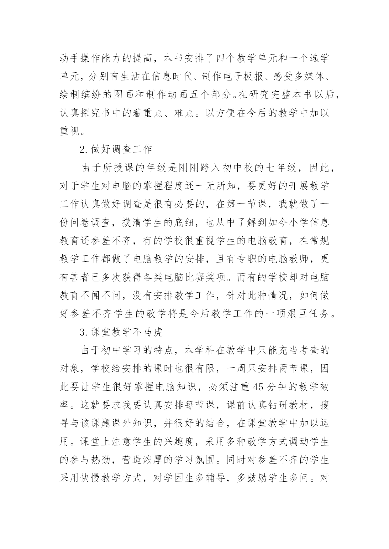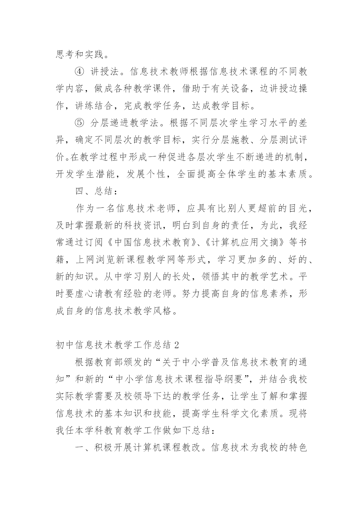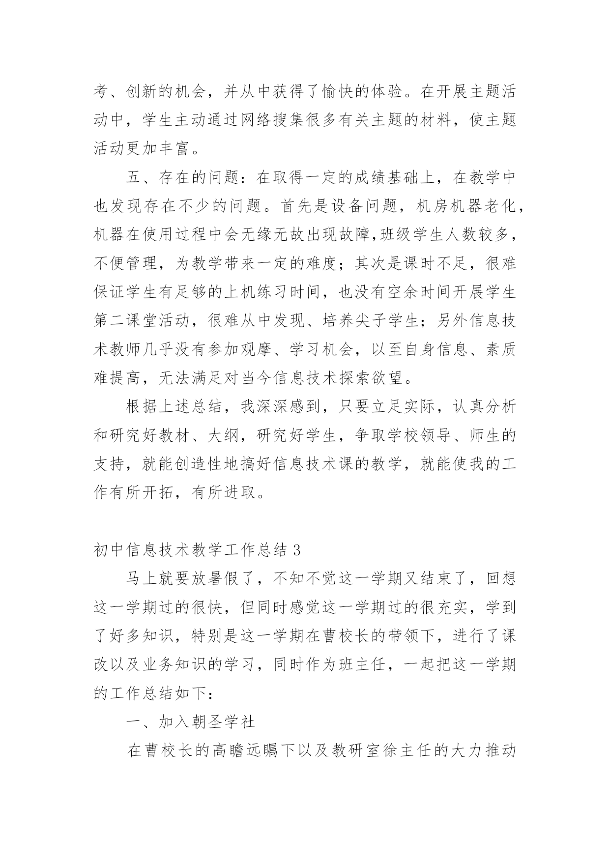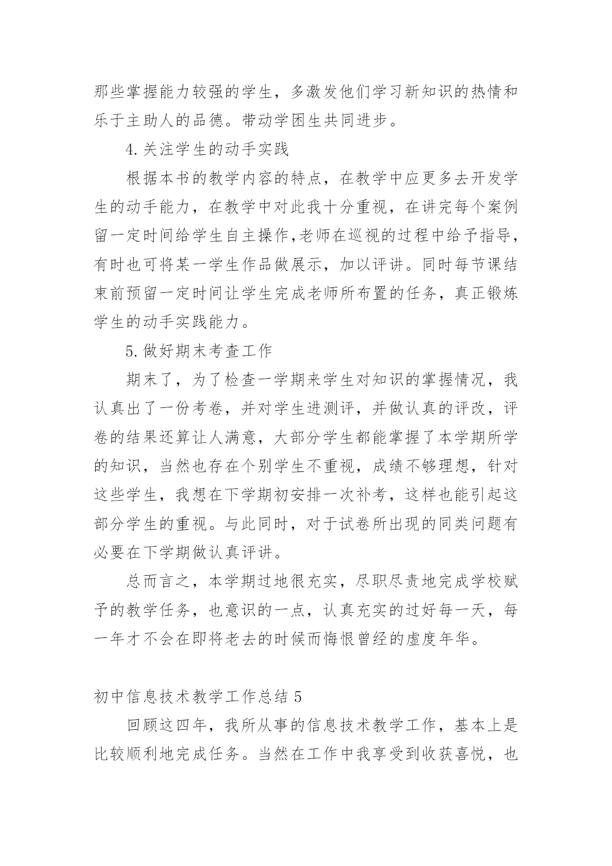 初中信息技术教学工作总结总结是事后对某一阶段的学习、工作或其完成情况加以回顾和分析的一种书面材料,它是增长才干的一种好办法,为此我们要做好回顾,写好总结。总结怎么写才不会千篇一律呢?下面是小编收集整理的初中信息技术教学工作总结,欢迎阅读,希望大家能够喜欢。初中信息技术教学工作总结1回顾这个学期信息技术教学工作,顺利地实现了学期工作目标。当然在工作中我享受到收获喜悦,也在工作中发现一些问题。工作中碰到的问题我会认真思考,想办法解决。在这个学期中,本人能在保持原有良好工作态度的基础上,不断进步,不断进取,不断学习,虚心向有经验的老师学习。为了保持优良的工作姿态,以使下一学年能以更优秀的面貌去继续工作,现将本人该学期的工作情况进行全面的总结,总结如下:一、思想方面思想上严于律己,热爱教育事业,各方面约束自己,鞭策自己,对自己要求更为严格,力争在思想上、工作上在同事、学生的心目中树立良好的形象,使自己的思想再上一个新的台阶,同时也对自己思想上有了更加高的要求。努力提高自己的教学水平和业务水平,提高自身的思想觉悟。二、教学、工作方面这学期主要担任高一年级的信息技术教学和学校电教设备的检修、维护等工作。工作是繁忙的,相对于上一年,无论是工作方法、工作经验、还是工作效率都有了明显的改善。虽然工作量比较大,但为了提高教学水平和提高业务水平,向有经验老师请教的.基础上,利用本人有限的时间建成个人教学博客,这有利于同行同事间的交流和学习,方便学生与我的交流,这大大有利于我教学的提高和及时掌握学生的动向,有利于引导学生的学习。在教学之余,我也注重自身发展进步。除了听课,评课,参加教研组教研活动外,我还注意到要自学。从思想上,利用行评机会端正自己;从行动上学电脑技术,学教学技能等;在生活上注意形象,为人师表。三、继续更新教育、教学理念,探索合适的教学方法1、充分体现“学生为主体”,“教师为主导”的原则信息技术教师在教学过程中应始终体观“以学生为主体”、“以教师为主导”相结合的原则,注重培养学生的自学能力、合作精神和探究欲望,在学习的整个过程中领悟信息文化内涵。教学实施的过程中,在充分理解新课程标准的情况下,根据学生的实际水平,重组教学内容。信息技术教学应该充分关注个体差异,设计分层次的学习目标。在教学过程中,要尊重学生的不同兴趣爱好和解决具体问题的不同技术思路。对学习起点较低的学生,要多鼓励、多帮助,提供有针对性的指导;对于基础较好的学生,要少限制、多支持,鼓励自主探究。2、努力转变学生学习方式课堂中倡导学生的自主学习,信息技术课程无论从教学内容、教学环境和教学方法上都非常有利于培养学生的自主学习意识和学习能力。比如:我们学完文字处理软件后,可以给学生布置一个电子作品,确立作品的主题,让学生根据自己的兴趣爱好,创作出集知识性和趣味性与一体的电子报刊,主题选择方向可以是环境保护、西部开发、世界无烟日、科技活动周、机器人、奥运等。老师给出作品要求,给学生两节课时间,可以上网搜集素材,以小组为单位进行电子报刊的制作,同时也培养了学生协作学习的习惯。可以从作品的思想性、科学性、创造性、艺术性、技术性几个方面给打分,全面给出评价,使学生得到一次很好的锻炼机会。3、选择合适的教学方法教学方法是影响学生学习方式的形成、完善以及改变的重要因素。信息技术课堂教学常用的教学方法有:①任务驱动。“任务驱动”教学强调学生在密切联系学习、生活和社会实际的有意义的“任务”情境中,通过完成任务来学习知识、培养技能、形成能力,提升素养。在“任务驱动”中所设置的任务要求做到科学、适当、适度。③启发式。在发挥教师主导作用的前提下,根据教学目标,充分调动学生的学习积极性,引导学生展开思维活动,主动获取知识。这种方法有利于学生积极参与和学习,主动思考和实践。④讲授法。信息技术教师根据信息技术课程的不同教学内容,做成各种教学课件,借助于有关设备,边讲授边操作,讲练结合,完成教学任务,达成教学目标。⑤分层递进教学法。根据不同层次学生学习水平的差异,确定不同层次的教学目标,实行分层施教、分层测试评价。在教学过程中形成一种促进各层次学生不断递进的机制,开发学生潜能,发展个性,全面提高全体学生的基本素质。四、总结:作为一名信息技术老师,应具有比别人更超前的目光,及时掌握最新的科技资讯,明白到自身的责任,为此,我经常通过订阅《中国信息技术教育》、《计算机应用文摘》等书籍,上网浏览新课程教学网等形式,学习更加多的、好的、新的知识。从中学习别人的长处,领悟其中的教学艺术。平时要虚心请教有经验的老师。努力提高自身的信息素养,形成自身的信息技术教学风格。初中信息技术教学工作总结2根据教育部颁发的“关于中小学普及信息技术教育的通知”和新的“中小学信息技术课程指导纲要”,并结合我校实际教学需要及校领导下达的教
