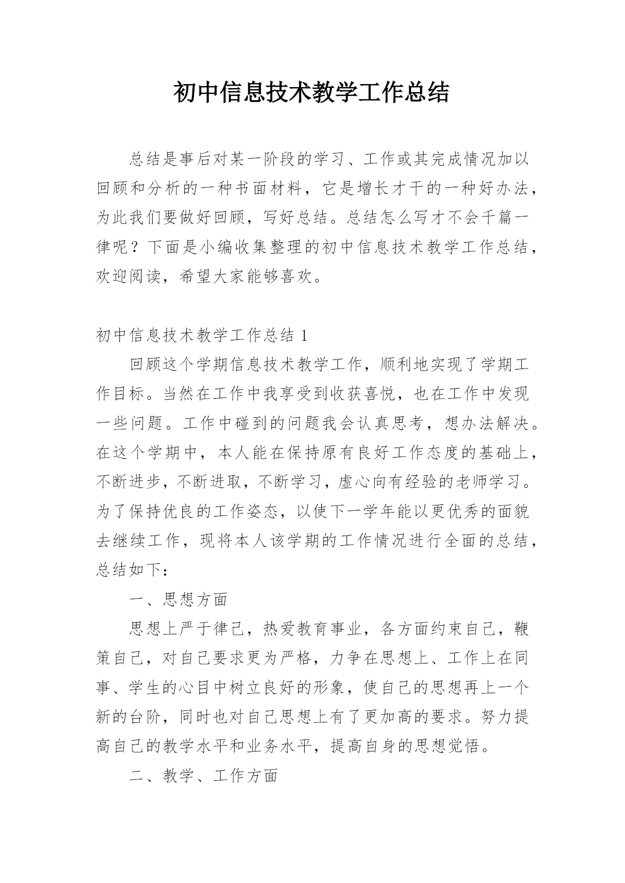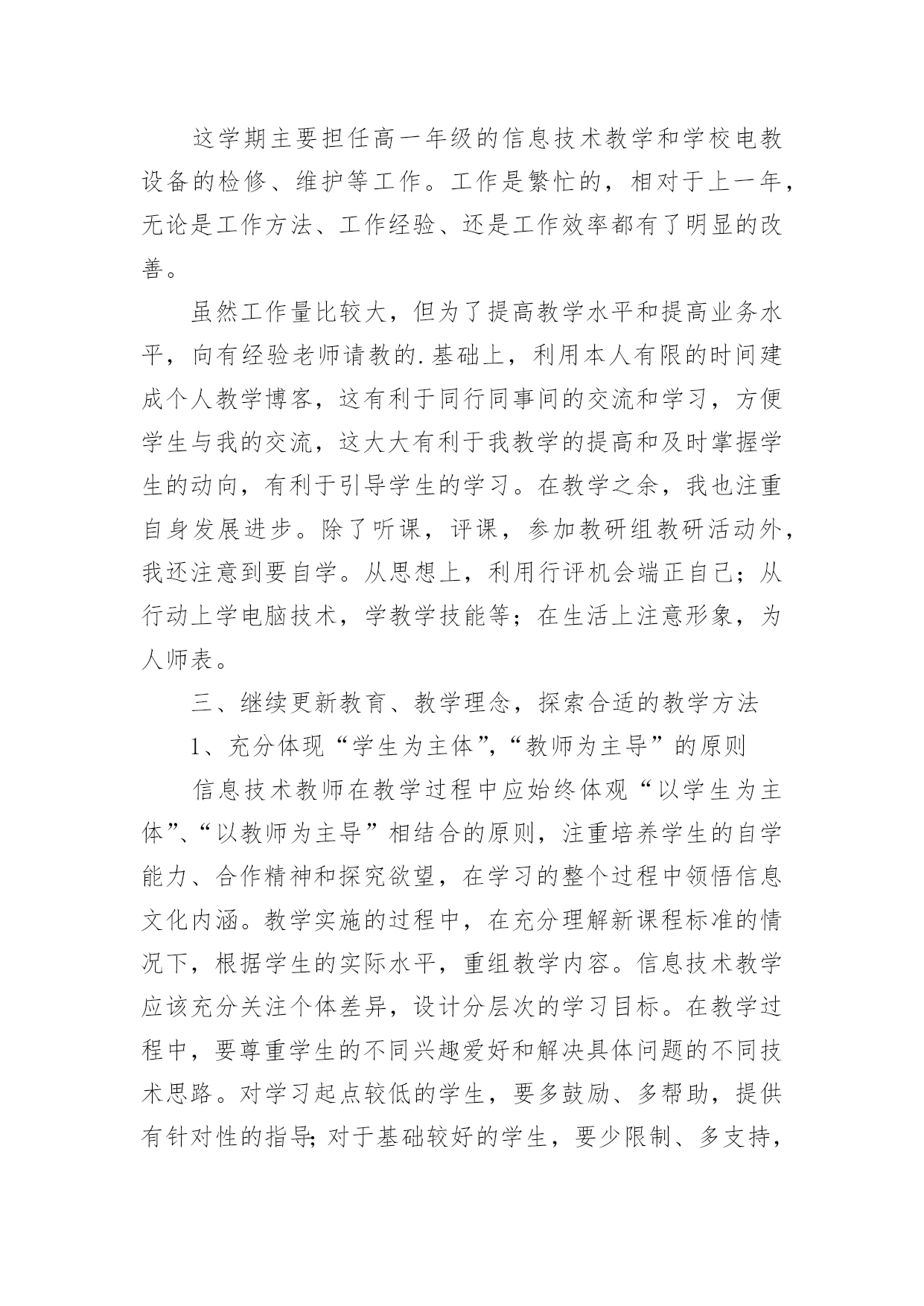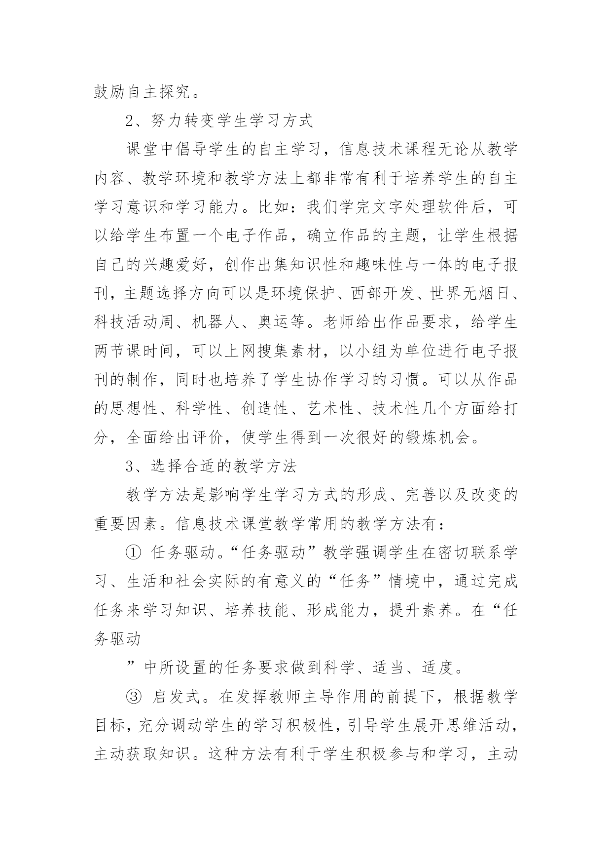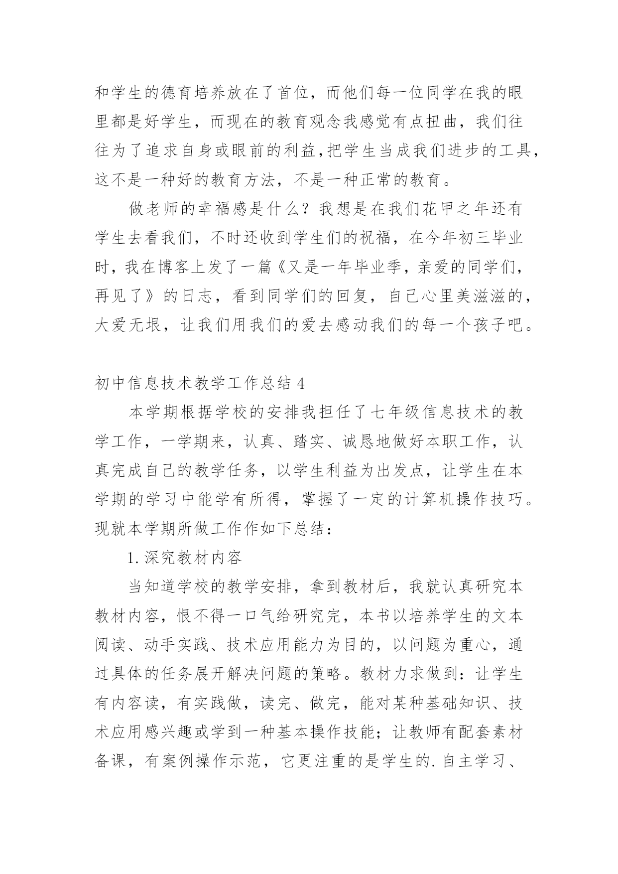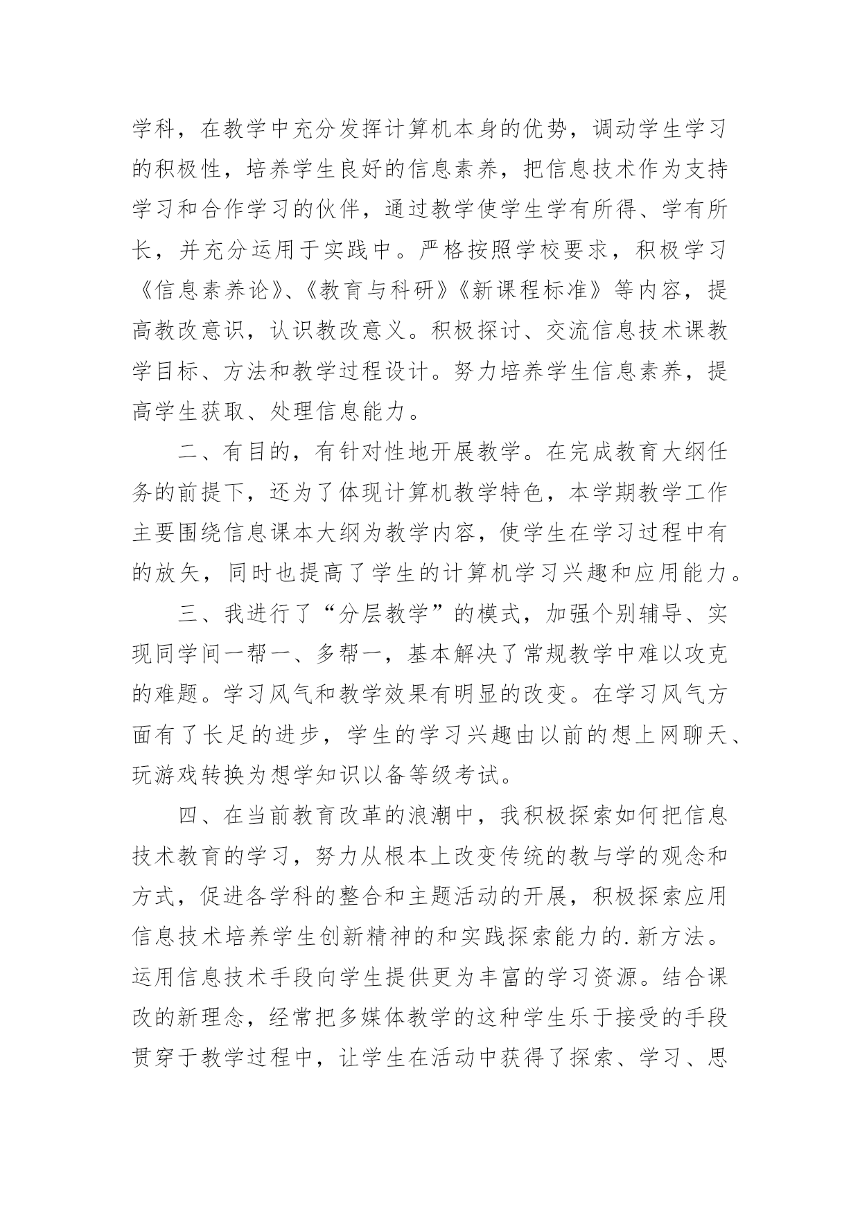 初中信息技术教学工作总结总结是事后对某一阶段的学习、工作或其完成情况加以回顾和分析的一种书面材料,它是增长才干的一种好办法,为此我们要做好回顾,写好总结。总结怎么写才不会千篇一律呢?下面是小编收集整理的初中信息技术教学工作总结,欢迎阅读,希望大家能够喜欢。初中信息技术教学工作总结1回顾这个学期信息技术教学工作,顺利地实现了学期工作目标。当然在工作中我享受到收获喜悦,也在工作中发现一些问题。工作中碰到的问题我会认真思考,想办法解决。在这个学期中,本人能在保持原有良好工作态度的基础上,不断进步,不断进取,不断学习,虚心向有经验的老师学习。为了保持优良的工作姿态,以使下一学年能以更优秀的面貌去继续工作,现将本人该学期的工作情况进行全面的总结,总结如下:一、思想方面思想上严于律己,热爱教育事业,各方面约束自己,鞭策自己,对自己要求更为严格,力争在思想上、工作上在同事、学生的心目中树立良好的形象,使自己的思想再上一个新的台阶,同时也对自己思想上有了更加高的要求。努力提高自己的教学水平和业务水平,提高自身的思想觉悟。二、教学、工作方面这学期主要担任高一年级的信息技术教学和学校电教设备的检修、维护等工作。工作是繁忙的,相对于上一年,无论是工作方法、工作经验、还是工作效率都有了明显的改善。虽然工作量比较大,但为了提高教学水平和提高业务水平,向有经验老师请教的.基础上,利用本人有限的时间建成个人教学博客,这有利于同行同事间的交流和学习,方便学生与我的交流,这大大有利于我教学的提高和及时掌握学生的动向,有利于引导学生的学习。在教学之余,我也注重自身发展进步。除了听课,评课,参加教研组教研活动外,我还注意到要自学。从思想上,利用行评机会端正自己;从行动上学电脑技术,学教学技能等;在生活上注意形象,为人师表。三、继续更新教育、教学理念,探索合适的教学方法1、充分体现“学生为主体”,“教师为主导”的原则信息技术教师在教学过程中应始终体观“以学生为主体”、“以教师为主导”相结合的原则,注重培养学生的自学能力、合作精神和探究欲望,在学习的整个过程中领悟信息文化内涵。教学实施的过程中,在充分理解新课程标准的情况下,根据学生的实际水平,重组教学内容。信息技术教学应该充分关注个体差异,设计分层次的学习目标。在教学过程中,要尊重学生的不同兴趣爱好和解决具体问题的不同技术思路。对学习起点较低的学生,要多鼓励、多帮助,提供有针对性的指导;对于基础较好的学生,要少限制、多支持,鼓励自主探究。2、努力转变学生学习方式课堂中倡导学生的自主学习,信息技术课程无论从教学内容、教学环境和教学方法上都非常有利于培养学生的自主学习意识和学习能力。比如:我们学完文字处理软件后,可以给学生布置一个电子作品,确立作品的主题,让学生根据自己的兴趣爱好,创作出集知识性和趣味性与一体的电子报刊,主题选择方向可以是环境保护、西部开发、世界无烟日、科技活动周、机器人、奥运等。老师给出作品要求,给学生两节课时间,可以上网搜集素材,以小组为单位进行电子报刊的制作,同时也培养了学生协作学习的习惯。可以从作品的思想性、科学性、创造性、艺术性、技术性几个方面给打分,全面给出评价,使学生得到一次很好的锻炼机会。3、选择合适的教学方法教学方法是影响学生学习方式的形成、完善以及改变的重要因素。信息技术课堂教学常用的教学方法有:①任务驱动。“任务驱动”教学强调学生在密切联系学习、生活和社会实际的有意义的“任务”情境中,通过完成任务来学习知识、培养技能、形成能力,提升素养。在“任务驱动”中所设置的任务要求做到科学、适当、适度。③启发式。在发挥教师主导作用的前提下,根据教学目标,充分调动学生的学习积极性,引导学生展开思维活动,主动获取知识。这种方法有利于学生积极参与和学习,主动思考和实践。④讲授法。信息技术教师根据信息技术课程的不同教学内容,做成各种教学课件,借助于有关设备,边讲授边操作,讲练结合,完成教学任务,达成教学目标。⑤分层递进教学法。根据不同层次学生学习水平的差异,确定不同层次的教学目标,实行分层施教、分层测试评价。在教学过程中形成一种促进各层次学生不断递进的机制,开发学生潜能,发展个性,全面提高全体学生的基本素质。四、总结:作为一名信息技术老师,应具有比别人更超前的目光,及时掌握最新的科技资讯,明白到自身的责任,为此,我经常通过订阅《中国信息技术教育》、《计算机应用文摘》等书籍,上网浏览新课程教学网等形式,学习更加多的、好的、新的知识。从中学习别人的长处,领悟其中的教学艺术。平时要虚心请教有经验的老师。努力提高自身的信息素养,形成自身的信息技术教学风格。初中信息技术教学工作总结2根据教育部颁发的“关于中小学普及信息技术教育的通知”和新的“中小学信息技术课程指导纲要”,并结合我校实际教学需要及校领导下达的教