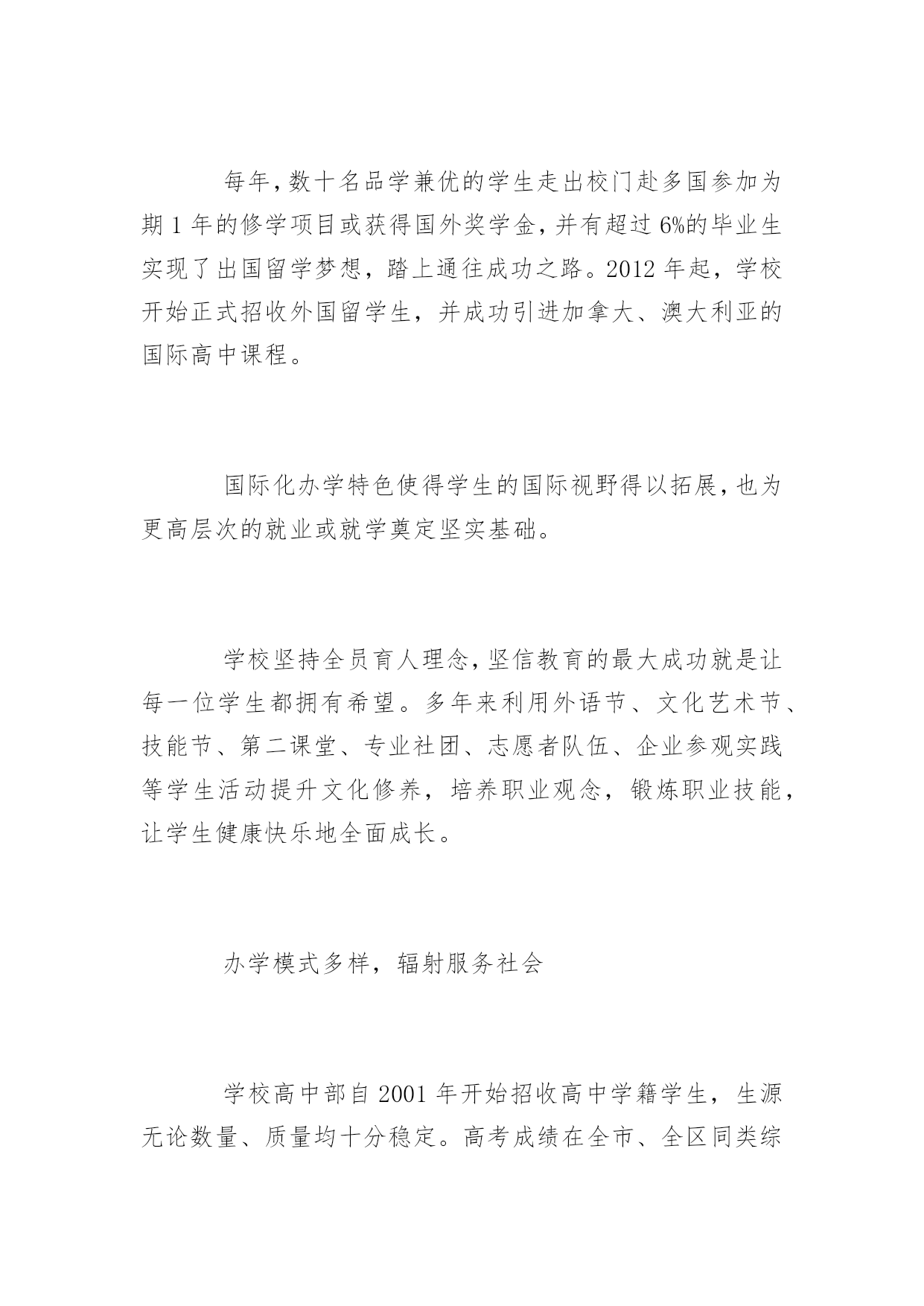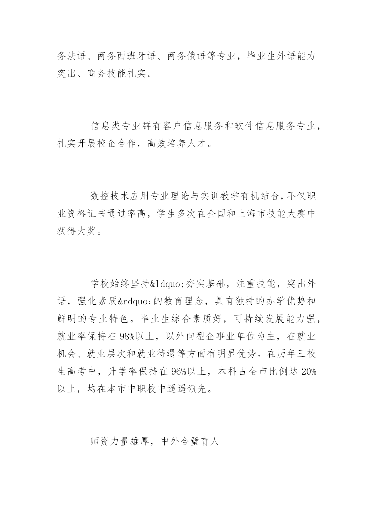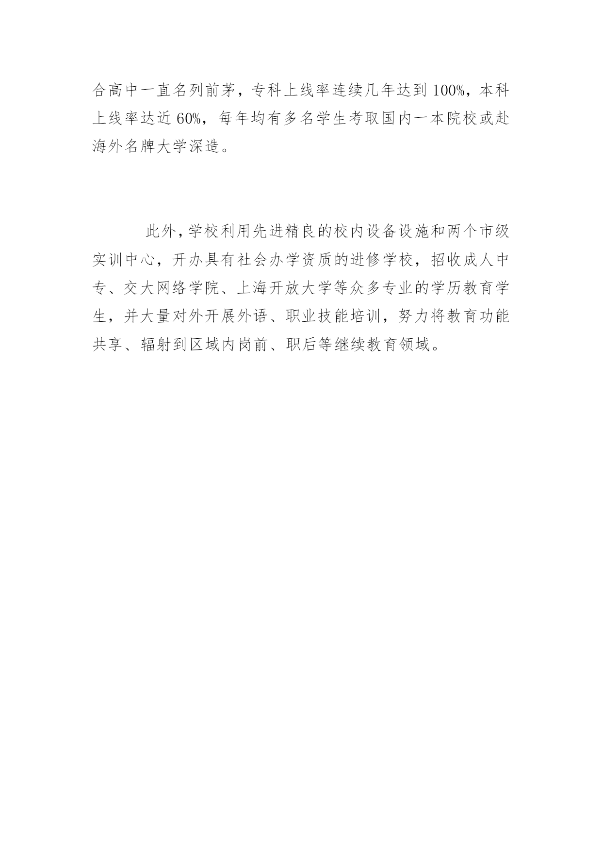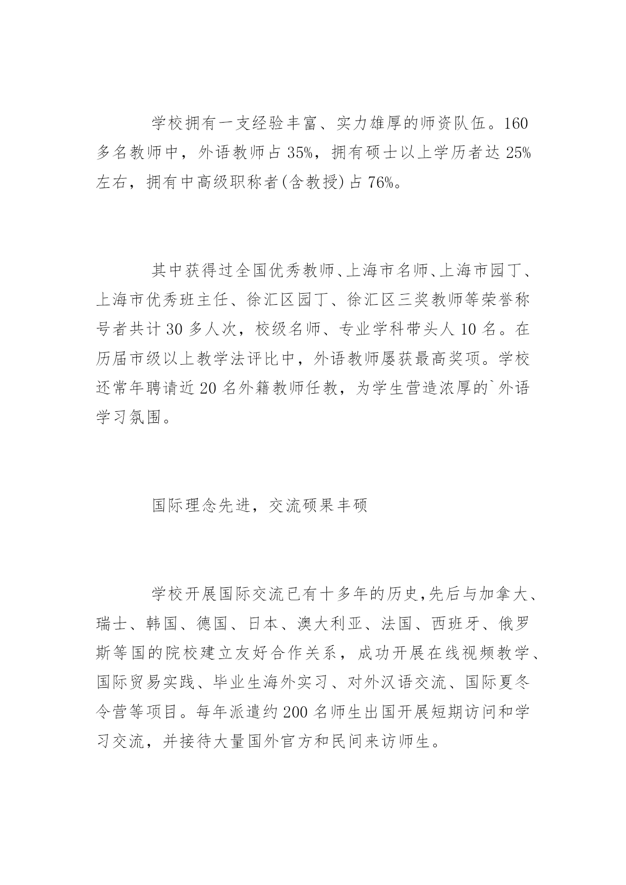 上海市工商外国语学校上海市工商外国语学校上海市工商外国语学校直属于上海市经济和信息化委员会,是一所国家级重点中专,也是上海唯一以“外国语”命名的中职校。上海市工商外国语学校简介上海市工商外国语学校坚持国际化办学特色,打造多元化成才通道,以每一个学生的终身发展为己任,多年来为社会培养了数以千计的复合型、应用性技能人才。专业特色鲜明,办学优势明显学校中专部设有3个专业类群,11个专业,其中市级重点专业3个,校级重点专业4个。财经商贸类专业群有商务英语、国际商务、商务日语、商务德语、商务韩语、商务法语、商务西班牙语、商务俄语等专业,毕业生外语能力突出、商务技能扎实。信息类专业群有客户信息服务和软件信息服务专业,扎实开展校企合作,高效培养人才。数控技术应用专业理论与实训教学有机结合,不仅职业资格证书通过率高,学生多次在全国和上海市技能大赛中获得大奖。学校始终坚持“夯实基础,注重技能,突出外语,强化素质”的教育理念,具有独特的办学优势和鲜明的专业特色。毕业生综合素质好,可持续发展能力强,就业率保持在98%以上,以外向型企事业单位为主,在就业机会、就业层次和就业待遇等方面有明显优势。在历年三校生高考中,升学率保持在96%以上,本科占全市比例达20%以上,均在本市中职校中遥遥领先。师资力量雄厚,中外合璧育人学校拥有一支经验丰富、实力雄厚的师资队伍。160多名教师中,外语教师占35%,拥有硕士以上学历者达25%左右,拥有中高级职称者(含教授)占76%。其中获得过全国优秀教师、上海市名师、上海市园丁、上海市优秀班主任、徐汇区园丁、徐汇区三奖教师等荣誉称号者共计30多人次,校级名师、专业学科带头人10名。在历届市级以上教学法评比中,外语教师屡获最高奖项。学校还常年聘请近20名外籍教师任教,为学生营造浓厚的`外语学习氛围。国际理念先进,交流硕果丰硕学校开展国际交流已有十多年的历史,先后与加拿大、瑞士、韩国、德国、日本、澳大利亚、法国、西班牙、俄罗斯等国的院校建立友好合作关系,成功开展在线视频教学、国际贸易实践、毕业生海外实习、对外汉语交流、国际夏冬令营等项目。每年派遣约200名师生出国开展短期访问和学习交流,并接待大量国外官方和民间来访师生。每年,数十名品学兼优的学生走出校门赴多国参加为期1年的修学项目或获得国外奖学金,并有超过6%的毕业生实现了出国留学梦想,踏上通往成功之路。2012年起,学校开始正式招收外国留学生,并成功引进加拿大、澳大利亚的国际高中课程。国际化办学特色使得学生的国际视野得以拓展,也为更高层次的就业或就学奠定坚实基础。学校坚持全员育人理念,坚信教育的最大成功就是让每一位学生都拥有希望。多年来利用外语节、文化艺术节、技能节、第二课堂、专业社团、志愿者队伍、企业参观实践等学生活动提升文化修养,培养职业观念,锻炼职业技能,让学生健康快乐地全面成长。办学模式多样,辐射服务社会学校高中部自2001年开始招收高中学籍学生,生源无论数量、质量均十分稳定。高考成绩在全市、全区同类综合高中一直名列前茅,专科上线率连续几年达到100%,本科上线率达近60%,每年均有多名学生考取国内一本院校或赴海外名牌大学深造。此外,学校利用先进精良的校内设备设施和两个市级实训中心,开办具有社会办学资质的进修学校,招收成人中专、交大网络学院、上海开放大学等众多专业的学历教育学生,并大量对外开展外语、职业技能培训,努力将教育功能共享、辐射到区域内岗前、职后等继续教育领域。