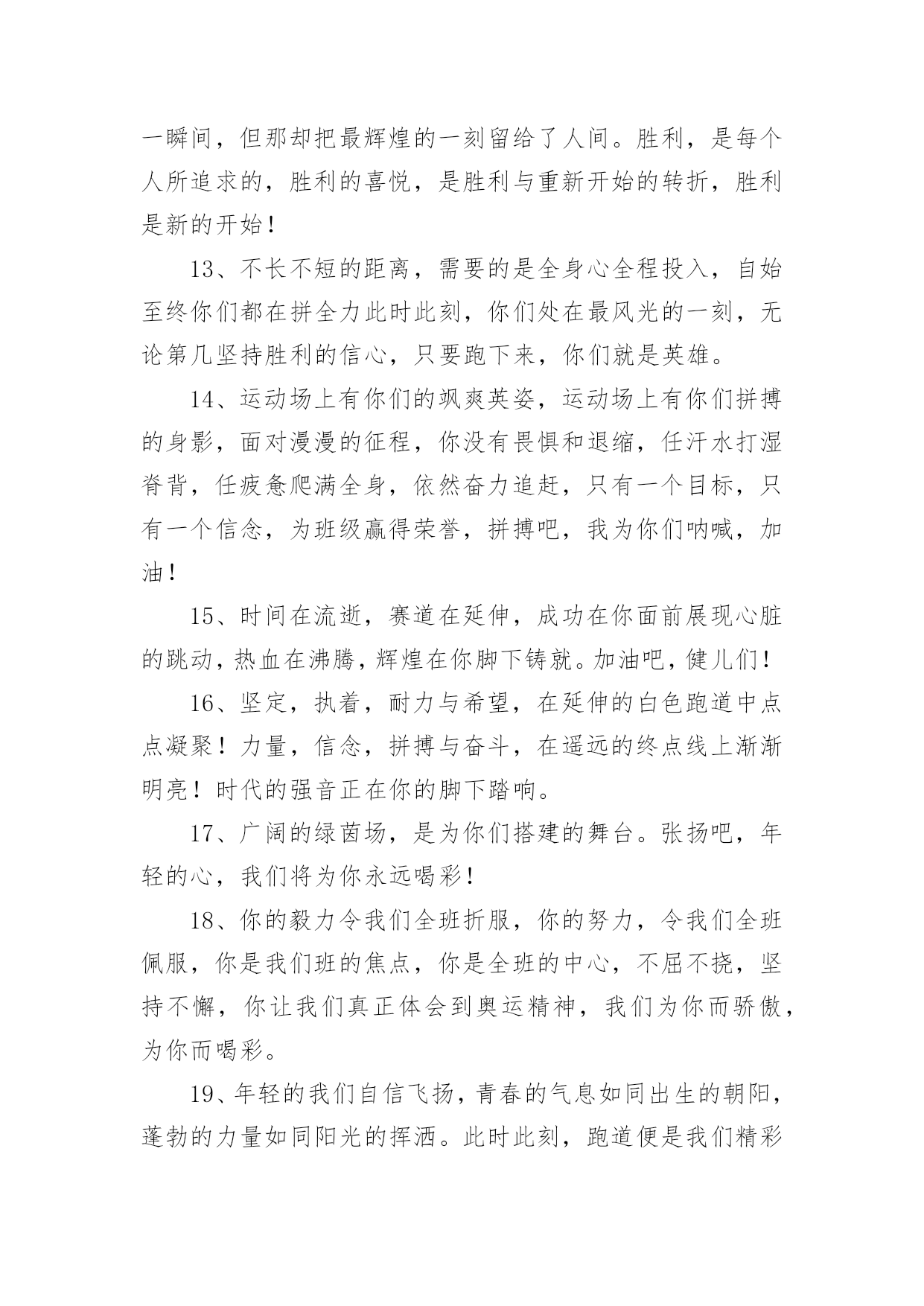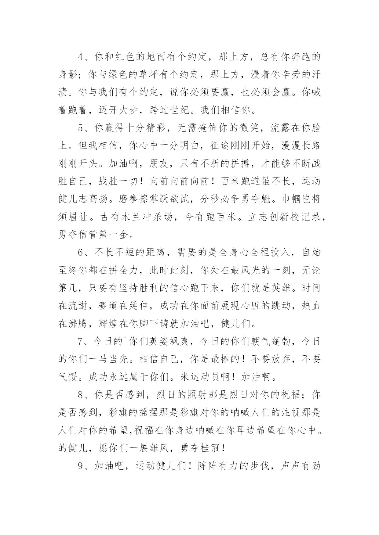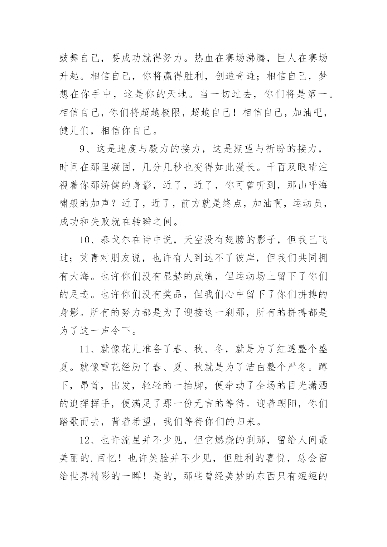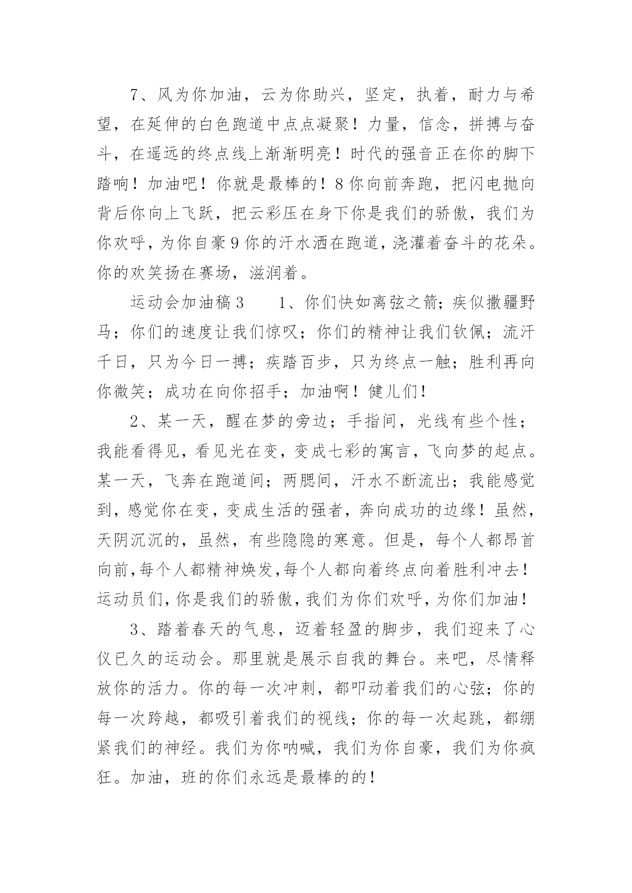 运动会加油稿最新运动会加油稿随着社会不断地进步,需要使用加油稿的场合越来越多,加油稿可以激励对方更好地参加活动。写加油稿的注意事项有许多,你确定会写吗?下面是小编为大家收集的最新运动会加油稿,仅供参考,大家一起来看看吧。运动会加油稿11、踏着春天的气息,迈着轻盈的脚步,我们迎来了心仪已久的运动会。那里就是展示自我的舞台。我们向往高山的坚忍不拔,我们渴望大海的博大精深,还有,我们更痴迷于你们的速度活力。来吧,尽情释放你的活力。你的每一次冲刺,都叩动着我们的心弦;你的每一次跨越,都吸引着我们的视线;你的每一次起跳,都绷紧我们的神经。我们为你呐喊,我们为你自豪,我们为你疯狂。2、运动场上有你们的飒爽英姿,运动场上有你们拼搏的身影,应对漫漫的征程,你没有畏惧和退缩,任汗水打湿脊背,任疲惫爬满全身,依然分离追赶,只有一个目标,只有一个信念,为班级赢得荣誉,拼搏吧,我为你们呐喊,加油!3、青春的脚步,青春的速度,青春的活力,青春的活力,将会在你们的身上尽情体现。迎接自我,挑战自我,战胜自我!我们相信你们必须能行,加油吧,运动员!终点就在眼前!4、是体育场上游走的火焰,是来去不息的脚步,是风中飞舞的树叶折射的金色光芒,藉此,能够诠释运动员兴奋的脸庞。那轻盈的步伐似飞鸟的翅膀,那清脆的枪声响彻天际,它粲然升起那跃动的渴望,起跑加速超越冲刺,一步一步延向胜利的曙光。那是力的比拼,素质的较量,是石榴树上,跃动的心脏。5、不长不短的距离,需要的是全身心全程投入,自始至终你们都在拼全力此时此刻,你们处在最风光的一刻,无论第几坚持胜利的信心,只要跑下来,你们就是英雄时间在流逝,赛道在延伸,成功在你面前展现,心脏的跳动,热血在沸腾,辉煌在你脚下铸就加油吧,健儿们。6、也许流星并不少见,但它燃烧的刹那,留给人间最美丽的回忆!也许笑脸并不少见,但胜利的喜悦,总会留给世界精彩的一瞬!是的,那些以前美妙的东西只有短短的一瞬间,但那却把最辉煌的一刻留给了人间。胜利,是每个人所追求的,胜利的喜悦,是胜利与重新开始的转折,胜利是新的开始!7、心中坚定的信念,脚下沉稳的步伐,你用行动告诉我们一个不变之理,没有走不完的路,没有过不了的山,成功正在终点冲着你高高的招手,用你那顽强的意志去努力,去迎接终点的鲜花与掌声,相信成功必须是属于你。8、踏上跑道,是一种选择。离开起点,是一种勇气。驰骋赛场,是一种胜利。运动健将们,用你的实力,用你的精神,去开拓出一片属于你的长跑天地!有多少次挥汗如雨,伤痛曾添满记忆,只因为始终相信,去拼搏才能胜利。总在鼓舞自己,要成功就得努力。热血在赛场沸腾,巨人在赛场升起。相信自己,你将赢得胜利,创造奇迹;相信自己,梦想在你手中,这是你的天地。当一切过去,你们将是第一。相信自己,你们将超越极限,超越自己!相信自己,加油吧,健儿们,相信你自己。9、这是速度与毅力的接力,这是期望与祈盼的接力,时间在那里凝固,几分几秒也变得如此漫长。千百双眼睛注视着你那矫健的身影,近了,近了,你可曾听到,那山呼海啸般的加声?近了,近了,前方就是终点,加油啊,运动员,成功和失败就在转瞬之间。10、泰戈尔在诗中说,天空没有翅膀的影子,但我已飞过;艾青对朋友说,也许有人到达不了彼岸,但我们共同拥有大海。也许你们没有显赫的成绩,但运动场上留下了你们的足迹。也许你们没有奖品,但我们心中留下了你们拼搏的身影。所有的努力都是为了迎接这一刹那,所有的拼搏都是为了这一声令下。11、就像花儿准备了春、秋、冬,就是为了红透整个盛夏。就像雪花经历了春、夏、秋就是为了洁白整个严冬。蹲下,昂首,出发,轻轻的一抬脚,便牵动了全场的目光潇洒的迫挥挥手,便满足了那一份无言的等待。迎着朝阳,你们踏歌而去,背着希望,我们等待你们的归来。12、也许流星并不少见,但它燃烧的刹那,留给人间最美丽的.回忆!也许笑脸并不少见,但胜利的喜悦,总会留给世界精彩的一瞬!是的,那些曾经美妙的东西只有短短的一瞬间,但那却把最辉煌的一刻留给了人间。胜利,是每个人所追求的,胜利的喜悦,是胜利与重新开始的转折,胜利是新的开始!13、不长不短的距离,需要的是全身心全程投入,自始至终你们都在拼全力此时此刻,你们处在最风光的一刻,无论第几坚持胜利的信心,只要跑下来,你们就是英雄。14、运动场上有你们的飒爽英姿,运动场上有你们拼搏的身影,面对漫漫的征程,你没有畏惧和退缩,任汗水打湿脊背,任疲惫爬满全身,依然奋力追赶,只有一个目标,只有一个信念,为班级赢得荣誉,拼搏吧,我为你们呐喊,加油!15、时间在流逝,赛道在延伸,成功在你面前展现心脏的跳动,热血在沸腾,辉煌在你脚下铸就。加油吧,健儿们!16、坚定,执着,耐力与希望,在延伸的白色跑道中点点凝聚!力量,信念,拼搏与奋斗,在遥远的终点线上渐渐明亮!时代的强音正在你的脚下踏响。17、广阔的绿茵