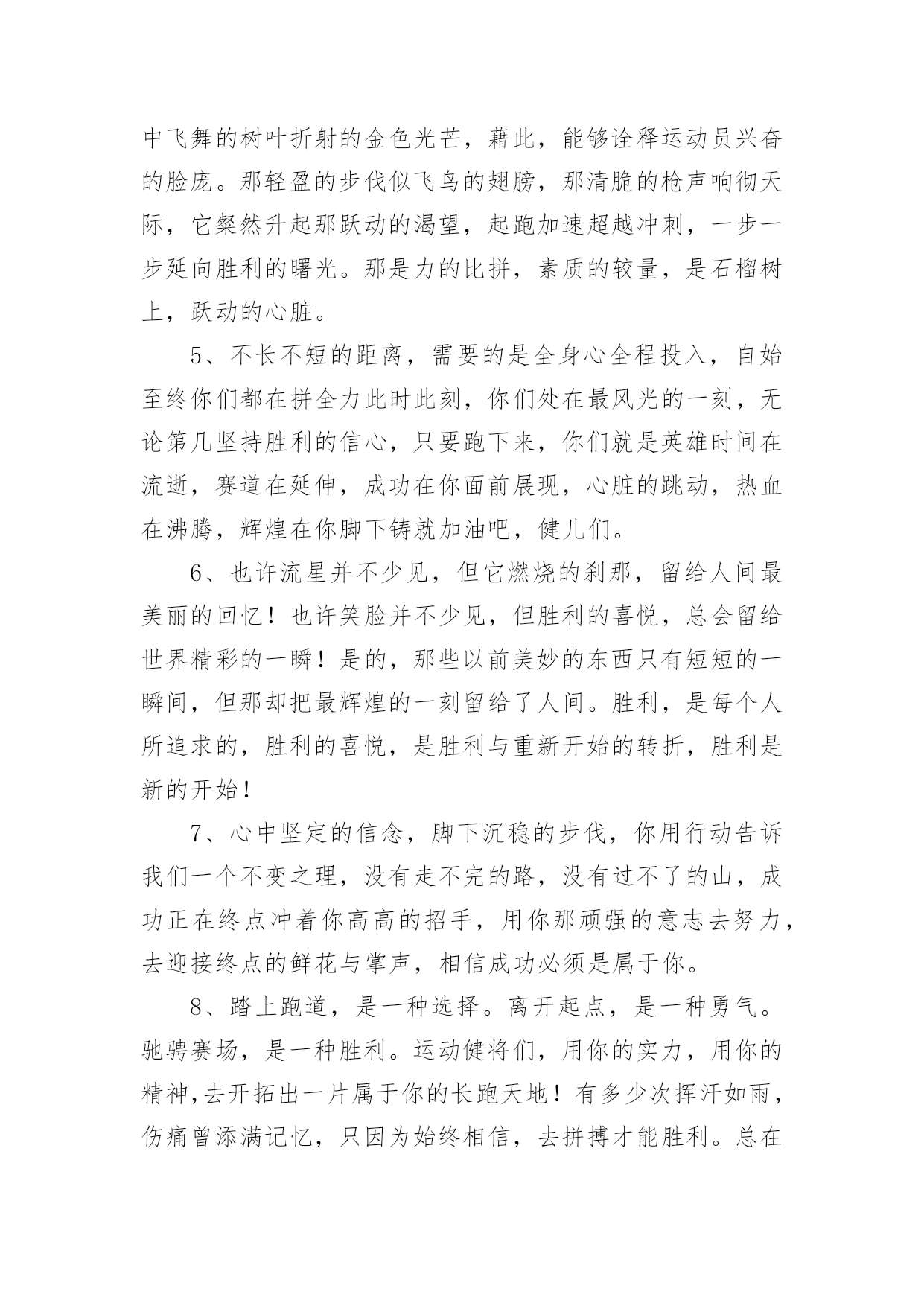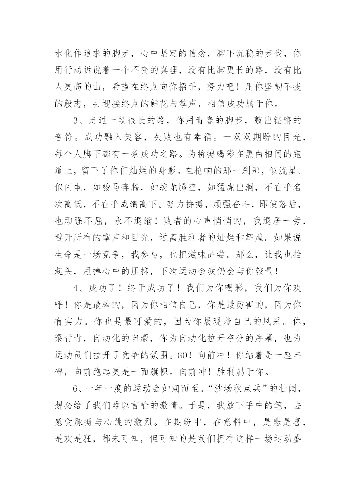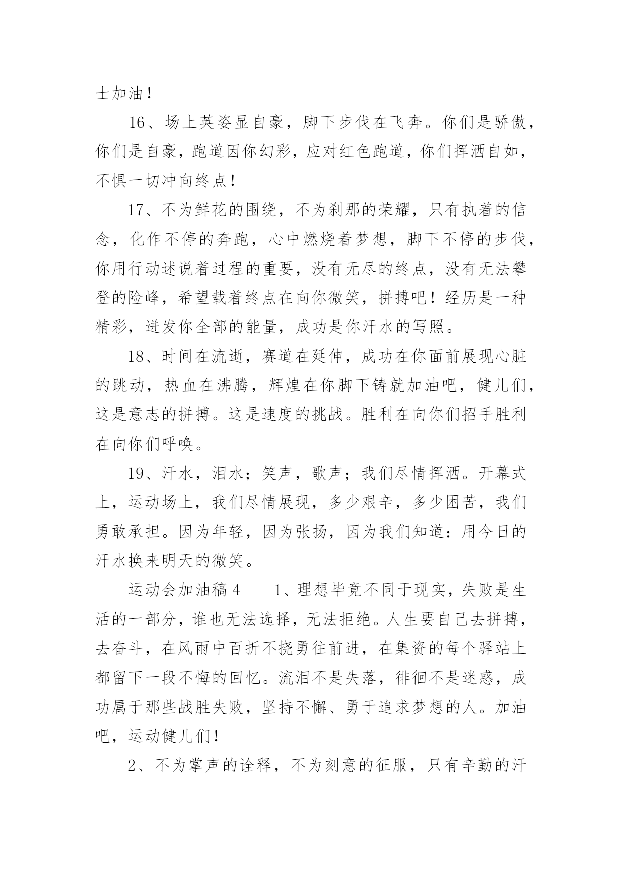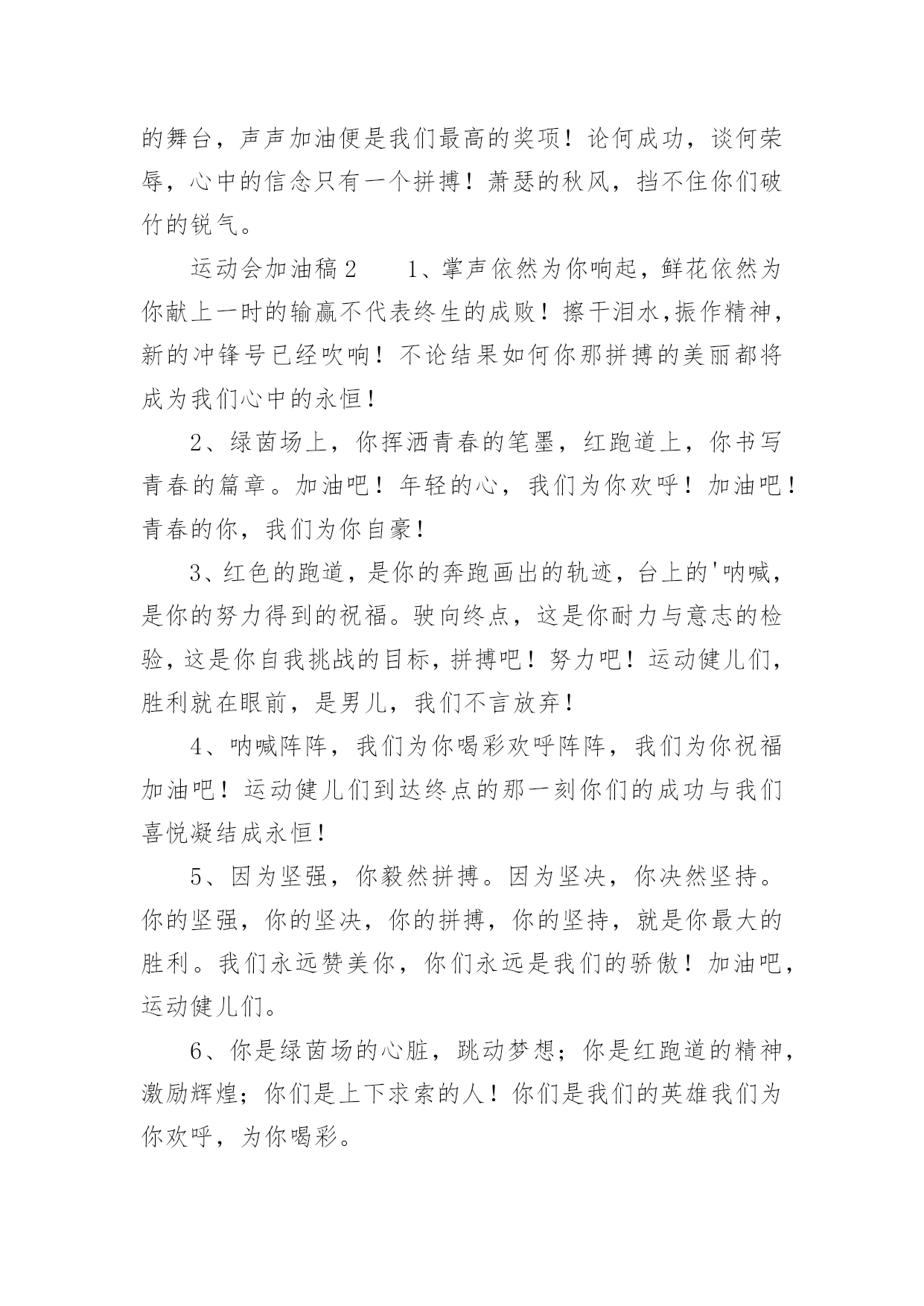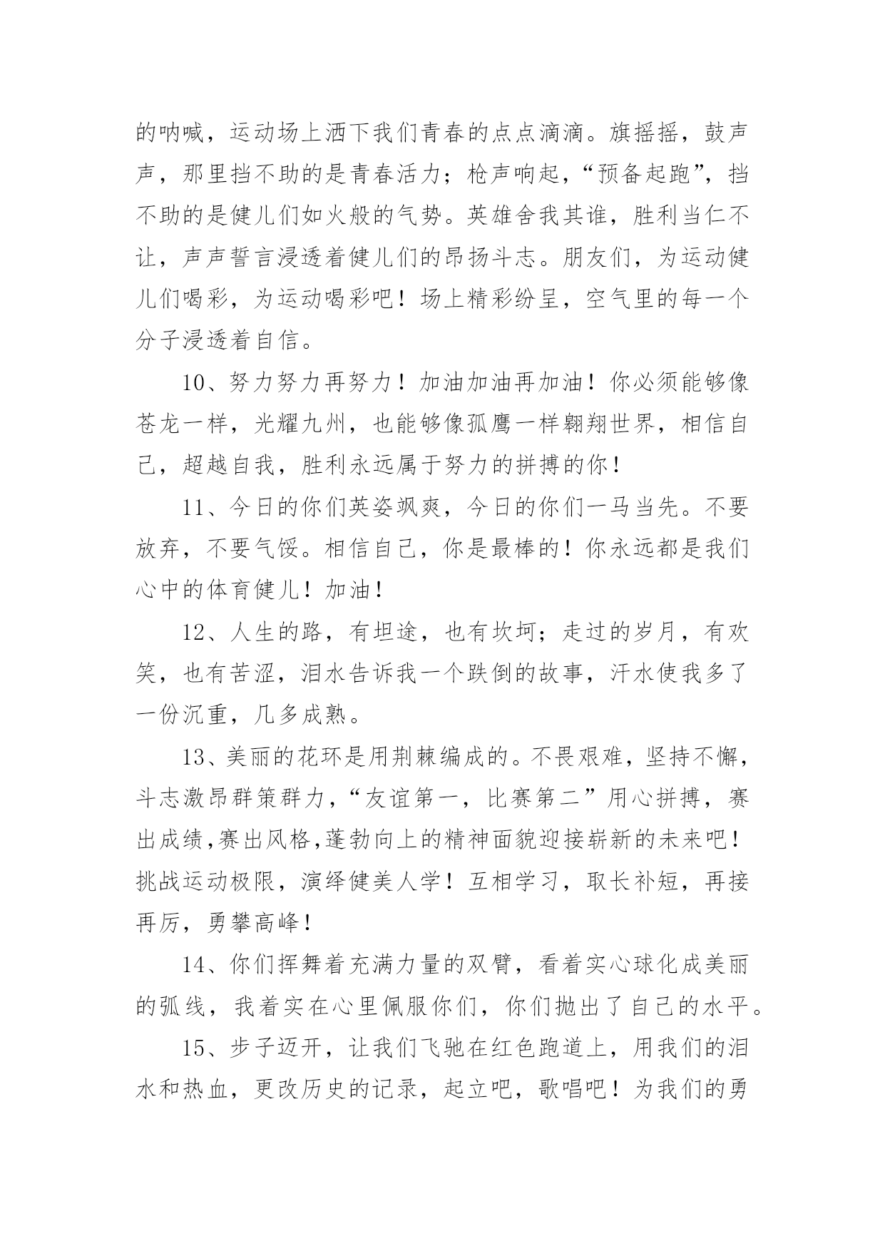 运动会加油稿最新运动会加油稿随着社会不断地进步,需要使用加油稿的场合越来越多,加油稿可以激励对方更好地参加活动。写加油稿的注意事项有许多,你确定会写吗?下面是小编为大家收集的最新运动会加油稿,仅供参考,大家一起来看看吧。运动会加油稿11、踏着春天的气息,迈着轻盈的脚步,我们迎来了心仪已久的运动会。那里就是展示自我的舞台。我们向往高山的坚忍不拔,我们渴望大海的博大精深,还有,我们更痴迷于你们的速度活力。来吧,尽情释放你的活力。你的每一次冲刺,都叩动着我们的心弦;你的每一次跨越,都吸引着我们的视线;你的每一次起跳,都绷紧我们的神经。我们为你呐喊,我们为你自豪,我们为你疯狂。2、运动场上有你们的飒爽英姿,运动场上有你们拼搏的身影,应对漫漫的征程,你没有畏惧和退缩,任汗水打湿脊背,任疲惫爬满全身,依然分离追赶,只有一个目标,只有一个信念,为班级赢得荣誉,拼搏吧,我为你们呐喊,加油!3、青春的脚步,青春的速度,青春的活力,青春的活力,将会在你们的身上尽情体现。迎接自我,挑战自我,战胜自我!我们相信你们必须能行,加油吧,运动员!终点就在眼前!4、是体育场上游走的火焰,是来去不息的脚步,是风中飞舞的树叶折射的金色光芒,藉此,能够诠释运动员兴奋的脸庞。那轻盈的步伐似飞鸟的翅膀,那清脆的枪声响彻天际,它粲然升起那跃动的渴望,起跑加速超越冲刺,一步一步延向胜利的曙光。那是力的比拼,素质的较量,是石榴树上,跃动的心脏。5、不长不短的距离,需要的是全身心全程投入,自始至终你们都在拼全力此时此刻,你们处在最风光的一刻,无论第几坚持胜利的信心,只要跑下来,你们就是英雄时间在流逝,赛道在延伸,成功在你面前展现,心脏的跳动,热血在沸腾,辉煌在你脚下铸就加油吧,健儿们。6、也许流星并不少见,但它燃烧的刹那,留给人间最美丽的回忆!也许笑脸并不少见,但胜利的喜悦,总会留给世界精彩的一瞬!是的,那些以前美妙的东西只有短短的一瞬间,但那却把最辉煌的一刻留给了人间。胜利,是每个人所追求的,胜利的喜悦,是胜利与重新开始的转折,胜利是新的开始!7、心中坚定的信念,脚下沉稳的步伐,你用行动告诉我们一个不变之理,没有走不完的路,没有过不了的山,成功正在终点冲着你高高的招手,用你那顽强的意志去努力,去迎接终点的鲜花与掌声,相信成功必须是属于你。8、踏上跑道,是一种选择。离开起点,是一种勇气。驰骋赛场,是一种胜利。运动健将们,用你的实力,用你的精神,去开拓出一片属于你的长跑天地!有多少次挥汗如雨,伤痛曾添满记忆,只因为始终相信,去拼搏才能胜利。总在鼓舞自己,要成功就得努力。热血在赛场沸腾,巨人在赛场升起。相信自己,你将赢得胜利,创造奇迹;相信自己,梦想在你手中,这是你的天地。当一切过去,你们将是第一。相信自己,你们将超越极限,超越自己!相信自己,加油吧,健儿们,相信你自己。9、这是速度与毅力的接力,这是期望与祈盼的接力,时间在那里凝固,几分几秒也变得如此漫长。千百双眼睛注视着你那矫健的身影,近了,近了,你可曾听到,那山呼海啸般的加声?近了,近了,前方就是终点,加油啊,运动员,成功和失败就在转瞬之间。10、泰戈尔在诗中说,天空没有翅膀的影子,但我已飞过;艾青对朋友说,也许有人到达不了彼岸,但我们共同拥有大海。也许你们没有显赫的成绩,但运动场上留下了你们的足迹。也许你们没有奖品,但我们心中留下了你们拼搏的身影。所有的努力都是为了迎接这一刹那,所有的拼搏都是为了这一声令下。11、就像花儿准备了春、秋、冬,就是为了红透整个盛夏。就像雪花经历了春、夏、秋就是为了洁白整个严冬。蹲下,昂首,出发,轻轻的一抬脚,便牵动了全场的目光潇洒的迫挥挥手,便满足了那一份无言的等待。迎着朝阳,你们踏歌而去,背着希望,我们等待你们的归来。12、也许流星并不少见,但它燃烧的刹那,留给人间最美丽的.回忆!也许笑脸并不少见,但胜利的喜悦,总会留给世界精彩的一瞬!是的,那些曾经美妙的东西只有短短的一瞬间,但那却把最辉煌的一刻留给了人间。胜利,是每个人所追求的,胜利的喜悦,是胜利与重新开始的转折,胜利是新的开始!13、不长不短的距离,需要的是全身心全程投入,自始至终你们都在拼全力此时此刻,你们处在最风光的一刻,无论第几坚持胜利的信心,只要跑下来,你们就是英雄。14、运动场上有你们的飒爽英姿,运动场上有你们拼搏的身影,面对漫漫的征程,你没有畏惧和退缩,任汗水打湿脊背,任疲惫爬满全身,依然奋力追赶,只有一个目标,只有一个信念,为班级赢得荣誉,拼搏吧,我为你们呐喊,加油!15、时间在流逝,赛道在延伸,成功在你面前展现心脏的跳动,热血在沸腾,辉煌在你脚下铸就。加油吧,健儿们!16、坚定,执着,耐力与希望,在延伸的白色跑道中点点凝聚!力量,信念,拼搏与奋斗,在遥远的终点线上渐渐明亮!时代的强音正在你的脚下踏响。17、广阔的绿茵