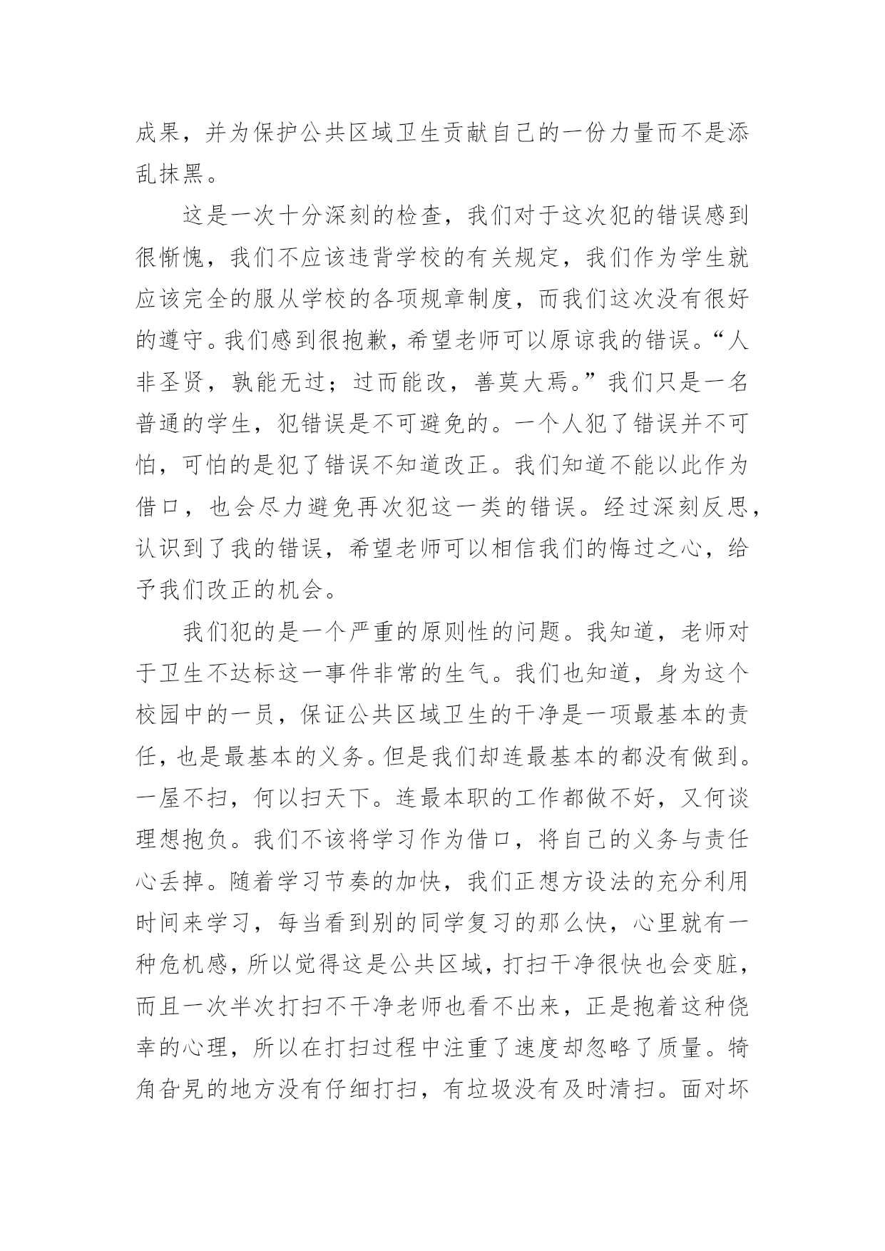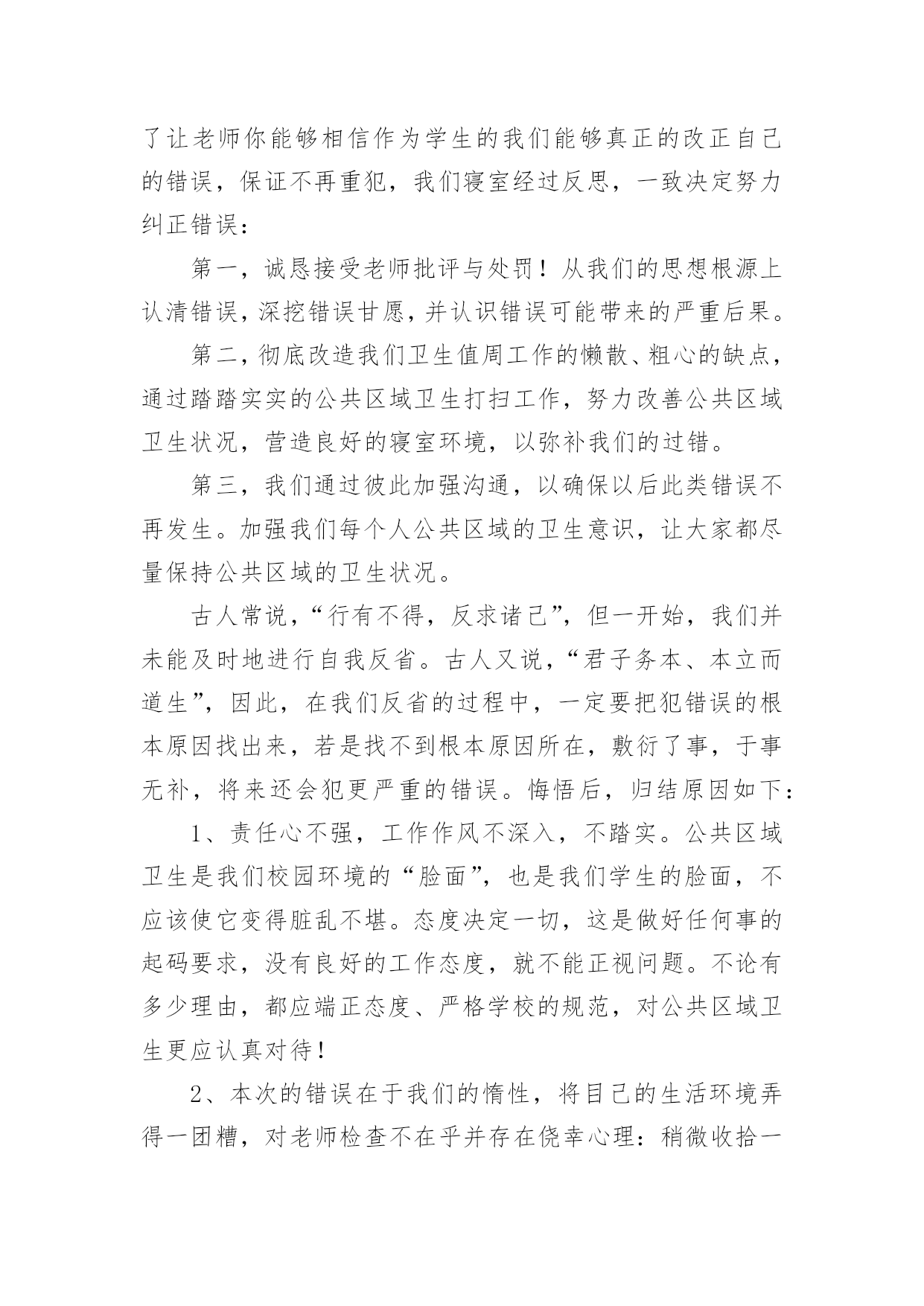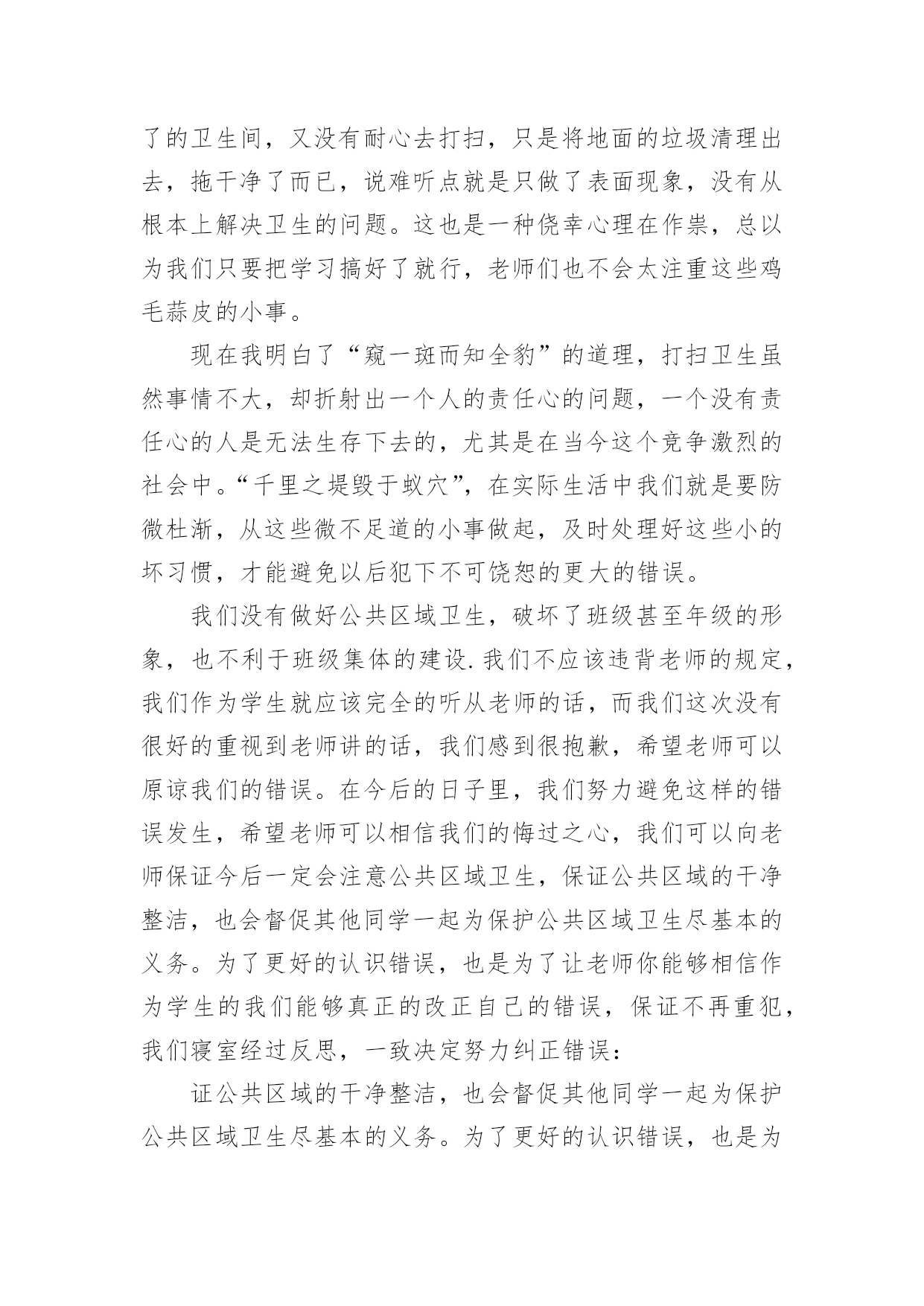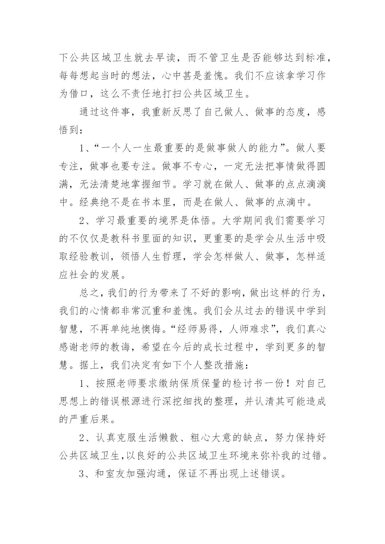 大学生公共区域卫生检讨书在学习、工作或生活中出现了失误后,往往要写检讨书来自我反思,我们在写检讨书的时候要注意语言的得体性。你所见过的检讨书是什么样的呢?下面是小编精心整理的大学生公共区域卫生检讨书,欢迎大家借鉴与参考,希望对大家有所帮助。今天,我们怀着愧疚和懊悔写下这份检讨书,以向您表示我们对没有打扫好公共区域卫生这种不良行为的深刻认识,我们表示最诚挚的愧疚和道歉,我们的所作所为有悖于当代大学生积极进取的精神风貌,在今后的学习生活中,我们一定谦虚谨慎、戒骄戒躁、内外兼修,作一名合格的21世纪大学生。早在我们踏进校门,老师就已三申五令,一再强调,不仅要注意自己个人的卫生,寝室的卫生,更要注意维护公共区域卫生,公共区域卫生就是校园的一张名片,学校领导会不定时检查公共区域,但我们却在公共区域卫生管理员已经通知并说明检查不合格严重后果的情况下,依然犯下这样的错误,在明知道会不定时检查公共区域卫生时还是没有重视公共区域的卫生,不认真打扫,打扫时态度敷衍、马虎,严重危害了校园环境,对此我们都感到很愧疚,学校公共区域就是我们在大学校园里每个人活动的一部分,是需要每个学生一起守护的公共空间。我们应该珍惜校园清洁工人的劳动成果,并为保护公共区域卫生贡献自己的一份力量而不是添乱抹黑。这是一次十分深刻的检查,我们对于这次犯的错误感到很惭愧,我们不应该违背学校的有关规定,我们作为学生就应该完全的服从学校的各项规章制度,而我们这次没有很好的遵守。我们感到很抱歉,希望老师可以原谅我的错误。“人非圣贤,孰能无过;过而能改,善莫大焉。”我们只是一名普通的学生,犯错误是不可避免的。一个人犯了错误并不可怕,可怕的是犯了错误不知道改正。我们知道不能以此作为借口,也会尽力避免再次犯这一类的错误。经过深刻反思,认识到了我的错误,希望老师可以相信我们的悔过之心,给予我们改正的机会。我们犯的是一个严重的原则性的问题。我知道,老师对于卫生不达标这一事件非常的生气。我们也知道,身为这个校园中的一员,保证公共区域卫生的干净是一项最基本的责任,也是最基本的义务。但是我们却连最基本的都没有做到。一屋不扫,何以扫天下。连最本职的工作都做不好,又何谈理想抱负。我们不该将学习作为借口,将自己的义务与责任心丢掉。随着学习节奏的加快,我们正想方设法的充分利用时间来学习,每当看到别的同学复习的那么快,心里就有一种危机感,所以觉得这是公共区域,打扫干净很快也会变脏,而且一次半次打扫不干净老师也看不出来,正是抱着这种侥幸的心理,所以在打扫过程中注重了速度却忽略了质量。犄角旮旯的地方没有仔细打扫,有垃圾没有及时清扫。面对坏了的卫生间,又没有耐心去打扫,只是将地面的垃圾清理出去,拖干净了而已,说难听点就是只做了表面现象,没有从根本上解决卫生的问题。这也是一种侥幸心理在作祟,总以为我们只要把学习搞好了就行,老师们也不会太注重这些鸡毛蒜皮的小事。现在我明白了“窥一斑而知全豹”的道理,打扫卫生虽然事情不大,却折射出一个人的责任心的问题,一个没有责任心的人是无法生存下去的,尤其是在当今这个竞争激烈的社会中。“千里之堤毁于蚁穴”,在实际生活中我们就是要防微杜渐,从这些微不足道的小事做起,及时处理好这些小的坏习惯,才能避免以后犯下不可饶恕的更大的错误。我们没有做好公共区域卫生,破坏了班级甚至年级的形象,也不利于班级集体的建设.我们不应该违背老师的规定,我们作为学生就应该完全的听从老师的话,而我们这次没有很好的重视到老师讲的话,我们感到很抱歉,希望老师可以原谅我们的错误。在今后的日子里,我们努力避免这样的错误发生,希望老师可以相信我们的悔过之心,我们可以向老师保证今后一定会注意公共区域卫生,保证公共区域的干净整洁,也会督促其他同学一起为保护公共区域卫生尽基本的义务。为了更好的认识错误,也是为了让老师你能够相信作为学生的我们能够真正的改正自己的错误,保证不再重犯,我们寝室经过反思,一致决定努力纠正错误:证公共区域的干净整洁,也会督促其他同学一起为保护公共区域卫生尽基本的义务。为了更好的认识错误,也是为了让老师你能够相信作为学生的我们能够真正的改正自己的错误,保证不再重犯,我们寝室经过反思,一致决定努力纠正错误:第一,诚恳接受老师批评与处罚!从我们的思想根源上认清错误,深挖错误甘愿,并认识错误可能带来的严重后果。第二,彻底改造我们卫生值周工作的懒散、粗心的缺点,通过踏踏实实的公共区域卫生打扫工作,努力改善公共区域卫生状况,营造良好的寝室环境,以弥补我们的过错。第三,我们通过彼此加强沟通,以确保以后此类错误不再发生。加强我们每个人公共区域的卫生意识,让大家都尽量保持公共区域的卫生状况。古人常说,“行有不得,反求诸己”,但一开始,我们并未能及时地进行自我反省。古人又说,“君子务本、本立而道生”,因此,在我们反省的过程