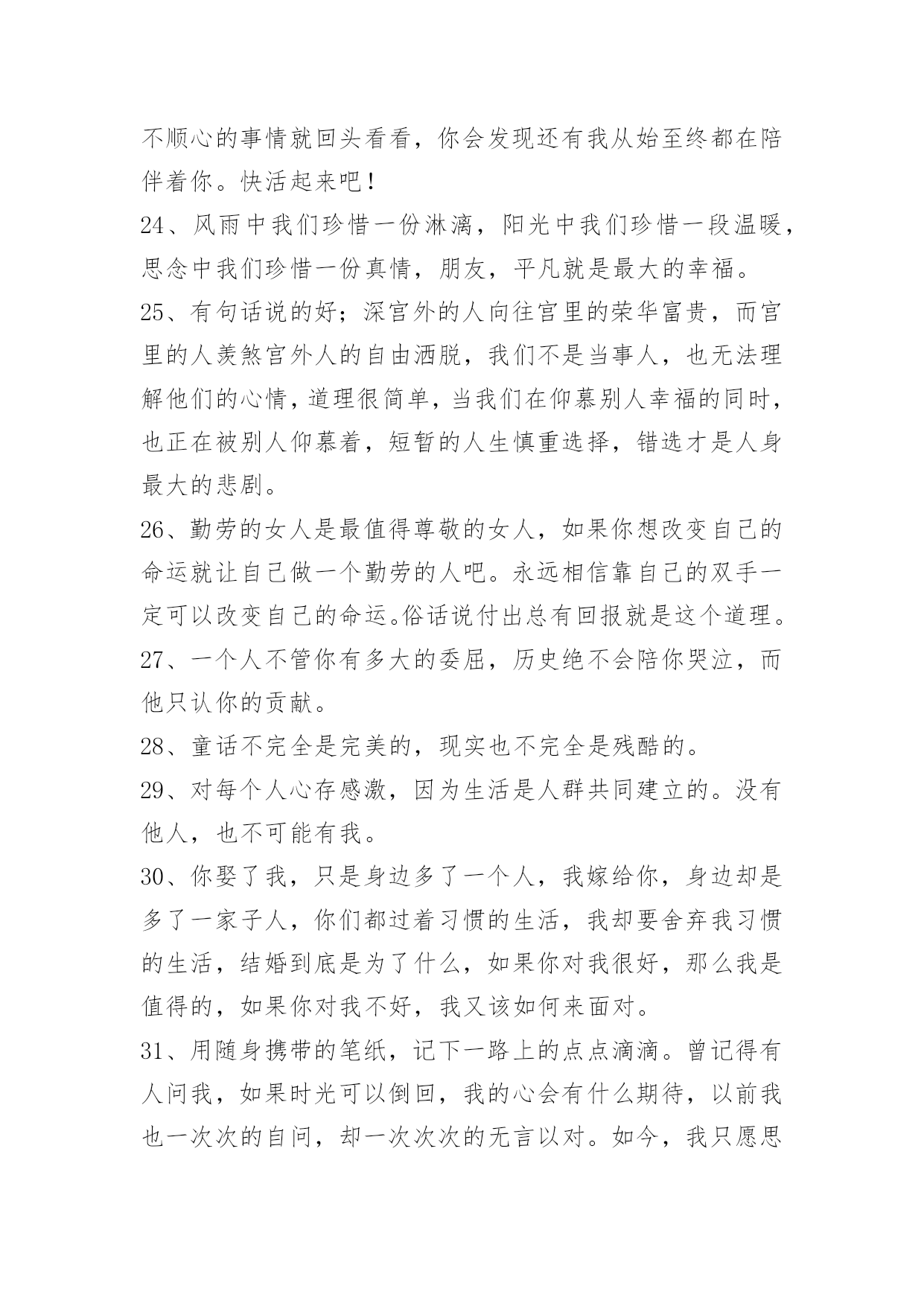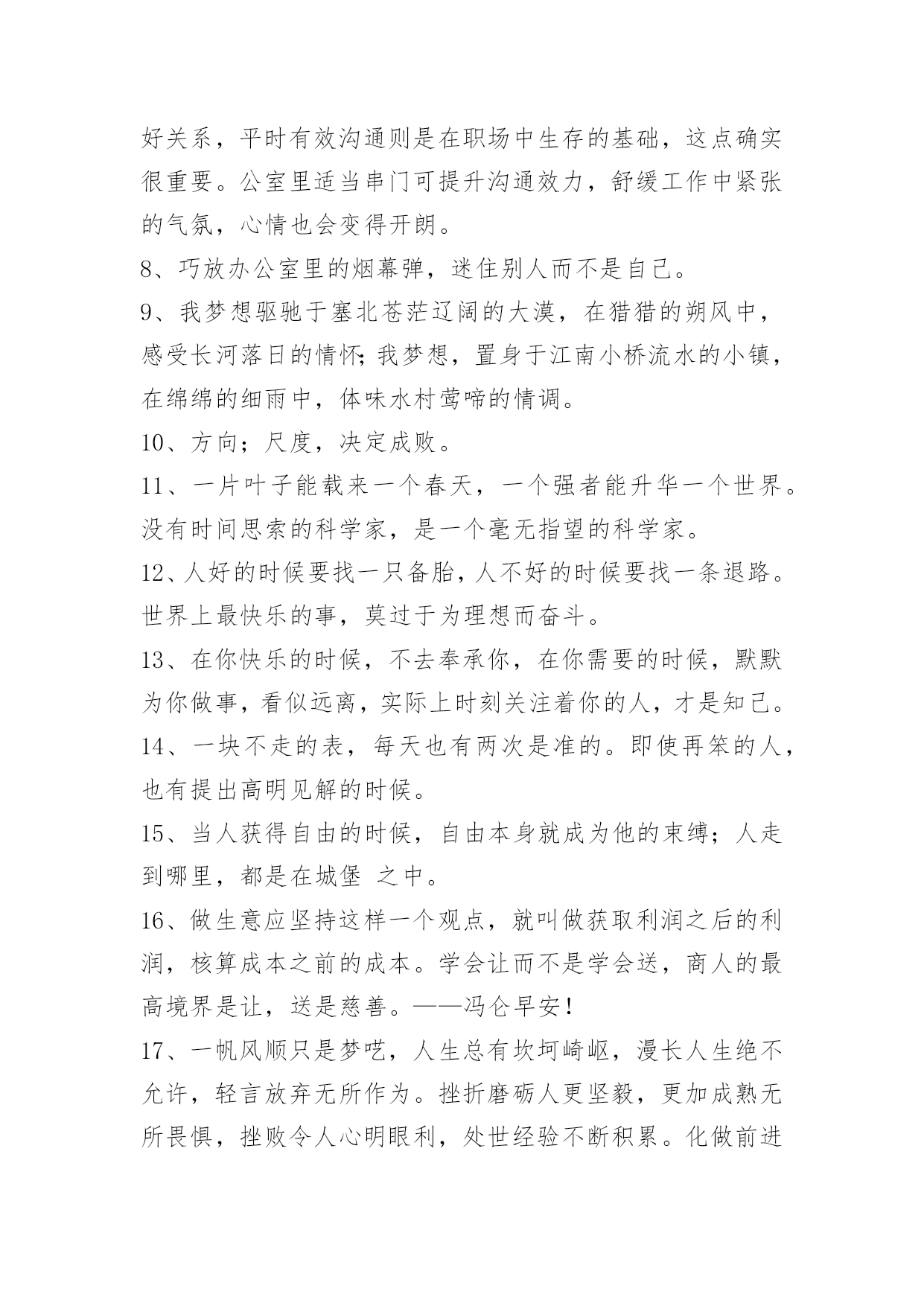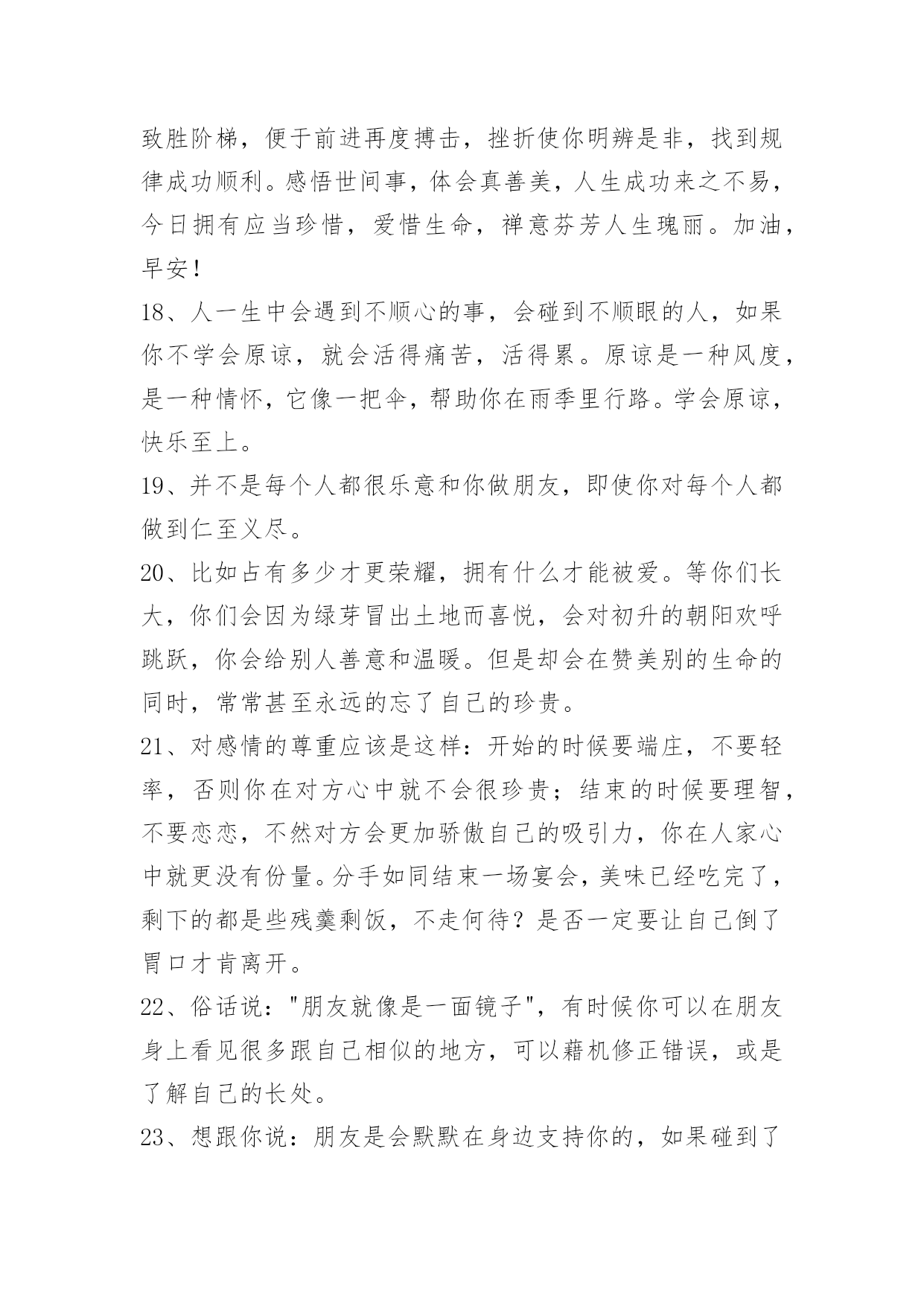 鸡汤个性朋友圈文案经典鸡汤个性朋友圈文案90句精选别让不相关的人,影响了你的心境,影响了你的睡眠。以下这篇文章是小编整理的一些鸡汤个性朋友圈文案,一起来看一下吧。1、女性的自我教育。教育一个男人,是教育一个人;而教育一个女人,是教育一个家庭,教育三代人。也就是教育一个民族,所以,教育女人更重要,女性的自我教育更重要:专业知识或技术可能使你获得成功,与某种程度的满足感,但没有平与、宁静、成熟的心智,就很难好幸福生活。2、无论你认为生活怎么不如意,不论你在前进中遇到多大的挫折,你都应该鼓起勇气顽强地活下去。因为在这个世界上毕竟有你留恋的东西,还有关心你、爱护你的人。3、最熟悉的东西,最易有陌生感。近在眼前的人,了解起来最难。从心理角度看,相处越久的两个人,越少了彼此了解的兴趣。于是就有了爱的盲区。世上最遥远的人,或许就是离你最近的人。4、有美貌而没美德,犹如虽香而有毒的花朵。5、一个一味地沉溺于往事的人,是不能张开双臂拥抱今天、憧憬明天的。6、一个高尚的人,当他感到自己的爱对于别人是一种温暖时,他是快乐的。7、办公室关系,最根本的就是做人的问题。身边同事处理好关系,平时有效沟通则是在职场中生存的基础,这点确实很重要。公室里适当串门可提升沟通效力,舒缓工作中紧张的气氛,心情也会变得开朗。8、巧放办公室里的烟幕弹,迷住别人而不是自己。9、我梦想驱驰于塞北苍茫辽阔的大漠,在猎猎的朔风中,感受长河落日的情怀;我梦想,置身于江南小桥流水的小镇,在绵绵的细雨中,体味水村莺啼的情调。10、方向;尺度,决定成败。11、一片叶子能载来一个春天,一个强者能升华一个世界。没有时间思索的科学家,是一个毫无指望的科学家。12、人好的时候要找一只备胎,人不好的时候要找一条退路。世界上最快乐的事,莫过于为理想而奋斗。13、在你快乐的时候,不去奉承你,在你需要的时候,默默为你做事,看似远离,实际上时刻关注着你的人,才是知己。14、一块不走的表,每天也有两次是准的。即使再笨的人,也有提出高明见解的时候。15、当人获得自由的时候,自由本身就成为他的束缚;人走到哪里,都是在城堡之中。16、做生意应坚持这样一个观点,就叫做获取利润之后的利润,核算成本之前的成本。学会让而不是学会送,商人的最高境界是让,送是慈善。——冯仑早安!17、一帆风顺只是梦呓,人生总有坎坷崎岖,漫长人生绝不允许,轻言放弃无所作为。挫折磨砺人更坚毅,更加成熟无所畏惧,挫败令人心明眼利,处世经验不断积累。化做前进致胜阶梯,便于前进再度搏击,挫折使你明辨是非,找到规律成功顺利。感悟世间事,体会真善美,人生成功来之不易,今日拥有应当珍惜,爱惜生命,禅意芬芳人生瑰丽。加油,早安!18、人一生中会遇到不顺心的事,会碰到不顺眼的人,如果你不学会原谅,就会活得痛苦,活得累。原谅是一种风度,是一种情怀,它像一把伞,帮助你在雨季里行路。学会原谅,快乐至上。19、并不是每个人都很乐意和你做朋友,即使你对每个人都做到仁至义尽。20、比如占有多少才更荣耀,拥有什么才能被爱。等你们长大,你们会因为绿芽冒出土地而喜悦,会对初升的朝阳欢呼跳跃,你会给别人善意和温暖。但是却会在赞美别的生命的同时,常常甚至永远的忘了自己的珍贵。21、对感情的尊重应该是这样:开始的时候要端庄,不要轻率,否则你在对方心中就不会很珍贵;结束的时候要理智,不要恋恋,不然对方会更加骄傲自己的吸引力,你在人家心中就更没有份量。分手如同结束一场宴会,美味已经吃完了,剩下的都是些残羹剩饭,不走何待?是否一定要让自己倒了胃口才肯离开。22、俗话说:"朋友就像是一面镜子",有时候你可以在朋友身上看见很多跟自己相似的地方,可以藉机修正错误,或是了解自己的长处。23、想跟你说:朋友是会默默在身边支持你的,如果碰到了不顺心的事情就回头看看,你会发现还有我从始至终都在陪伴着你。快活起来吧!24、风雨中我们珍惜一份淋漓,阳光中我们珍惜一段温暖,思念中我们珍惜一份真情,朋友,平凡就是最大的幸福。25、有句话说的好;深宫外的人向往宫里的荣华富贵,而宫里的人羡煞宫外人的自由洒脱,我们不是当事人,也无法理解他们的心情,道理很简单,当我们在仰慕别人幸福的同时,也正在被别人仰慕着,短暂的人生慎重选择,错选才是人身最大的悲剧。26、勤劳的女人是最值得尊敬的女人,如果你想改变自己的命运就让自己做一个勤劳的人吧。永远相信靠自己的双手一定可以改变自己的命运。俗话说付出总有回报就是这个道理。27、一个人不管你有多大的委屈,历史绝不会陪你哭泣,而他只认你的贡献。28、童话不完全是完美的,现实也不完全是残酷的。29、对每个人心存感激,因为生活是人群共同建立的。没有他人,也不可能有我。30、你娶了我,只是身边多了一个人,我嫁给你,身边却是多了一家子人,你们都过着习惯的生活,我却要舍弃我习惯的生活,结婚到