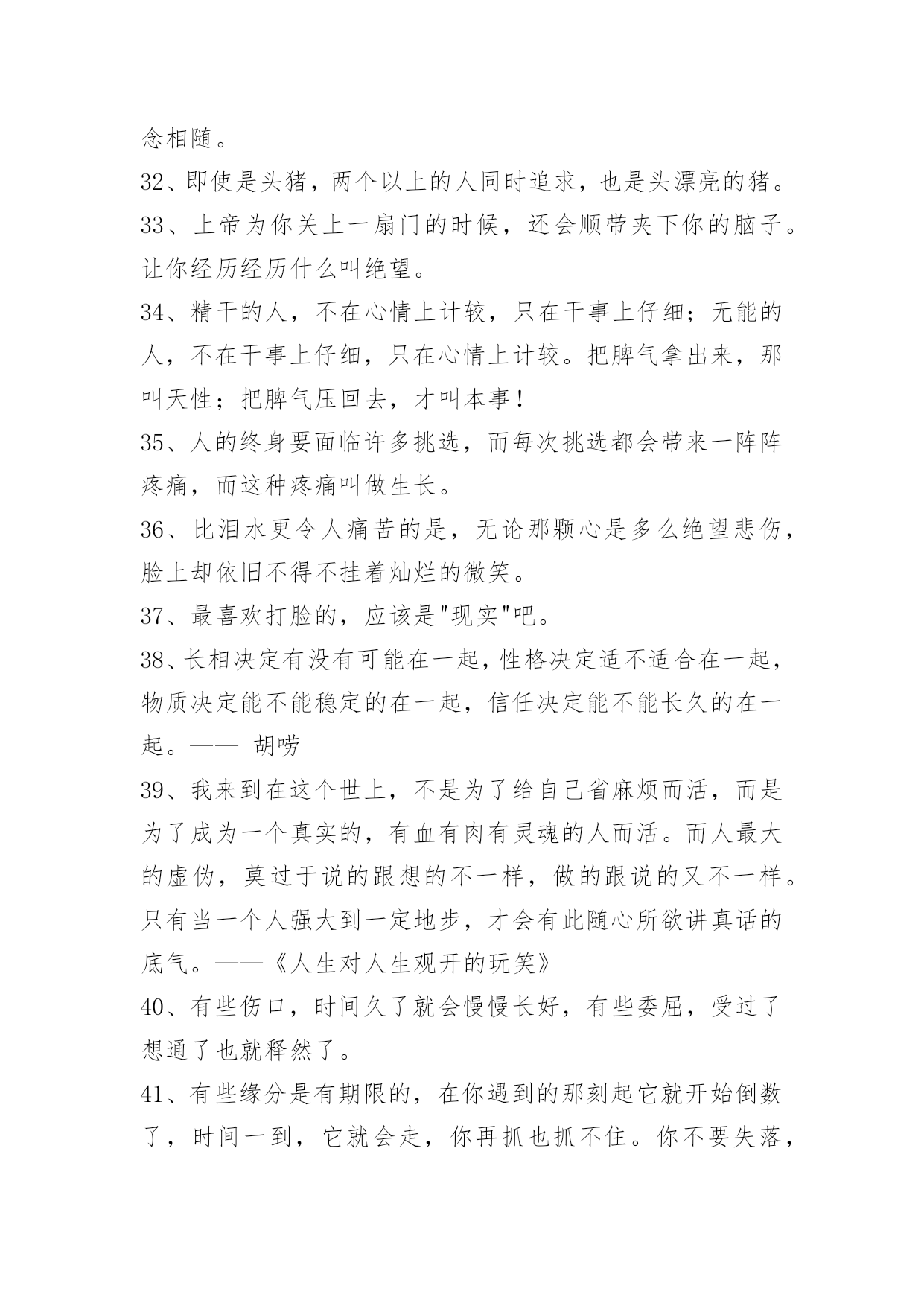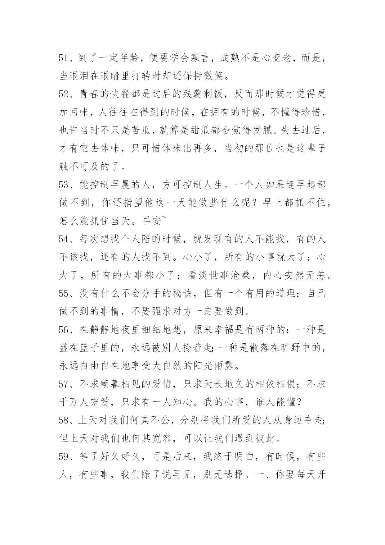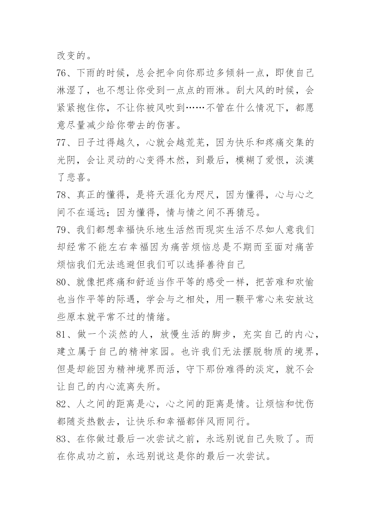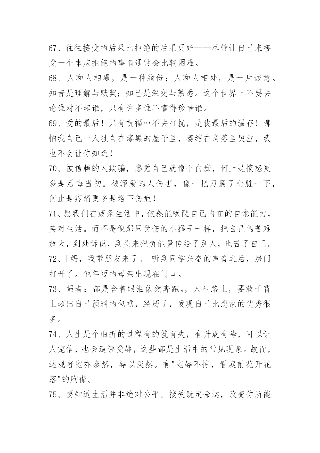 鸡汤个性朋友圈文案经典鸡汤个性朋友圈文案90句精选别让不相关的人,影响了你的心境,影响了你的睡眠。以下这篇文章是小编整理的一些鸡汤个性朋友圈文案,一起来看一下吧。1、女性的自我教育。教育一个男人,是教育一个人;而教育一个女人,是教育一个家庭,教育三代人。也就是教育一个民族,所以,教育女人更重要,女性的自我教育更重要:专业知识或技术可能使你获得成功,与某种程度的满足感,但没有平与、宁静、成熟的心智,就很难好幸福生活。2、无论你认为生活怎么不如意,不论你在前进中遇到多大的挫折,你都应该鼓起勇气顽强地活下去。因为在这个世界上毕竟有你留恋的东西,还有关心你、爱护你的人。3、最熟悉的东西,最易有陌生感。近在眼前的人,了解起来最难。从心理角度看,相处越久的两个人,越少了彼此了解的兴趣。于是就有了爱的盲区。世上最遥远的人,或许就是离你最近的人。4、有美貌而没美德,犹如虽香而有毒的花朵。5、一个一味地沉溺于往事的人,是不能张开双臂拥抱今天、憧憬明天的。6、一个高尚的人,当他感到自己的爱对于别人是一种温暖时,他是快乐的。7、办公室关系,最根本的就是做人的问题。身边同事处理好关系,平时有效沟通则是在职场中生存的基础,这点确实很重要。公室里适当串门可提升沟通效力,舒缓工作中紧张的气氛,心情也会变得开朗。8、巧放办公室里的烟幕弹,迷住别人而不是自己。9、我梦想驱驰于塞北苍茫辽阔的大漠,在猎猎的朔风中,感受长河落日的情怀;我梦想,置身于江南小桥流水的小镇,在绵绵的细雨中,体味水村莺啼的情调。10、方向;尺度,决定成败。11、一片叶子能载来一个春天,一个强者能升华一个世界。没有时间思索的科学家,是一个毫无指望的科学家。12、人好的时候要找一只备胎,人不好的时候要找一条退路。世界上最快乐的事,莫过于为理想而奋斗。13、在你快乐的时候,不去奉承你,在你需要的时候,默默为你做事,看似远离,实际上时刻关注着你的人,才是知己。14、一块不走的表,每天也有两次是准的。即使再笨的人,也有提出高明见解的时候。15、当人获得自由的时候,自由本身就成为他的束缚;人走到哪里,都是在城堡之中。16、做生意应坚持这样一个观点,就叫做获取利润之后的利润,核算成本之前的成本。学会让而不是学会送,商人的最高境界是让,送是慈善。——冯仑早安!17、一帆风顺只是梦呓,人生总有坎坷崎岖,漫长人生绝不允许,轻言放弃无所作为。挫折磨砺人更坚毅,更加成熟无所畏惧,挫败令人心明眼利,处世经验不断积累。化做前进致胜阶梯,便于前进再度搏击,挫折使你明辨是非,找到规律成功顺利。感悟世间事,体会真善美,人生成功来之不易,今日拥有应当珍惜,爱惜生命,禅意芬芳人生瑰丽。加油,早安!18、人一生中会遇到不顺心的事,会碰到不顺眼的人,如果你不学会原谅,就会活得痛苦,活得累。原谅是一种风度,是一种情怀,它像一把伞,帮助你在雨季里行路。学会原谅,快乐至上。19、并不是每个人都很乐意和你做朋友,即使你对每个人都做到仁至义尽。20、比如占有多少才更荣耀,拥有什么才能被爱。等你们长大,你们会因为绿芽冒出土地而喜悦,会对初升的朝阳欢呼跳跃,你会给别人善意和温暖。但是却会在赞美别的生命的同时,常常甚至永远的忘了自己的珍贵。21、对感情的尊重应该是这样:开始的时候要端庄,不要轻率,否则你在对方心中就不会很珍贵;结束的时候要理智,不要恋恋,不然对方会更加骄傲自己的吸引力,你在人家心中就更没有份量。分手如同结束一场宴会,美味已经吃完了,剩下的都是些残羹剩饭,不走何待?是否一定要让自己倒了胃口才肯离开。22、俗话说:"朋友就像是一面镜子",有时候你可以在朋友身上看见很多跟自己相似的地方,可以藉机修正错误,或是了解自己的长处。23、想跟你说:朋友是会默默在身边支持你的,如果碰到了不顺心的事情就回头看看,你会发现还有我从始至终都在陪伴着你。快活起来吧!24、风雨中我们珍惜一份淋漓,阳光中我们珍惜一段温暖,思念中我们珍惜一份真情,朋友,平凡就是最大的幸福。25、有句话说的好;深宫外的人向往宫里的荣华富贵,而宫里的人羡煞宫外人的自由洒脱,我们不是当事人,也无法理解他们的心情,道理很简单,当我们在仰慕别人幸福的同时,也正在被别人仰慕着,短暂的人生慎重选择,错选才是人身最大的悲剧。26、勤劳的女人是最值得尊敬的女人,如果你想改变自己的命运就让自己做一个勤劳的人吧。永远相信靠自己的双手一定可以改变自己的命运。俗话说付出总有回报就是这个道理。27、一个人不管你有多大的委屈,历史绝不会陪你哭泣,而他只认你的贡献。28、童话不完全是完美的,现实也不完全是残酷的。29、对每个人心存感激,因为生活是人群共同建立的。没有他人,也不可能有我。30、你娶了我,只是身边多了一个人,我嫁给你,身边却是多了一家子人,你们都过着习惯的生活,我却要舍弃我习惯的生活,结婚到