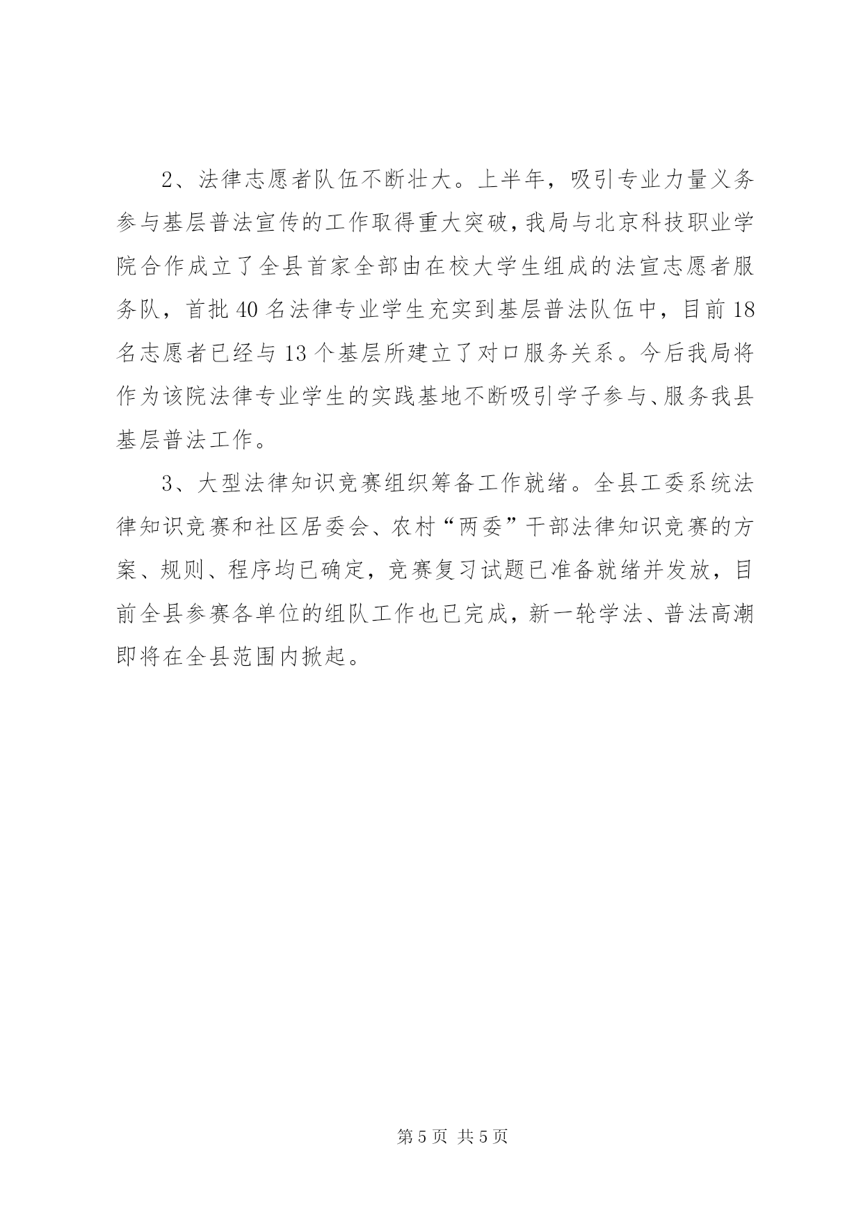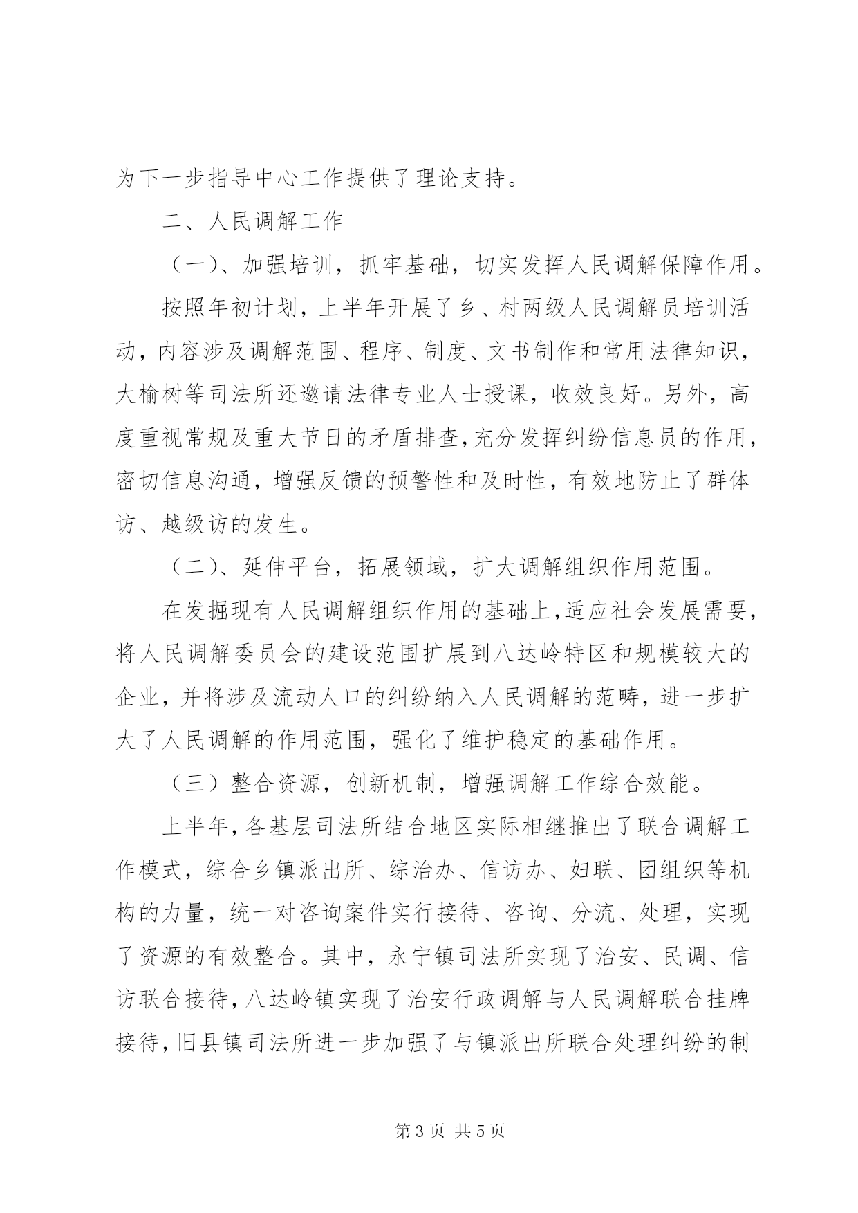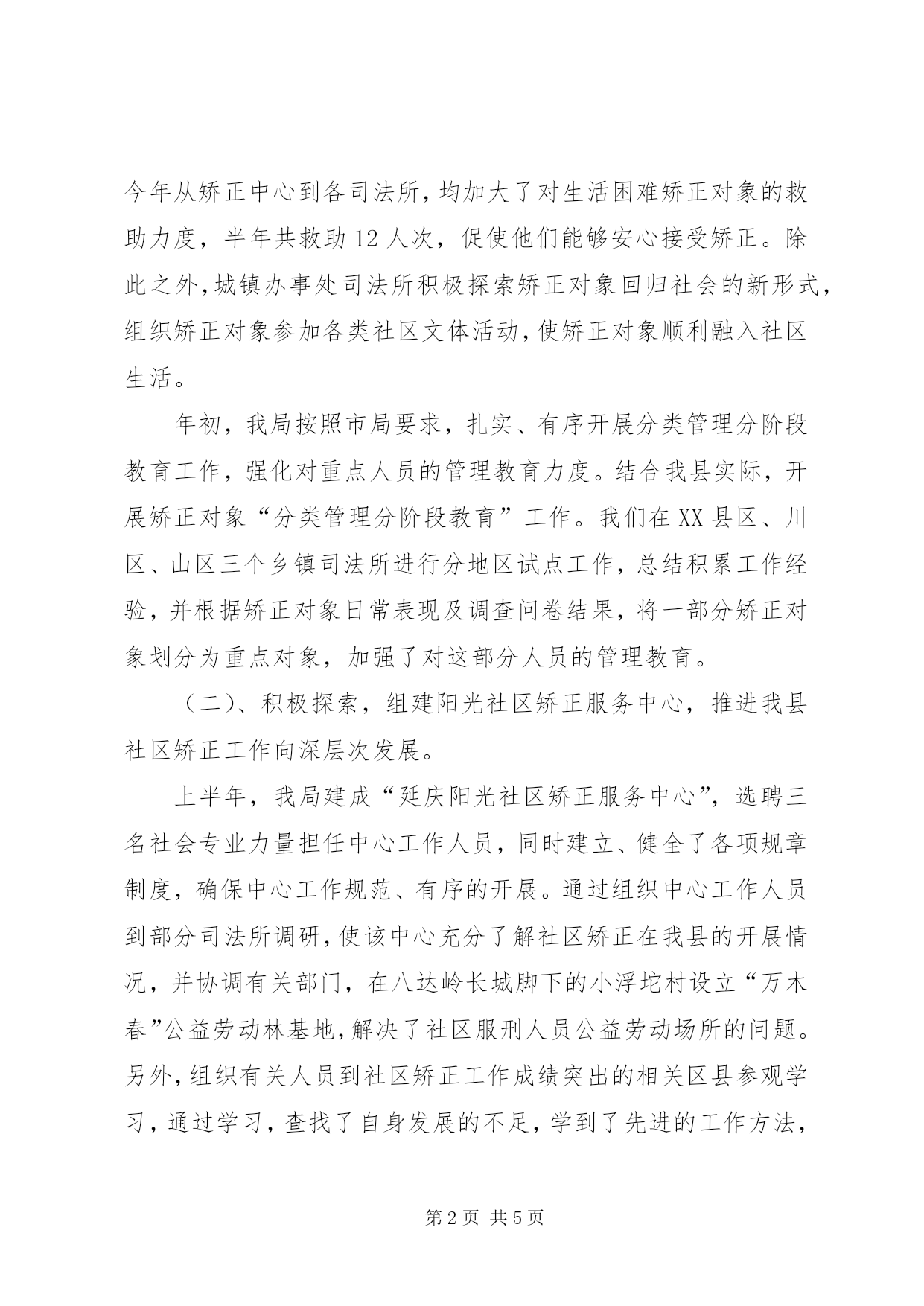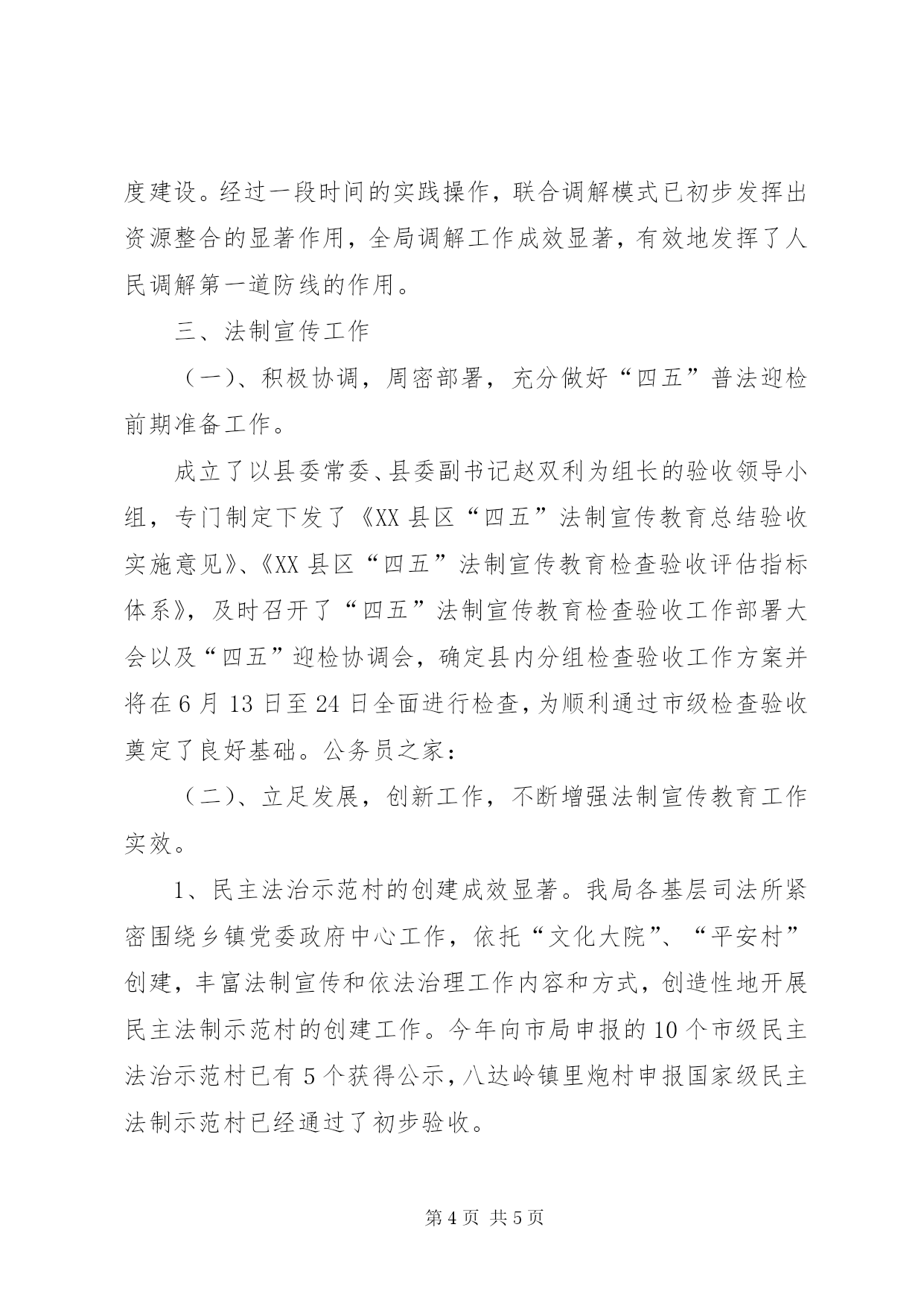 第PAGE\*Arabic\*MERGEFORMAT5页共NUMPAGES\*MERGEFORMAT5页司法行政半年工作总结汇报上半年,我局在县委、县政府以及市局的领导下,深入贯彻党的十六大和十六届四中全会五中全会精神,坚持以“三个代表”重要思想为指导,紧紧围绕我县构建和谐社会的总体目标,深入开展“保持党员先进性教育”活动,以“机关效能年”为工作契机,扎实工作,有力地维护了社会稳定,取得了阶段性成效。截止到5月底,共调处各类民间纠纷1223件,防止矛盾激化7件,防止群体性上访18件,开展法律宣传162场次,组织法制专题培训72场次,办理各类公证79件,承办法律援助案件45件,受聘担任企事业法律顾问101家,避免、挽回经济损失227万多元。一、社区矫正工作(一)、巩固基础、完善制度,扎实开展我县社区矫正工作。上半年,我县共有社区矫正对象114人,其中缓刑67人,假释28人,剥权17人,监外执行2人。年初,我局提出以开展业务工作为切入点,规范、提高我县社区矫正整体工作,制定了指导性的工作要点,明确工作努力方向。采取多种帮教形式,用关怀与感化,促进矫正对象顺利回归社会。针对去年全市矫正对象重新犯罪多发生在缓刑和剥夺政治权利两类人员的情况,我局采取以刑满释放人员现身说法,提高警示教育效果的形式,对矫正对象开展教育活动,收到良好效果。在加强思想教育的同时,今年从矫正中心到各司法所,均加大了对生活困难矫正对象的救助力度,半年共救助12人次,促使他们能够安心接受矫正。除此之外,城镇办事处司法所积极探索矫正对象回归社会的新形式,组织矫正对象参加各类社区文体活动,使矫正对象顺利融入社区生活。年初,我局按照市局要求,扎实、有序开展分类管理分阶段教育工作,强化对重点人员的管理教育力度。结合我县实际,开展矫正对象“分类管理分阶段教育”工作。我们在XX县区、川区、山区三个乡镇司法所进行分地区试点工作,总结积累工作经验,并根据矫正对象日常表现及调查问卷结果,将一部分矫正对象划分为重点对象,加强了对这部分人员的管理教育。(二)、积极探索,组建阳光社区矫正服务中心,推进我县社区矫正工作向深层次发展。上半年,我局建成“延庆阳光社区矫正服务中心”,选聘三名社会专业力量担任中心工作人员,同时建立、健全了各项规章制度,确保中心工作规范、有序的开展。通过组织中心工作人员到部分司法所调研,使该中心充分了解社区矫正在我县的开展情况,并协调有关部门,在八达岭长城脚下的小浮坨村设立“万木春”公益劳动林基地,解决了社区服刑人员公益劳动场所的问题。另外,组织有关人员到社区矫正工作成绩突出的相关区县参观学习,通过学习,查找了自身发展的不足,学到了先进的工作方法,为下一步指导中心工作提供了理论支持。二、人民调解工作(一)、加强培训,抓牢基础,切实发挥人民调解保障作用。按照年初计划,上半年开展了乡、村两级人民调解员培训活动,内容涉及调解范围、程序、制度、文书制作和常用法律知识,大榆树等司法所还邀请法律专业人士授课,收效良好。另外,高度重视常规及重大节日的矛盾排查,充分发挥纠纷信息员的作用,密切信息沟通,增强反馈的预警性和及时性,有效地防止了群体访、越级访的发生。(二)、延伸平台,拓展领域,扩大调解组织作用范围。在发掘现有人民调解组织作用的基础上,适应社会发展需要,将人民调解委员会的建设范围扩展到八达岭特区和规模较大的企业,并将涉及流动人口的纠纷纳入人民调解的范畴,进一步扩大了人民调解的作用范围,强化了维护稳定的基础作用。(三)整合资源,创新机制,增强调解工作综合效能。上半年,各基层司法所结合地区实际相继推出了联合调解工作模式,综合乡镇派出所、综治办、信访办、妇联、团组织等机构的力量,统一对咨询案件实行接待、咨询、分流、处理,实现了资源的有效整合。其中,永宁镇司法所实现了治安、民调、信访联合接待,八达岭镇实现了治安行政调解与人民调解联合挂牌接待,旧县镇司法所进一步加强了与镇派出所联合处理纠纷的制度建设。经过一段时间的实践操作,联合调解模式已初步发挥出资源整合的显著作用,全局调解工作成效显著,有效地发挥了人民调解第一道防线的作用。三、法制宣传工作(一)、积极协调,周密部署,充分做好“四五”普法迎检前期准备工作。成立了以县委常委、县委副书记赵双利为组长的验收领导小组,专门制定下发了《XX县区“四五”法制宣传教育总结验收实施意见》、《XX县区“四五”法制宣传教育检查验收评估指标体系》,及时召开了“四五”法制宣传教育检查验收工作部署大会以及“四五”迎检协调会,确定县内分组检查验收工作方案并将在6月13日至24日全面进行检查,为顺利通过市级检查验收奠定了良好基础。公务员之家:(二)、立足发展,创新工作,不断增强法制宣传教育工作实效。1、民主法治示范村的创建成效显著。我局各