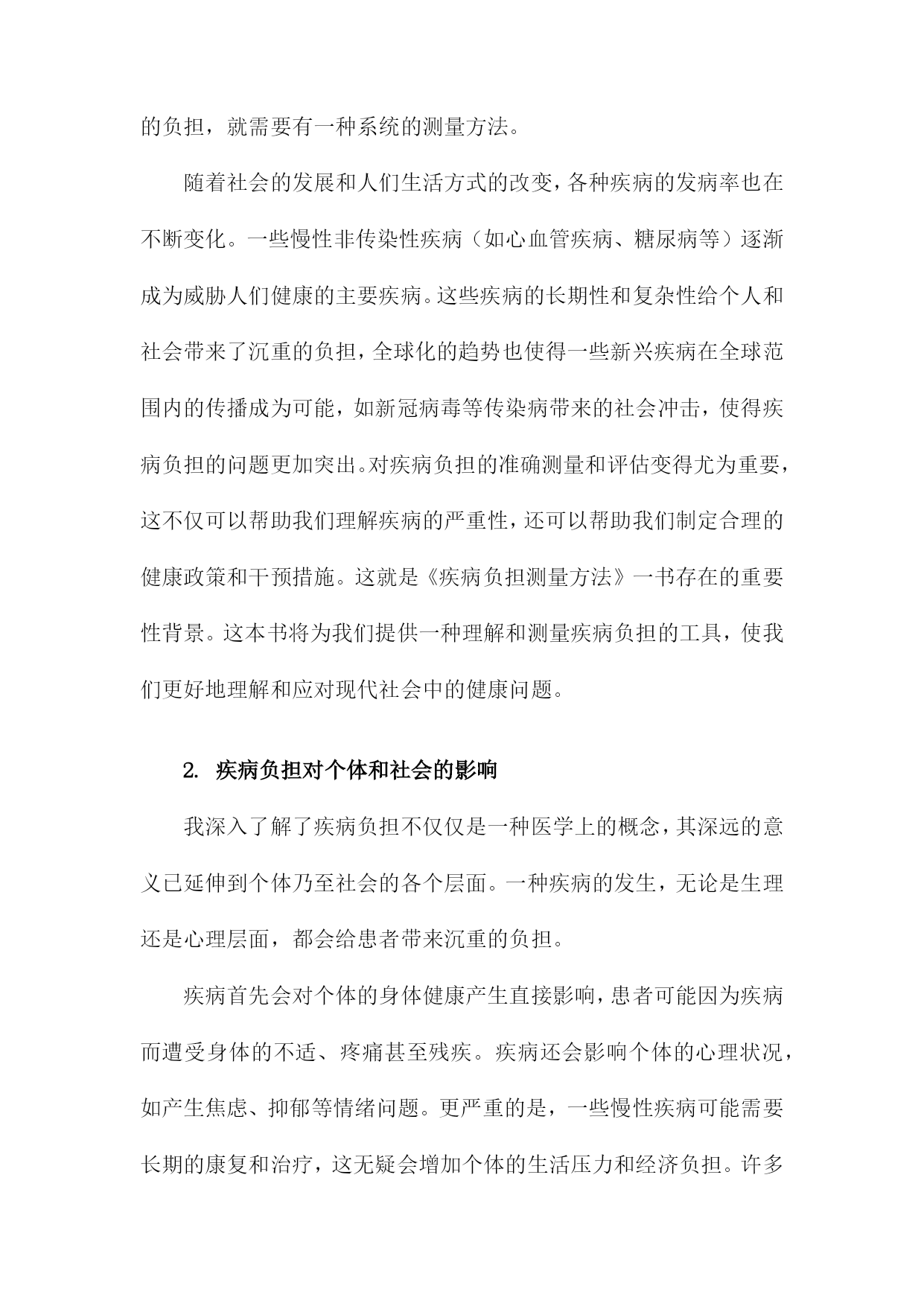 《疾病负担测量方法》读书随笔一、书籍简介《疾病负担测量方法》是一本专注于探讨疾病负担测量技术的专业书籍。这本书为我们详细介绍了疾病负担的概念,背景及其测量方法,帮助读者理解疾病负担在公共卫生政策制定、医疗资源分配以及健康促进等方面的重要性。本书内容丰富,涵盖了疾病负担的基本理论、测量方法、实际应用以及未来发展趋势等多个方面。本书首先从宏观上阐述了疾病负担的定义和内涵,以及为何需要对其进行测量。详细描述了疾病负担测量的各种方法,包括发病率测量、死亡率测量、疾病负担的经济负担评估等。书中还介绍了疾病负担测量在实际公共卫生管理中的应用,如健康政策的制定、医疗资源的合理配置以及健康状况的监测与评估等。这本书为读者提供了从理论到实践的综合指南,使读者能够深入理解并掌握疾病负担测量的方法和应用。二、阅读背景在我探索公共卫生与流行病学领域的旅程中,《疾病负担测量方法》一书成为我重要的学习参考。随着全球卫生环境的不断变化,疾病负担问题愈发凸显,成为各国政府和学术界关注的焦点。在此背景下,对疾病负担的准确测量和评估显得尤为重要。这不仅关乎公共卫生政策的制定与实施,更关乎每一个个体的健康福祉。三、正文内容疾病负担是指由于疾病导致的健康损失和社会经济损失,通过阅读本书,我了解到疾病负担不仅仅是患者个人的问题,也涉及到家庭、社区和社会的层面。疾病负担的严重程度直接影响到社会的经济发展和社会稳定,对疾病负担的测量具有重要的现实意义。书中详细介绍了疾病负担的测量方法,包括定性测量和定量测量。定性测量主要是通过观察、访谈等方式获取疾病的相关信息,定量测量则是通过收集数据,运用统计学方法进行量化分析。这些方法都有其特点和适用范围,需要根据实际情况进行选择。正文部分还对不同的疾病进行了具体的负担分析,包括常见疾病和罕见疾病。通过对这些疾病的发病率、死亡率、医疗费用、生活质量等方面的分析,我了解到不同疾病的负担差异及其原因。这为制定针对性的疾病预防和控制措施提供了依据。书中还探讨了疾病负担与社会因素的关联,如经济发展水平、社会保障制度、文化背景等。这些因素都会对疾病负担产生影响,了解这些关联,有助于我们从更广阔的角度看待疾病问题,制定更全面的应对策略。在阅读过程中,我总结了书中关于应对疾病负担的措施与建议。主要包括加强疾病预防、提高医疗服务质量、完善社会保障制度、加强健康教育等方面。这些措施对于减轻疾病负担、提高人民健康水平具有重要意义。《疾病负担测量方法》是一本非常有价值的书籍,通过阅读本书,我深刻认识到疾病负担的严重性及其测量方法的重要性。我也了解了不同疾病的负担差异及其与社会因素的关联,这将对我未来的学习和工作产生深远的影响。1.疾病负担的定义和背景在我们的日常生活中,疾病不仅仅是身体上的痛苦,它也带来了一系列社会经济和心理的影响。在阅读《疾病负担测量方法》我对疾病负担有了更深入的了解。这本书以丰富的知识和独到的视角,向我们展示了疾病负担的多维度特性及其背后的复杂背景。疾病负担(DiseaseBurden)一词,是指由于疾病的存在及其发展带来的社会经济和心理压力的总和。它不仅涵盖了患者个人的生理痛苦,也包括了家庭和社会的经济负担、心理压力以及对健康资源的占用等方面。这种多维度的影响,使得疾病负担的测量变得复杂且多元化。疾病负担的严重性主要取决于疾病的发病率、疾病的持续时间、病情严重程度以及治疗方式的效果和费用等因素。要准确地衡量疾病的负担,就需要有一种系统的测量方法。随着社会的发展和人们生活方式的改变,各种疾病的发病率也在不断变化。一些慢性非传染性疾病(如心血管疾病、糖尿病等)逐渐成为威胁人们健康的主要疾病。这些疾病的长期性和复杂性给个人和社会带来了沉重的负担,全球化的趋势也使得一些新兴疾病在全球范围内的传播成为可能,如新冠病毒等传染病带来的社会冲击,使得疾病负担的问题更加突出。对疾病负担的准确测量和评估变得尤为重要,这不仅可以帮助我们理解疾病的严重性,还可以帮助我们制定合理的健康政策和干预措施。这就是《疾病负担测量方法》一书存在的重要性背景。这本书将为我们提供一种理解和测量疾病负担的工具,使我们更好地理解和应对现代社会中的健康问题。2.疾病负担对个体和社会的影响我深入了解了疾病负担不仅仅是一种医学上的概念,其深远的意义已延伸到个体乃至社会的各个层面。一种疾病的发生,无论是生理还是心理层面,都会给患者带来沉重的负担。疾病首先会对个体的身体健康产生直接影响,患者可能因为疾病而遭受身体的不适、疼痛甚至残疾。疾病还会影响个体的心理状况,如产生焦虑、抑郁等情绪问题。更严重的是,一些慢性疾病可能需要长期的康复和治疗,这无疑会增加个体的生活压力和经济负担。许多患者可能因为高昂的医疗费用而陷入经济困境,生活质量大大降低。疾病的社会