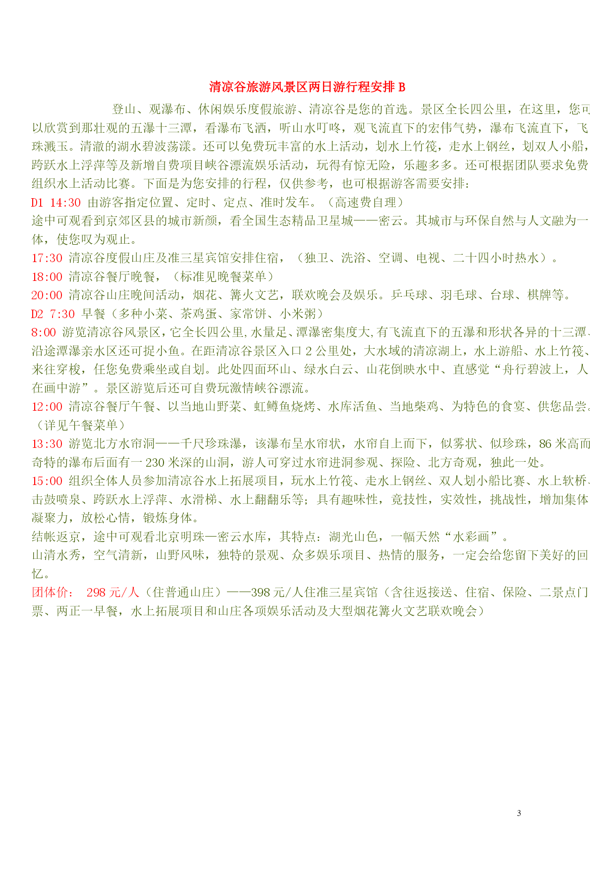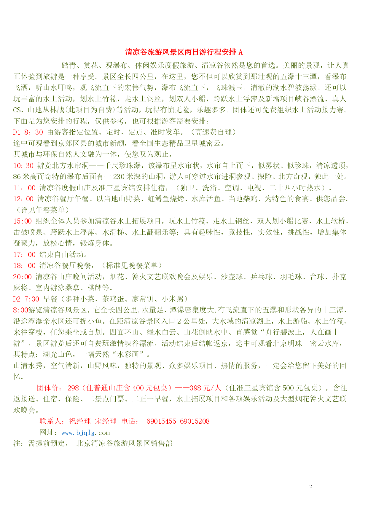 PAGEPAGE3京郊旅游胜地-清凉谷旅游风景区每年的4月15日至10月31日推出“没有后悔的旅游天地”,30人以上的团体凭有效证件,可以先旅游,后付款。清凉谷景区是一条流线型的风景画廊,有以下三绝:一、水量足。俗话说“水为山之魂”无论是在汛期还是春、秋干旱季节,在景区内您可以观看到蔚为状观的清潭、飞瀑。二、潭瀑密集。著名旅游界权威人士HYPERLINK"http://baike.baidu.com/view/1394353.htm"\t"_blank"卢云亭教授曾考察此景区认为“该景区的潭、瀑密集度在京郊罕见”,在不到四公里的游程内,分布着形状各异、大小不一的五瀑十三潭,有的象勺子,有的象眼镜,有的象杯子。三、HYPERLINK"http://baike.baidu.com/view/29736.htm"\t"_blank"瀑布高悬奇特。从景区西行5公里是清凉谷景区所属有北方“HYPERLINK"http://baike.baidu.com/view/114909.htm"\t"_blank"水帘洞”之称的千尺珍珠瀑景观,它高85.6米,巨大的瀑布自巨大的山洞外飞流直下,游人至此无不感慨“飞流直下三千飞,疑是银河落九天”,那绝妙的境界。清凉谷度假山庄为日式榻榻咪结构,在这里度假您只需花普通的价格来享受异国风味住宿,内设独立卫生间、洗澡间,另外还有集体沐浴的四人间,这里的餐饮以山野风味为主,独其特色,有野味烧烤,山鸡、野兔、贴饼子、小米粥等。另外,景区配套了相应的HYPERLINK"http://baike.baidu.com/view/682885.htm"\t"_blank"娱乐项目:篝火晚会、HYPERLINK"http://baike.baidu.com/view/98519.htm"\t"_blank"卡拉OK,野趣垂钓、山泉沐浴、漂流等项目。HYPERLINK"http://baike.baidu.com/view/74721.htm"\t"_blank"清凉谷风景区管理处诚邀京、津两地的旅行社车队、机关团体等来景区实地考察,推出此无悔游程。景区地址及路线:地址:密云县石城镇四合堂地区咨询电话:6901520869015455业务经理手机:13910622184开园时间:8:00——18:00夏天:7:30——18:30清凉谷风景区行车路线:自驾车线路(1)北四环、北五环上京承高速(16出口)密云城区出口水库方向(向北直行),过黑龙潭直行13公里清凉谷景区即到。自驾车线路(2)怀柔城区走雁西湖方向怀丰公路(111国道)至云梦仙境路口即右转(有清凉谷、四合堂路标指示)行18公里即到清凉谷景区。自驾车线路(3)走京密路(即101国道)到密云城区第二个红绿灯左转水库方向(往北方向)过黑龙潭直行13公里即到。乘车线路:东直门长途汽车站坐980快车至密云鼓楼站,原地往回走(往南红绿灯方向)30米乘密63路到清凉谷下车即到。东直门站980路约10钟就走一趟,密云鼓楼站密63路是周一至周五上午两趟,时间是7:00、9:00下午是两趟13:30、16:30,周六、日是上午、下午各三趟,时间是上午7:00、9:00、11:00,下午13:30、15:0016:30清凉谷旅游风景区两日游行程安排A踏青、赏花、观瀑布、休闲娱乐度假旅游、清凉谷依然是您的首选。美丽的景观,让人真正体验到旅游是一种享受。景区全长四公里,在这里,您不但可以欣赏到那壮观的五瀑十三潭,看瀑布飞洒,听山水叮咚,观飞流直下的宏伟气势,瀑布飞流直下,飞珠溅玉。清澈的湖水碧波荡漾。还可以玩丰富的水上活动,划水上竹筏,走水上钢丝,划双人小船,跨跃水上浮萍及新增项目峡谷漂流、真人CS、山地丛林战(此项目为自费)等活动,玩得有惊无险,乐趣多多。团体还可免费组织水上活动接力赛。下面是为您安排的行程,仅供参考,也可根据游客需要安排:D18:30由游客指定位置、定时、定点、准时发车。(高速费自理)途中可观看到京郊区县的城市新颜,看全国生态精品卫星城密云。其城市与环保自然人文融为一体,使您叹为观止。10:30游览北方水帘洞——千尺珍珠瀑,该瀑布呈水帘状,水帘自上而下,似雾状、似珍珠,清凉透顶,86米高而奇特的瀑布后面有一230米深的山洞,游人可穿过水帘进洞参观、探险、北方奇观,独此一处。11:00清凉谷度假山庄及准三星宾馆安排住宿,(独卫、洗浴、空调、电视、二十四小时热水)。12:00清凉谷餐厅午餐、以当地山野菜、虹鳟鱼烧烤、水库活鱼、当地柴鸡、为特色的食宴、供您品尝。(详见午餐菜单)15:00组织全体人员参加清凉谷水上拓展项目,玩水上竹筏、走水上钢丝、双人划小船比赛、水上软桥、击鼓喷泉、跨跃水上浮萍、水滑梯、
