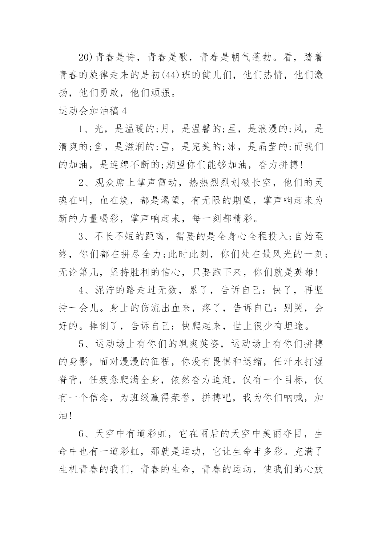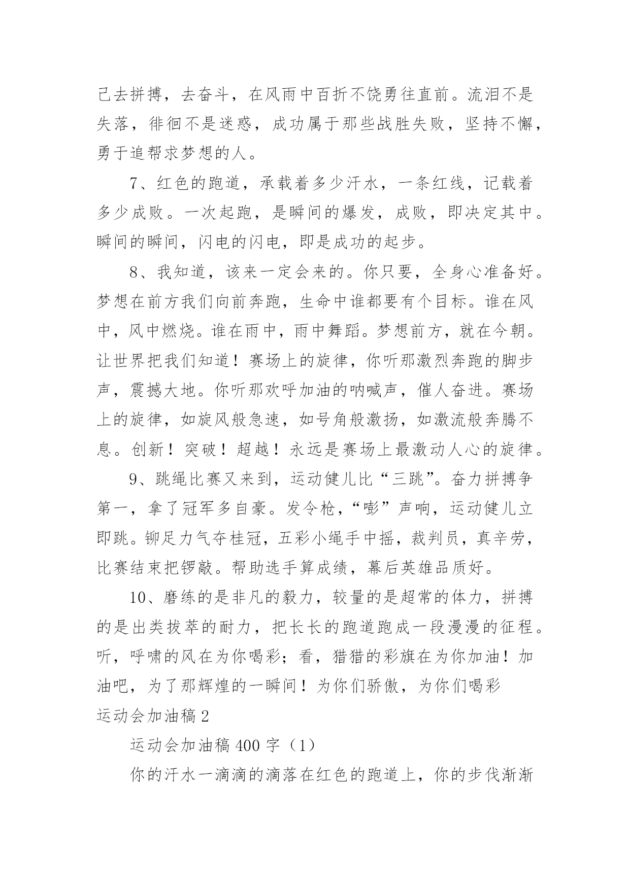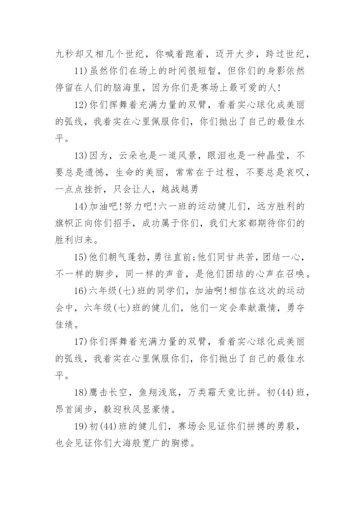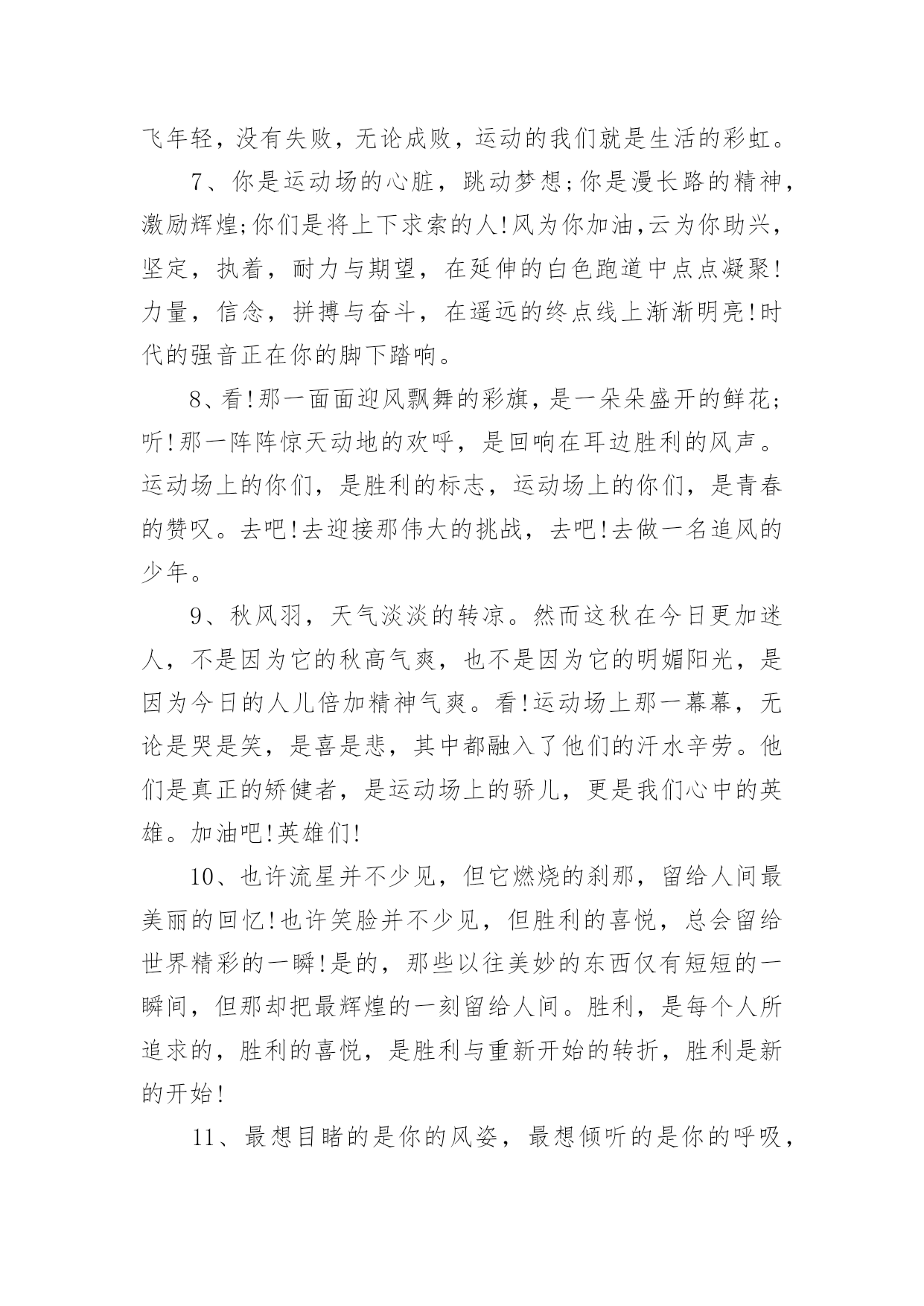 运动会加油稿运动会加油稿在当今社会生活中,我们都跟加油稿有着直接或间接的联系,加油稿是鼓励激励对方的文稿。为了让您在写加油稿时更加简单方便,以下是小编整理的运动会加油稿,仅供参考,希望能够帮助到大家。运动会加油稿11、面对艰苦的征程,你们毫不畏惧,接力棒在你们手中传递着集体的力量,听,我们在为你呐喊,你们诠释着奥运的精神,你们是我们心中的骄傲,深深的呼吸,等待你的是艰难的800米。相信胜利会属于你们,但在这征途上,需要你勇敢的心去面对。我们在为你加油,你是否听到了我们发自内心的呐喊,困难和胜利都在向你招手,去呀,不要犹豫,快去击败困难,快去夺取胜利,相信你会送给我们一个汗水浸湿的微笑。2、天空中有道彩虹,它在雨后的天空中美丽夺目,生命中也有一道彩虹,那就是运动,他让生命丰富多彩。充满了生机青春的我们,青春的生命,青春的运动,使我们的心放飞、年轻,没有失败,无论成败,运动的我们就是生活的彩虹。3、运动场上有你们的飒爽英姿,运动场上有你们拼搏的身影,面对漫漫的征程,你没有畏惧和退缩,任汗水打湿脊背,任疲惫爬满全身,依然分离追赶,只有一个目标,只有一个信念,为班级赢得荣誉,拼搏吧,我为你们呐喊,加油!4、是体育场上游走的.火焰,是来去不息的脚步,是风中飞舞的树叶折射的金色光芒,藉此,可以诠释运动员兴奋的脸庞。那轻盈的步伐似飞鸟的翅膀,那清脆的枪声响彻天际,它粲然升起那跃动的渴望,起跑、加速、超越、冲刺,一步一步延向胜利的曙光。那是力的比拼,素质的较量,是石榴树上,跃动的心脏。5、每一份辛劳都有一份收获,每一次的痛苦都是快乐的开始,没一声呐喊都是力量的呼唤。我们有着大浪拍岸的豪迈,所以你不必在乎小荷初露的恬静,我们有着春日的阳光明媚,所以不用去羡慕冬日乱玉碎琼,我们是雨天的一把伞,是寒冷冬日里的一盆碳火,温暖的不只是你我,而是大家的心。运动场上的健儿,掌声属于你们,鲜花属于你们,成功也是属于你们!6、汗水,泪水;笑声,歌声;俺们尽情挥洒。开幕式上,运动场上,俺们尽情展现,多少艰辛,多少困苦,俺们勇敢承担。因为年轻,因为张扬因为俺们知道:用今天的汗水换来明天的微笑。人生的路,有坦途,也有坎坷,做过的岁月,有欢笑,也有苦涩,泪水告诉俺一个跌倒的故事,汗水使俺多了一份沉重,几多成熟。理想究竟不同于现实,失败是生活的一部分,哪位也无法选择,无法抗拒,人生要自己去拼搏,去奋斗,在风雨中百折不饶勇往直前。流泪不是失落,徘徊不是迷惑,成功属于那些战胜失败,坚持不懈,勇于追帮求梦想的人。7、红色的跑道,承载着多少汗水,一条红线,记载着多少成败。一次起跑,是瞬间的爆发,成败,即决定其中。瞬间的瞬间,闪电的闪电,即是成功的起步。8、我知道,该来一定会来的。你只要,全身心准备好。梦想在前方我们向前奔跑,生命中谁都要有个目标。谁在风中,风中燃烧。谁在雨中,雨中舞蹈。梦想前方,就在今朝。让世界把我们知道!赛场上的旋律,你听那激烈奔跑的脚步声,震撼大地。你听那欢呼加油的呐喊声,催人奋进。赛场上的旋律,如旋风般急速,如号角般激扬,如激流般奔腾不息。创新!突破!超越!永远是赛场上最激动人心的旋律。9、跳绳比赛又来到,运动健儿比“三跳”。奋力拼搏争第一,拿了冠军多自豪。发令枪,“嘭”声响,运动健儿立即跳。铆足力气夺桂冠,五彩小绳手中摇,裁判员,真辛劳,比赛结束把锣敲。帮助选手算成绩,幕后英雄品质好。10、磨练的是非凡的毅力,较量的是超常的体力,拼搏的是出类拔萃的耐力,把长长的跑道跑成一段漫漫的征程。听,呼啸的风在为你喝彩;看,猎猎的彩旗在为你加油!加油吧,为了那辉煌的一瞬间!为你们骄傲,为你们喝彩运动会加油稿2运动会加油稿400字(1)你的汗水一滴滴的滴落在红色的跑道上,你的步伐渐渐沉重、缓慢。想起我曾经对你鼓励的话语,此刻都脆弱的不堪一击。努力、坚持。这些话语此时都没有了意义。我只在心底里为你祝福,为你鼓劲。企盼你能微笑着冲过终点,就在眼前的终点!校运会的召开,牵动着全体师生的心。看那平时伏案备课的老师,此刻也在跑道上跃跃欲试。为学习头疼的同学们,也为夺到第一而雀跃欢呼。严格的体育老师们,现在也细致亲切地为运动员们记录成绩。我不能在运动场上显身手,于是我就用手中的笔记录着美好的瞬间!汗水浸着衣衫,烈日灼着躯体,在这里,在那边,在运动员的每份成绩中,殊不知藏着裁判员的多少付出。正是他们,是他们造就了我们!谢谢你,我们的裁判员,我们会用自己的信念去搏取胜利,为此换来您一点点的欣慰。来吧,让我们为敬爱的裁判员们也来一些掌声吧!不为掌声的诠释,不为刻意的征服,只有辛勤的汗水化作追求的脚步。心中坚定的信念,脚下沉稳的步伐,你用行动诉说着一个不变的真理。没有比脚更长的路,没有比人更高的山。希望在终点向你招手。努力吧,用你坚韧不拔的毅志去迎接终点的鲜花与掌声。相信成功属于你。
