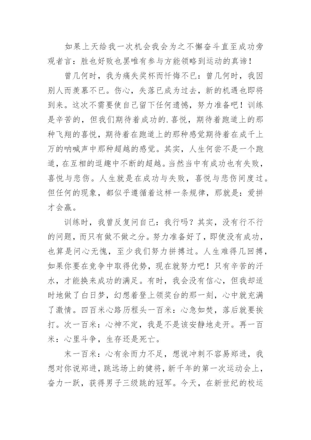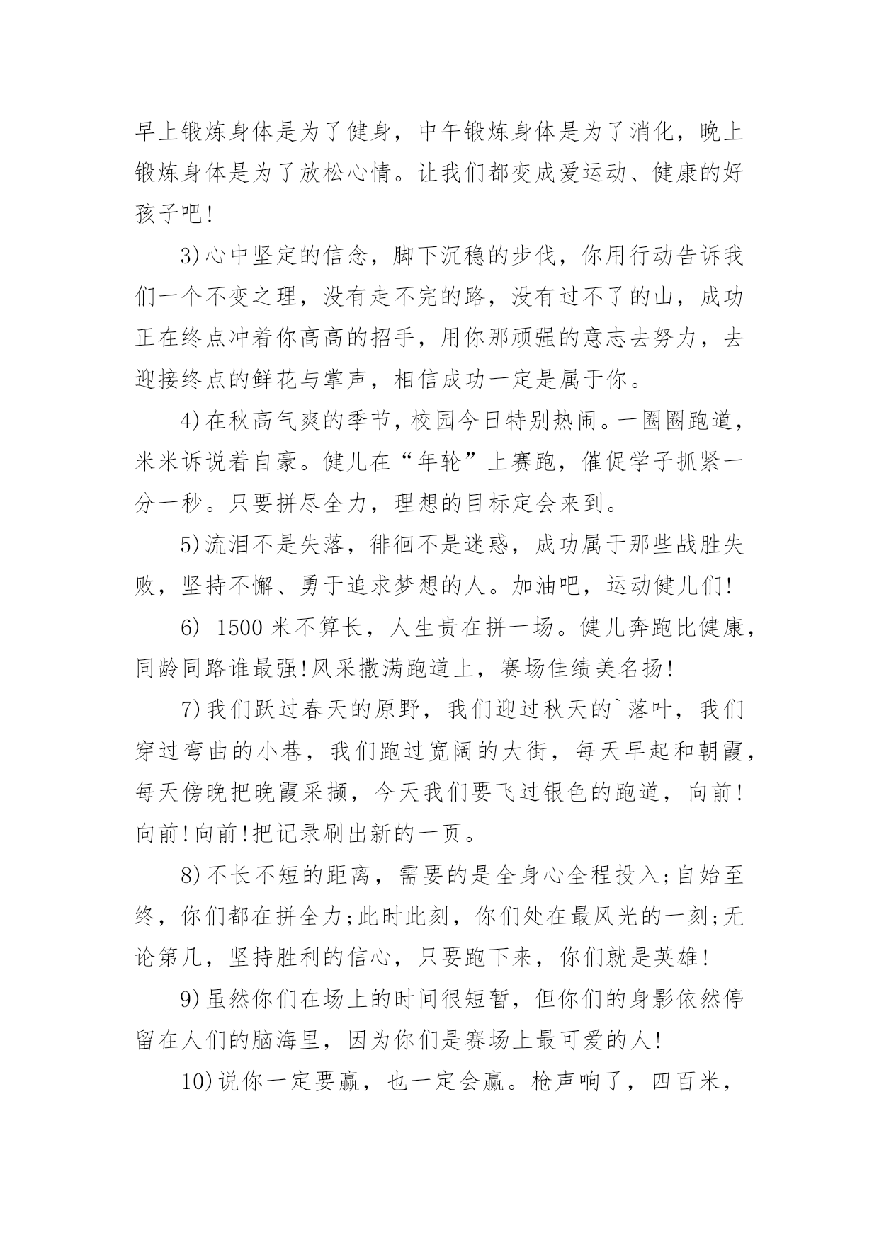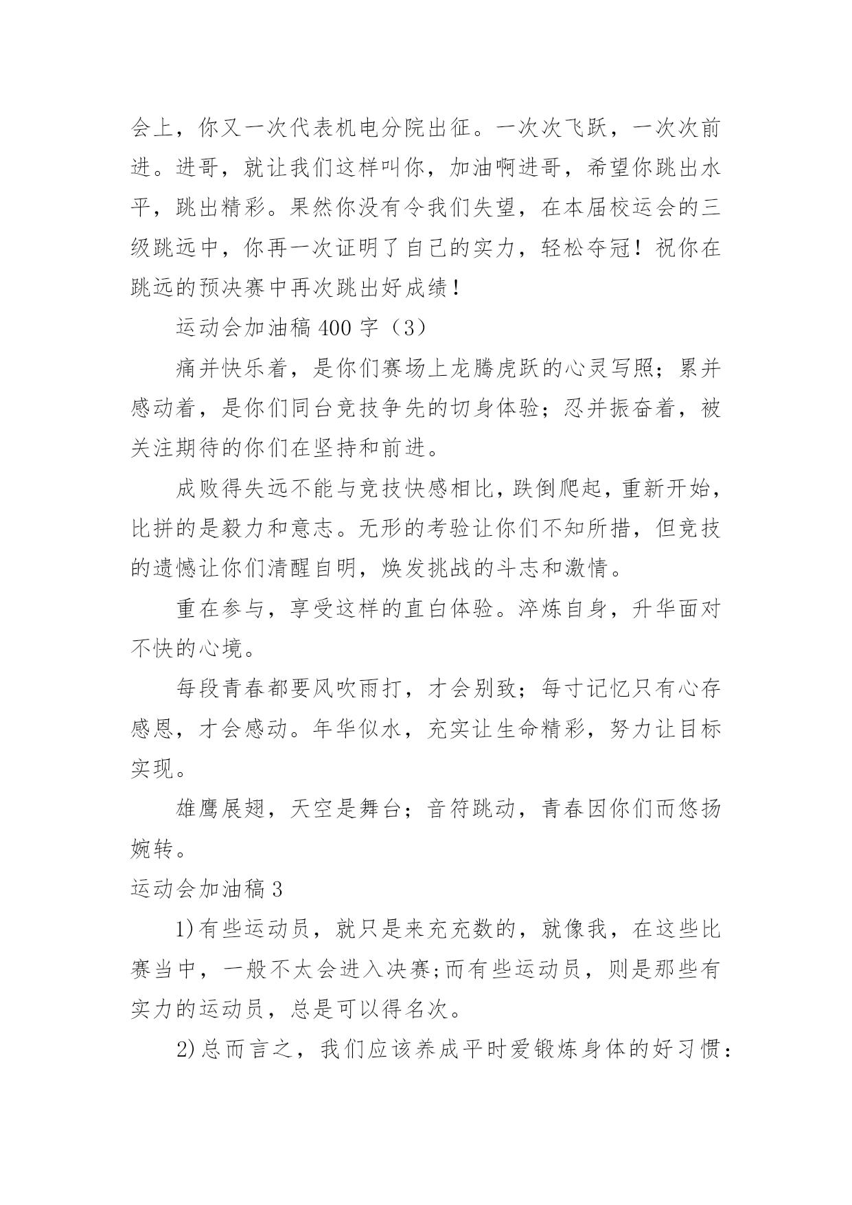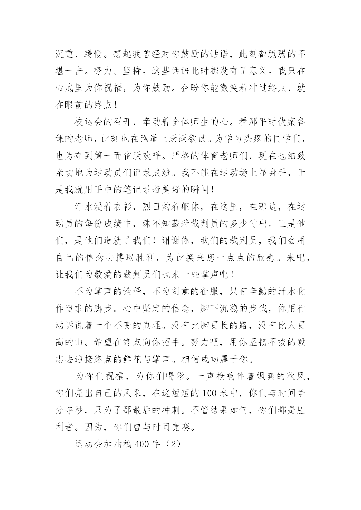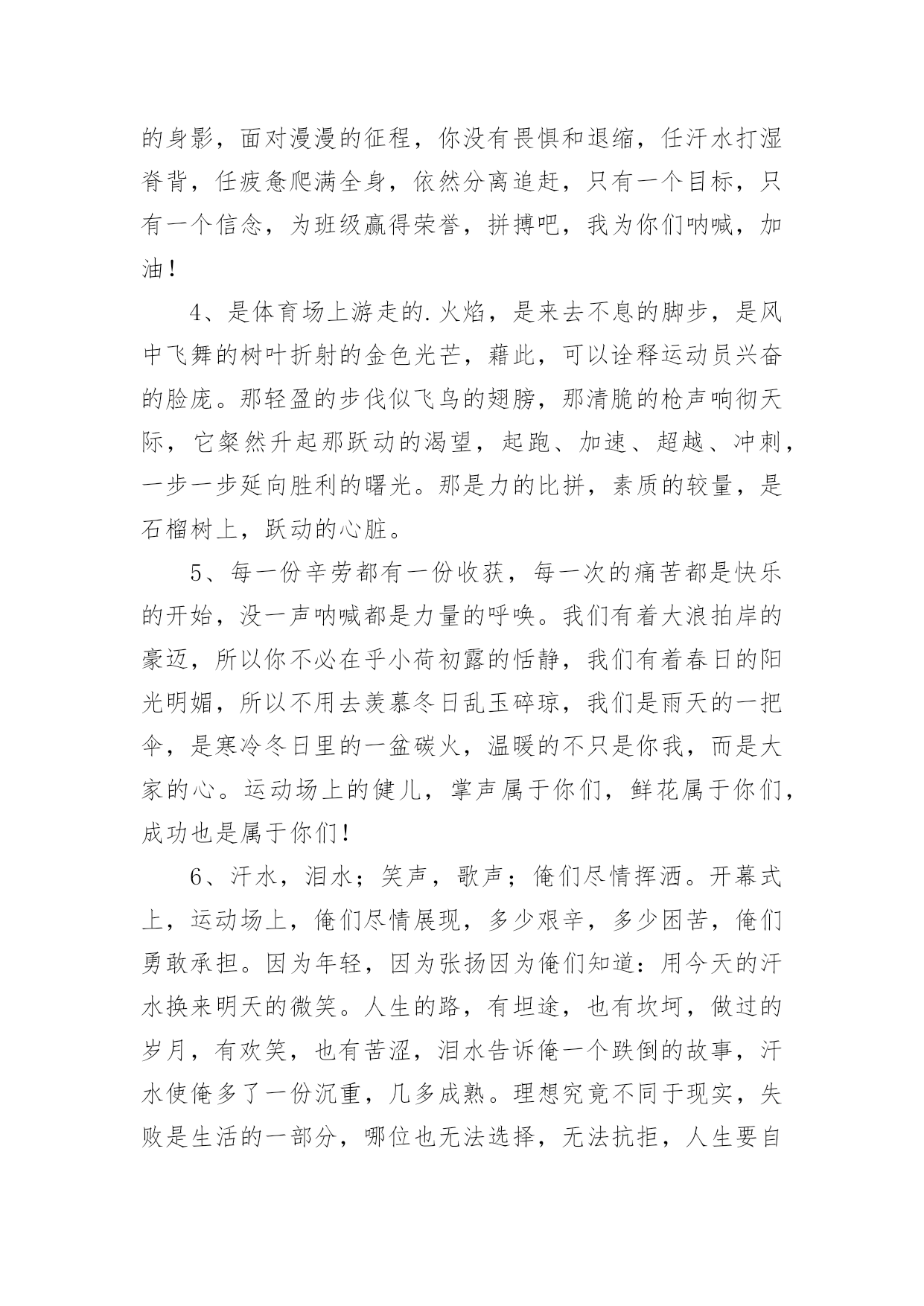 运动会加油稿运动会加油稿在当今社会生活中,我们都跟加油稿有着直接或间接的联系,加油稿是鼓励激励对方的文稿。为了让您在写加油稿时更加简单方便,以下是小编整理的运动会加油稿,仅供参考,希望能够帮助到大家。运动会加油稿11、面对艰苦的征程,你们毫不畏惧,接力棒在你们手中传递着集体的力量,听,我们在为你呐喊,你们诠释着奥运的精神,你们是我们心中的骄傲,深深的呼吸,等待你的是艰难的800米。相信胜利会属于你们,但在这征途上,需要你勇敢的心去面对。我们在为你加油,你是否听到了我们发自内心的呐喊,困难和胜利都在向你招手,去呀,不要犹豫,快去击败困难,快去夺取胜利,相信你会送给我们一个汗水浸湿的微笑。2、天空中有道彩虹,它在雨后的天空中美丽夺目,生命中也有一道彩虹,那就是运动,他让生命丰富多彩。充满了生机青春的我们,青春的生命,青春的运动,使我们的心放飞、年轻,没有失败,无论成败,运动的我们就是生活的彩虹。3、运动场上有你们的飒爽英姿,运动场上有你们拼搏的身影,面对漫漫的征程,你没有畏惧和退缩,任汗水打湿脊背,任疲惫爬满全身,依然分离追赶,只有一个目标,只有一个信念,为班级赢得荣誉,拼搏吧,我为你们呐喊,加油!4、是体育场上游走的.火焰,是来去不息的脚步,是风中飞舞的树叶折射的金色光芒,藉此,可以诠释运动员兴奋的脸庞。那轻盈的步伐似飞鸟的翅膀,那清脆的枪声响彻天际,它粲然升起那跃动的渴望,起跑、加速、超越、冲刺,一步一步延向胜利的曙光。那是力的比拼,素质的较量,是石榴树上,跃动的心脏。5、每一份辛劳都有一份收获,每一次的痛苦都是快乐的开始,没一声呐喊都是力量的呼唤。我们有着大浪拍岸的豪迈,所以你不必在乎小荷初露的恬静,我们有着春日的阳光明媚,所以不用去羡慕冬日乱玉碎琼,我们是雨天的一把伞,是寒冷冬日里的一盆碳火,温暖的不只是你我,而是大家的心。运动场上的健儿,掌声属于你们,鲜花属于你们,成功也是属于你们!6、汗水,泪水;笑声,歌声;俺们尽情挥洒。开幕式上,运动场上,俺们尽情展现,多少艰辛,多少困苦,俺们勇敢承担。因为年轻,因为张扬因为俺们知道:用今天的汗水换来明天的微笑。人生的路,有坦途,也有坎坷,做过的岁月,有欢笑,也有苦涩,泪水告诉俺一个跌倒的故事,汗水使俺多了一份沉重,几多成熟。理想究竟不同于现实,失败是生活的一部分,哪位也无法选择,无法抗拒,人生要自己去拼搏,去奋斗,在风雨中百折不饶勇往直前。流泪不是失落,徘徊不是迷惑,成功属于那些战胜失败,坚持不懈,勇于追帮求梦想的人。7、红色的跑道,承载着多少汗水,一条红线,记载着多少成败。一次起跑,是瞬间的爆发,成败,即决定其中。瞬间的瞬间,闪电的闪电,即是成功的起步。8、我知道,该来一定会来的。你只要,全身心准备好。梦想在前方我们向前奔跑,生命中谁都要有个目标。谁在风中,风中燃烧。谁在雨中,雨中舞蹈。梦想前方,就在今朝。让世界把我们知道!赛场上的旋律,你听那激烈奔跑的脚步声,震撼大地。你听那欢呼加油的呐喊声,催人奋进。赛场上的旋律,如旋风般急速,如号角般激扬,如激流般奔腾不息。创新!突破!超越!永远是赛场上最激动人心的旋律。9、跳绳比赛又来到,运动健儿比“三跳”。奋力拼搏争第一,拿了冠军多自豪。发令枪,“嘭”声响,运动健儿立即跳。铆足力气夺桂冠,五彩小绳手中摇,裁判员,真辛劳,比赛结束把锣敲。帮助选手算成绩,幕后英雄品质好。10、磨练的是非凡的毅力,较量的是超常的体力,拼搏的是出类拔萃的耐力,把长长的跑道跑成一段漫漫的征程。听,呼啸的风在为你喝彩;看,猎猎的彩旗在为你加油!加油吧,为了那辉煌的一瞬间!为你们骄傲,为你们喝彩运动会加油稿2运动会加油稿400字(1)你的汗水一滴滴的滴落在红色的跑道上,你的步伐渐渐沉重、缓慢。想起我曾经对你鼓励的话语,此刻都脆弱的不堪一击。努力、坚持。这些话语此时都没有了意义。我只在心底里为你祝福,为你鼓劲。企盼你能微笑着冲过终点,就在眼前的终点!校运会的召开,牵动着全体师生的心。看那平时伏案备课的老师,此刻也在跑道上跃跃欲试。为学习头疼的同学们,也为夺到第一而雀跃欢呼。严格的体育老师们,现在也细致亲切地为运动员们记录成绩。我不能在运动场上显身手,于是我就用手中的笔记录着美好的瞬间!汗水浸着衣衫,烈日灼着躯体,在这里,在那边,在运动员的每份成绩中,殊不知藏着裁判员的多少付出。正是他们,是他们造就了我们!谢谢你,我们的裁判员,我们会用自己的信念去搏取胜利,为此换来您一点点的欣慰。来吧,让我们为敬爱的裁判员们也来一些掌声吧!不为掌声的诠释,不为刻意的征服,只有辛勤的汗水化作追求的脚步。心中坚定的信念,脚下沉稳的步伐,你用行动诉说着一个不变的真理。没有比脚更长的路,没有比人更高的山。希望在终点向你招手。努力吧,用你坚韧不拔的毅志去迎接终点的鲜花与掌声。相信成功属于你。