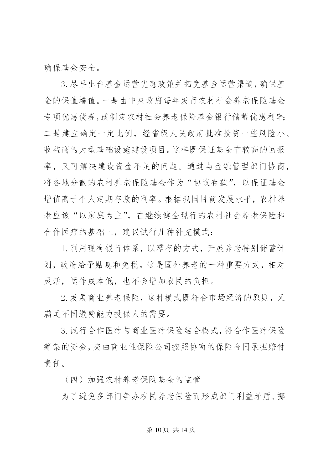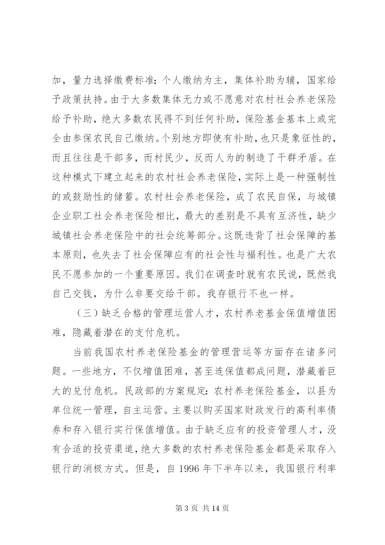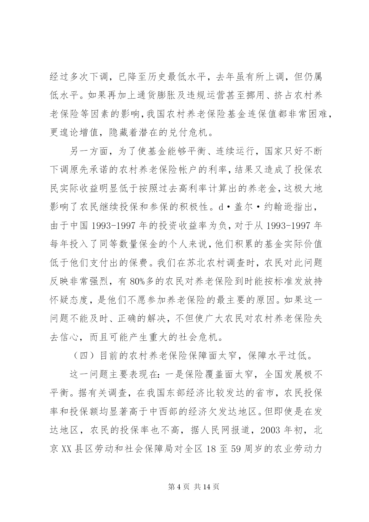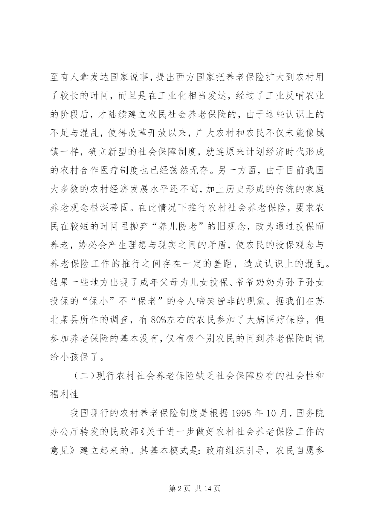 第PAGE\*Arabic\*MERGEFORMAT14页共NUMPAGES\*MERGEFORMAT14页银行保险存在的问题及对策现行农村养老保险存在的问题及对策关键词:农村;社会保障;养老保险;家庭养老由于我国经济发展水平低、地区差异大,农业人口占多数,老龄化程度日趋严重的现实。十多年实践的结果是,虽然取得了一定的成绩,但形势依然非常严峻。一、目前我国农村养老保险存在的主要问题(一)认识模糊,重视不足农村社会保障是我国社会保障体系的重要组成部分,它关系到占总人口约80%的人目前及将来的生活质量,而农村社会养老保险是其关键的内容。随着越来越近的农村老龄化浪潮(据报道,2000年我国60岁以上的老年人口有1.28亿,占总人口的10.2%,至此我国已达到10%的老年型标准,预计到2020年将有2.31亿老年人,占总人口的16.0%,2050年达4.12亿,占总人口的26.1%。而我国80%的老人都居住在农村),农村养老问题变得日益突出和紧迫。然而,自改革开放以来,我国的社会保障制度一直都是以城镇居民为核心,以致于社会保险在一定程度上成了中国城镇居民的专利。曾经有一种流行的观点是中国政府以往并未承诺过要解决农村(民)的养老问题;更有人认为,目前政府承担的城镇居民社会保障负担已经非常沉重,对农村的社会保障无力承担。甚至有人拿发达国家说事,提出西方国家把养老保险扩大到农村用了较长的时间,而且是在工业化相当发达,经过了工业反哺农业的阶段后,才陆续建立农民社会养老保险的,由于这些认识上的不足与混乱,使得改革开放以来,广大农村和农民不仅未能像城镇一样,确立新型的社会保障制度,就连原来计划经济时代形成的农村合作医疗制度也已经荡然无存。另一方面,由于目前我国大多数的农村经济发展水平还不高,加上历史形成的传统的家庭养老观念根深蒂固。在此情况下推行农村社会养老保险,要求农民在较短的时间里抛弃“养儿防老”的旧观念,改为通过投保而养老,势必会产生理想与现实之间的矛盾,使农民的投保观念与养老保险工作的推行之间存在一定的差距,造成认识上的混乱。结果一些地方出现了成年父母为儿女投保、爷爷奶奶为孙子孙女投保的“保小”不“保老”的令人啼笑皆非的现象。据我们在苏北某县所作的调查,有80%左右的农民参加了大病医疗保险,但参加养老保险的基本没有,仅有极个别农民的问到养老保险时说给小孩保了。(二)现行农村社会养老保险缺乏社会保障应有的社会性和福利性我国现行的农村养老保险制度是根据1995年10月,国务院办公厅转发的民政部《关于进一步做好农村社会养老保险工作的意见》建立起来的。其基本模式是:政府组织引导,农民自愿参加,量力选择缴费标准;个人缴纳为主,集体补助为辅,国家给予政策扶持。由于大多数集体无力或不愿意对农村社会养老保险给予补助,绝大多数农民得不到任何补助,保险基金基本上或完全由参保农民自己缴纳。个别地方即使有补助,也只是象征性的,而且往往是干部多,而村民少,反而人为的制造了干群矛盾。在这种模式下建立起来的农村社会养老保险,实际上是一种强制性的或鼓励性的储蓄。农村社会养老保险,成了农民自保,与城镇企业职工社会养老保险相比,最大的差别是不具有互济性,缺少城镇社会养老保险中的社会统筹部分。这既违背了社会保障的基本原则,也失去了社会保障应有的社会性与福利性。也是广大农民不愿参加的一个重要原因。我们在调查时就有农民说,既然我自己交钱,为什么非要交给干部。我存银行不也一样。(三)缺乏合格的管理运营人才,农村养老基金保值增值困难,隐藏着潜在的支付危机。当前我国农村养老保险基金的管理营运等方面存在诸多问题。一些地方,不仅增值困难,甚至连保值都成问题,潜藏着巨大的兑付危机。民政部的方案规定:农村养老保险基金,以县为单位统一管理,自主运营。主要以购买国家财政发行的高利率债券和存入银行实行保值增值。由于缺乏应有的投资管理人才,没有合适的投资渠道,绝大多数的农村养老保险基金都是采取存入银行的消极方式。但是,自1996年下半年以来,我国银行利率经过多次下调,已降至历史最低水平,去年虽有所上调,但仍属低水平。如果再加上通货膨胀及违规运营甚至挪用、挤占农村养老保险等因素的影响,我国农村养老保险基金连保值都非常困难,更遑论增值,隐藏着潜在的兑付危机。另一方面,为了使基金能够平衡、连续运行,国家只好不断下调原先承诺的农村养老保险帐户的利率,结果又造成了投保农民实际收益明显低于按照过去高利率计算出的养老金,这极大地影响了农民继续投保和参保的积极性。d·盖尔·约翰逊指出,由于中国1993-1997年的投资收益率为负,对于从1993-1997年每年投入了同等数量保金的个人来说,他们积累的基金实际价值低于他们支付出的保费。我们在苏北农村调查时,农民对此问题反映非常强烈,有80%多的