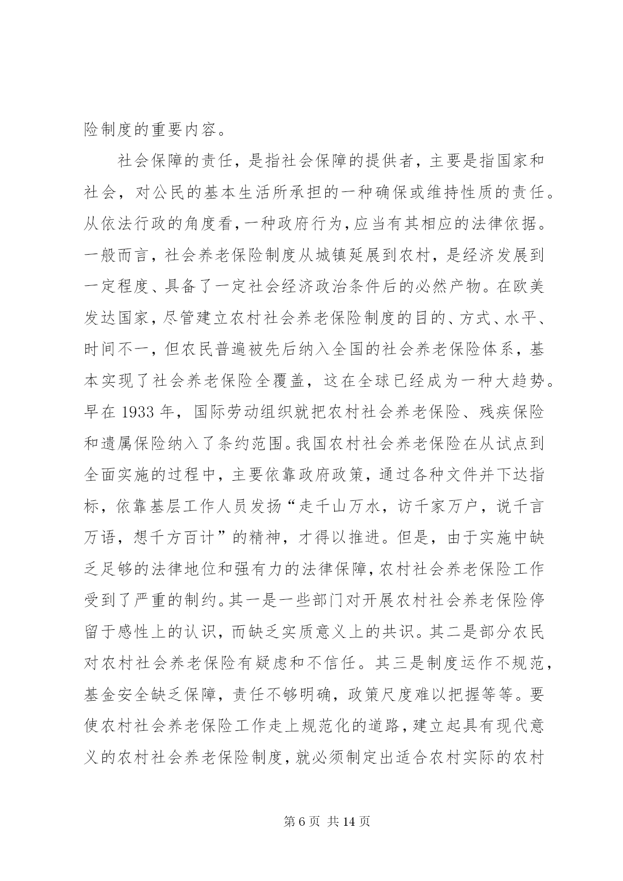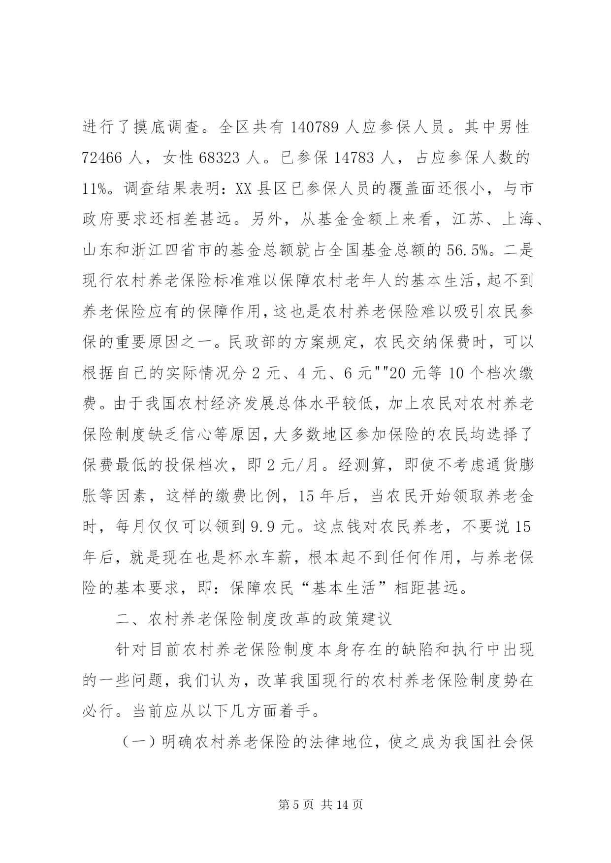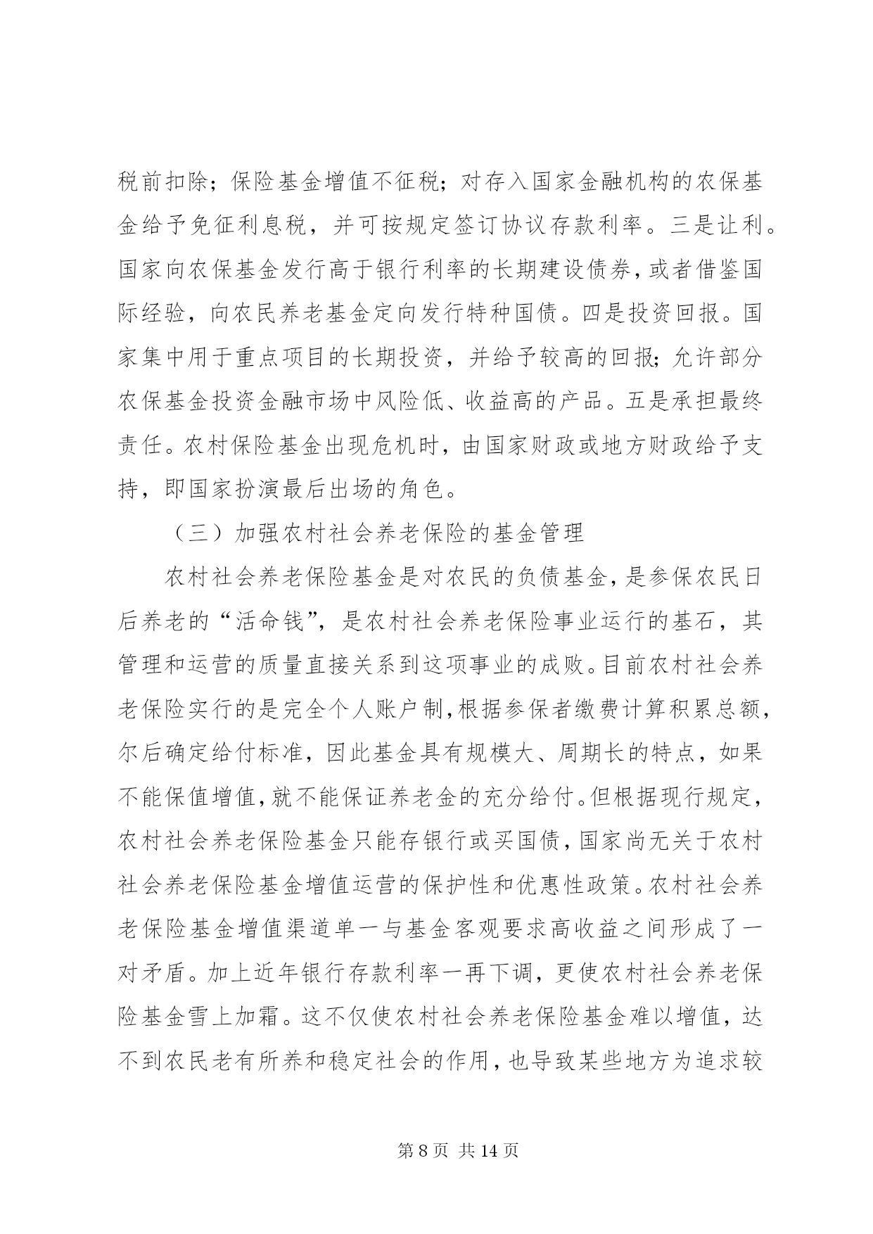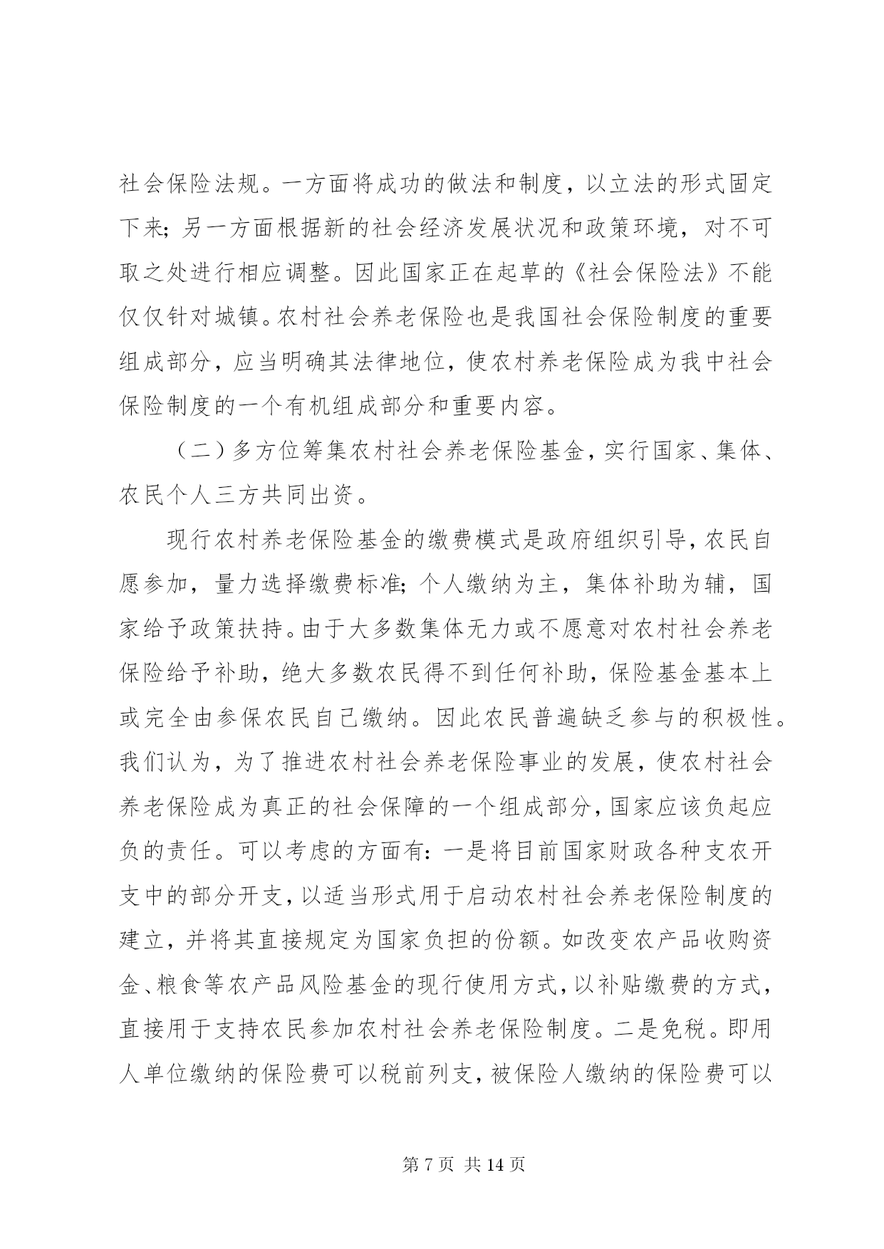 第PAGE\*Arabic\*MERGEFORMAT14页共NUMPAGES\*MERGEFORMAT14页银行保险存在的问题及对策现行农村养老保险存在的问题及对策关键词:农村;社会保障;养老保险;家庭养老由于我国经济发展水平低、地区差异大,农业人口占多数,老龄化程度日趋严重的现实。十多年实践的结果是,虽然取得了一定的成绩,但形势依然非常严峻。一、目前我国农村养老保险存在的主要问题(一)认识模糊,重视不足农村社会保障是我国社会保障体系的重要组成部分,它关系到占总人口约80%的人目前及将来的生活质量,而农村社会养老保险是其关键的内容。随着越来越近的农村老龄化浪潮(据报道,2000年我国60岁以上的老年人口有1.28亿,占总人口的10.2%,至此我国已达到10%的老年型标准,预计到2020年将有2.31亿老年人,占总人口的16.0%,2050年达4.12亿,占总人口的26.1%。而我国80%的老人都居住在农村),农村养老问题变得日益突出和紧迫。然而,自改革开放以来,我国的社会保障制度一直都是以城镇居民为核心,以致于社会保险在一定程度上成了中国城镇居民的专利。曾经有一种流行的观点是中国政府以往并未承诺过要解决农村(民)的养老问题;更有人认为,目前政府承担的城镇居民社会保障负担已经非常沉重,对农村的社会保障无力承担。甚至有人拿发达国家说事,提出西方国家把养老保险扩大到农村用了较长的时间,而且是在工业化相当发达,经过了工业反哺农业的阶段后,才陆续建立农民社会养老保险的,由于这些认识上的不足与混乱,使得改革开放以来,广大农村和农民不仅未能像城镇一样,确立新型的社会保障制度,就连原来计划经济时代形成的农村合作医疗制度也已经荡然无存。另一方面,由于目前我国大多数的农村经济发展水平还不高,加上历史形成的传统的家庭养老观念根深蒂固。在此情况下推行农村社会养老保险,要求农民在较短的时间里抛弃“养儿防老”的旧观念,改为通过投保而养老,势必会产生理想与现实之间的矛盾,使农民的投保观念与养老保险工作的推行之间存在一定的差距,造成认识上的混乱。结果一些地方出现了成年父母为儿女投保、爷爷奶奶为孙子孙女投保的“保小”不“保老”的令人啼笑皆非的现象。据我们在苏北某县所作的调查,有80%左右的农民参加了大病医疗保险,但参加养老保险的基本没有,仅有极个别农民的问到养老保险时说给小孩保了。(二)现行农村社会养老保险缺乏社会保障应有的社会性和福利性我国现行的农村养老保险制度是根据1995年10月,国务院办公厅转发的民政部《关于进一步做好农村社会养老保险工作的意见》建立起来的。其基本模式是:政府组织引导,农民自愿参加,量力选择缴费标准;个人缴纳为主,集体补助为辅,国家给予政策扶持。由于大多数集体无力或不愿意对农村社会养老保险给予补助,绝大多数农民得不到任何补助,保险基金基本上或完全由参保农民自己缴纳。个别地方即使有补助,也只是象征性的,而且往往是干部多,而村民少,反而人为的制造了干群矛盾。在这种模式下建立起来的农村社会养老保险,实际上是一种强制性的或鼓励性的储蓄。农村社会养老保险,成了农民自保,与城镇企业职工社会养老保险相比,最大的差别是不具有互济性,缺少城镇社会养老保险中的社会统筹部分。这既违背了社会保障的基本原则,也失去了社会保障应有的社会性与福利性。也是广大农民不愿参加的一个重要原因。我们在调查时就有农民说,既然我自己交钱,为什么非要交给干部。我存银行不也一样。(三)缺乏合格的管理运营人才,农村养老基金保值增值困难,隐藏着潜在的支付危机。当前我国农村养老保险基金的管理营运等方面存在诸多问题。一些地方,不仅增值困难,甚至连保值都成问题,潜藏着巨大的兑付危机。民政部的方案规定:农村养老保险基金,以县为单位统一管理,自主运营。主要以购买国家财政发行的高利率债券和存入银行实行保值增值。由于缺乏应有的投资管理人才,没有合适的投资渠道,绝大多数的农村养老保险基金都是采取存入银行的消极方式。但是,自1996年下半年以来,我国银行利率经过多次下调,已降至历史最低水平,去年虽有所上调,但仍属低水平。如果再加上通货膨胀及违规运营甚至挪用、挤占农村养老保险等因素的影响,我国农村养老保险基金连保值都非常困难,更遑论增值,隐藏着潜在的兑付危机。另一方面,为了使基金能够平衡、连续运行,国家只好不断下调原先承诺的农村养老保险帐户的利率,结果又造成了投保农民实际收益明显低于按照过去高利率计算出的养老金,这极大地影响了农民继续投保和参保的积极性。d·盖尔·约翰逊指出,由于中国1993-1997年的投资收益率为负,对于从1993-1997年每年投入了同等数量保金的个人来说,他们积累的基金实际价值低于他们支付出的保费。我们在苏北农村调查时,农民对此问题反映非常强烈,有80%多的