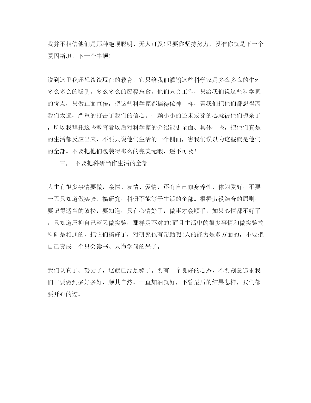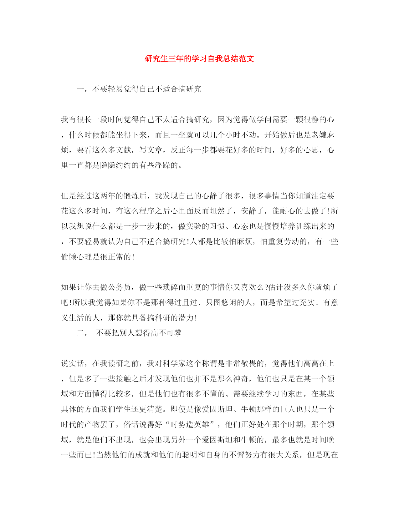 此资料由网络收集而来,如有侵权请告知上传者立即删除。资料共分享,我们负责传递知识。研究生三年的学习自我总结范文一,不要轻易觉得自己不适合搞研究我有很长一段时间觉得自己不太适合搞研究,因为觉得做学问需要一颗很静的心,什么时候都能坐得下来,而且一坐就可以几个小时不动。开始做后也是老嫌麻烦,要看这么多文献,写文章,反正每一步都要花好多的时间,好多的心思,心里一直都是隐隐约约的有些浮躁的。但是经过这两年的锻炼后,我发现自己的心静了很多,很多事情当你知道注定要花这么多时间,有这么程序之后心里面反而坦然了,安静了,能耐心的去做了!所以我想说什么都是一步一步来的,做实验的习惯、心态也是慢慢培养训练出来的,不要轻易就认为自己不适合搞研究!人都是比较怕麻烦,怕重复劳动的,有一些偷懒心理是很正常的!如果让你去做公务员,做一些琐碎而重复的事情你又喜欢么?估计没多久你就烦了吧!所以我觉得如果你不是那种得过且过、只图悠闲的人,而是希望过充实、有意义生活的人,那你就具备搞科研的潜力!二,不要把别人想得高不可攀说实话,在我读研之前,我对科学家这个称谓是非常敬畏的,觉得他们高高在上,但是多了一些接触之后才发现他们也并不是那么神奇,他们也只是在某一个领域和方面懂得比较多,但是他们也有很多不懂的、需要继续学习的东西,在某些具体的方面我们学生还更清楚。即使是像爱因斯坦、牛顿那样的巨人也只是一个时代的产物罢了,俗话说得好“时势造英雄”,他们正好处在那个时期,那个领域,就是他们不出现,也会出现另外一个爱因斯坦和牛顿的,最多也就是时间晚一些而已!当然他们的成就和他们的聪明和自身的不懈努力有很大关系,但是现在我并不相信他们是那种绝顶聪明、无人可及!只要你坚持努力,没准你就是下一个爱因斯坦,下一个牛顿!说到这里我还想谈谈现在的教育,它只给我们灌输这些科学家是多么多么的牛x,多么多么的聪明,多么多么的废寝忘食,他们只会工作,只给我们说这些科学家的优点,只做正面宣传,把这些科学家都搞得像神一样,害我们把他们都想得离我们太远,严重的打击了我们的信心。一颗小小的还未发芽的心就被他们扼杀了,所以我拜托这些教育者以后对科学家的介绍能更全面、具体一些,把他们真是的生活都反应出来,不要只说他们生活的一个侧面,害我们误以为这些就是他们的全部。不要把他们包装得那么的完美无暇,遥不可及!三,不要把科研当作生活的全部人生有很多事情要做,亲情、友情、爱情,还有自己修身养性、休闲爱好,不要一天只知道做实验、搞研究,科研不能等于生活的全部。根据劳役结合的原则,要记得适当的放松,要知道,只有心情好了,做事才会顺手,如果心情都不好了,只知道压抑自己整天做实验,那样是不对的!而且生活中的很多事情和做实验搞科研是相通的,把它们搞好了,对研究也有帮助呢!人的能力是多方面的,不要把自己变成一个只会读书、只懂学问的呆子。我们认真了、努力了,这就已经足够了。要有一个良好的心态,不要刻意追求我们非要做到多好多好,顺其自然、一直加油就好,不管最后的结果怎样,我们都要开心的过。