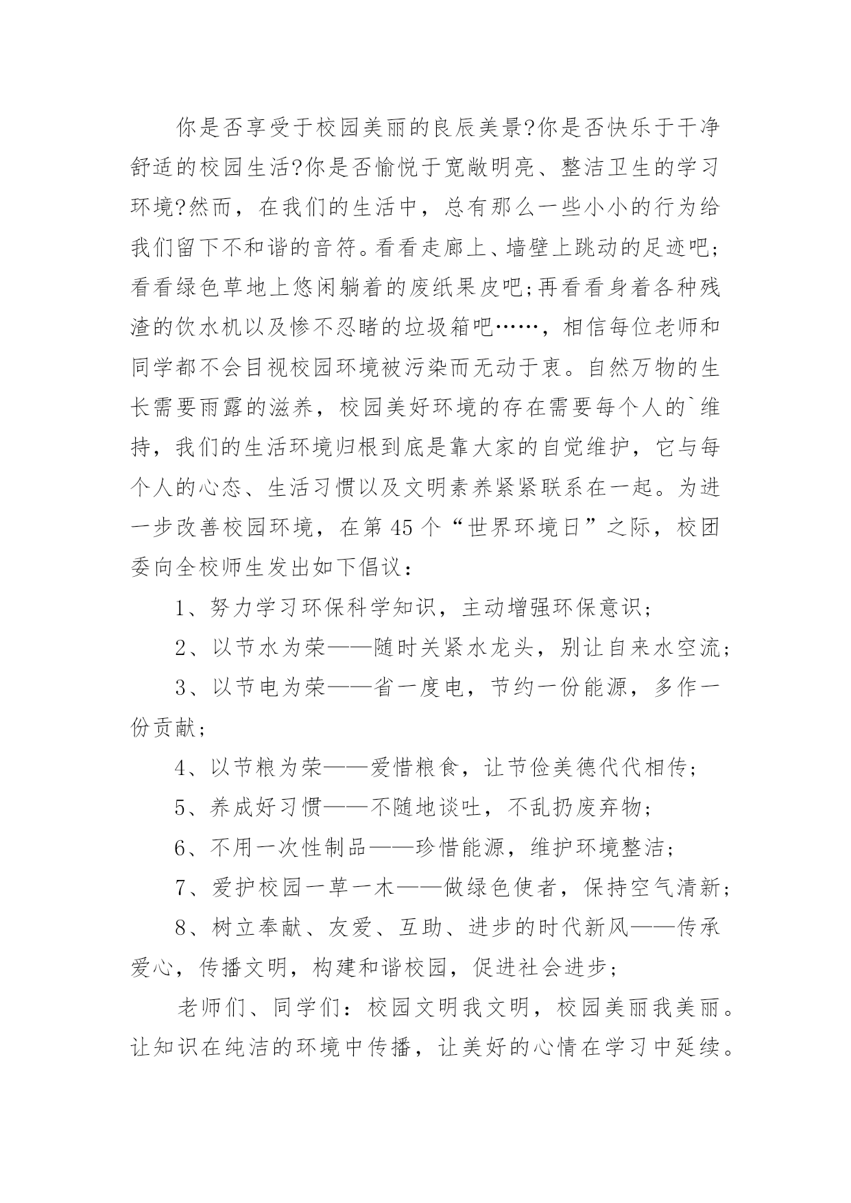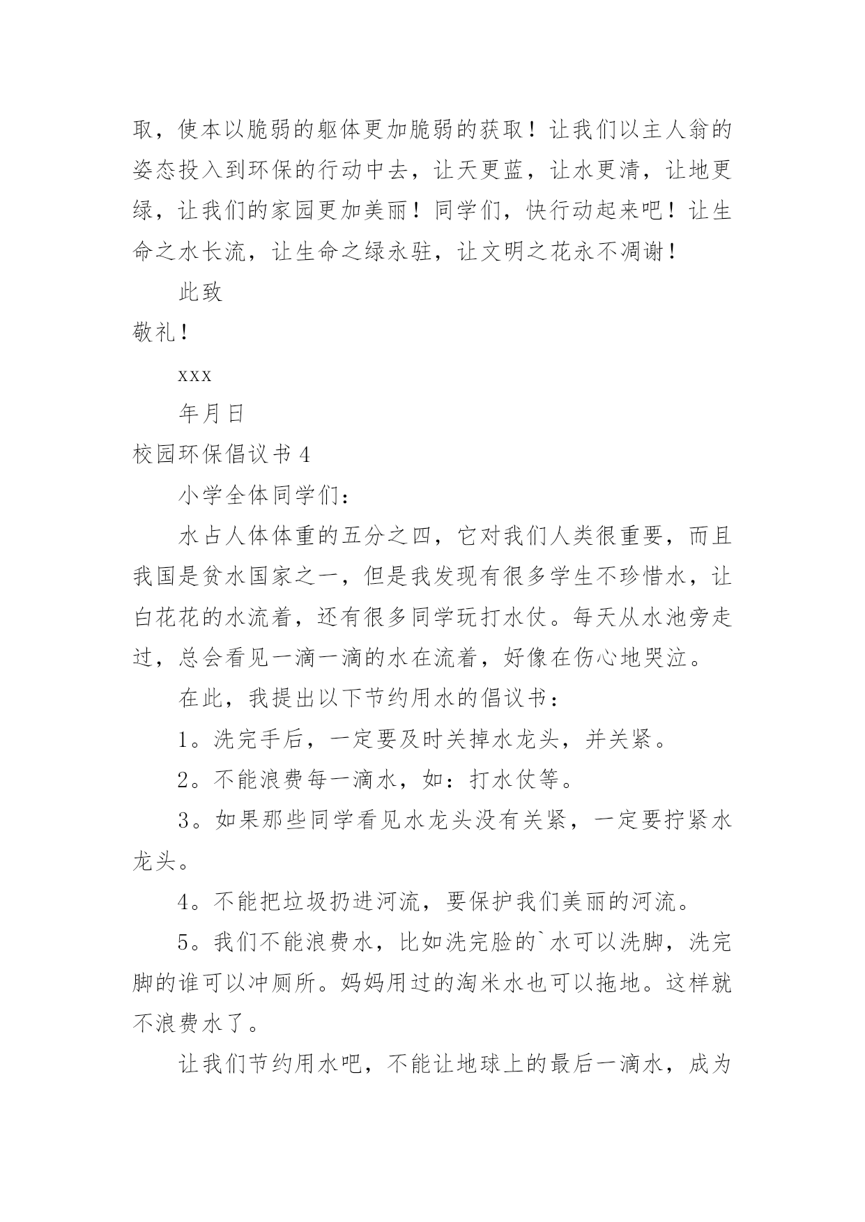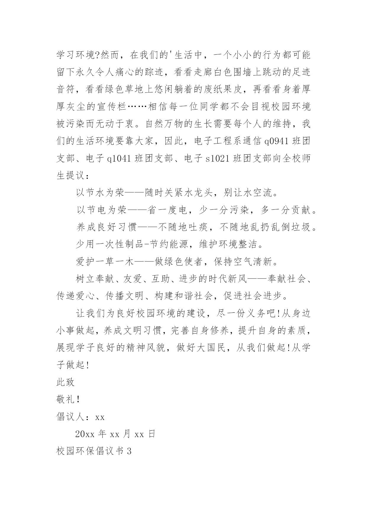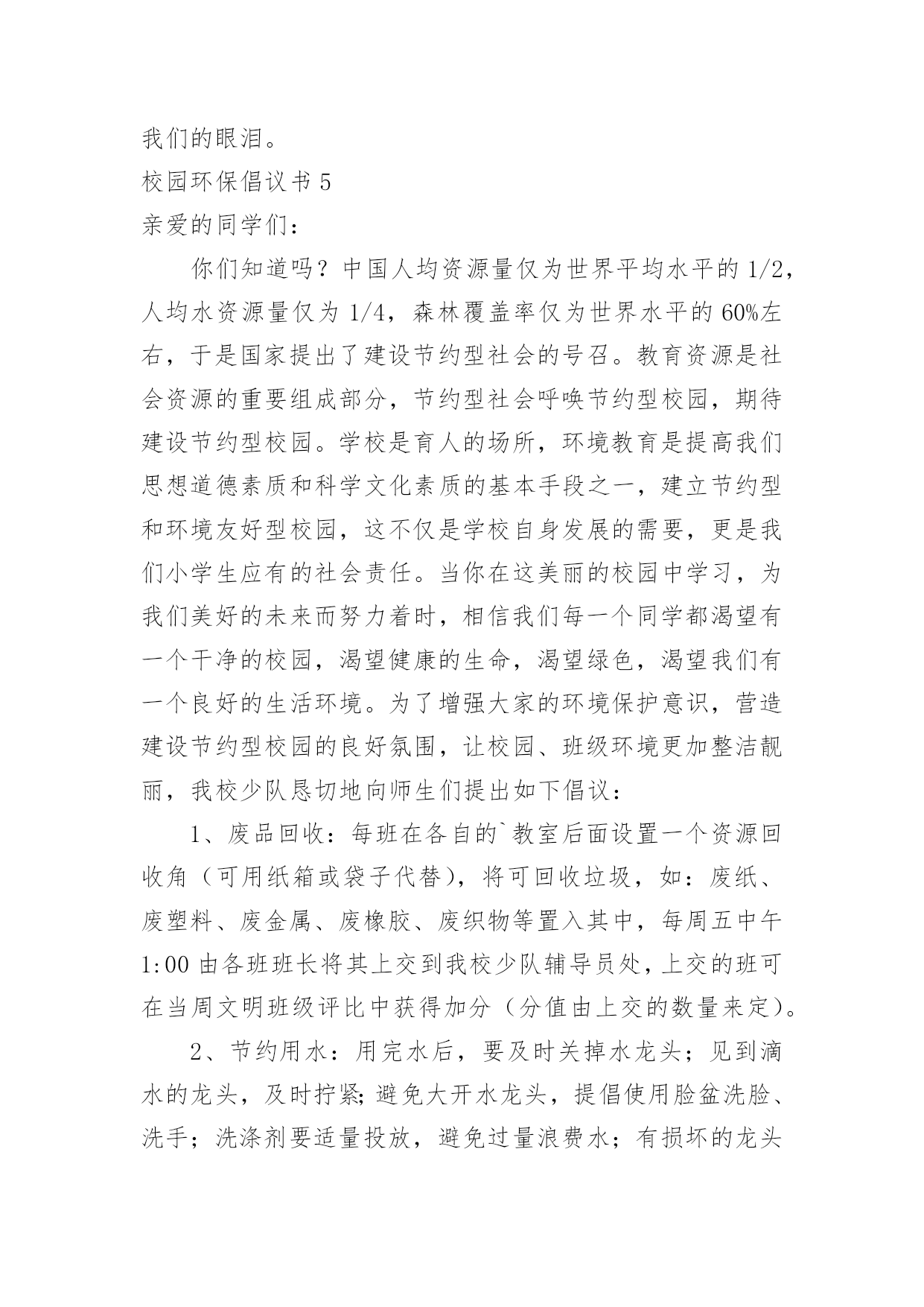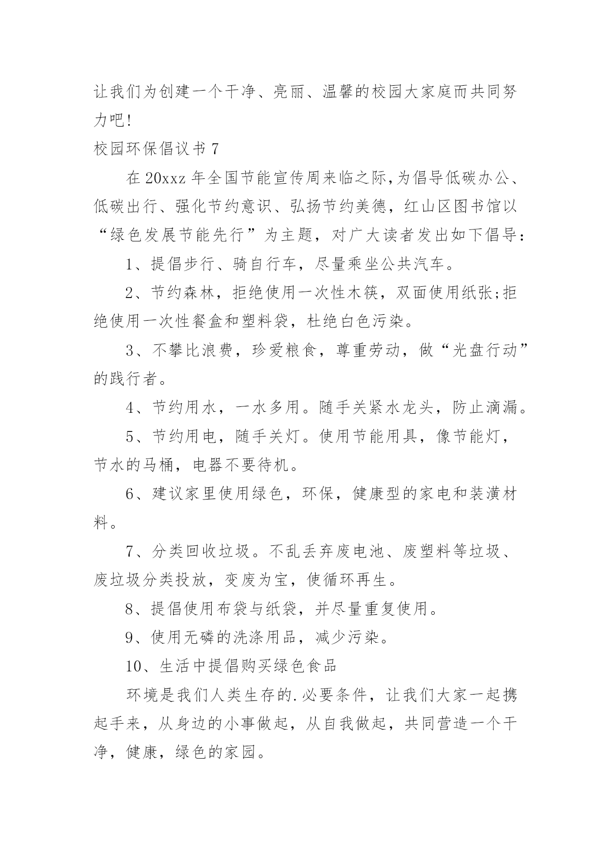 校园环保倡议书校园环保倡议书15篇(精选)在生活中,倡议书与我们的生活息息相关,使用正确的写作思路书写倡议书会更加事半功倍。还是对倡议书一筹莫展吗?以下是小编精心整理的校园环保倡议书,欢迎大家分享。校园环保倡议书1尊敬的各位家长、亲爱的小朋友们:我们每个人都希望生活在一个清洁、舒适的环境中。但是,我们共有的家园地球,却由于人类的肆意破坏、污染、浪费,已经失去了往日的美丽,环境污染已成为影响我们生活的一大问题。我们渴望美丽的地球、绿色的家园、湛蓝的天空、清新的.空气。美丽的环境需要我们共同营造,文明的习惯靠我们平时一点一滴地养成。爱护地球、保护环境,从我做起。我们开展了:爱护花草树木、保护小动物、珍惜水资源、节约用电等丰富多彩的系列专题教育活动中。孩子们知道了各种环保标志、动植物知识,了解了动植物与人类生活的关系、废物回收的有关知识。在树木认养活动中,孩子们懂得了如何保护、爱惜树木。环保小卫士活动,让孩子们成为了环境的主人,增强了自豪感和任务意识。为了让地球更美,让家园更绿,我园向广大家长、小朋友们倡议:1、做一个文明的人,不随地吐痰,不乱扔废弃物,保护绿色环境。2、节约用纸、用水、用电,爱惜粮食、节约使用自然资源,杜绝浪费。3、爱护公物,爱护每一片绿地,做到不穿行、不践踏、不攀折花木。4、不制造影响他人的噪声,维护安宁环境。5、减少空气污染,节约能源,尽量使用公共交通工具、自行车或步行。6、认识环境标志,选购绿色产品,少用一次性制品,减少白色污染。7、亲近大自然,与我们的动植物朋友和谐相处。8、积极向家人、亲朋好友宣传环保知识,动员周围的人为环保出一份力。地球的安宁,世界的美好,需要全社会的共同努力。让我们携起手来,从现在做起,从一点一滴的小事做起,让天更蓝、水更清、地更绿,人更美,为保护我们的家园,保护我们的地球共同努力吧!xxx20xx年xx月xx日校园环保倡议书2亲爱的同学们:您是否正享受于校园共处的良辰美景?您是否正快乐于干净舒适的校园生活?您是否愉悦于宽敞明亮、整洁卫生的学习环境?然而,在我们的'生活中,一个小小的行为都可能留下永久令人痛心的踪迹,看看走廊白色围墙上跳动的足迹音符,看看绿色草地上悠闲躺着的废纸果皮,再看看身着厚厚灰尘的宣传栏……相信每一位同学都不会目视校园环境被污染而无动于衷。自然万物的生长需要每个人的维持,我们的生活环境要靠大家,因此,电子工程系通信q0941班团支部、电子q1041班团支部、电子s1021班团支部向全校师生提议:以节水为荣——随时关紧水龙头,别让水空流。以节电为荣——省一度电,少一分污染,多一分贡献。养成良好习惯——不随地吐痰,不随地乱扔乱倒垃圾。少用一次性制品-节约能源,维护环境整洁。爱护一草一木——做绿色使者,保持空气清新。树立奉献、友爱、互助、进步的时代新风——奉献社会、传递爱心、传播文明、构建和谐社会,促进社会进步。让我们为良好校园环境的建设,尽一份义务吧!从身边小事做起,养成文明习惯,完善自身修养,提升自身的素质,展现学子良好的精神风貌,做好大国民,从我们做起!从学子做起!此致敬礼!倡议人:xx20xx年xx月xx日校园环保倡议书3亲爱的老师、同学们:当你流连于风光秀美的校园中,当你沉醉于桂香袭人的学院路,当你漫步于芳草遍地的校园春景,当你徜徉于气象宏伟的象牙塔中的时候,你为自己是一个华农人而感到自豪吗?我们生活在华农,我们生活在天堂,环境优美,空气清新。然而,我们也发现不少地方在遭受着各种污染,环境日益恶劣。跨出校园,有害气体还在一些厂区弥漫;身边实景,废水、污物使南湖严重污损,白色垃圾还在蔓延┄┄所有这一些,直接影响着人类的生存。环境,是赖以生存的必要条件,保护环境就是保护我们自己。青年是环境保护与可持续发展的'重要力量,构建和谐社会需要大学生积极主动的广泛参与。我们——来自全国五湖四海的社会主义新人才——大学生,作为积极承担社会责任的青年学子,在20xx年世界环境日到来之际,绿色协会向全国各地大学生及各种环境组织发出以下倡议:让我们努力做到“三不”、“三少”和“三个一”:不往河道倾倒污物,不用含磷洗衣粉,不乱扔废弃电池。少用一只塑料袋,少用餐巾纸,少用一次性木筷。向家人做一次环保宣传,参加一次环保行动,为环境出一份力。联合国环境规划署(UNEP)发布20xx年“世界环境日”主题是“冰川消融——一个热点话题”,英文原文主题:“MELTINGICE—AHOTTOPIC?”。为落实党中央和国务院确定的“xx”主要污染物减排目标,完成今年的减排任务和配合20xx年环保重点工作,我国确定20xx年世界环境日中国主题为“污染减排和环境友好型社会”。保护家园,就是保护自己;热爱家园,就是热爱生命。让我们携起手来,从我做起,从身边的小事做起:以节水为荣――随时关紧水龙头,别让水