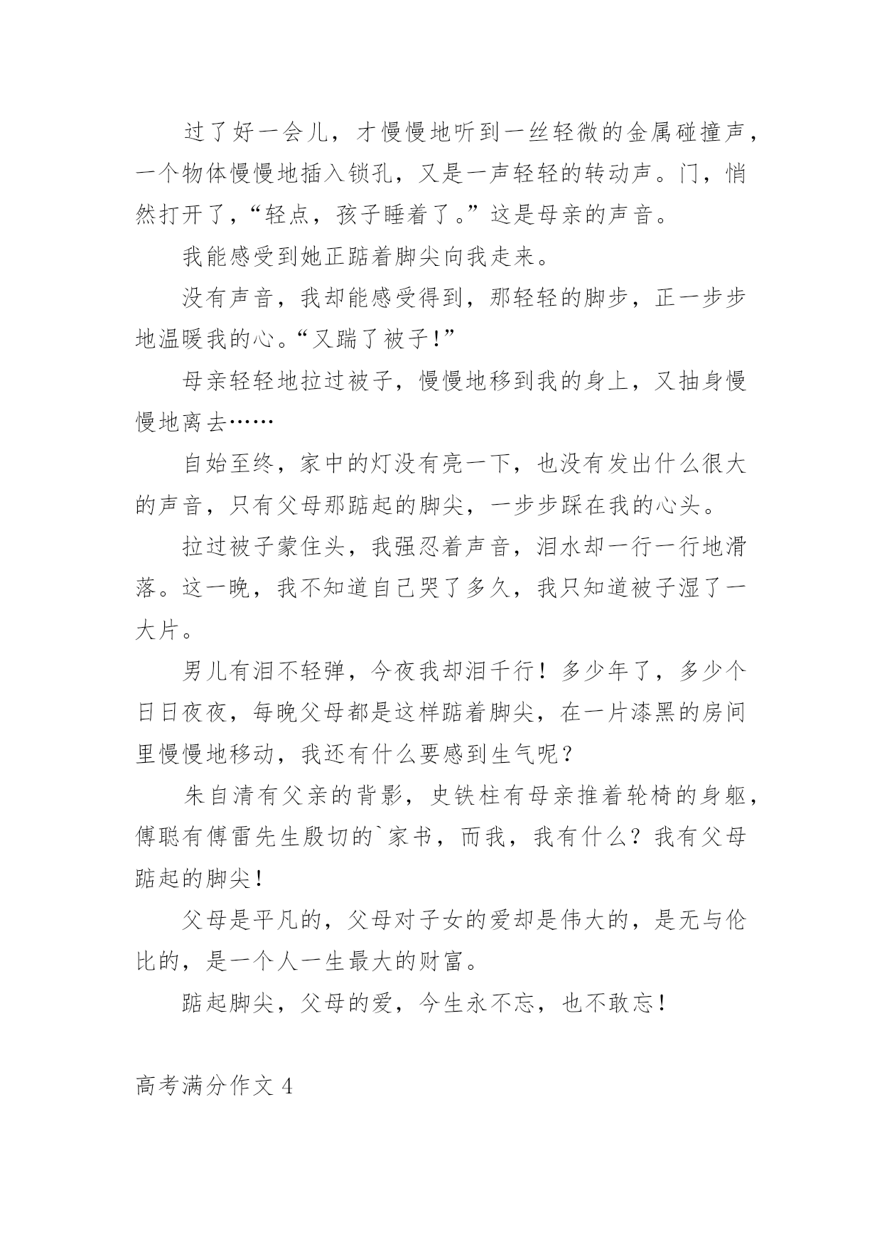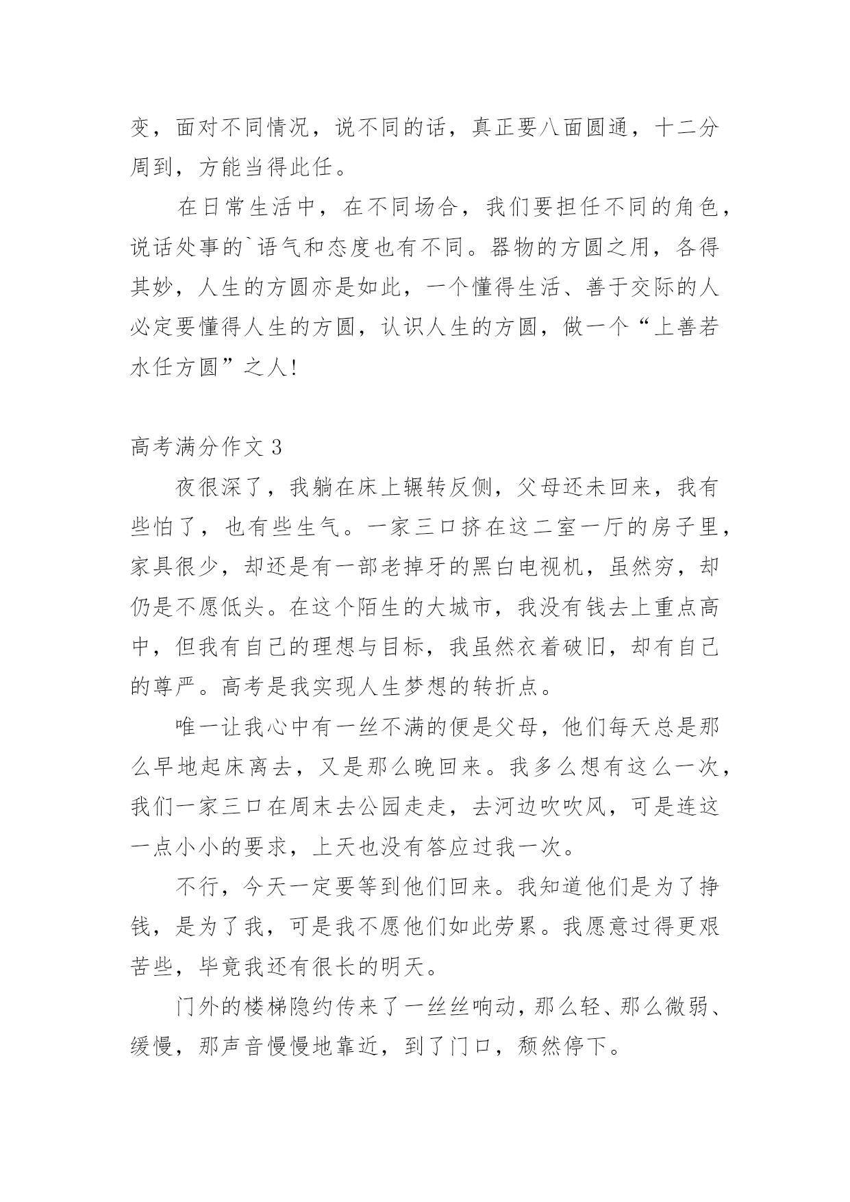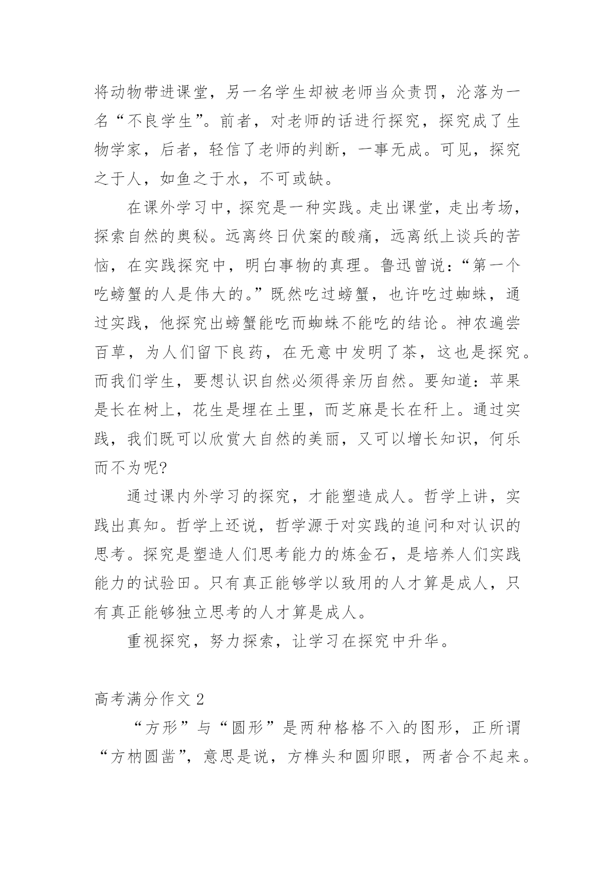 高考满分作文【荐】高考满分作文在学习、工作或生活中,大家都写过作文,肯定对各类作文都很熟悉吧,作文一定要做到主题集中,围绕同一主题作深入阐述,切忌东拉西扯,主题涣散甚至无主题。还是对作文一筹莫展吗?以下是小编为大家收集的高考满分作文,仅供参考,欢迎大家阅读。高考满分作文1探即探索,究即思考、明白,探究即去探索、明白事物。孔子曰:“学而不思则罔,思而不学则殆。”因此,课内外学习中的探究,都是必须的。在课内学习中,探究是一种思考。师者,传道、授业、解惑者也。老师在课堂上教给我们知识,解疑答问,这就够了吗?不,不够,我们还需要对其内容进行思考、分析、论证,要有发问的精神。对比中外教育的模式,我们不难得出一个结论:中国是由上到下的传递式,即老师教,学生接;而外国呢,例如美英,则是平等地面对面交流,你的看法是那样,而我的看法是这样。这样,就给学生提供了一个独立思考的平台。没有他人强加的观点,是纯粹的自己的.观点。有这么一个对比,一名学生因喜爱小鸟,将其带入课堂,破坏了课堂纪律,老师发现后,转而对学生讲起了鸟类知识,并鼓励了这名学生,最后这名学生成为了生物学家。同样是将动物带进课堂,另一名学生却被老师当众责罚,沦落为一名“不良学生”。前者,对老师的话进行探究,探究成了生物学家,后者,轻信了老师的判断,一事无成。可见,探究之于人,如鱼之于水,不可或缺。在课外学习中,探究是一种实践。走出课堂,走出考场,探索自然的奥秘。远离终日伏案的酸痛,远离纸上谈兵的苦恼,在实践探究中,明白事物的真理。鲁迅曾说:“第一个吃螃蟹的人是伟大的。”既然吃过螃蟹,也许吃过蜘蛛,通过实践,他探究出螃蟹能吃而蜘蛛不能吃的结论。神农遍尝百草,为人们留下良药,在无意中发明了茶,这也是探究。而我们学生,要想认识自然必须得亲历自然。要知道:苹果是长在树上,花生是埋在土里,而芝麻是长在秆上。通过实践,我们既可以欣赏大自然的美丽,又可以增长知识,何乐而不为呢?通过课内外学习的探究,才能塑造成人。哲学上讲,实践出真知。哲学上还说,哲学源于对实践的追问和对认识的思考。探究是塑造人们思考能力的炼金石,是培养人们实践能力的试验田。只有真正能够学以致用的人才算是成人,只有真正能够独立思考的人才算是成人。重视探究,努力探索,让学习在探究中升华。高考满分作文2“方形”与“圆形”是两种格格不入的图形,正所谓“方枘圆凿”,意思是说,方榫头和圆卯眼,两者合不起来。由此引申出的“方正”与“圆滑”,也表达了相反的意思。谈到“方”,很容易让人联想到“正”:正色直言、正身明法、正身清心、正气凛然、正言不讳、正己守道……这些词,形容的都是“方正”之士。所谓“方正之士”,指的是品行正直、不阿谀奉承的人。司马迁便是这样一个典型人物,他出生于史官之家,继承父业,专门负责整理编纂前朝史料史书和搜集记录本朝史实。对,是“史实”!他要记录的就是史实。面对汉武帝的威逼,面临正义与尊严的艰难抉择,他,并没有屈服,默默忍受着宫刑的屈辱,他,含泪写下了《史记》这部不朽的传世巨作。倘若他不是一个正身明法之人,又怎会作出这样的选择?倘若他不是一个方正之士,又怎会有《史记》这样震惊后世的著作的诞生?每每想到他们这样一群正义凛然之士,内心总会涌起一股热流。与方相对的是“圆”,“圆滑”一词在字典里的释义为“形容人善于敷衍讨好,不负责任”。但“圆滑”一词并不一定就是贬义词,“八面圆通”一词即指为人处世圆滑,处处应付周全或办事圆通周到。圆滑之人有时能把事情做得更好,圆滑之人有时能结识更多朋友。其实,“圆滑”可以解释为说话委婉、处事谨慎,在某些特定时间、特殊场合,圆滑一些未尝不可。正如古诗所云:“方圆虽异器,功用信具呈。”人生亦是如此,所谓“上善若水任方圆”,意思是说,做人要像水一样,该“方”时“方”,该“圆”时“圆”,能屈能伸,不可一成不变,固执己见。身为父母官,就当秉公执法,正理平治,该“方”;作为主持人,就当善于随机应变,面对不同情况,说不同的话,真正要八面圆通,十二分周到,方能当得此任。在日常生活中,在不同场合,我们要担任不同的角色,说话处事的`语气和态度也有不同。器物的方圆之用,各得其妙,人生的方圆亦是如此,一个懂得生活、善于交际的人必定要懂得人生的方圆,认识人生的方圆,做一个“上善若水任方圆”之人!高考满分作文3夜很深了,我躺在床上辗转反侧,父母还未回来,我有些怕了,也有些生气。一家三口挤在这二室一厅的房子里,家具很少,却还是有一部老掉牙的黑白电视机,虽然穷,却仍是不愿低头。在这个陌生的大城市,我没有钱去上重点高中,但我有自己的理想与目标,我虽然衣着破旧,却有自己的尊严。高考是我实现人生梦想的转折点。唯一让我心中有一丝不满的便是父母,他们每天总是那么早地起床离去,又是那么晚回来。我多么想有这么一次,我们一家三口在周末去公园走走,去