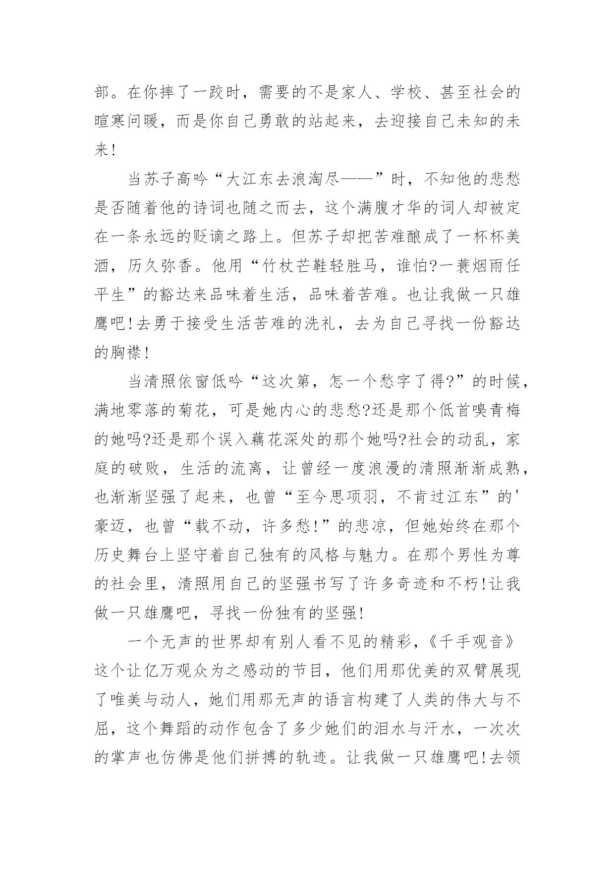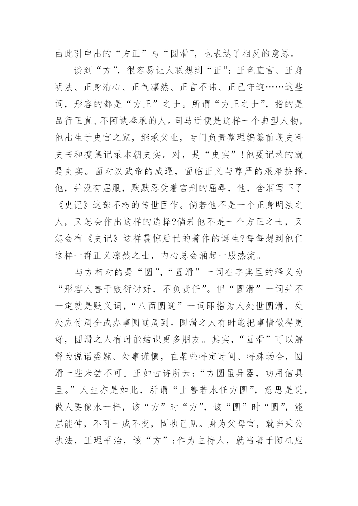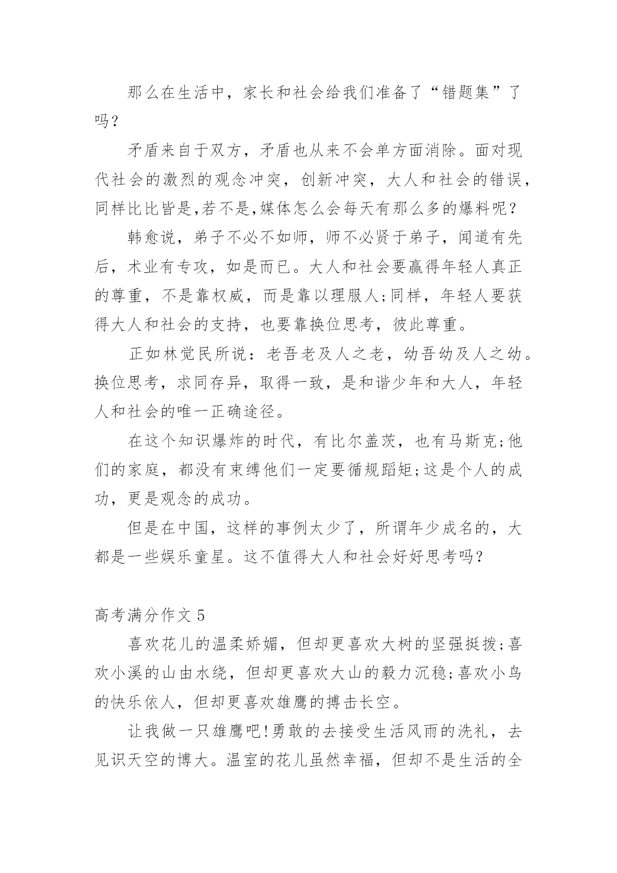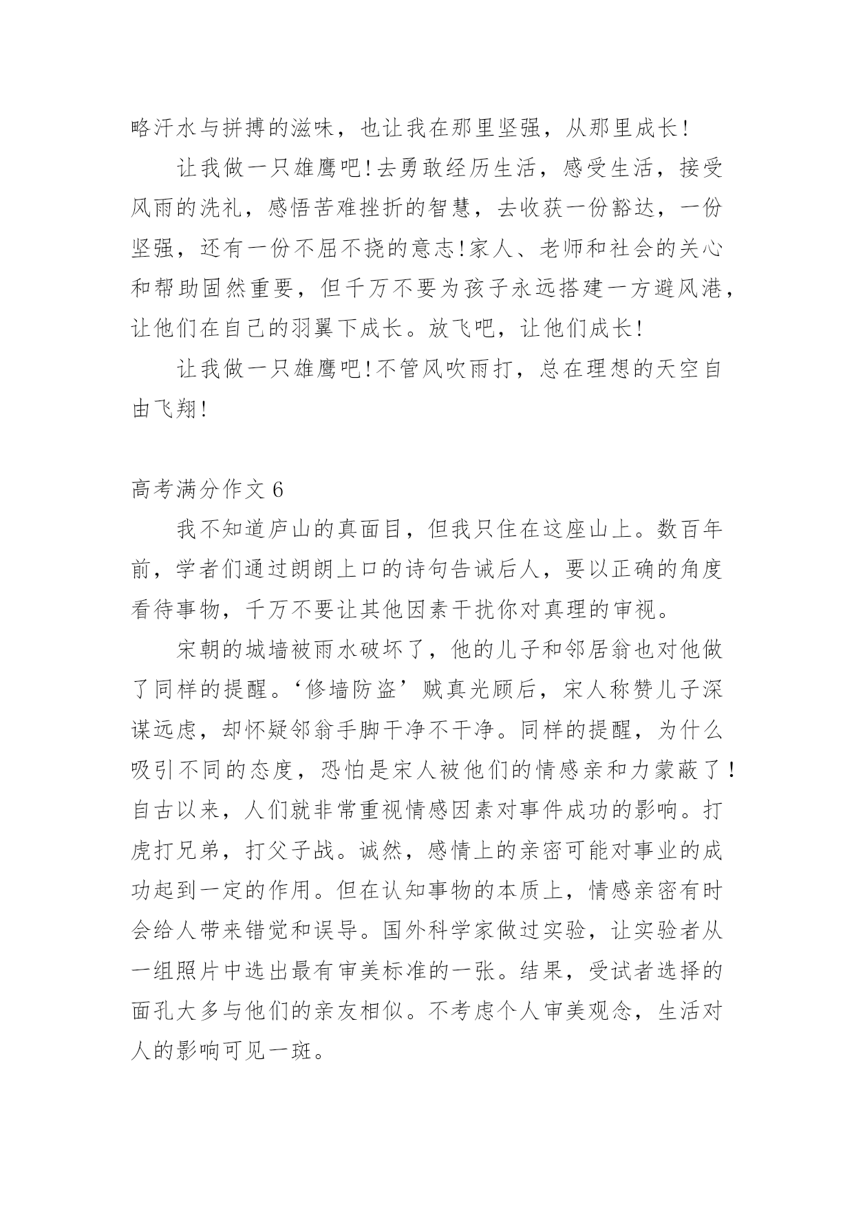 高考满分作文【荐】高考满分作文在学习、工作或生活中,大家都写过作文,肯定对各类作文都很熟悉吧,作文一定要做到主题集中,围绕同一主题作深入阐述,切忌东拉西扯,主题涣散甚至无主题。还是对作文一筹莫展吗?以下是小编为大家收集的高考满分作文,仅供参考,欢迎大家阅读。高考满分作文1探即探索,究即思考、明白,探究即去探索、明白事物。孔子曰:“学而不思则罔,思而不学则殆。”因此,课内外学习中的探究,都是必须的。在课内学习中,探究是一种思考。师者,传道、授业、解惑者也。老师在课堂上教给我们知识,解疑答问,这就够了吗?不,不够,我们还需要对其内容进行思考、分析、论证,要有发问的精神。对比中外教育的模式,我们不难得出一个结论:中国是由上到下的传递式,即老师教,学生接;而外国呢,例如美英,则是平等地面对面交流,你的看法是那样,而我的看法是这样。这样,就给学生提供了一个独立思考的平台。没有他人强加的观点,是纯粹的自己的.观点。有这么一个对比,一名学生因喜爱小鸟,将其带入课堂,破坏了课堂纪律,老师发现后,转而对学生讲起了鸟类知识,并鼓励了这名学生,最后这名学生成为了生物学家。同样是将动物带进课堂,另一名学生却被老师当众责罚,沦落为一名“不良学生”。前者,对老师的话进行探究,探究成了生物学家,后者,轻信了老师的判断,一事无成。可见,探究之于人,如鱼之于水,不可或缺。在课外学习中,探究是一种实践。走出课堂,走出考场,探索自然的奥秘。远离终日伏案的酸痛,远离纸上谈兵的苦恼,在实践探究中,明白事物的真理。鲁迅曾说:“第一个吃螃蟹的人是伟大的。”既然吃过螃蟹,也许吃过蜘蛛,通过实践,他探究出螃蟹能吃而蜘蛛不能吃的结论。神农遍尝百草,为人们留下良药,在无意中发明了茶,这也是探究。而我们学生,要想认识自然必须得亲历自然。要知道:苹果是长在树上,花生是埋在土里,而芝麻是长在秆上。通过实践,我们既可以欣赏大自然的美丽,又可以增长知识,何乐而不为呢?通过课内外学习的探究,才能塑造成人。哲学上讲,实践出真知。哲学上还说,哲学源于对实践的追问和对认识的思考。探究是塑造人们思考能力的炼金石,是培养人们实践能力的试验田。只有真正能够学以致用的人才算是成人,只有真正能够独立思考的人才算是成人。重视探究,努力探索,让学习在探究中升华。高考满分作文2“方形”与“圆形”是两种格格不入的图形,正所谓“方枘圆凿”,意思是说,方榫头和圆卯眼,两者合不起来。由此引申出的“方正”与“圆滑”,也表达了相反的意思。谈到“方”,很容易让人联想到“正”:正色直言、正身明法、正身清心、正气凛然、正言不讳、正己守道……这些词,形容的都是“方正”之士。所谓“方正之士”,指的是品行正直、不阿谀奉承的人。司马迁便是这样一个典型人物,他出生于史官之家,继承父业,专门负责整理编纂前朝史料史书和搜集记录本朝史实。对,是“史实”!他要记录的就是史实。面对汉武帝的威逼,面临正义与尊严的艰难抉择,他,并没有屈服,默默忍受着宫刑的屈辱,他,含泪写下了《史记》这部不朽的传世巨作。倘若他不是一个正身明法之人,又怎会作出这样的选择?倘若他不是一个方正之士,又怎会有《史记》这样震惊后世的著作的诞生?每每想到他们这样一群正义凛然之士,内心总会涌起一股热流。与方相对的是“圆”,“圆滑”一词在字典里的释义为“形容人善于敷衍讨好,不负责任”。但“圆滑”一词并不一定就是贬义词,“八面圆通”一词即指为人处世圆滑,处处应付周全或办事圆通周到。圆滑之人有时能把事情做得更好,圆滑之人有时能结识更多朋友。其实,“圆滑”可以解释为说话委婉、处事谨慎,在某些特定时间、特殊场合,圆滑一些未尝不可。正如古诗所云:“方圆虽异器,功用信具呈。”人生亦是如此,所谓“上善若水任方圆”,意思是说,做人要像水一样,该“方”时“方”,该“圆”时“圆”,能屈能伸,不可一成不变,固执己见。身为父母官,就当秉公执法,正理平治,该“方”;作为主持人,就当善于随机应变,面对不同情况,说不同的话,真正要八面圆通,十二分周到,方能当得此任。在日常生活中,在不同场合,我们要担任不同的角色,说话处事的`语气和态度也有不同。器物的方圆之用,各得其妙,人生的方圆亦是如此,一个懂得生活、善于交际的人必定要懂得人生的方圆,认识人生的方圆,做一个“上善若水任方圆”之人!高考满分作文3夜很深了,我躺在床上辗转反侧,父母还未回来,我有些怕了,也有些生气。一家三口挤在这二室一厅的房子里,家具很少,却还是有一部老掉牙的黑白电视机,虽然穷,却仍是不愿低头。在这个陌生的大城市,我没有钱去上重点高中,但我有自己的理想与目标,我虽然衣着破旧,却有自己的尊严。高考是我实现人生梦想的转折点。唯一让我心中有一丝不满的便是父母,他们每天总是那么早地起床离去,又是那么晚回来。我多么想有这么一次,我们一家三口在周末去公园走走,去