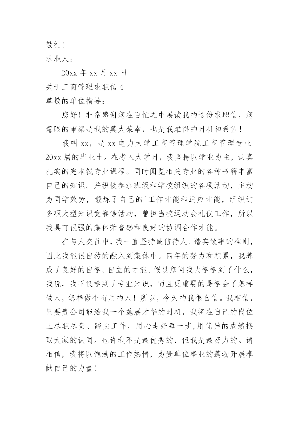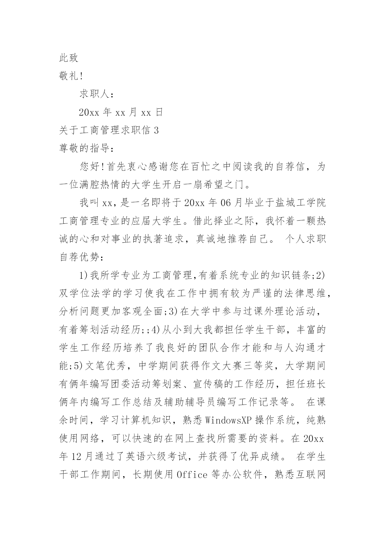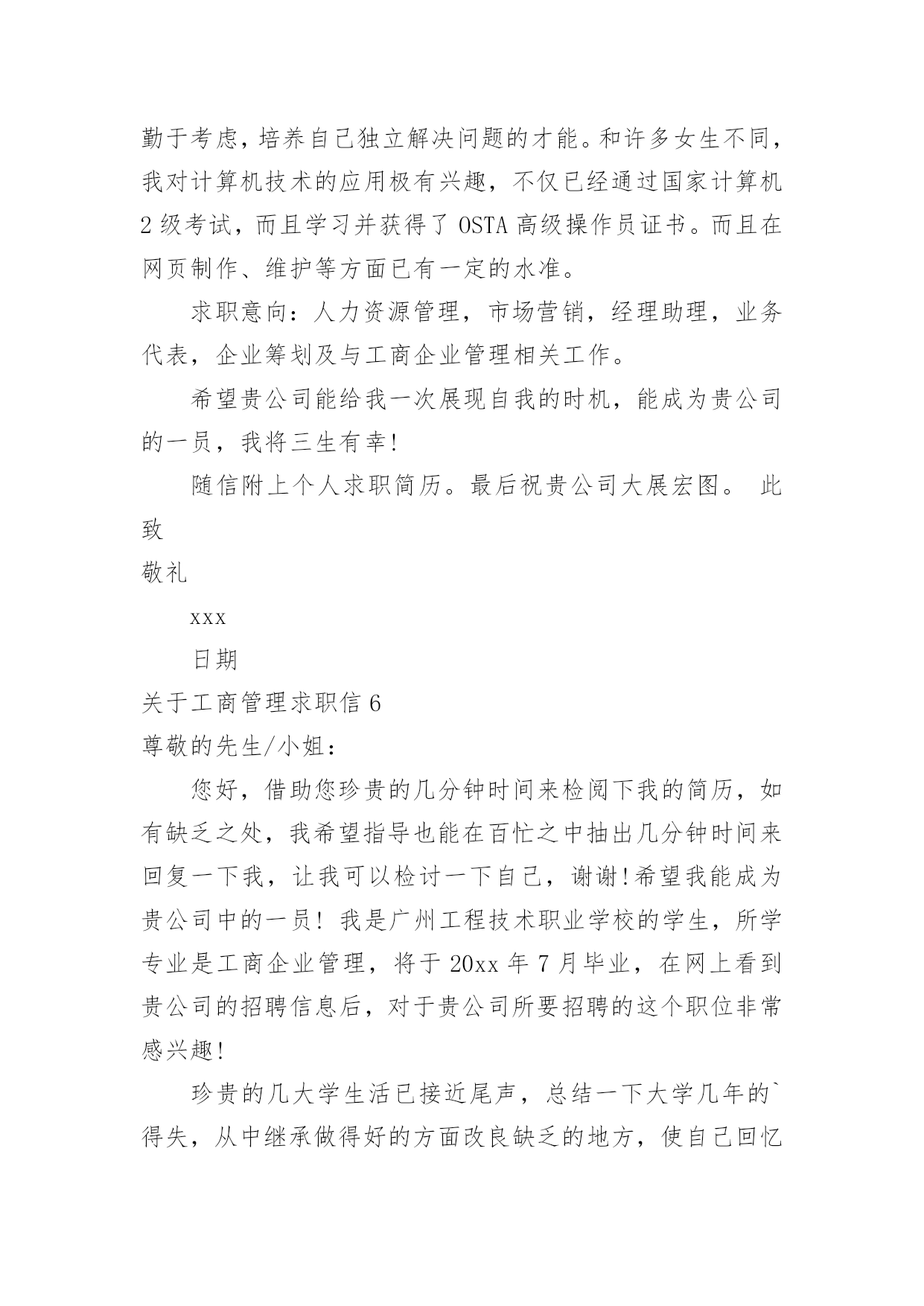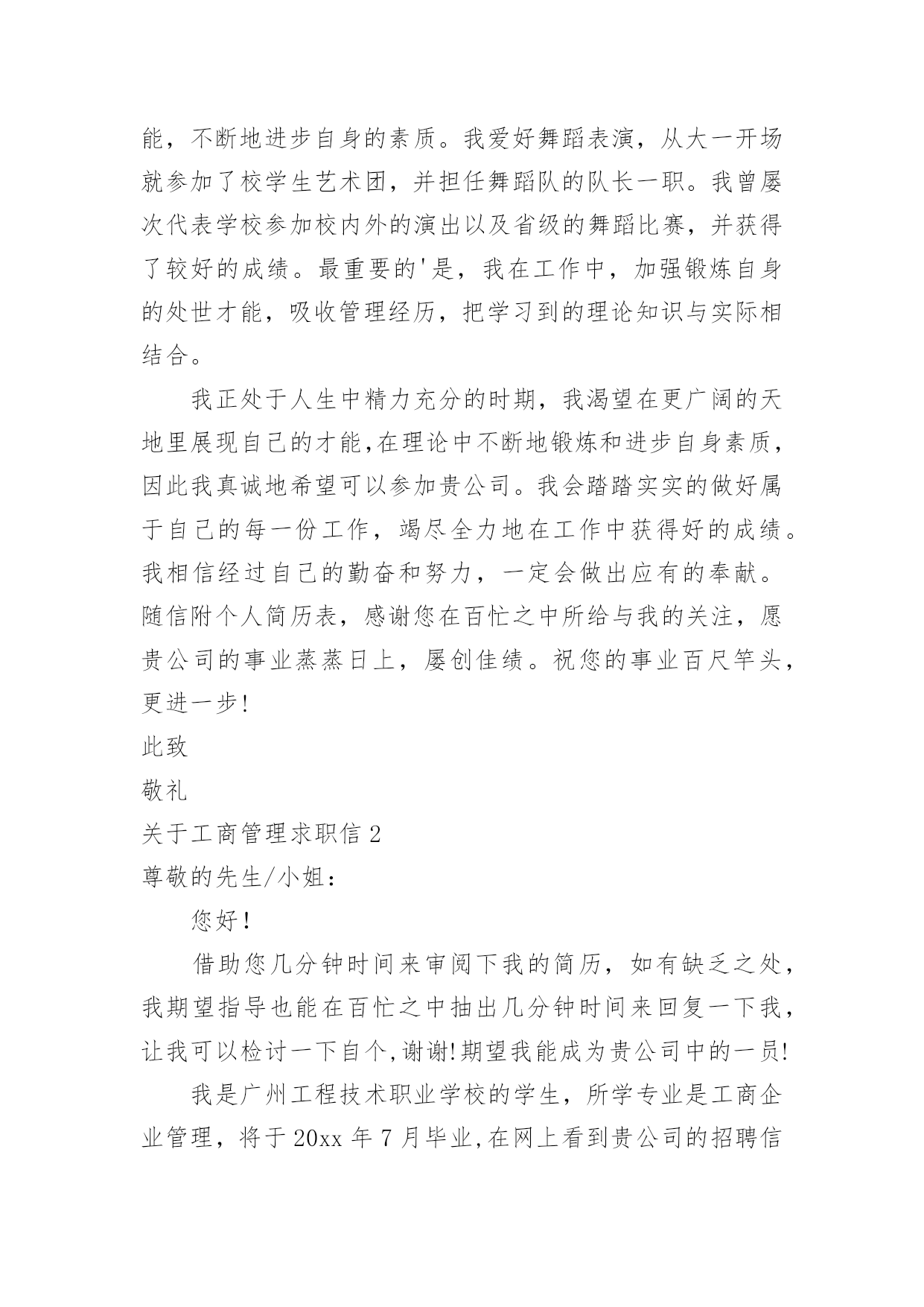 工商管理求职信工商管理求职信时间稍纵即逝,找工作对于我们说已越来越近,是时候静下心来写一封求职信了哦。但是求职信要写什么内容才是恰当的呢?以下是小编为大家收集的关于工商管理求职信,仅供参考,希望能够帮助到大家。关于工商管理求职信1尊敬的指导:您好!我叫xx,现就读于xx商学院工商管理专业,即将于20xx年7月毕业。我很荣幸有时机向您呈上我的个人资料,以下是我的面试自我介绍。在投身社会之际,为了能更好地发挥自己的才能,实现自己的人生价值,谨向各位指导作一下自我推荐。感谢您在百忙之中抽空阅读我的自荐材料。作为一名工商管理专业的大学生,我热爱我的专业并为其投入了宏大的热情和精力。在四年的学习生活中,我学习并掌握了一定的管理学知识。对人力资源管理、消费运作管理、市场营销、财务会计以及金融等方面都有了一定的认识和理解。我的学习成绩良好,一直名列年级的前十名,并两次获得学校的奖学金。作为当代大学生,面对当今社会如此剧烈的竞争,光靠学习是不够的,我觉得还应该从各方面培养自己的兴趣和才能,不断地进步自身的素质。我爱好舞蹈表演,从大一开场就参加了校学生艺术团,并担任舞蹈队的队长一职。我曾屡次代表学校参加校内外的演出以及省级的舞蹈比赛,并获得了较好的成绩。最重要的'是,我在工作中,加强锻炼自身的处世才能,吸收管理经历,把学习到的理论知识与实际相结合。我正处于人生中精力充分的时期,我渴望在更广阔的天地里展现自己的才能,在理论中不断地锻炼和进步自身素质,因此我真诚地希望可以参加贵公司。我会踏踏实实的做好属于自己的每一份工作,竭尽全力地在工作中获得好的成绩。我相信经过自己的勤奋和努力,一定会做出应有的奉献。随信附个人简历表,感谢您在百忙之中所给与我的关注,愿贵公司的事业蒸蒸日上,屡创佳绩。祝您的事业百尺竿头,更进一步!此致敬礼关于工商管理求职信2尊敬的先生/小姐:您好!借助您几分钟时间来审阅下我的简历,如有缺乏之处,我期望指导也能在百忙之中抽出几分钟时间来回复一下我,让我可以检讨一下自个,谢谢!期望我能成为贵公司中的一员!我是广州工程技术职业学校的学生,所学专业是工商企业管理,将于20xx年7月毕业,在网上看到贵公司的招聘信息后,对于贵公司所要招聘的这个职位非常感兴趣!珍贵的几大学生活已接近结尾,总结一下大学几年的得失,从中继承做得好的方面改善缺乏的地方,使自个回忆走过的路,也更是为了看清将来要走的路。虽学习成绩一般,但我却在学习的过程中收获了许多.在这种大学课堂里,我的自学才能得到了很大的进步,再有就是懂得了运用学习方法同时重视独立考虑。古话说的好,授人以“鱼”不如授人以“渔”。随着学习的进步,我不止是学到了公共根底学科知识和许多专业知识,心智也有了一个质的飞跃,我以为这对于将来的作业各等方面都很重要。我崇拜有无穷品格魅力的人,自个也一向在追求品格的进步,重视自个的品德,并一向期望自个也能做到,能全面进步自身本质.大学几年里,我参与了不少校内活动和做过一些社会理论。参与校内的活动可以认识到更多的同学,也就增加了与其他同学交流和向其学习的时机,锻炼了自个的交际才能,学到别人的长处,认清自个的短处。参与的社会理论使我尝试到了作业的艰辛,明白了有必要吃得苦中苦,受得屈中屈方为人中仁的道理,明白了作业中切忌急躁!社会理论中使我找到了作业方向,我以为兴趣是作业的指引!有兴趣一定会有万分热情!实现人生目的'的预备期间—根底知识的学习已经完毕了,如今正在寻觅可以为供给实现另一期间的舞台!期望贵公司能给我供给一个再学习、展现的时机!最后忠心地期望贵公司的业绩蒸蒸日上!尊敬的指导:您好!我陕西工业职业技术学院物流管理专业的一名。近期获知贵公司正在招聘人才,我自信能胜任这一职位,所以特意写了这封信。感谢您能在百忙中翻阅我的求职信。经过三年物流专业的学习。我纯熟掌握与现代物流相关的知识。并于20xx年国家物流师职业资格证书。三年的大学校园和社会理论生活使我不断地挑战自我、开拓创新,为实现自身价值打下了坚实的根底。在校期间得到了教师和同学们的一致肯定。作为一名物流管理专业,我期望从一线职位做起,把所学到的专业知识,与实际工作情况相结合,快速积累最根底的工作经历。本人在校成绩最好的是物流市场营销,这是由于本人的爱好所决定的,物流管理与市场营销都是我最喜欢的专业,所以我期望从事二者的结合体----物流市场营销。在大学期间,我参加过屡次社会理论活动,并曾在西安咸阳国际机场蔚蓝书店做过兼职工作。正因为此,使我积累了丰富的理论经历,而且更加注重团队合作精神和集体观念,更加明确了我的人生目的。我坚信,生活需要自己来勾画,不一样的方式就有不一样的人生。将来的事业更要靠自己去探究和拼搏。请您相信我对工作认真负责的态度,假设能得到您的欣赏,我将会用实际行动来回报您的信任。谢谢。我很期望能