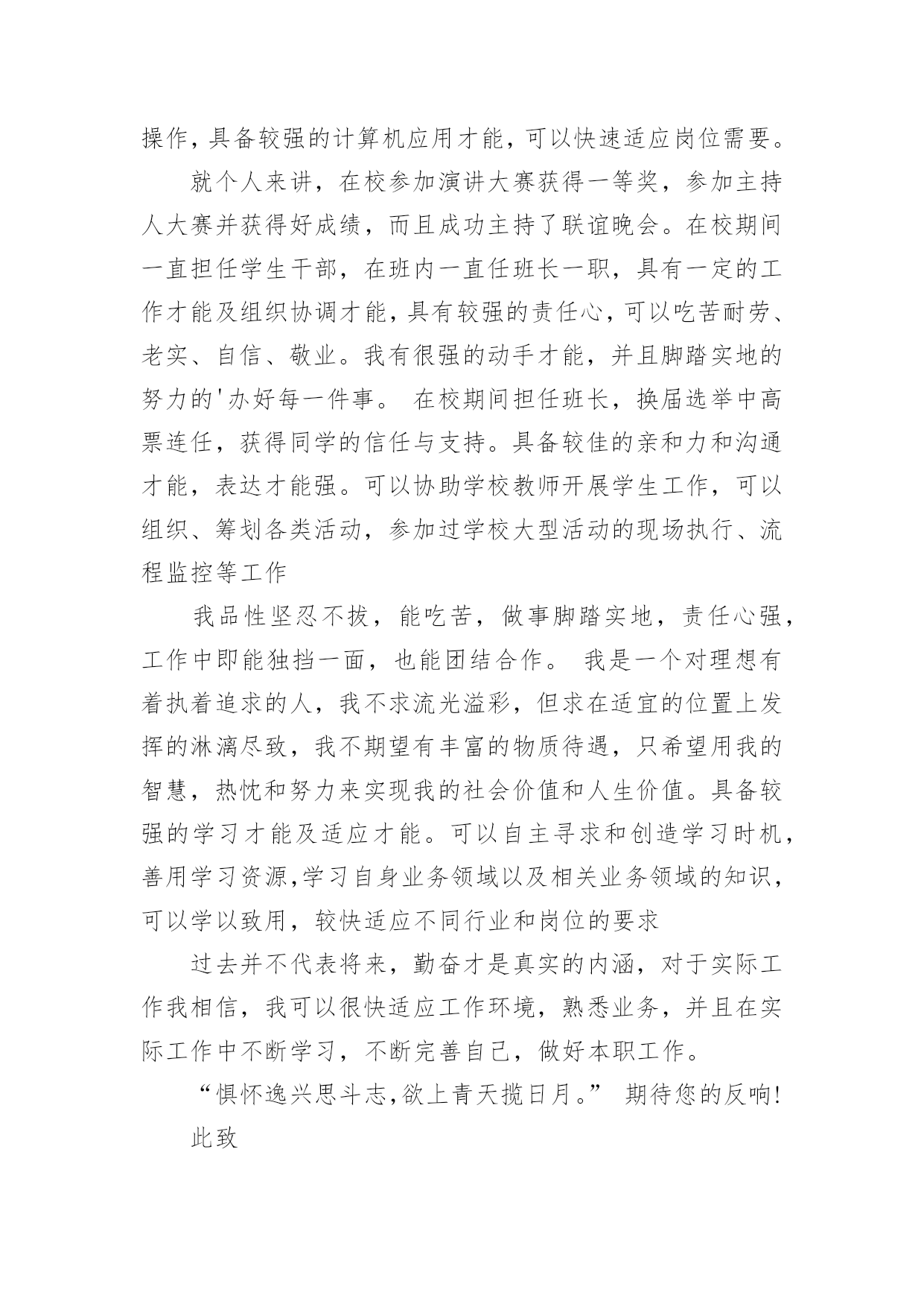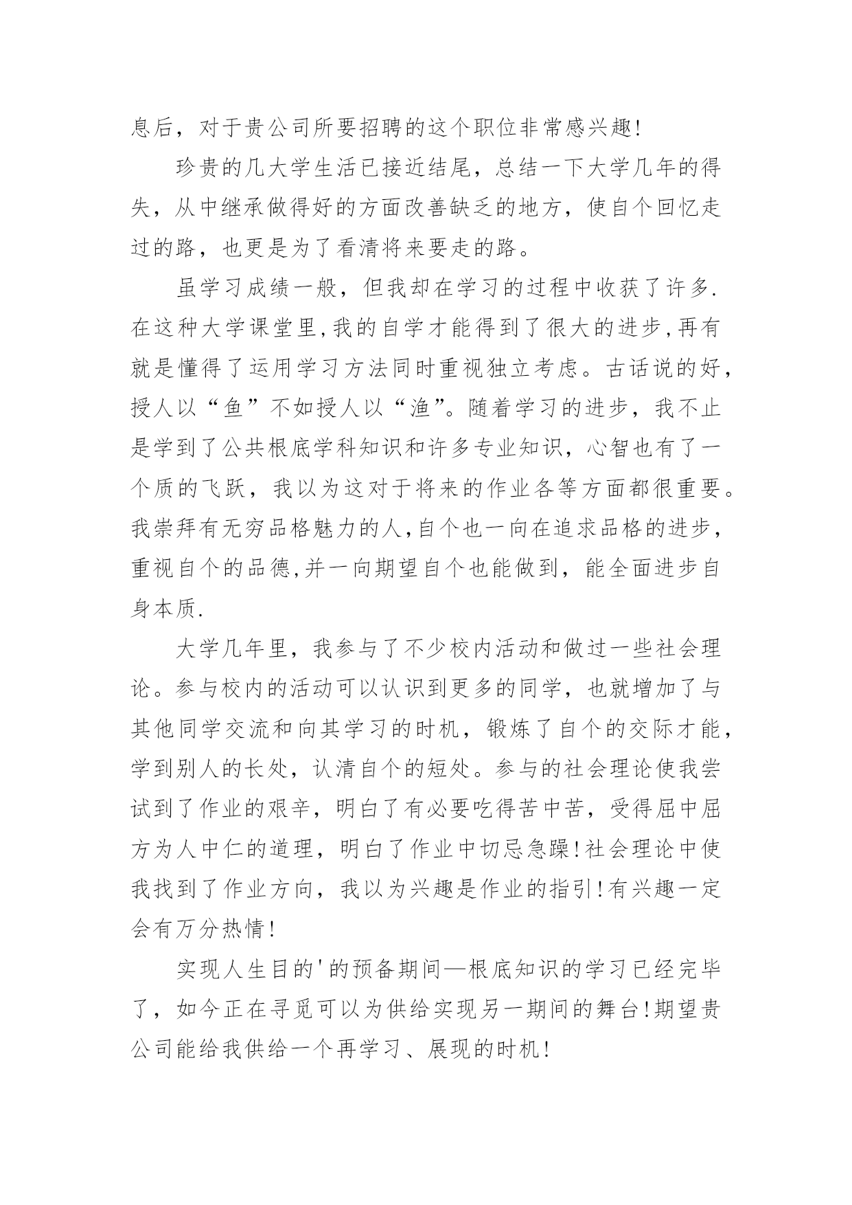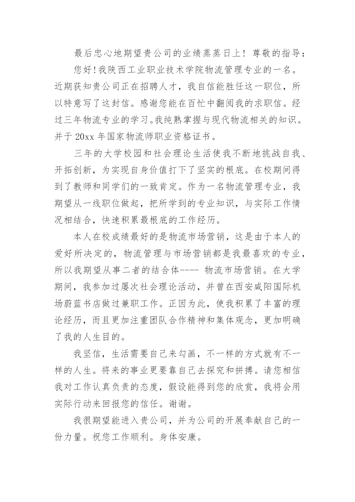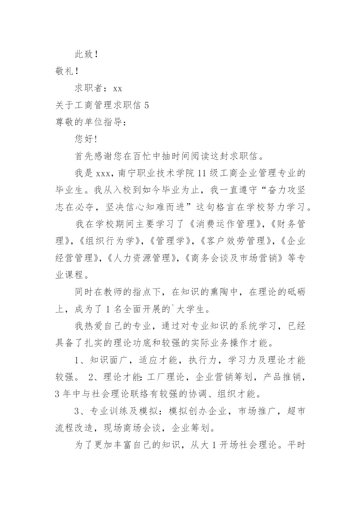 工商管理求职信工商管理求职信时间稍纵即逝,找工作对于我们说已越来越近,是时候静下心来写一封求职信了哦。但是求职信要写什么内容才是恰当的呢?以下是小编为大家收集的关于工商管理求职信,仅供参考,希望能够帮助到大家。关于工商管理求职信1尊敬的指导:您好!我叫xx,现就读于xx商学院工商管理专业,即将于20xx年7月毕业。我很荣幸有时机向您呈上我的个人资料,以下是我的面试自我介绍。在投身社会之际,为了能更好地发挥自己的才能,实现自己的人生价值,谨向各位指导作一下自我推荐。感谢您在百忙之中抽空阅读我的自荐材料。作为一名工商管理专业的大学生,我热爱我的专业并为其投入了宏大的热情和精力。在四年的学习生活中,我学习并掌握了一定的管理学知识。对人力资源管理、消费运作管理、市场营销、财务会计以及金融等方面都有了一定的认识和理解。我的学习成绩良好,一直名列年级的前十名,并两次获得学校的奖学金。作为当代大学生,面对当今社会如此剧烈的竞争,光靠学习是不够的,我觉得还应该从各方面培养自己的兴趣和才能,不断地进步自身的素质。我爱好舞蹈表演,从大一开场就参加了校学生艺术团,并担任舞蹈队的队长一职。我曾屡次代表学校参加校内外的演出以及省级的舞蹈比赛,并获得了较好的成绩。最重要的'是,我在工作中,加强锻炼自身的处世才能,吸收管理经历,把学习到的理论知识与实际相结合。我正处于人生中精力充分的时期,我渴望在更广阔的天地里展现自己的才能,在理论中不断地锻炼和进步自身素质,因此我真诚地希望可以参加贵公司。我会踏踏实实的做好属于自己的每一份工作,竭尽全力地在工作中获得好的成绩。我相信经过自己的勤奋和努力,一定会做出应有的奉献。随信附个人简历表,感谢您在百忙之中所给与我的关注,愿贵公司的事业蒸蒸日上,屡创佳绩。祝您的事业百尺竿头,更进一步!此致敬礼关于工商管理求职信2尊敬的先生/小姐:您好!借助您几分钟时间来审阅下我的简历,如有缺乏之处,我期望指导也能在百忙之中抽出几分钟时间来回复一下我,让我可以检讨一下自个,谢谢!期望我能成为贵公司中的一员!我是广州工程技术职业学校的学生,所学专业是工商企业管理,将于20xx年7月毕业,在网上看到贵公司的招聘信息后,对于贵公司所要招聘的这个职位非常感兴趣!珍贵的几大学生活已接近结尾,总结一下大学几年的得失,从中继承做得好的方面改善缺乏的地方,使自个回忆走过的路,也更是为了看清将来要走的路。虽学习成绩一般,但我却在学习的过程中收获了许多.在这种大学课堂里,我的自学才能得到了很大的进步,再有就是懂得了运用学习方法同时重视独立考虑。古话说的好,授人以“鱼”不如授人以“渔”。随着学习的进步,我不止是学到了公共根底学科知识和许多专业知识,心智也有了一个质的飞跃,我以为这对于将来的作业各等方面都很重要。我崇拜有无穷品格魅力的人,自个也一向在追求品格的进步,重视自个的品德,并一向期望自个也能做到,能全面进步自身本质.大学几年里,我参与了不少校内活动和做过一些社会理论。参与校内的活动可以认识到更多的同学,也就增加了与其他同学交流和向其学习的时机,锻炼了自个的交际才能,学到别人的长处,认清自个的短处。参与的社会理论使我尝试到了作业的艰辛,明白了有必要吃得苦中苦,受得屈中屈方为人中仁的道理,明白了作业中切忌急躁!社会理论中使我找到了作业方向,我以为兴趣是作业的指引!有兴趣一定会有万分热情!实现人生目的'的预备期间—根底知识的学习已经完毕了,如今正在寻觅可以为供给实现另一期间的舞台!期望贵公司能给我供给一个再学习、展现的时机!最后忠心地期望贵公司的业绩蒸蒸日上!尊敬的指导:您好!我陕西工业职业技术学院物流管理专业的一名。近期获知贵公司正在招聘人才,我自信能胜任这一职位,所以特意写了这封信。感谢您能在百忙中翻阅我的求职信。经过三年物流专业的学习。我纯熟掌握与现代物流相关的知识。并于20xx年国家物流师职业资格证书。三年的大学校园和社会理论生活使我不断地挑战自我、开拓创新,为实现自身价值打下了坚实的根底。在校期间得到了教师和同学们的一致肯定。作为一名物流管理专业,我期望从一线职位做起,把所学到的专业知识,与实际工作情况相结合,快速积累最根底的工作经历。本人在校成绩最好的是物流市场营销,这是由于本人的爱好所决定的,物流管理与市场营销都是我最喜欢的专业,所以我期望从事二者的结合体----物流市场营销。在大学期间,我参加过屡次社会理论活动,并曾在西安咸阳国际机场蔚蓝书店做过兼职工作。正因为此,使我积累了丰富的理论经历,而且更加注重团队合作精神和集体观念,更加明确了我的人生目的。我坚信,生活需要自己来勾画,不一样的方式就有不一样的人生。将来的事业更要靠自己去探究和拼搏。请您相信我对工作认真负责的态度,假设能得到您的欣赏,我将会用实际行动来回报您的信任。谢谢。我很期望能