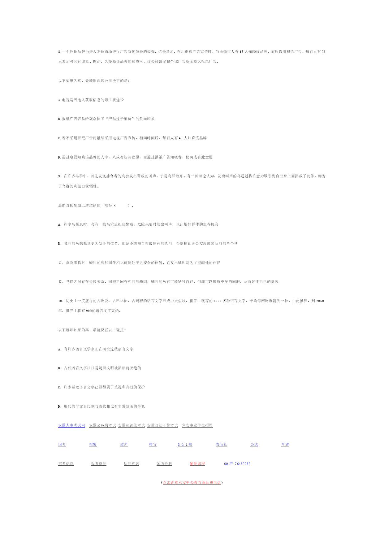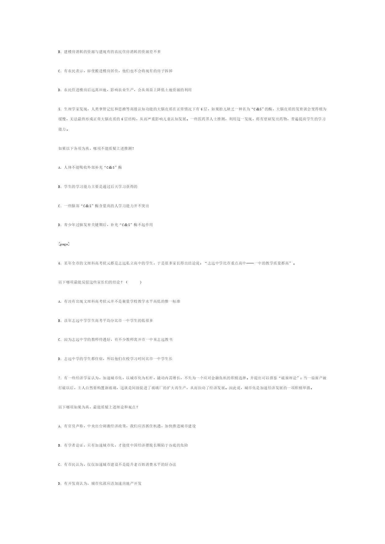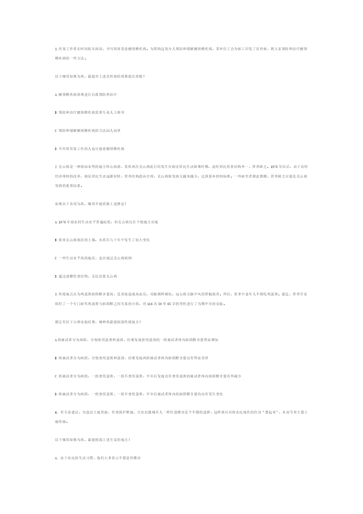 1.伏案工作者长时间低头阅读、书写很容易患腰颈椎疾病。为帮助这部分人预防和缓解腰颈椎疾病,某单位工会为职工印发了宣传册,教大家预防和治疗腰颈椎疾病的一些方法。以下哪项如果为真,最能对上述宣传册的效果提出质疑?A.腰颈椎疾病很难进行自我预防和治疗B.预防和治疗腰颈椎疾病需要专业人士指导C.预防和缓解腰颈椎疾病的方法因人而异D.不经常伏案工作的人也可能患腰颈椎疾病2.克山病是一种原因未明的地方性心肌病,某省两次克山病流行均发生在病区居民生活困难时期,此时居民饮食结构单一,营养缺乏。1978年以后,由于农村经济体制的改革,病区居民生活逐渐好转,营养结构趋向合理,克山病新发病人越来越少,达到基本控制标准。一些研究者据此推测,营养缺乏可能是克山病发病的重要因素。如果以下各项为真,哪项不能质疑上述推论?A.1978年前农村生活水平普遍较低,但克山病仅在个别地方出现B.原来克山病病区的土壤、水质在几十年中发生了较大变化C.一些生活水平高的地区,也出现过克山病病例D.通过调整饮食结构,无法治愈克山病3.传统观点认为鸡蛋黄胆固醇含量高,是直接造成高血压、动脉粥样硬化、冠心病及脑中风的罪魁祸首。所以,很多中老年人不敢吃鸡蛋黄。最近,营养学家组织了一个专门研究鸡蛋黄与胆固醇之间关系的小组,对116名50至65岁的男性进行了为期半年的实验。假定有以下几种实验结果,哪种将最能削弱传统观点?A将被试者分为两组,分别食用蛋黄和蛋清,结果发现食用蛋清的一组被试者体内胆固醇含量明显增加B.将被试者分为两组,分别食用蛋黄和蛋清,结果发现两组被试者体内胆固醇含量没有明显差异C.将被试者分为两组,一组食用蛋黄,一组不食用蛋黄,半年后发现没有食用蛋黄的被试者体内胆固醇含量有所减少D.将被试者分为两组,一组食用蛋黄,一组不食用蛋黄,半年后被试者体内的胆固醇含量均没有发生变化4.有专家建议,为盘活土地资源,有效保护耕地,让农民像城市人一样住进楼房是个不错的选择,这样就可以将农民现有的住房“叠起来”,从而节省大量土地资源。以下哪项如果为真,最能削弱上述专家的观点?A.由于农民的生活习惯,他们大多表示不愿意住楼房B.建楼房消耗的资源与建现有的农民住房消耗的资源差不多C.有农民表示,即使搬进楼房居住,他们也不会将现有的房子拆掉D.农民住进楼房后远离田地,影响农业生产,会从效益上降低土地资源的利用5.生理学家发现,人类掌管记忆和思维等高级认知功能的大脑皮质在正常情况下有6层,如果胎儿缺乏一种名为“Cdk5”的酶,大脑皮质的发育就会变得极为缓慢,无法最终形成正常大脑皮质的6层结构,从而严重影响儿童认知发展。一些医药界人士推测,利用这一发现,将有望研发出药物,普遍提高学生的学习能力。如果以下各项为真,哪项不能质疑上述推测?A.人体不能吸收外部补充“Cdk5”酶B.学生的学习能力主要是通过后天学习获得的C.一些脑部“Cdk5”酶含量高的人学习能力并不突出D.青少年过脑发育关键期后,补充“Cdk5”酶不起作用[page]6.某年全市的文理科高考状元都是志远私立高中的学生,于是很多家长得出结论说:“志远中学比市重点高中——一中的教学质量都高”。以下哪项最能反驳这些家长们的结论?()A.有没有出现文理科高考状元并不是衡量学校教学水平高低的惟一标准B.该年志远中学学生高考平均分比市一中学生的低很多C.因为志远中学的教师待遇好,有不少教师离开市一中来志远教书D.志远中学的学生都住宿,所以他们在校学习时间比市一中学生长7.有一些经济学家认为,加速城市化,以城市化为杠杆,撬动内需增长,不失为一个应对金融危机的积极选择。并提出可以借鉴“破窗理论”:当一扇窗户被打破以后,主人自然要购置新玻璃,这就是间接促进了玻璃厂的扩大再生产,从而拉动了经济发展。因此说,城市化是加速经济发展的一项积极举措。以下哪项如果为真,最能质疑上述理论和观点?A.有官员声称,中央出台刺激经济政策,我们应该抓住机遇,加快推进城市建设B.有学者论证,只有加速城市化,才能使中国经济摆脱长期陷于谷底的危险C.有市民认为,仅仅加速城市建设不是提升老百姓消费水平的好办法D.有开发商认为,城市化就应该加速房地产开发8.一个外地品牌为进入本地市场进行广告宣传效果的调查。结果显示,在用电视广告宣传时,当地每百人有15人知晓该品牌,而后选用报纸广告,每百人有26人表示对其有印象。据此,为提高该品牌的知晓率,该公司决定将全部广告资金投入报纸广告。以下如果为真,最能削弱该公司决定的是:A.电视是当地人获取信息的最主要途径B.报纸广告容易给观众留下“产品过于廉价”的负面印象C.若不采用报纸广告而继续采用电视广告宣传,相同时间后,每百人有45人知晓该品牌