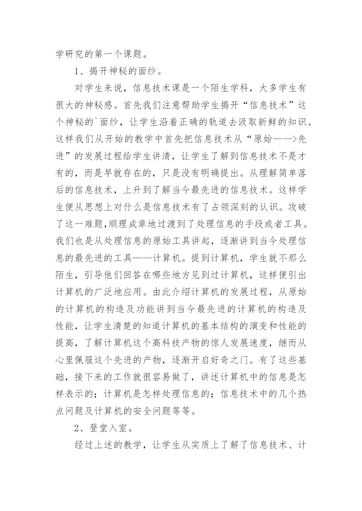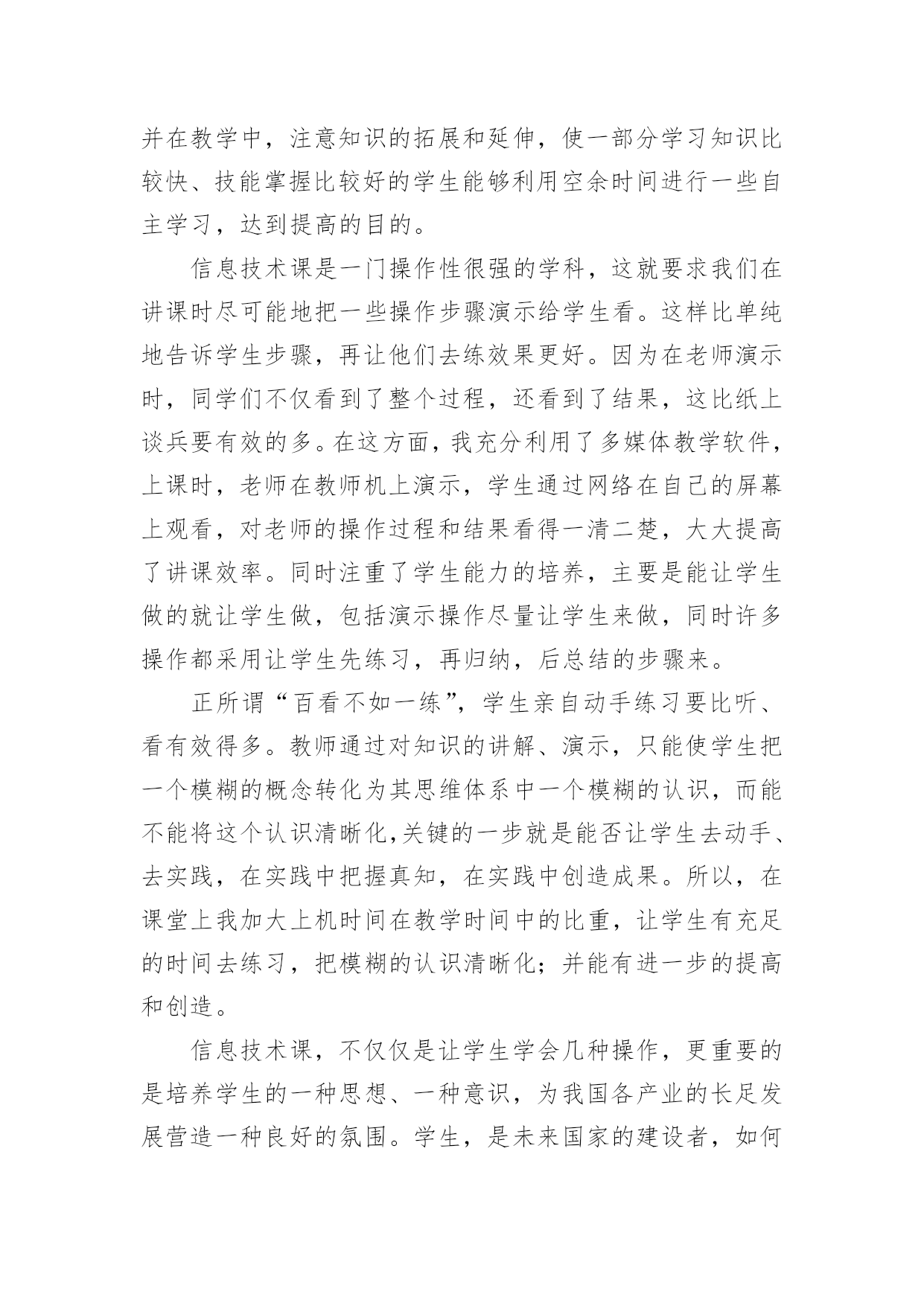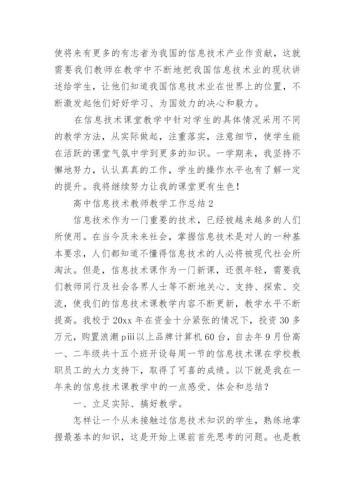 高中信息技术工作总结总结是对取得的成绩、存在的问题及得到的经验和教训等方面情况进行评价与描述的一种书面材料,它可以促使我们思考,不如我们来制定一份总结吧。那么你真的懂得怎么写总结吗?下面是小编为大家收集的高中信息技术工作总结,欢迎大家分享。高中信息技术工作总结1本学期我担任高1年级信息技术教学工作。现阶段信息技术课的教学目标是主要培养学生掌握计算机操作技能,着眼于使学生掌握信息科学、信息技术的基本知识,注重培养学生信息采集、加工、发布等信息处理的基本技能,促进和提高学生主动利用信息技术和信息资源解决实际问题的能力,并用于学习和生活,当然最重要的还在于高中的信息技术学业水平测试,完成相关的教学任务及教学要求。本学期教学内容包括信息技术基储办公软件的操作。一、不断提高个人素养积极参加学校组织的政治学习,提高自己的政治素质和理论素养,注重自己思想道德水平的提高。平时积极参加教研活动,在工作之余,学习与农远工作和信息技术教学及计算机维护的相关知识,努力提高个人的业务水平,为信息技术教学工作打下良好的基础。二、扎实开展教学工作备课对于每门课程的教学而言,都是必不可少的环节,信息技术学科教学也不例外。在备课的过程中,我首先对所要教授的知识进行全面的研究、归纳、总结,并根据教授对象的不同特点找到教授的方法与方式。在此基础上将所备内容在计算机上进行逐一推敲、验证、演练,以使一些空洞的知识具有可操作性;同时,还将每个知识点构造成一个操作性实例,通过对实例的演练让学生对知识点产生准确、完整的认识,由此得出相关的结论。从而做到对人、书、机三者进行有机结合的备课,备课不只是在教案本上备课,而是把工作重点放在电子备课上。根据信息技术学科的基本特点,我在教学过程中当坚持以学生为主体,即在教师为主导、学生为主体的双主教学模式下进一步强调学生的主体地位。因为计算机课程操作性强、更新速度快、创造性强的特点都要求我们必须强调学生在教学活动中的主体地位。学生只有通过自主地学习,才能在掌握基础知识的基础上,发现问题,解决问题,从而提高自己的操作水平,跟上知识的发展更新并进一步发挥自己的创造力。如果单纯地依靠老师的教授,他们所掌握的知识将总是有限的。在教学中,学生使用的是广教版的教材,教材教案能够贴近实际,符合学生的认知规律和身心发展特点,因此在教学过程中注重结合教材的特点,因人而异地设计适合于学生参加的各种兴趣活动,并在活动中加强教育的示范与引导,加强对学困生的个别指导,使学生能够顺利地完成学习任务,并在教学中,注意知识的拓展和延伸,使一部分学习知识比较快、技能掌握比较好的学生能够利用空余时间进行一些自主学习,达到提高的目的。信息技术课是一门操作性很强的学科,这就要求我们在讲课时尽可能地把一些操作步骤演示给学生看。这样比单纯地告诉学生步骤,再让他们去练效果更好。因为在老师演示时,同学们不仅看到了整个过程,还看到了结果,这比纸上谈兵要有效的多。在这方面,我充分利用了多媒体教学软件,上课时,老师在教师机上演示,学生通过网络在自己的屏幕上观看,对老师的操作过程和结果看得一清二楚,大大提高了讲课效率。同时注重了学生能力的培养,主要是能让学生做的就让学生做,包括演示操作尽量让学生来做,同时许多操作都采用让学生先练习,再归纳,后总结的步骤来。正所谓“百看不如一练”,学生亲自动手练习要比听、看有效得多。教师通过对知识的讲解、演示,只能使学生把一个模糊的概念转化为其思维体系中一个模糊的认识,而能不能将这个认识清晰化,关键的一步就是能否让学生去动手、去实践,在实践中把握真知,在实践中创造成果。所以,在课堂上我加大上机时间在教学时间中的比重,让学生有充足的时间去练习,把模糊的认识清晰化;并能有进一步的提高和创造。信息技术课,不仅仅是让学生学会几种操作,更重要的是培养学生的一种思想、一种意识,为我国各产业的长足发展营造一种良好的氛围。学生,是未来国家的建设者,如何使将来有更多的有志者为我国的信息技术产业作贡献,这就需要我们教师在教学中不断地把我国信息技术业的现状讲述给学生,让他们知道我国信息技术业在世界上的位置,不断激发起他们好好学习、为国效力的决心和毅力。在信息技术课堂教学中针对学生的具体情况采用不同的教学方法,从实际做起,注重落实,注意细节,使学生能在活跃的课堂气氛中学到更多的知识。一学期来,我坚持不懈地努力,认认真真的工作,学生的操作水平也有了解一定的提升。我将继续努力让我的课堂更有生色!高中信息技术教师教学工作总结2信息技术作为一门重要的技术,已经被越来越多的人们所使用。在当今及未来社会,掌握信息技术是对人的一种基本要求,人们都知道不懂得信息技术的人必将被现代社会所淘汰。但是,信息技术课作为一门新课,还很年轻,需要我们教师同行及社会各界人士等不断地关心、支持、探索、交流,使我
