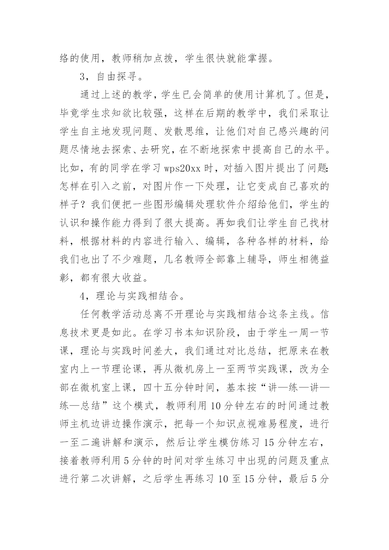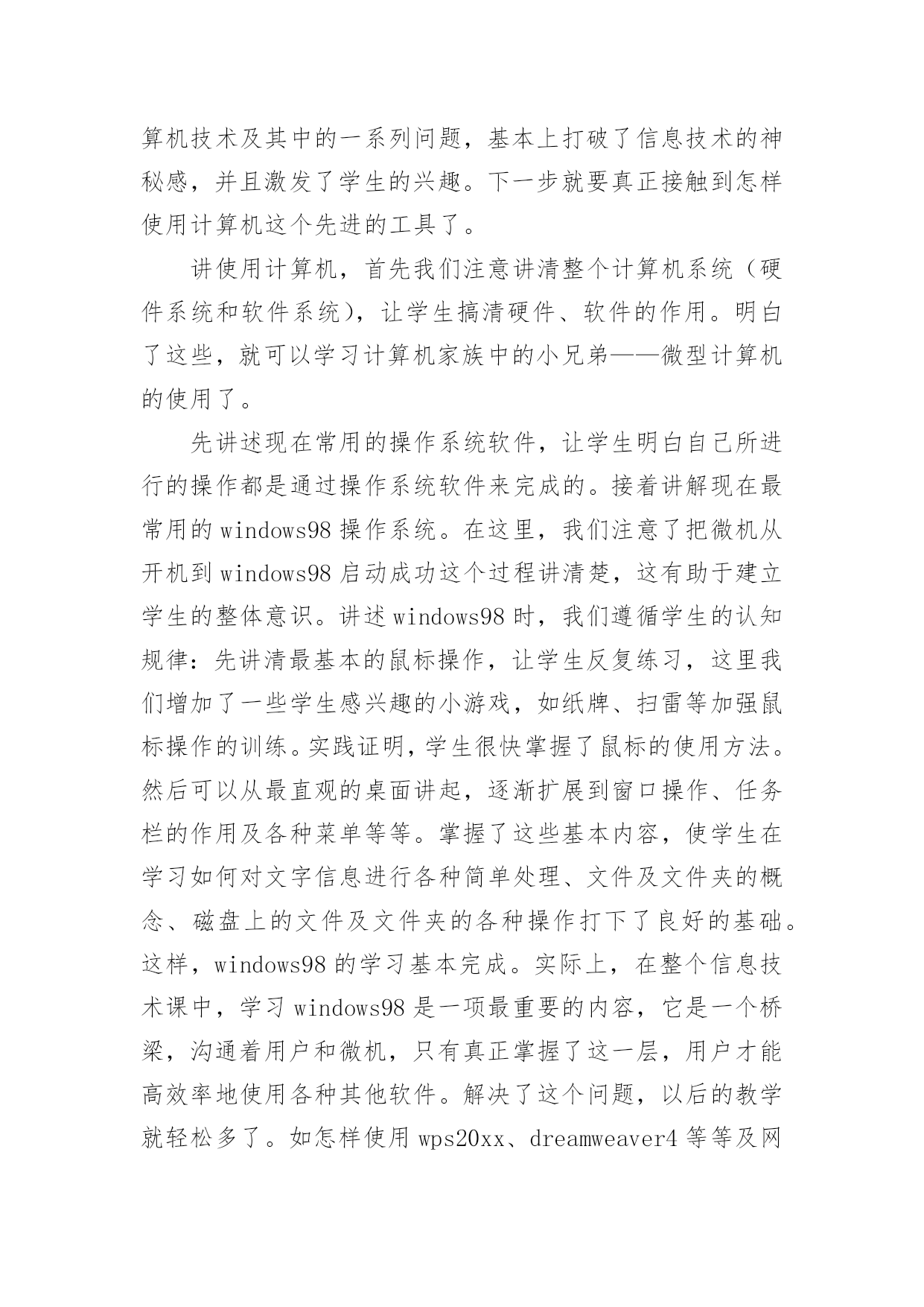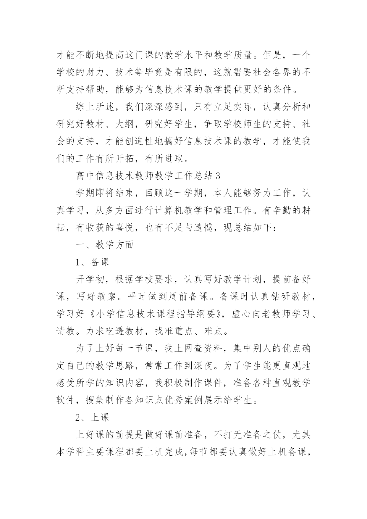 高中信息技术工作总结总结是对取得的成绩、存在的问题及得到的经验和教训等方面情况进行评价与描述的一种书面材料,它可以促使我们思考,不如我们来制定一份总结吧。那么你真的懂得怎么写总结吗?下面是小编为大家收集的高中信息技术工作总结,欢迎大家分享。高中信息技术工作总结1本学期我担任高1年级信息技术教学工作。现阶段信息技术课的教学目标是主要培养学生掌握计算机操作技能,着眼于使学生掌握信息科学、信息技术的基本知识,注重培养学生信息采集、加工、发布等信息处理的基本技能,促进和提高学生主动利用信息技术和信息资源解决实际问题的能力,并用于学习和生活,当然最重要的还在于高中的信息技术学业水平测试,完成相关的教学任务及教学要求。本学期教学内容包括信息技术基储办公软件的操作。一、不断提高个人素养积极参加学校组织的政治学习,提高自己的政治素质和理论素养,注重自己思想道德水平的提高。平时积极参加教研活动,在工作之余,学习与农远工作和信息技术教学及计算机维护的相关知识,努力提高个人的业务水平,为信息技术教学工作打下良好的基础。二、扎实开展教学工作备课对于每门课程的教学而言,都是必不可少的环节,信息技术学科教学也不例外。在备课的过程中,我首先对所要教授的知识进行全面的研究、归纳、总结,并根据教授对象的不同特点找到教授的方法与方式。在此基础上将所备内容在计算机上进行逐一推敲、验证、演练,以使一些空洞的知识具有可操作性;同时,还将每个知识点构造成一个操作性实例,通过对实例的演练让学生对知识点产生准确、完整的认识,由此得出相关的结论。从而做到对人、书、机三者进行有机结合的备课,备课不只是在教案本上备课,而是把工作重点放在电子备课上。根据信息技术学科的基本特点,我在教学过程中当坚持以学生为主体,即在教师为主导、学生为主体的双主教学模式下进一步强调学生的主体地位。因为计算机课程操作性强、更新速度快、创造性强的特点都要求我们必须强调学生在教学活动中的主体地位。学生只有通过自主地学习,才能在掌握基础知识的基础上,发现问题,解决问题,从而提高自己的操作水平,跟上知识的发展更新并进一步发挥自己的创造力。如果单纯地依靠老师的教授,他们所掌握的知识将总是有限的。在教学中,学生使用的是广教版的教材,教材教案能够贴近实际,符合学生的认知规律和身心发展特点,因此在教学过程中注重结合教材的特点,因人而异地设计适合于学生参加的各种兴趣活动,并在活动中加强教育的示范与引导,加强对学困生的个别指导,使学生能够顺利地完成学习任务,并在教学中,注意知识的拓展和延伸,使一部分学习知识比较快、技能掌握比较好的学生能够利用空余时间进行一些自主学习,达到提高的目的。信息技术课是一门操作性很强的学科,这就要求我们在讲课时尽可能地把一些操作步骤演示给学生看。这样比单纯地告诉学生步骤,再让他们去练效果更好。因为在老师演示时,同学们不仅看到了整个过程,还看到了结果,这比纸上谈兵要有效的多。在这方面,我充分利用了多媒体教学软件,上课时,老师在教师机上演示,学生通过网络在自己的屏幕上观看,对老师的操作过程和结果看得一清二楚,大大提高了讲课效率。同时注重了学生能力的培养,主要是能让学生做的就让学生做,包括演示操作尽量让学生来做,同时许多操作都采用让学生先练习,再归纳,后总结的步骤来。正所谓“百看不如一练”,学生亲自动手练习要比听、看有效得多。教师通过对知识的讲解、演示,只能使学生把一个模糊的概念转化为其思维体系中一个模糊的认识,而能不能将这个认识清晰化,关键的一步就是能否让学生去动手、去实践,在实践中把握真知,在实践中创造成果。所以,在课堂上我加大上机时间在教学时间中的比重,让学生有充足的时间去练习,把模糊的认识清晰化;并能有进一步的提高和创造。信息技术课,不仅仅是让学生学会几种操作,更重要的是培养学生的一种思想、一种意识,为我国各产业的长足发展营造一种良好的氛围。学生,是未来国家的建设者,如何使将来有更多的有志者为我国的信息技术产业作贡献,这就需要我们教师在教学中不断地把我国信息技术业的现状讲述给学生,让他们知道我国信息技术业在世界上的位置,不断激发起他们好好学习、为国效力的决心和毅力。在信息技术课堂教学中针对学生的具体情况采用不同的教学方法,从实际做起,注重落实,注意细节,使学生能在活跃的课堂气氛中学到更多的知识。一学期来,我坚持不懈地努力,认认真真的工作,学生的操作水平也有了解一定的提升。我将继续努力让我的课堂更有生色!高中信息技术教师教学工作总结2信息技术作为一门重要的技术,已经被越来越多的人们所使用。在当今及未来社会,掌握信息技术是对人的一种基本要求,人们都知道不懂得信息技术的人必将被现代社会所淘汰。但是,信息技术课作为一门新课,还很年轻,需要我们教师同行及社会各界人士等不断地关心、支持、探索、交流,使我