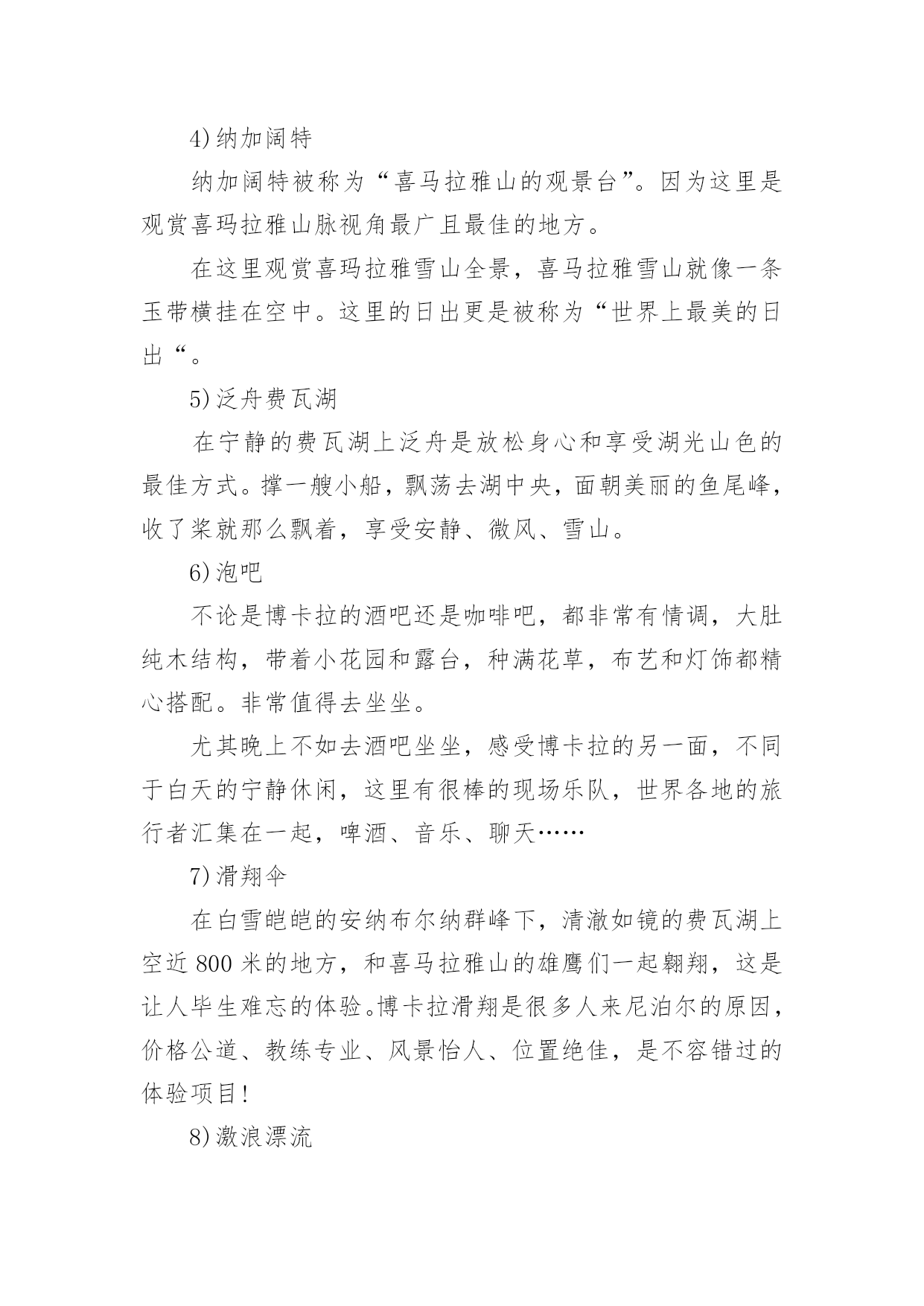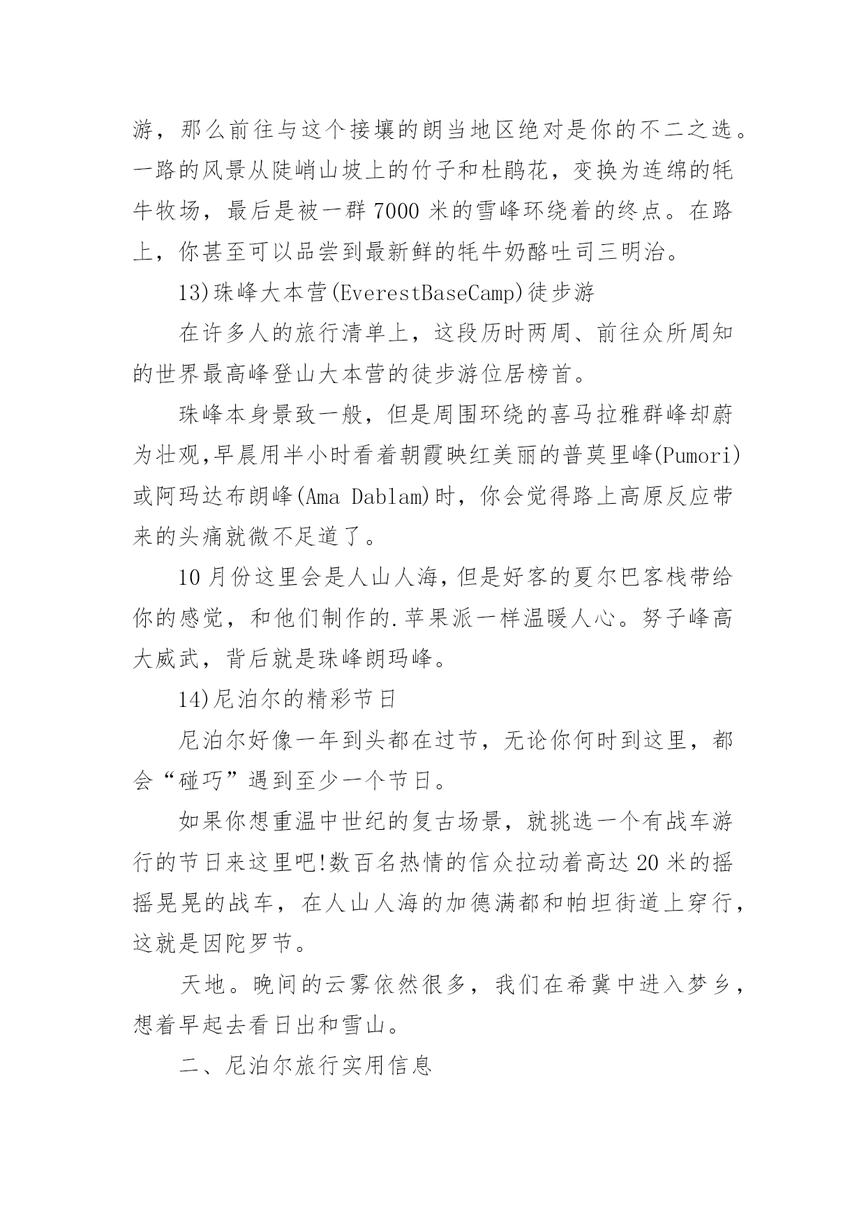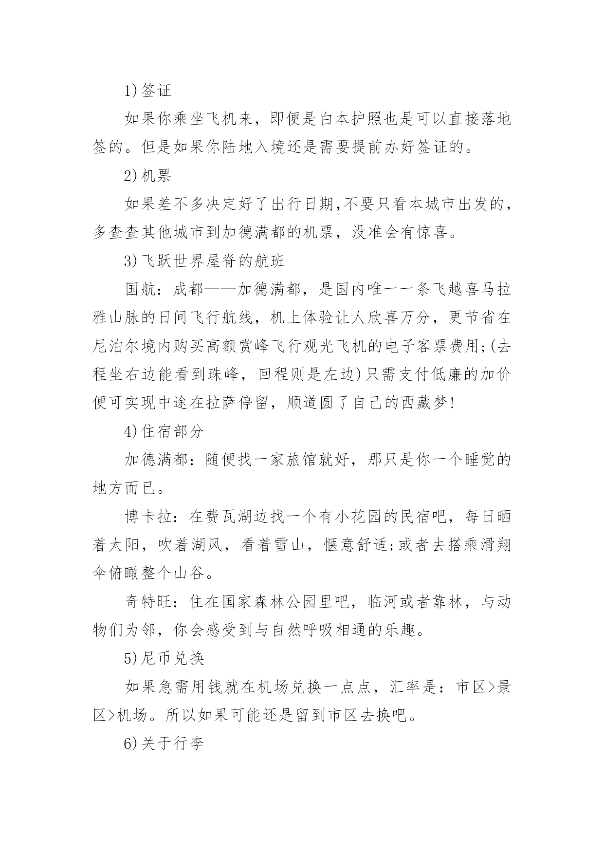尼泊尔旅游自由行攻略尼泊尔历史悠久,是亚洲最早的文明古国之一,在这里,发源着世界上很多文明。下面梳理了尼泊尔旅游自由行攻略,供大家参考借鉴。尼泊尔旅游自由行攻略篇1一、那些不可错过的地方1)泰米尔泰米尔只有三条街道,尘土飞扬,但这丝毫不影响每天大批外国人涌进这里。在这里你几乎可以找到所有你想要的:户外装备、手工艺品、当地特产、特色餐厅……留一些时间给它吧,你一定不会失望。2)梦想花园(TheGardenofDreams)跟泰米尔只有一墙之隔,但却没有丝毫喧嚣,这里是整个加德满都最安静最美丽的地方。独自带上一本书,或者携手心爱的人来,躺在被鲜花和喷泉簇拥的提供垫子的草坪上,享受这份宁静与惬意!3)杜巴广场这里是整个尼泊尔的标志,无论是风景还是人文。历史悠久的寺庙、佛塔、皇宫院落,精美的木雕、生动的石像……当地人坐在高高的寺庙台阶上晒太阳、谈恋爱,小贩围着寺庙摆摊:鲜花、水果、香料、日常用品;苦行僧坐在角落里打坐;寺庙里的朝拜,从未停息……4)纳加阔特纳加阔特被称为“喜马拉雅山的观景台”。因为这里是观赏喜玛拉雅山脉视角最广且最佳的地方。在这里观赏喜玛拉雅雪山全景,喜马拉雅雪山就像一条玉带横挂在空中。这里的日出更是被称为“世界上最美的日出“。5)泛舟费瓦湖在宁静的费瓦湖上泛舟是放松身心和享受湖光山色的最佳方式。撑一艘小船,飘荡去湖中央,面朝美丽的鱼尾峰,收了桨就那么飘着,享受安静、微风、雪山。6)泡吧不论是博卡拉的酒吧还是咖啡吧,都非常有情调,大肚纯木结构,带着小花园和露台,种满花草,布艺和灯饰都精心搭配。非常值得去坐坐。尤其晚上不如去酒吧坐坐,感受博卡拉的另一面,不同于白天的宁静休闲,这里有很棒的现场乐队,世界各地的旅行者汇集在一起,啤酒、音乐、聊天……7)滑翔伞在白雪皑皑的安纳布尔纳群峰下,清澈如镜的费瓦湖上空近800米的地方,和喜马拉雅山的雄鹰们一起翱翔,这是让人毕生难忘的体验。博卡拉滑翔是很多人来尼泊尔的原因,价格公道、教练专业、风景怡人、位置绝佳,是不容错过的体验项目!8)激浪漂流尼泊尔素有世界最佳漂流和皮划艇运动目的地之称。消融的雪水从喜马拉雅群峰奔涌而下,使得胡特可西河水量激增。在河上进行一日漂流,你能够在这从西藏高原流下来的河水中酣畅淋漓地享受激浪带来的刺激。当然,历时数日的河上探险将带给你更难忘的记忆——在格尔纳利河、塔姆尔河、桑科希河上乘坐橡皮艇穿越尼泊尔最偏远的角落。在进入丛林荒野时,河流从汹涌澎湃的激浪变为平缓宁静的顺水而下,晚上可以在古朴的沙滩营地过夜。9)安纳布尔纳峰(Annapurna)环线徒步游围绕8091米的安纳布尔纳峰的19天徒步之旅,是尼泊尔最热门的徒步路线,其受欢迎的原因显而易见:客栈非常舒适,山景无与伦比,5416米的ThorungLa能够挑战体力极限,而且这段从低海拔地区横穿喜马拉雅高原的旅程能够带给你心理上的极大满足。11)蓝毗尼(Lumbini)佛祖诞生地前往佛祖诞生地朝拜是南亚次大陆最伟大的心灵旅程之一。你可以到乔达摩悉达多王子2500年前的出生地参观,这处遗址于100年前才被重新发现。然后游玩临近的崇佛国家在这里兴建的寺庙群。但是也许最有意义的事情是找到一个安静的角落,读一本佛教经典书籍,然后思考生命存在的意义。没有比这更深刻的旅游体验了。12)朗当(Langtang)徒步游如果你只有一个星期时期,又想真正体验尼泊尔的徒步游,那么前往与这个接壤的朗当地区绝对是你的不二之选。一路的风景从陡峭山坡上的竹子和杜鹃花,变换为连绵的牦牛牧场,最后是被一群7000米的雪峰环绕着的终点。在路上,你甚至可以品尝到最新鲜的牦牛奶酪吐司三明治。13)珠峰大本营(EverestBaseCamp)徒步游在许多人的旅行清单上,这段历时两周、前往众所周知的世界最高峰登山大本营的徒步游位居榜首。珠峰本身景致一般,但是周围环绕的喜马拉雅群峰却蔚为壮观,早晨用半小时看着朝霞映红美丽的普莫里峰(Pumori)或阿玛达布朗峰(AmaDablam)时,你会觉得路上高原反应带来的头痛就微不足道了。10月份这里会是人山人海,但是好客的夏尔巴客栈带给你的感觉,和他们制作的.苹果派一样温暖人心。努子峰高大威武,背后就是珠峰朗玛峰。14)尼泊尔的精彩节日尼泊尔好像一年到头都在过节,无论你何时到这里,都会“碰巧”遇到至少一个节日。如果你想重温中世纪的复古场景,就挑选一个有战车游行的节日来这里吧!数百名热情的信众拉动着高达20米的摇摇晃晃的战车,在人山人海的加德满都和帕坦街道上穿行,这就是因陀罗节。天地。晚间的云雾依然很多,我们在希冀中进入梦乡,想着早起去看日出和雪山。二、尼泊尔旅行实用信息1)签证如果你乘坐飞机来,即便是白本护照也是可以直接落地签的。但是如果你陆地入境还是需要提前办好签证的。2)机票如果差不多决定好了出行日期,不