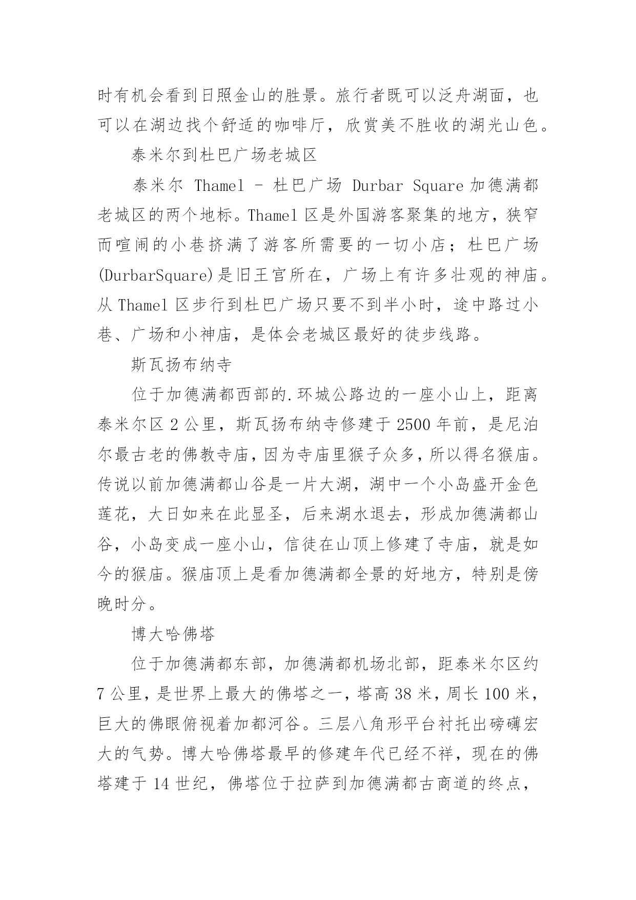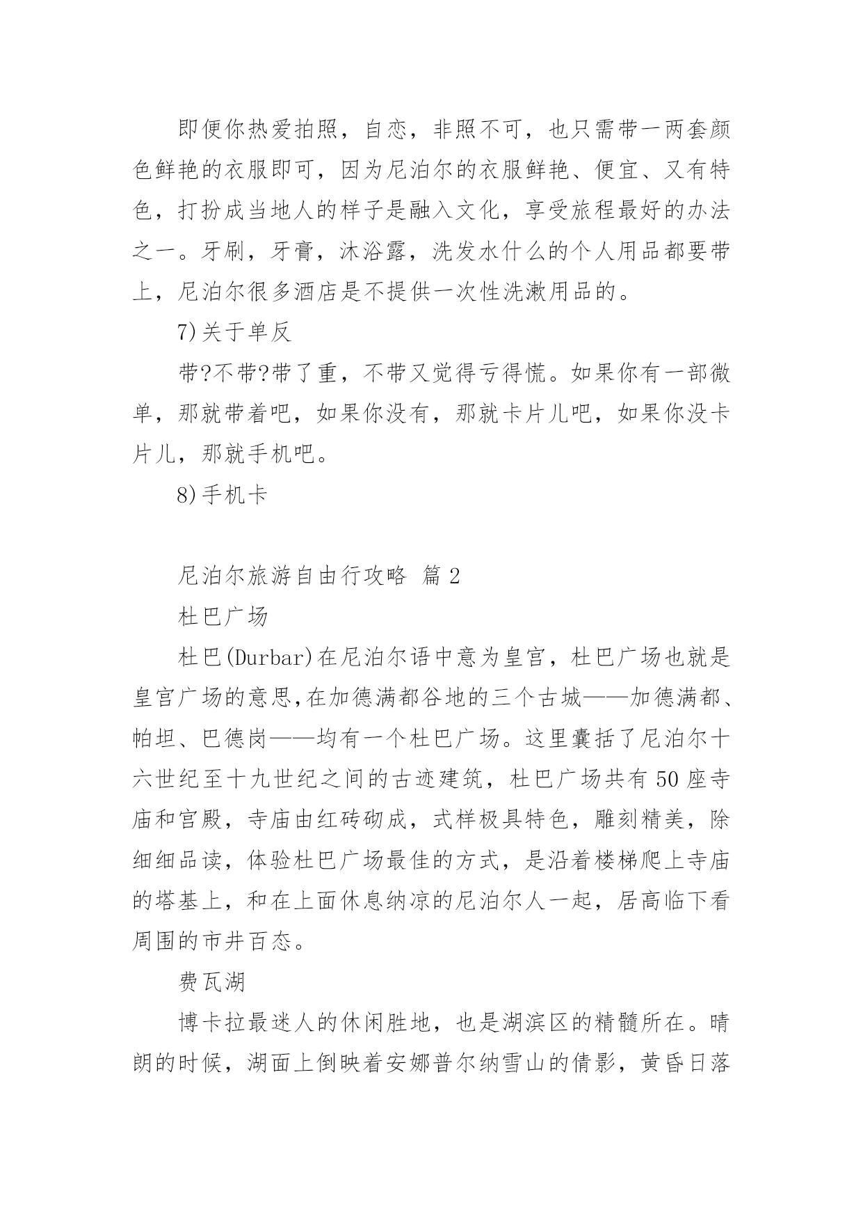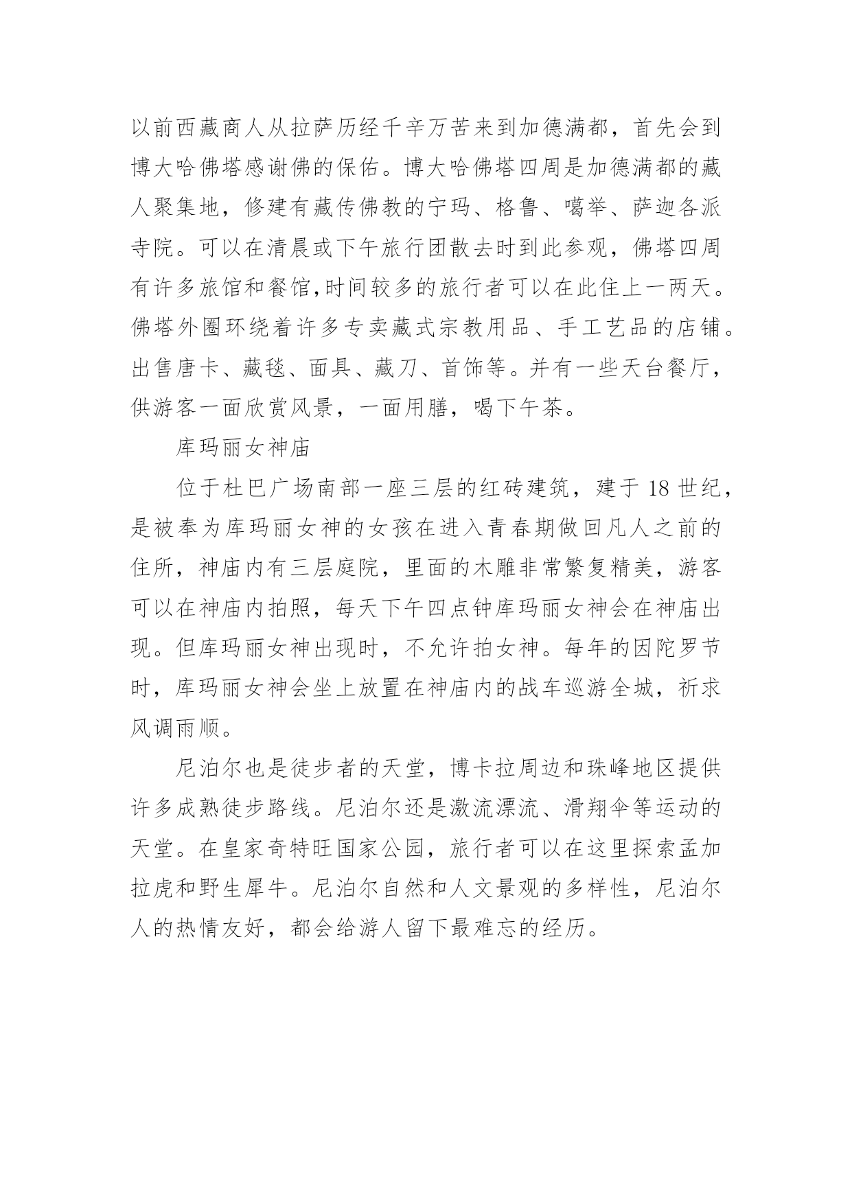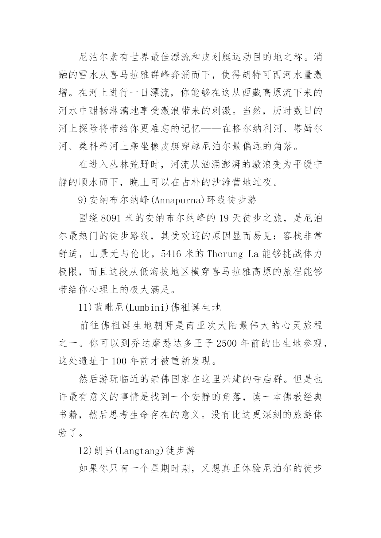尼泊尔旅游自由行攻略尼泊尔历史悠久,是亚洲最早的文明古国之一,在这里,发源着世界上很多文明。下面梳理了尼泊尔旅游自由行攻略,供大家参考借鉴。尼泊尔旅游自由行攻略篇1一、那些不可错过的地方1)泰米尔泰米尔只有三条街道,尘土飞扬,但这丝毫不影响每天大批外国人涌进这里。在这里你几乎可以找到所有你想要的:户外装备、手工艺品、当地特产、特色餐厅……留一些时间给它吧,你一定不会失望。2)梦想花园(TheGardenofDreams)跟泰米尔只有一墙之隔,但却没有丝毫喧嚣,这里是整个加德满都最安静最美丽的地方。独自带上一本书,或者携手心爱的人来,躺在被鲜花和喷泉簇拥的提供垫子的草坪上,享受这份宁静与惬意!3)杜巴广场这里是整个尼泊尔的标志,无论是风景还是人文。历史悠久的寺庙、佛塔、皇宫院落,精美的木雕、生动的石像……当地人坐在高高的寺庙台阶上晒太阳、谈恋爱,小贩围着寺庙摆摊:鲜花、水果、香料、日常用品;苦行僧坐在角落里打坐;寺庙里的朝拜,从未停息……4)纳加阔特纳加阔特被称为“喜马拉雅山的观景台”。因为这里是观赏喜玛拉雅山脉视角最广且最佳的地方。在这里观赏喜玛拉雅雪山全景,喜马拉雅雪山就像一条玉带横挂在空中。这里的日出更是被称为“世界上最美的日出“。5)泛舟费瓦湖在宁静的费瓦湖上泛舟是放松身心和享受湖光山色的最佳方式。撑一艘小船,飘荡去湖中央,面朝美丽的鱼尾峰,收了桨就那么飘着,享受安静、微风、雪山。6)泡吧不论是博卡拉的酒吧还是咖啡吧,都非常有情调,大肚纯木结构,带着小花园和露台,种满花草,布艺和灯饰都精心搭配。非常值得去坐坐。尤其晚上不如去酒吧坐坐,感受博卡拉的另一面,不同于白天的宁静休闲,这里有很棒的现场乐队,世界各地的旅行者汇集在一起,啤酒、音乐、聊天……7)滑翔伞在白雪皑皑的安纳布尔纳群峰下,清澈如镜的费瓦湖上空近800米的地方,和喜马拉雅山的雄鹰们一起翱翔,这是让人毕生难忘的体验。博卡拉滑翔是很多人来尼泊尔的原因,价格公道、教练专业、风景怡人、位置绝佳,是不容错过的体验项目!8)激浪漂流尼泊尔素有世界最佳漂流和皮划艇运动目的地之称。消融的雪水从喜马拉雅群峰奔涌而下,使得胡特可西河水量激增。在河上进行一日漂流,你能够在这从西藏高原流下来的河水中酣畅淋漓地享受激浪带来的刺激。当然,历时数日的河上探险将带给你更难忘的记忆——在格尔纳利河、塔姆尔河、桑科希河上乘坐橡皮艇穿越尼泊尔最偏远的角落。在进入丛林荒野时,河流从汹涌澎湃的激浪变为平缓宁静的顺水而下,晚上可以在古朴的沙滩营地过夜。9)安纳布尔纳峰(Annapurna)环线徒步游围绕8091米的安纳布尔纳峰的19天徒步之旅,是尼泊尔最热门的徒步路线,其受欢迎的原因显而易见:客栈非常舒适,山景无与伦比,5416米的ThorungLa能够挑战体力极限,而且这段从低海拔地区横穿喜马拉雅高原的旅程能够带给你心理上的极大满足。11)蓝毗尼(Lumbini)佛祖诞生地前往佛祖诞生地朝拜是南亚次大陆最伟大的心灵旅程之一。你可以到乔达摩悉达多王子2500年前的出生地参观,这处遗址于100年前才被重新发现。然后游玩临近的崇佛国家在这里兴建的寺庙群。但是也许最有意义的事情是找到一个安静的角落,读一本佛教经典书籍,然后思考生命存在的意义。没有比这更深刻的旅游体验了。12)朗当(Langtang)徒步游如果你只有一个星期时期,又想真正体验尼泊尔的徒步游,那么前往与这个接壤的朗当地区绝对是你的不二之选。一路的风景从陡峭山坡上的竹子和杜鹃花,变换为连绵的牦牛牧场,最后是被一群7000米的雪峰环绕着的终点。在路上,你甚至可以品尝到最新鲜的牦牛奶酪吐司三明治。13)珠峰大本营(EverestBaseCamp)徒步游在许多人的旅行清单上,这段历时两周、前往众所周知的世界最高峰登山大本营的徒步游位居榜首。珠峰本身景致一般,但是周围环绕的喜马拉雅群峰却蔚为壮观,早晨用半小时看着朝霞映红美丽的普莫里峰(Pumori)或阿玛达布朗峰(AmaDablam)时,你会觉得路上高原反应带来的头痛就微不足道了。10月份这里会是人山人海,但是好客的夏尔巴客栈带给你的感觉,和他们制作的.苹果派一样温暖人心。努子峰高大威武,背后就是珠峰朗玛峰。14)尼泊尔的精彩节日尼泊尔好像一年到头都在过节,无论你何时到这里,都会“碰巧”遇到至少一个节日。如果你想重温中世纪的复古场景,就挑选一个有战车游行的节日来这里吧!数百名热情的信众拉动着高达20米的摇摇晃晃的战车,在人山人海的加德满都和帕坦街道上穿行,这就是因陀罗节。天地。晚间的云雾依然很多,我们在希冀中进入梦乡,想着早起去看日出和雪山。二、尼泊尔旅行实用信息1)签证如果你乘坐飞机来,即便是白本护照也是可以直接落地签的。但是如果你陆地入境还是需要提前办好签证的。2)机票如果差不多决定好了出行日期,不