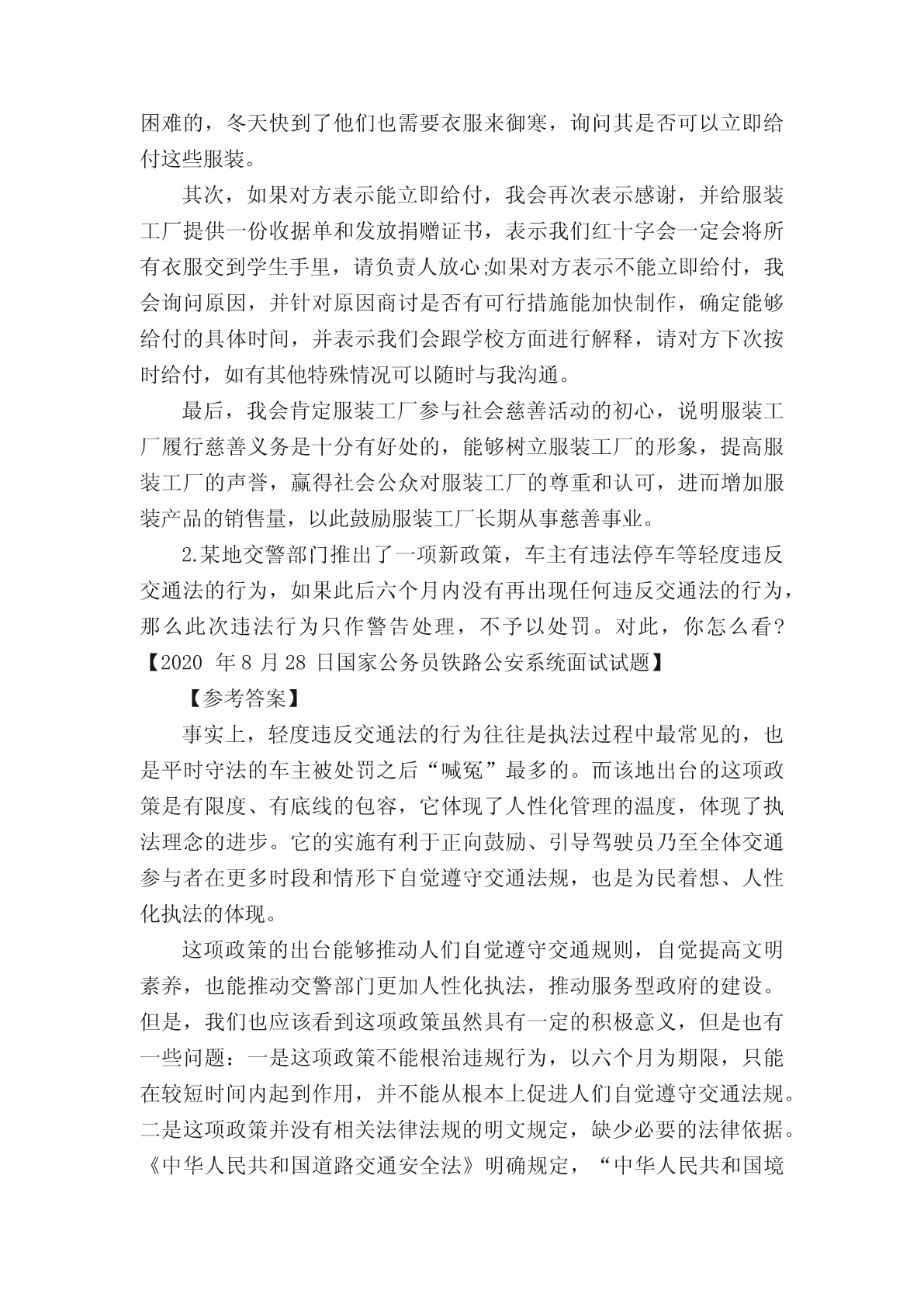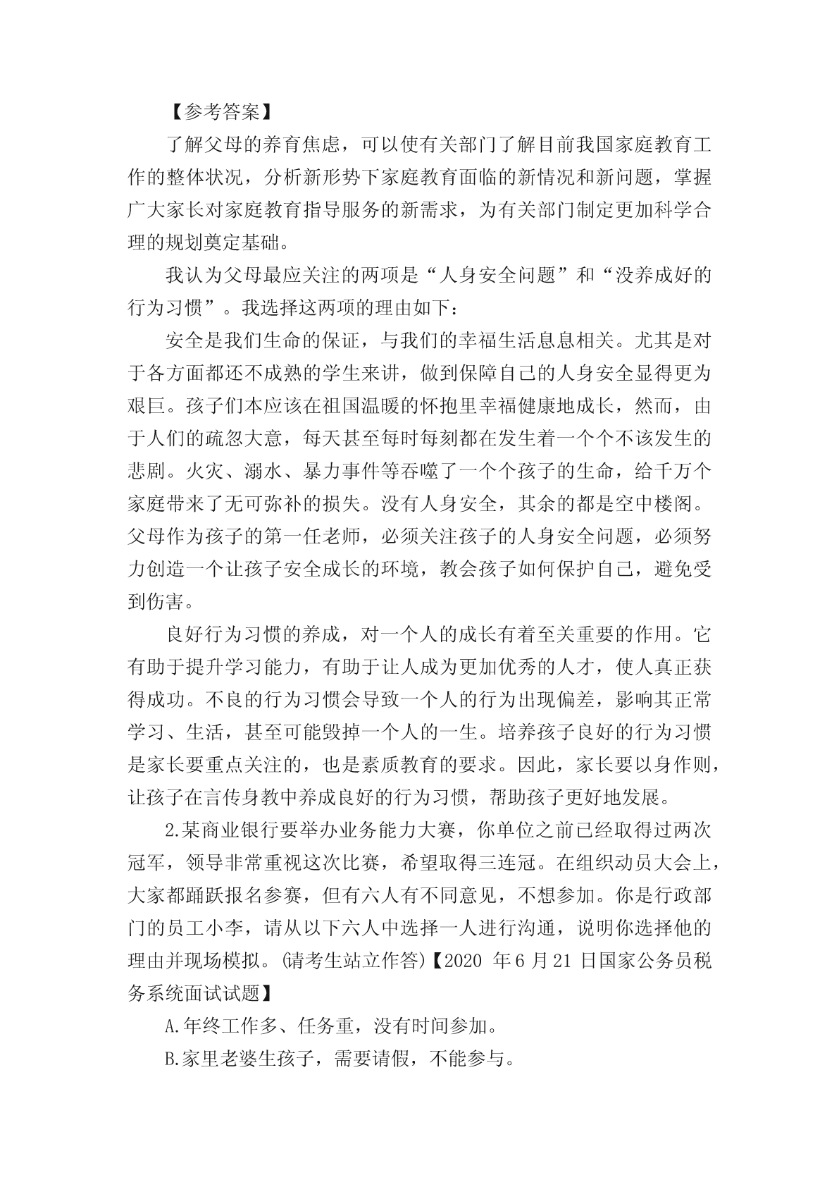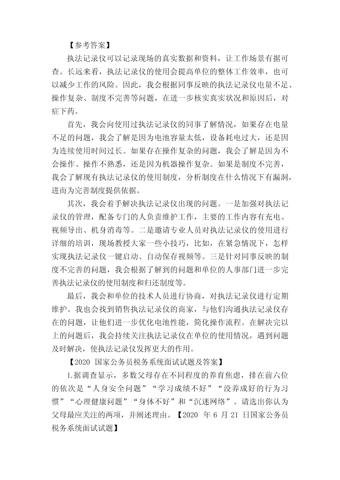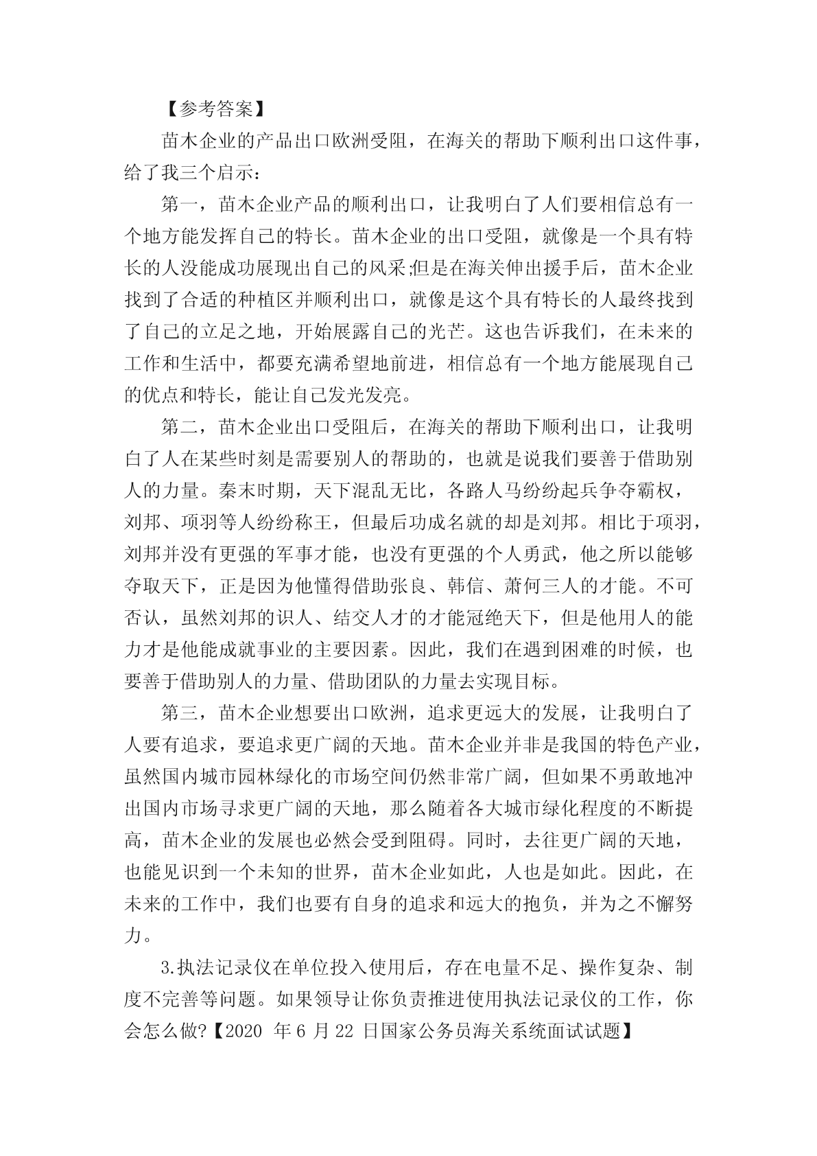 2022公务员面试真题及答案解析【2020国家公务员海关系统面试试题及答案】1.改革开放已经走过了万水千山,但还要继续跋山涉水。作为青年人,你怎么理解这句话?【2020年6月20日国家公务员海关系统面试试题】【参考答案】改革开放已经走过了万水千山,但还要继续跋山涉水。这句话是习近平总书记在庆祝改革开放40周年大会上讲述的,代表了以习近平同志为核心的党中央对改革的态度。在改革的道路上,虽然我们走过了万水千山,取得了一些成绩,但是还不能停下脚步,还应该向前,继续跋山涉水。回顾我们的历史,我们可以欣喜地看到改革开放的成绩:改革开放以来,我国加入了世界贸易组织,通过引入外资,与世界其他国家和企业合作,我国的经济得到了飞速发展,用短短四十几年的时间,从一穷二白到经济总量跃居世界第二。我国经济的飞速发展,与我们的改革开放政策有着密不可分的关系。但是坐在功劳簿上回望过去远远不够,现在更需要我们扛起改革的大旗继续走下去,甚至因为当前国内外的复杂情势,我们更需要在改革时紧绷着弦。习近平总书记也曾说过,我国改革已经进入攻坚期和深水区。这意味着我们不仅要改,而且更要细心谨慎地改、攻坚克难地改。要想继续坚持改革开放,国家应该做好两方面工作:一方面是要在稳中求改革,在稳定国内经济、稳定人民群众的生产生活水平的基础上谋求改革;另一方面是要继续加大开放的步伐,让我国与世界经济联系得更加紧密,不仅让自身得到发展,还能带动其他国家一起发展。同时,我们作为青年人也要积极参与到改革开放中来,在做好本职工作的基础上,积极投身改革开放的各项工作,为改革开放出一份力。2.苗木企业的产品出口欧洲受阻,海关知道后查询相关政策,帮助企业找到了合适的苗木种植区,顺利出口。你从中能得到哪些启示?【2020年6月21日国家公务员海关系统面试试题】【参考答案】苗木企业的产品出口欧洲受阻,在海关的帮助下顺利出口这件事,给了我三个启示:第一,苗木企业产品的顺利出口,让我明白了人们要相信总有一个地方能发挥自己的特长。苗木企业的出口受阻,就像是一个具有特长的人没能成功展现出自己的风采;但是在海关伸出援手后,苗木企业找到了合适的种植区并顺利出口,就像是这个具有特长的人最终找到了自己的立足之地,开始展露自己的光芒。这也告诉我们,在未来的工作和生活中,都要充满希望地前进,相信总有一个地方能展现自己的优点和特长,能让自己发光发亮。第二,苗木企业出口受阻后,在海关的帮助下顺利出口,让我明白了人在某些时刻是需要别人的帮助的,也就是说我们要善于借助别人的力量。秦末时期,天下混乱无比,各路人马纷纷起兵争夺霸权,刘邦、项羽等人纷纷称王,但最后功成名就的却是刘邦。相比于项羽,刘邦并没有更强的军事才能,也没有更强的个人勇武,他之所以能够夺取天下,正是因为他懂得借助张良、韩信、萧何三人的才能。不可否认,虽然刘邦的识人、结交人才的才能冠绝天下,但是他用人的能力才是他能成就事业的主要因素。因此,我们在遇到困难的时候,也要善于借助别人的力量、借助团队的力量去实现目标。第三,苗木企业想要出口欧洲,追求更远大的发展,让我明白了人要有追求,要追求更广阔的天地。苗木企业并非是我国的特色产业,虽然国内城市园林绿化的市场空间仍然非常广阔,但如果不勇敢地冲出国内市场寻求更广阔的天地,那么随着各大城市绿化程度的不断提高,苗木企业的发展也必然会受到阻碍。同时,去往更广阔的天地,也能见识到一个未知的世界,苗木企业如此,人也是如此。因此,在未来的工作中,我们也要有自身的追求和远大的抱负,并为之不懈努力。3.执法记录仪在单位投入使用后,存在电量不足、操作复杂、制度不完善等问题。如果领导让你负责推进使用执法记录仪的工作,你会怎么做?【2020年6月22日国家公务员海关系统面试试题】【参考答案】执法记录仪可以记录现场的真实数据和资料,让工作场景有据可查。长远来看,执法记录仪的使用会提高单位的整体工作效率,也可以减少工作的风险。因此,我会根据同事反映的执法记录仪电量不足、操作复杂、制度不完善等问题,在进一步核实真实状况和原因后,对症下药。首先,我会向使用过执法记录仪的同事了解情况,如果存在电量不足的问题,我会了解是因为电池容量太低,设备耗电过大,还是因为连续使用时间过长。如果存在操作复杂的问题,我会了解是因为不会操作、操作不熟悉,还是因为机器操作复杂。如果是制度不完善,我会了解现有执法记录仪的使用制度,分析制度在什么情况下有漏洞,进而为完善制度提供依据。其次,我会着手解决执法记录仪出现的问题。一是加强对执法记录仪的管理,配备专门的人负责维护工作,主要的工作内容有充电、视频导出、机身消毒等。二是邀请专业