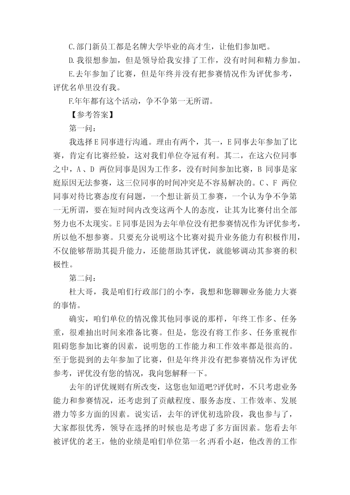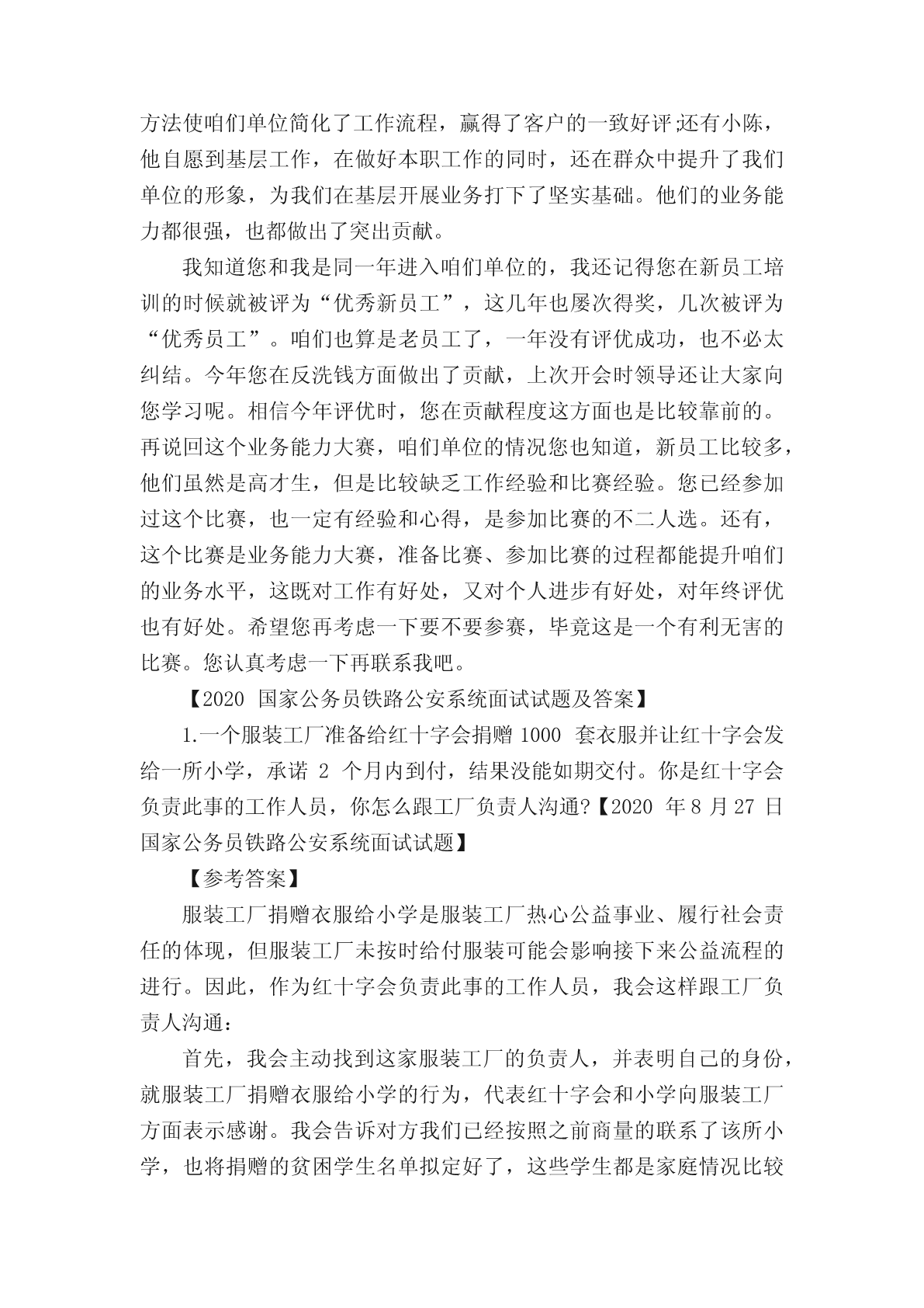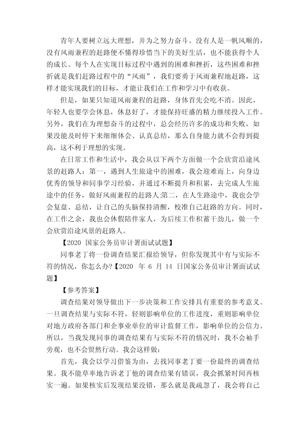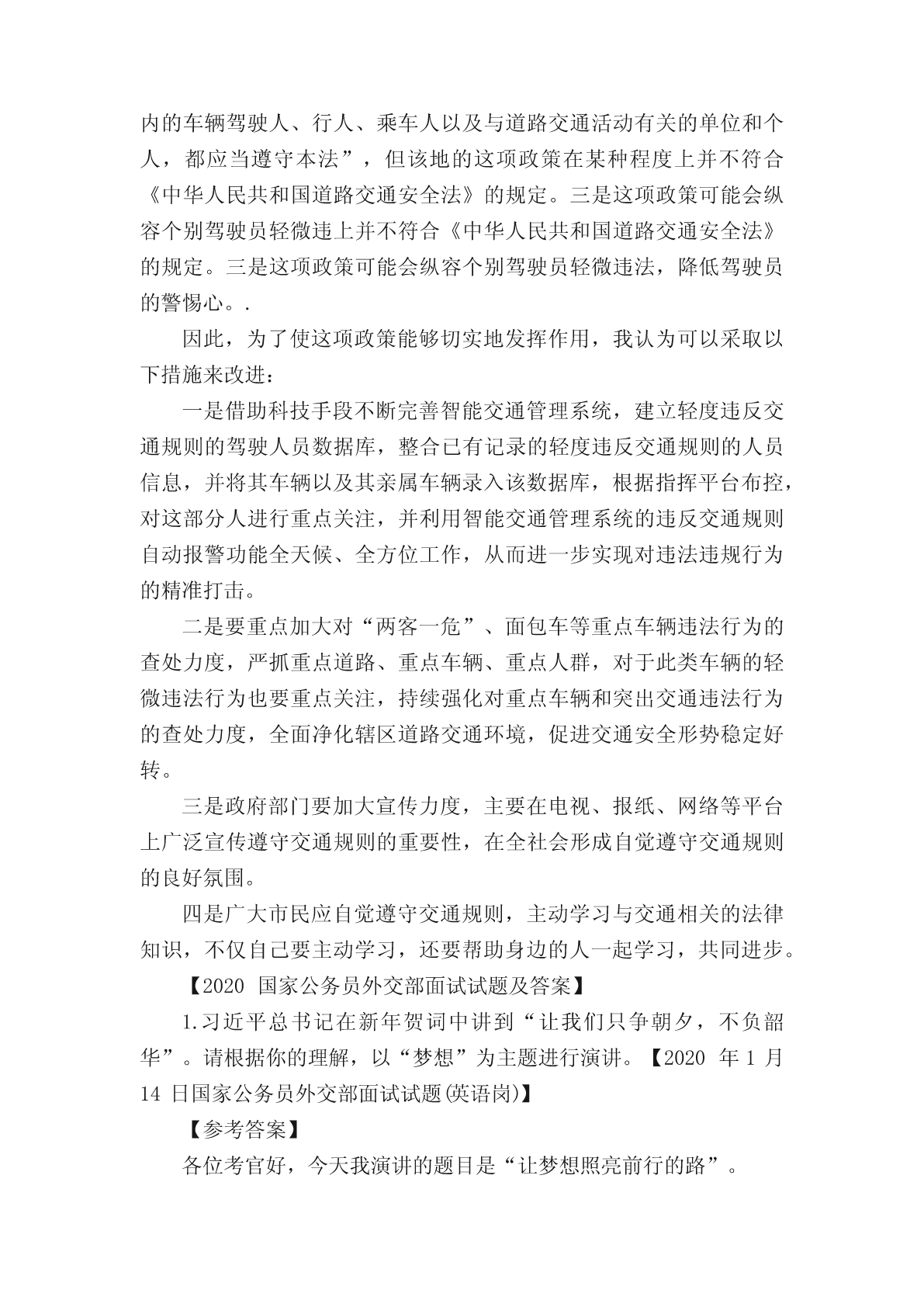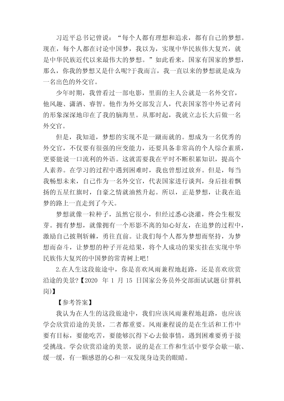 2022公务员面试真题及答案解析【2020国家公务员海关系统面试试题及答案】1.改革开放已经走过了万水千山,但还要继续跋山涉水。作为青年人,你怎么理解这句话?【2020年6月20日国家公务员海关系统面试试题】【参考答案】改革开放已经走过了万水千山,但还要继续跋山涉水。这句话是习近平总书记在庆祝改革开放40周年大会上讲述的,代表了以习近平同志为核心的党中央对改革的态度。在改革的道路上,虽然我们走过了万水千山,取得了一些成绩,但是还不能停下脚步,还应该向前,继续跋山涉水。回顾我们的历史,我们可以欣喜地看到改革开放的成绩:改革开放以来,我国加入了世界贸易组织,通过引入外资,与世界其他国家和企业合作,我国的经济得到了飞速发展,用短短四十几年的时间,从一穷二白到经济总量跃居世界第二。我国经济的飞速发展,与我们的改革开放政策有着密不可分的关系。但是坐在功劳簿上回望过去远远不够,现在更需要我们扛起改革的大旗继续走下去,甚至因为当前国内外的复杂情势,我们更需要在改革时紧绷着弦。习近平总书记也曾说过,我国改革已经进入攻坚期和深水区。这意味着我们不仅要改,而且更要细心谨慎地改、攻坚克难地改。要想继续坚持改革开放,国家应该做好两方面工作:一方面是要在稳中求改革,在稳定国内经济、稳定人民群众的生产生活水平的基础上谋求改革;另一方面是要继续加大开放的步伐,让我国与世界经济联系得更加紧密,不仅让自身得到发展,还能带动其他国家一起发展。同时,我们作为青年人也要积极参与到改革开放中来,在做好本职工作的基础上,积极投身改革开放的各项工作,为改革开放出一份力。2.苗木企业的产品出口欧洲受阻,海关知道后查询相关政策,帮助企业找到了合适的苗木种植区,顺利出口。你从中能得到哪些启示?【2020年6月21日国家公务员海关系统面试试题】【参考答案】苗木企业的产品出口欧洲受阻,在海关的帮助下顺利出口这件事,给了我三个启示:第一,苗木企业产品的顺利出口,让我明白了人们要相信总有一个地方能发挥自己的特长。苗木企业的出口受阻,就像是一个具有特长的人没能成功展现出自己的风采;但是在海关伸出援手后,苗木企业找到了合适的种植区并顺利出口,就像是这个具有特长的人最终找到了自己的立足之地,开始展露自己的光芒。这也告诉我们,在未来的工作和生活中,都要充满希望地前进,相信总有一个地方能展现自己的优点和特长,能让自己发光发亮。第二,苗木企业出口受阻后,在海关的帮助下顺利出口,让我明白了人在某些时刻是需要别人的帮助的,也就是说我们要善于借助别人的力量。秦末时期,天下混乱无比,各路人马纷纷起兵争夺霸权,刘邦、项羽等人纷纷称王,但最后功成名就的却是刘邦。相比于项羽,刘邦并没有更强的军事才能,也没有更强的个人勇武,他之所以能够夺取天下,正是因为他懂得借助张良、韩信、萧何三人的才能。不可否认,虽然刘邦的识人、结交人才的才能冠绝天下,但是他用人的能力才是他能成就事业的主要因素。因此,我们在遇到困难的时候,也要善于借助别人的力量、借助团队的力量去实现目标。第三,苗木企业想要出口欧洲,追求更远大的发展,让我明白了人要有追求,要追求更广阔的天地。苗木企业并非是我国的特色产业,虽然国内城市园林绿化的市场空间仍然非常广阔,但如果不勇敢地冲出国内市场寻求更广阔的天地,那么随着各大城市绿化程度的不断提高,苗木企业的发展也必然会受到阻碍。同时,去往更广阔的天地,也能见识到一个未知的世界,苗木企业如此,人也是如此。因此,在未来的工作中,我们也要有自身的追求和远大的抱负,并为之不懈努力。3.执法记录仪在单位投入使用后,存在电量不足、操作复杂、制度不完善等问题。如果领导让你负责推进使用执法记录仪的工作,你会怎么做?【2020年6月22日国家公务员海关系统面试试题】【参考答案】执法记录仪可以记录现场的真实数据和资料,让工作场景有据可查。长远来看,执法记录仪的使用会提高单位的整体工作效率,也可以减少工作的风险。因此,我会根据同事反映的执法记录仪电量不足、操作复杂、制度不完善等问题,在进一步核实真实状况和原因后,对症下药。首先,我会向使用过执法记录仪的同事了解情况,如果存在电量不足的问题,我会了解是因为电池容量太低,设备耗电过大,还是因为连续使用时间过长。如果存在操作复杂的问题,我会了解是因为不会操作、操作不熟悉,还是因为机器操作复杂。如果是制度不完善,我会了解现有执法记录仪的使用制度,分析制度在什么情况下有漏洞,进而为完善制度提供依据。其次,我会着手解决执法记录仪出现的问题。一是加强对执法记录仪的管理,配备专门的人负责维护工作,主要的工作内容有充电、视频导出、机身消毒等。二是邀请专业
