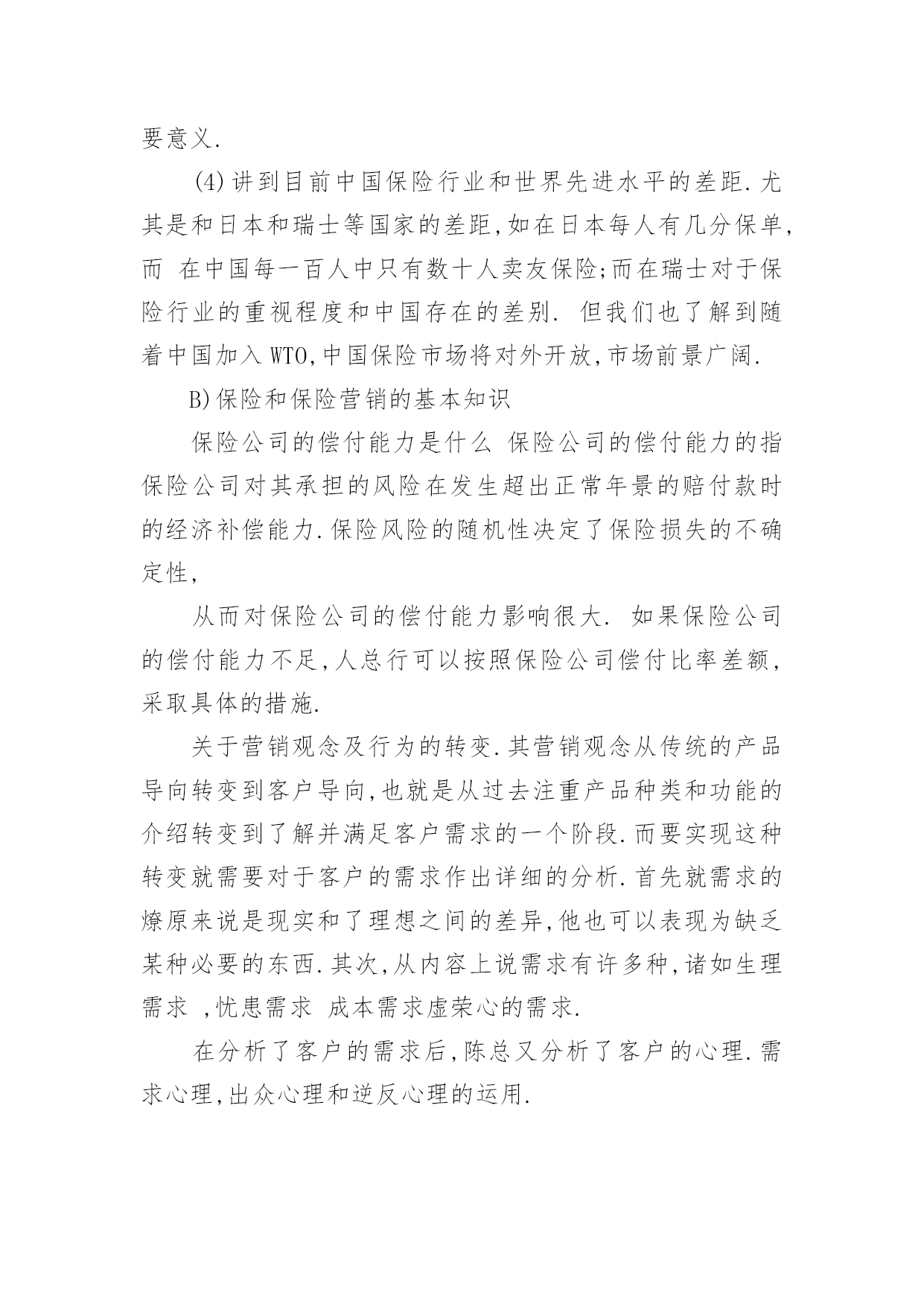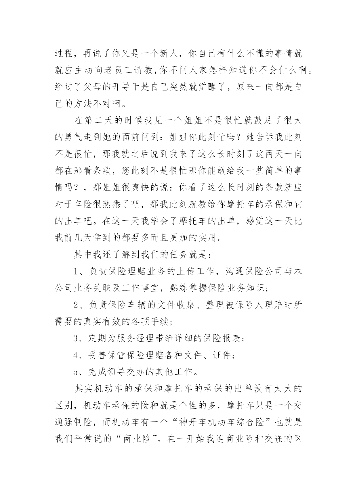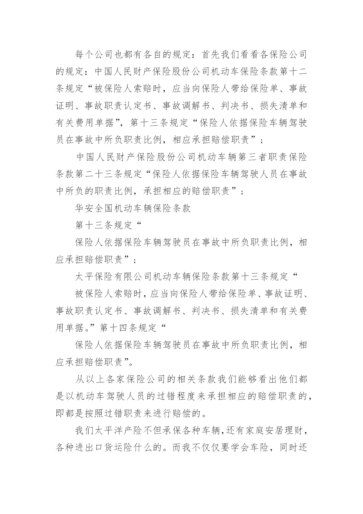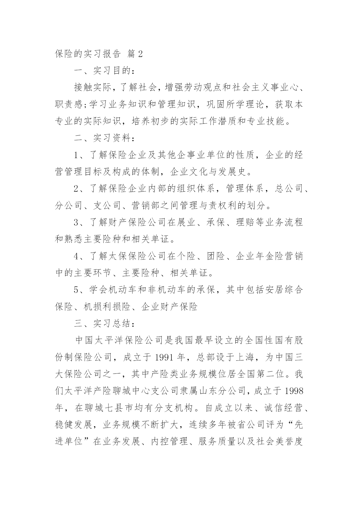 保险的实习报告在当下社会,报告与我们愈发关系密切,报告中涉及到专业性术语要解释清楚。那么一般报告是怎么写的呢?下面是小编帮大家整理的保险的实习报告4篇,希望能够帮助到大家。保险的实习报告篇1所实习单位基本情况介绍:泰康人寿命保险股份有限公司是一家经中国人民银行批准成立的全国性的,股份制保险公司,成立至今已经有11年的时间.经过近11年的发展,公司势力逐步增强.实习内容:1)陈总经理关于保险和保险营销的演讲A)当今中国保险市场状况(1)首先他分析了当今中国保险行业的一些基本状况.如以一个表格形式列出在中国保险市场上影响最大的几家保险公司的保费和的资产状况.(其中国寿的资产和保费位列榜首,而泰康的保费达到200亿,为第5位)他特别强调了泰康在收益率上的成就(收益率位居榜首,偿付能力达132%)(2)分析了他们在资产和保险营销方式上存在的差别,比如由于国寿保险在经营中国的市场上时间上早于其他的保险公司,因此使得他能够在保险营销方面投入较少的费用.(3)简单的讲解了外资保险在中国市场上的处境,关于外资企业陈总还特别提到适应本土文化对于外资保险的重要意义.(4)讲到目前中国保险行业和世界先进水平的差距.尤其是和日本和瑞士等国家的差距,如在日本每人有几分保单,而在中国每一百人中只有数十人卖友保险;而在瑞士对于保险行业的重视程度和中国存在的差别.但我们也了解到随着中国加入WTO,中国保险市场将对外开放,市场前景广阔.B)保险和保险营销的基本知识保险公司的偿付能力是什么保险公司的偿付能力的指保险公司对其承担的风险在发生超出正常年景的赔付款时的经济补偿能力.保险风险的随机性决定了保险损失的不确定性,从而对保险公司的偿付能力影响很大.如果保险公司的偿付能力不足,人总行可以按照保险公司偿付比率差额,采取具体的措施.关于营销观念及行为的转变.其营销观念从传统的产品导向转变到客户导向,也就是从过去注重产品种类和功能的介绍转变到了解并满足客户需求的一个阶段.而要实现这种转变就需要对于客户的需求作出详细的分析.首先就需求的燎原来说是现实和了理想之间的差异,他也可以表现为缺乏某种必要的东西.其次,从内容上说需求有许多种,诸如生理需求,忧患需求成本需求虚荣心的需求.在分析了客户的需求后,陈总又分析了客户的心理.需求心理,出众心理和逆反心理的运用.保险的实习报告篇2一、实习目的:接触实际,了解社会,增强劳动观点和社会主义事业心、职责感;学习业务知识和管理知识,巩固所学理论,获取本专业的实际知识,培养初步的实际工作潜质和专业技能。二、实习资料:1、了解保险企业及其他企事业单位的性质,企业的经营管理目标及构成的体制,企业文化与发展史。2、了解保险企业内部的组织体系,管理体系,总公司、分公司、支公司、营销部之间管理与责权利的划分。3、了解财产保险公司在展业、承保、理赔等业务流程和熟悉主要险种和相关单证。4、了解太保保险公司在个险、团险、企业年金险营销中的主要环节、主要险种、相关单证。5、学会机动车和非机动车的承保,其中包括安居综合保险、机损利损险、企业财产保险三、实习总结:中国太平洋保险公司是我国最早设立的全国性国有股份制保险公司,成立于1991年,总部设于上海,为中国三大保险公司之一,其中产险类业务规模位居全国第二位。我们太平洋产险聊城中心支公司隶属山东分公司,成立于1998年,在聊城七县市均有分支机构。自成立以来、诚信经营、稳健发展,业务规模不断扩大,连续多年被省公司评为“先进单位”在业务发展、内控管理、服务质量以及社会美誉度等方面都有出色的表现,受到广大客户的认可与支持。2XXX年3月12号是我踏入太平洋保险公司聊城中心支公司的第一天。我怀着一份激动和好奇的情绪来到中国太平洋保险财产股份有限公司,开始了大学以来的第二次实习实践活动。但这次与上次不一样的是,这是我的毕业实习。此刻回想起来,虽然只有短短的三个月的实践期,但在这三个月的实习中我学到了很多在课堂上学不到的知识,让我受益匪浅;并且接触了很多优秀、用心工作、热爱生活的人,在那里我度过了一段快乐而又难忘的时光。咋眼看去,保险和我的专业压根儿挨不到边,但在里面学到很多东西对我终身受用。在学校我虽然学习的是会计专业但我这次的实习没有和我的专业有太大的关联,但是我觉得无论我们干哪一行都要把它做的最好。实习结束之际,我想从专业知识和人生价值两方应对这三个月的实习做一个工作小结。我实习的部门是业管部,还清晰的记得在刚来的那两天自己觉得十分的沮丧,正因公司的每个人都在不停忙自己的事情,根本就没有人理会我这个初来乍到的实习生,于是自己就很无聊的坐在那看一些资料和条款,背一些最基础的费率。看了几天的条款有点看烦了,对于一些词语跟本就不明白并且对其中的一些险种也是搞不清楚的,没有人对于我这种现象给我过多的解释,因此我就开始