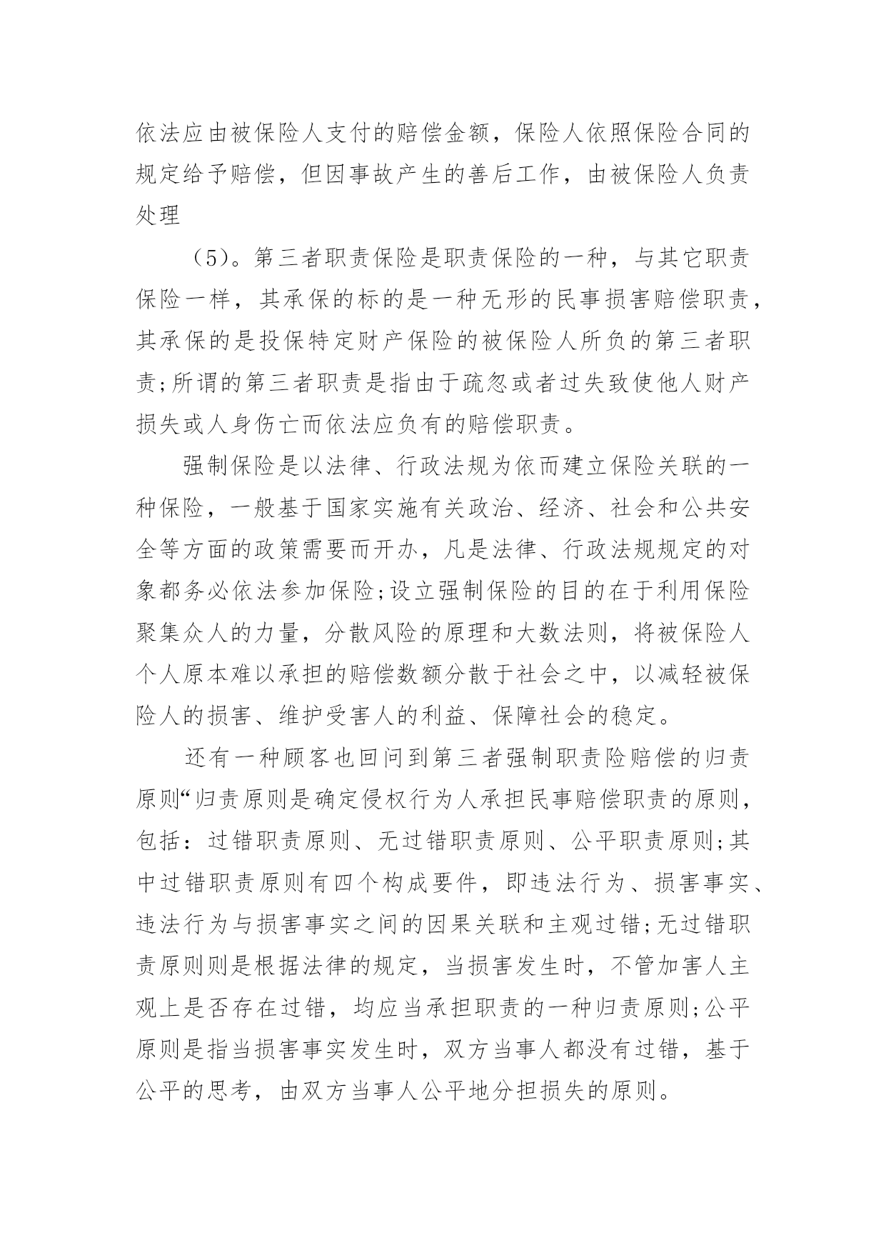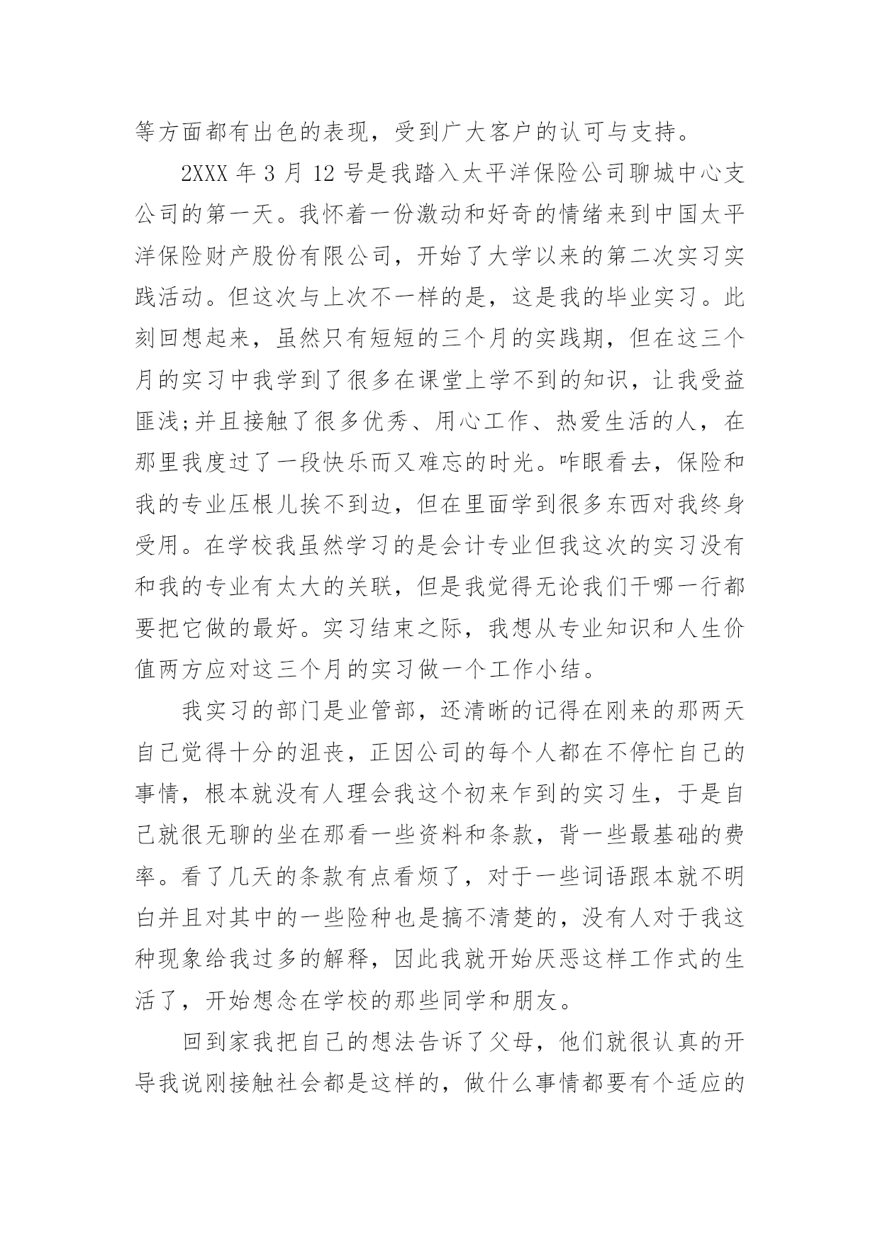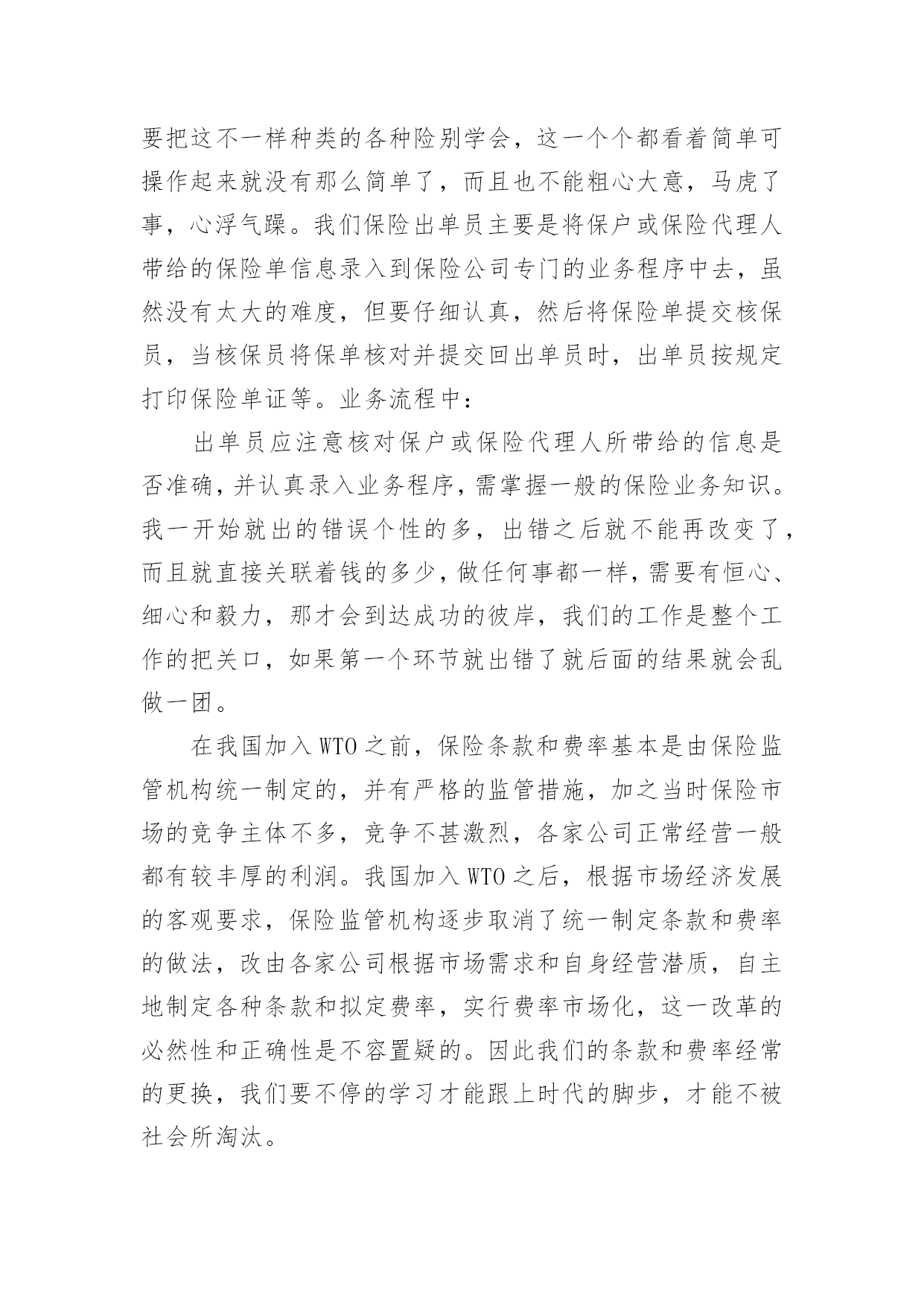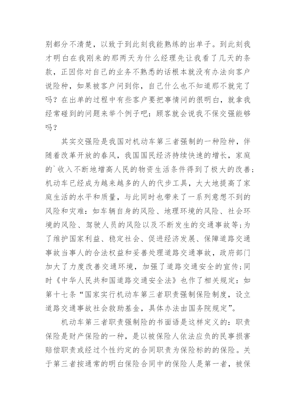 保险的实习报告在当下社会,报告与我们愈发关系密切,报告中涉及到专业性术语要解释清楚。那么一般报告是怎么写的呢?下面是小编帮大家整理的保险的实习报告4篇,希望能够帮助到大家。保险的实习报告篇1所实习单位基本情况介绍:泰康人寿命保险股份有限公司是一家经中国人民银行批准成立的全国性的,股份制保险公司,成立至今已经有11年的时间.经过近11年的发展,公司势力逐步增强.实习内容:1)陈总经理关于保险和保险营销的演讲A)当今中国保险市场状况(1)首先他分析了当今中国保险行业的一些基本状况.如以一个表格形式列出在中国保险市场上影响最大的几家保险公司的保费和的资产状况.(其中国寿的资产和保费位列榜首,而泰康的保费达到200亿,为第5位)他特别强调了泰康在收益率上的成就(收益率位居榜首,偿付能力达132%)(2)分析了他们在资产和保险营销方式上存在的差别,比如由于国寿保险在经营中国的市场上时间上早于其他的保险公司,因此使得他能够在保险营销方面投入较少的费用.(3)简单的讲解了外资保险在中国市场上的处境,关于外资企业陈总还特别提到适应本土文化对于外资保险的重要意义.(4)讲到目前中国保险行业和世界先进水平的差距.尤其是和日本和瑞士等国家的差距,如在日本每人有几分保单,而在中国每一百人中只有数十人卖友保险;而在瑞士对于保险行业的重视程度和中国存在的差别.但我们也了解到随着中国加入WTO,中国保险市场将对外开放,市场前景广阔.B)保险和保险营销的基本知识保险公司的偿付能力是什么保险公司的偿付能力的指保险公司对其承担的风险在发生超出正常年景的赔付款时的经济补偿能力.保险风险的随机性决定了保险损失的不确定性,从而对保险公司的偿付能力影响很大.如果保险公司的偿付能力不足,人总行可以按照保险公司偿付比率差额,采取具体的措施.关于营销观念及行为的转变.其营销观念从传统的产品导向转变到客户导向,也就是从过去注重产品种类和功能的介绍转变到了解并满足客户需求的一个阶段.而要实现这种转变就需要对于客户的需求作出详细的分析.首先就需求的燎原来说是现实和了理想之间的差异,他也可以表现为缺乏某种必要的东西.其次,从内容上说需求有许多种,诸如生理需求,忧患需求成本需求虚荣心的需求.在分析了客户的需求后,陈总又分析了客户的心理.需求心理,出众心理和逆反心理的运用.保险的实习报告篇2一、实习目的:接触实际,了解社会,增强劳动观点和社会主义事业心、职责感;学习业务知识和管理知识,巩固所学理论,获取本专业的实际知识,培养初步的实际工作潜质和专业技能。二、实习资料:1、了解保险企业及其他企事业单位的性质,企业的经营管理目标及构成的体制,企业文化与发展史。2、了解保险企业内部的组织体系,管理体系,总公司、分公司、支公司、营销部之间管理与责权利的划分。3、了解财产保险公司在展业、承保、理赔等业务流程和熟悉主要险种和相关单证。4、了解太保保险公司在个险、团险、企业年金险营销中的主要环节、主要险种、相关单证。5、学会机动车和非机动车的承保,其中包括安居综合保险、机损利损险、企业财产保险三、实习总结:中国太平洋保险公司是我国最早设立的全国性国有股份制保险公司,成立于1991年,总部设于上海,为中国三大保险公司之一,其中产险类业务规模位居全国第二位。我们太平洋产险聊城中心支公司隶属山东分公司,成立于1998年,在聊城七县市均有分支机构。自成立以来、诚信经营、稳健发展,业务规模不断扩大,连续多年被省公司评为“先进单位”在业务发展、内控管理、服务质量以及社会美誉度等方面都有出色的表现,受到广大客户的认可与支持。2XXX年3月12号是我踏入太平洋保险公司聊城中心支公司的第一天。我怀着一份激动和好奇的情绪来到中国太平洋保险财产股份有限公司,开始了大学以来的第二次实习实践活动。但这次与上次不一样的是,这是我的毕业实习。此刻回想起来,虽然只有短短的三个月的实践期,但在这三个月的实习中我学到了很多在课堂上学不到的知识,让我受益匪浅;并且接触了很多优秀、用心工作、热爱生活的人,在那里我度过了一段快乐而又难忘的时光。咋眼看去,保险和我的专业压根儿挨不到边,但在里面学到很多东西对我终身受用。在学校我虽然学习的是会计专业但我这次的实习没有和我的专业有太大的关联,但是我觉得无论我们干哪一行都要把它做的最好。实习结束之际,我想从专业知识和人生价值两方应对这三个月的实习做一个工作小结。我实习的部门是业管部,还清晰的记得在刚来的那两天自己觉得十分的沮丧,正因公司的每个人都在不停忙自己的事情,根本就没有人理会我这个初来乍到的实习生,于是自己就很无聊的坐在那看一些资料和条款,背一些最基础的费率。看了几天的条款有点看烦了,对于一些词语跟本就不明白并且对其中的一些险种也是搞不清楚的,没有人对于我这种现象给我过多的解释,因此我就开始
