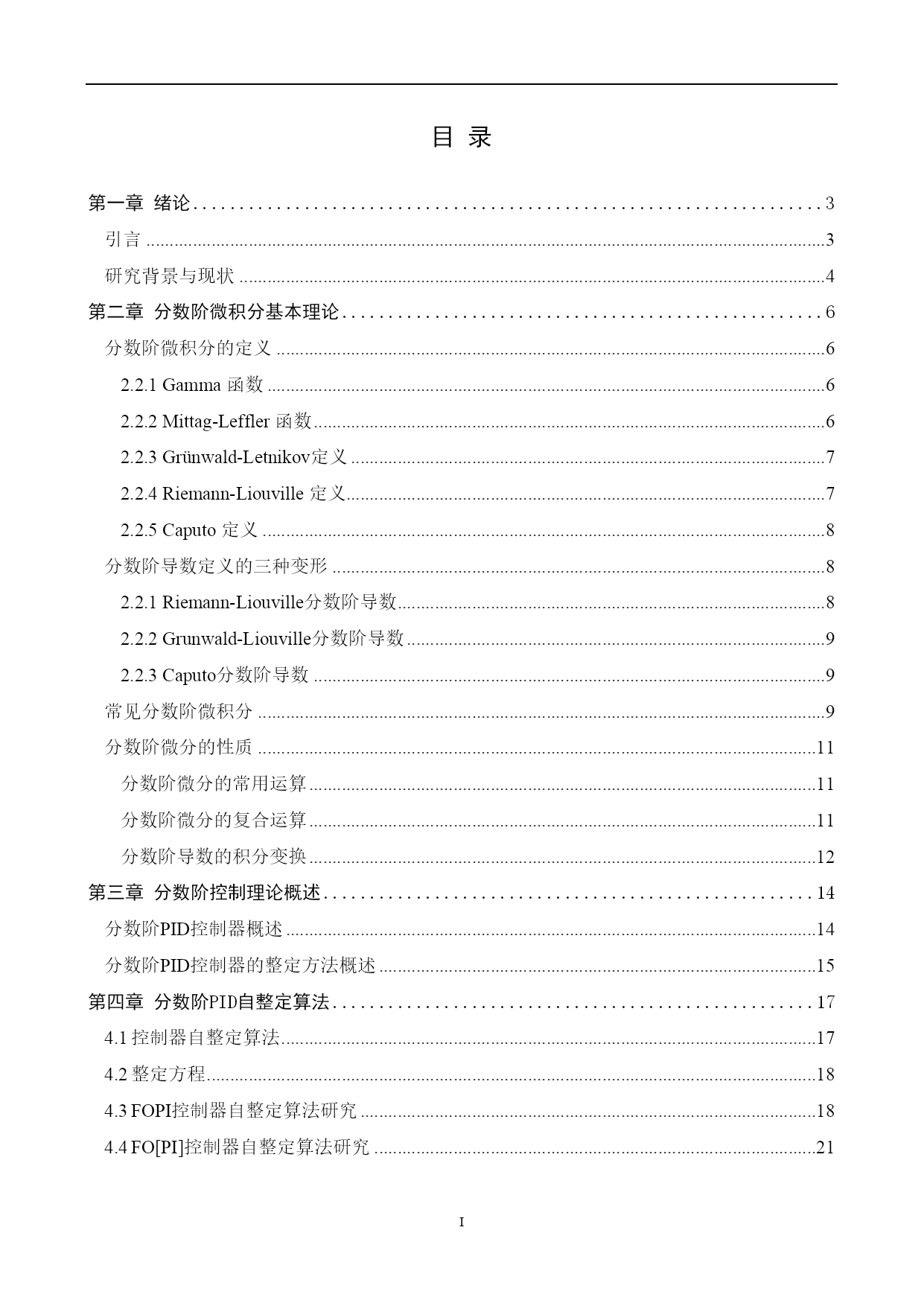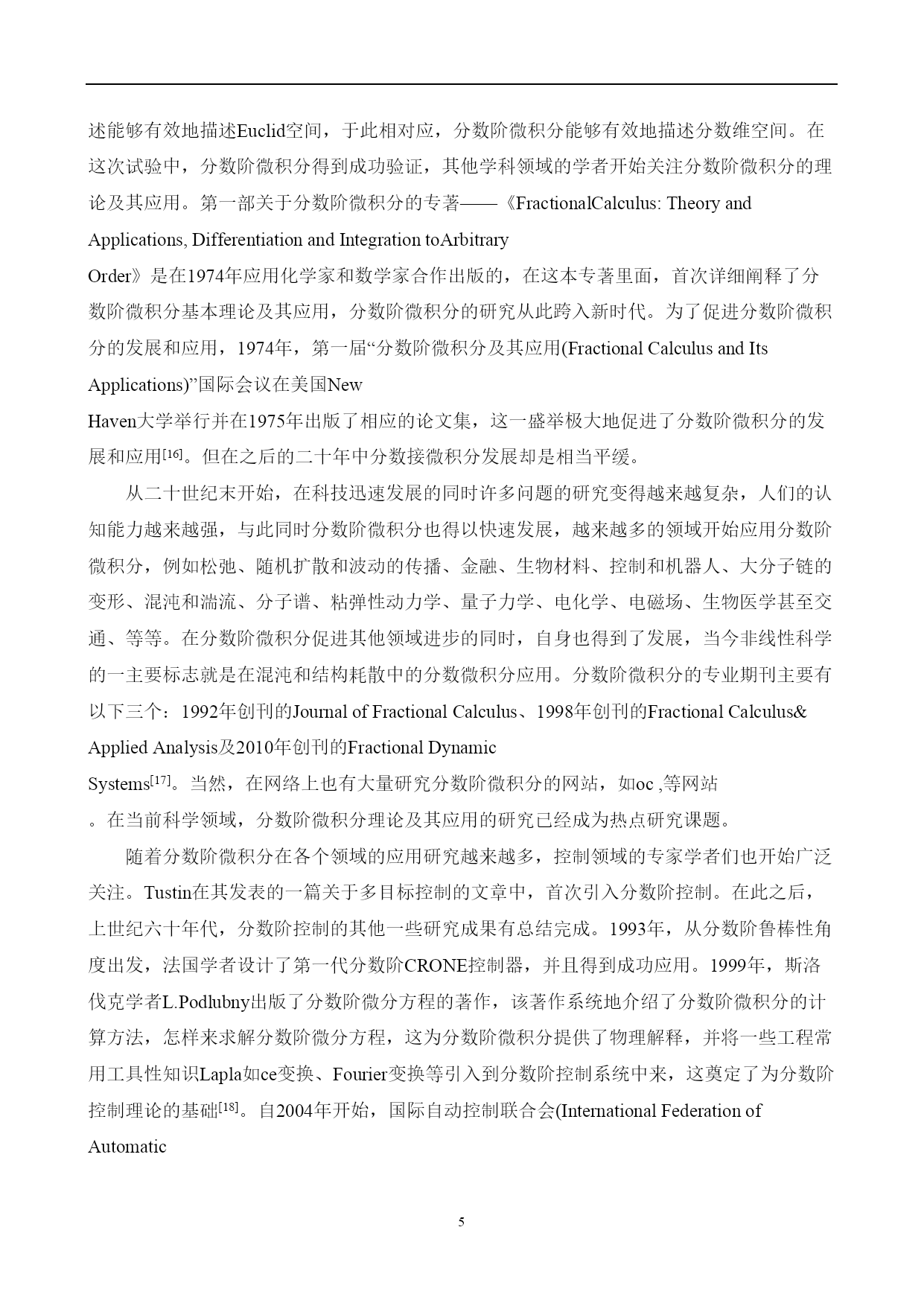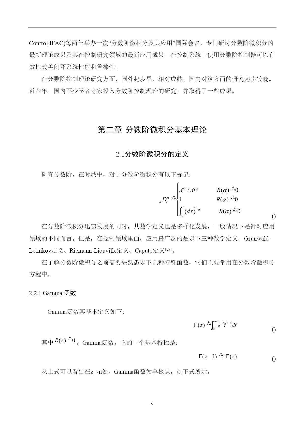 分数阶控制理论研究摘要进入21世纪以来,随着分数阶微积分理论研究不断取得突破,控制领域中的新的研究热点就是对其进行理论研究,分数阶微积分是整数阶微积分的推广,将微积分阶次从我们熟知的整数域推广到实数域,甚至复数域。其理论基础是分数阶微积分算子及方程,这是一个新的研究方向。大量的实践已经证明,在控制理论中应用分数阶微积分,相比整数阶微积分,具有更好的效果。在扩展控制理论的经典研究方法方面,在解释现有结果方面,分数阶微积分都为之提供了非常强劲的支持。论文阐述了分数阶微积分的基本理论,从其定义、导数定义以及性质进行了分析了详细说明。接下来分析了微积分控制理论在实际中的应用,针对分数阶PID进行了研究讨论,在前人研究基础上,对于分数阶PID自整定算法进行了研究分析,最后在matlab里进行仿真讨论。关键词:分数阶,分数系统,分数阶PIDAbstractSincethebeggingofthe21stcentury,thefractionalordercalculustheoryhasachievedlotsofbreakthough.Fractionalcalculusisthecalculuswhoseintegrationordifferentiationorderisnotconventionalintegernumberbutrealorevencomplexone.Itisextensitionofintegercalculus.Farctionalordercontrol,whichisestablishedontheideaoffractionalorderoperatorsandthetheoryoffractionalorderdieffrentialequations,isnowaquitenewresearchdirection.Practicehasprovedthatbetterresultscouldbeobtainedbyintroductionoffractionalcalculusincontroltheory.Fractionalcalculusprovidesapowerfulsupportfortheexpansionoftheclassicresearchmethodsincontroltheoryandabetterexplainationofthecurrentresults.ThisPaperexpoundsthebasictheoryoffractionalordercalculus,fromthedefinitionandnatureofitsdefinition,derivativeisanalyzedindetail.Thenanalyzedthecontroltheoryofcalculusintheactualapplication,inviewofthefractionalorderPIDwiththeresearchanddiscussiononthebasisofpreviousstudies,thefractionalorderPIDself-tuningalgorithmareanalyzed,andfinallyinthematlabsimulationisdiscussed.KeyWords:fractional-order,fractionalsystem,fractionalorderPIDPAGE\*MERGEFORMATII目录TOC\o"1-2"\h\z\u\t"标题3,3"HYPERLINK\l"_Toc385119023"第一章绪论PAGEREF_Toc385119023\h3HYPERLINK\l"_Toc385119024"引言PAGEREF_Toc385119024\h3HYPERLINK\l"_Toc385119025"研究背景与现状PAGEREF_Toc385119025\h4HYPERLINK\l"_Toc385119026"第二章分数阶微积分基本理论PAGEREF_Toc385119026\h6HYPERLINK\l"_Toc385119027"分数阶微积分的定义PAGEREF_Toc385119027\h6HYPERLINK\l"_Toc385119028"2.2.1Gamma函数PAGEREF_Toc385119028\h6HYPERLINK\l"_Toc385119029"2.2.2Mittag-Leffler函数PAGEREF_Toc385119029\h6HYPE