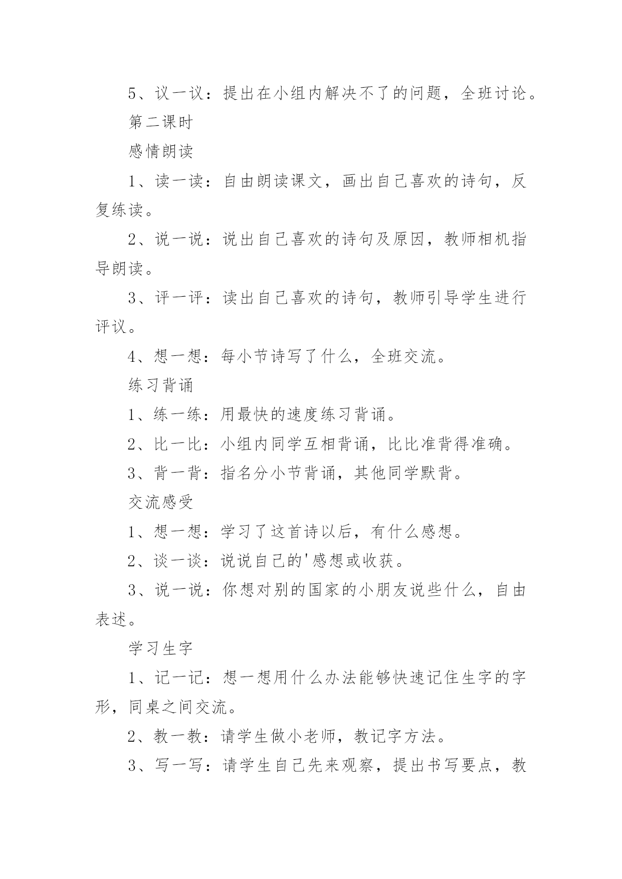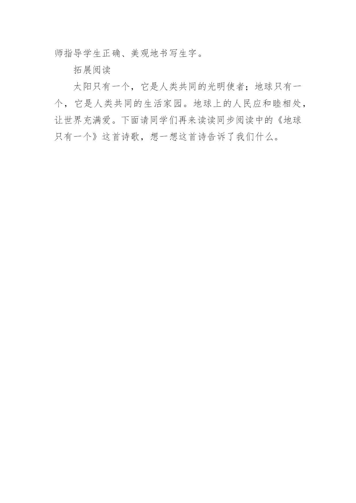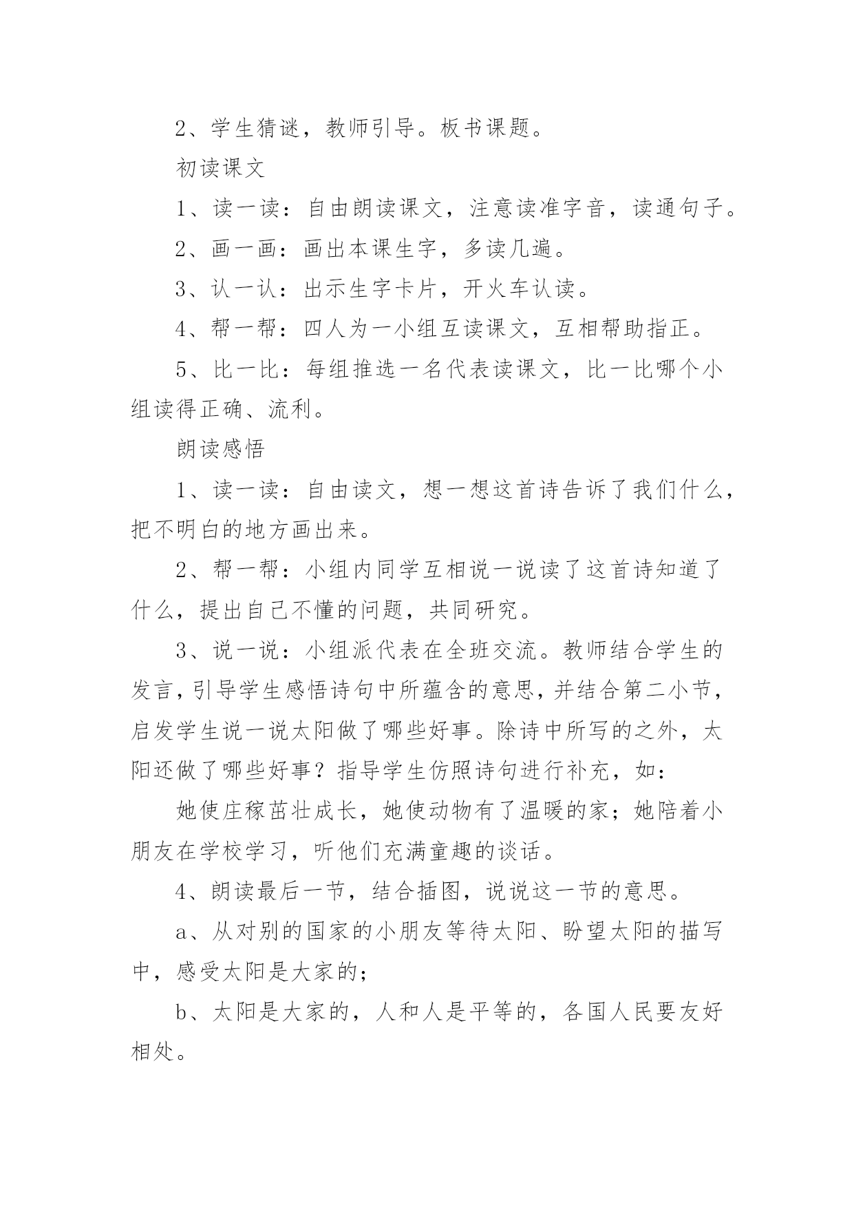 《太阳是大家的》教学设计作为一名教职工,常常要根据教学需要编写教学设计,借助教学设计可以提高教学效率和教学质量。如何把教学设计做到重点突出呢?下面是小编为大家收集的《太阳是大家的》教学设计,仅供参考,大家一起来看看吧。学习目标1、认识“彤、陪”2个生字,会写“彤、霞、陪、趁”4个生字,正确读写“红彤彤、晚霞、浪花、睡觉、睡梦”等词语。2、正确、流利、有感情地朗读课文。背诵课文。3、懂得地球是人类共同的家园,太阳是大家的,人类应友好相处。课前准备1、生字生词卡片。2、同步阅读中的诗歌《地球只有一个》。教学过程第一课时激趣导入1、教师导入:我知道同学们特别喜欢猜谜语。现在老师来说一条谜语,大家可要认真听,动脑筋猜啊!有位长寿老公公,天亮从东来出工。他把光明给世界,还把温暖洒人间。要问公公在哪里,请你仔细看画中。2、学生猜谜,教师引导。板书课题。初读课文1、读一读:自由朗读课文,注意读准字音,读通句子。2、画一画:画出本课生字,多读几遍。3、认一认:出示生字卡片,开火车认读。4、帮一帮:四人为一小组互读课文,互相帮助指正。5、比一比:每组推选一名代表读课文,比一比哪个小组读得正确、流利。朗读感悟1、读一读:自由读文,想一想这首诗告诉了我们什么,把不明白的地方画出来。2、帮一帮:小组内同学互相说一说读了这首诗知道了什么,提出自己不懂的问题,共同研究。3、说一说:小组派代表在全班交流。教师结合学生的发言,引导学生感悟诗句中所蕴含的意思,并结合第二小节,启发学生说一说太阳做了哪些好事。除诗中所写的之外,太阳还做了哪些好事?指导学生仿照诗句进行补充,如:她使庄稼茁壮成长,她使动物有了温暖的家;她陪着小朋友在学校学习,听他们充满童趣的谈话。4、朗读最后一节,结合插图,说说这一节的意思。a、从对别的国家的小朋友等待太阳、盼望太阳的描写中,感受太阳是大家的;b、太阳是大家的,人和人是平等的,各国人民要友好相处。5、议一议:提出在小组内解决不了的问题,全班讨论。第二课时感情朗读1、读一读:自由朗读课文,画出自己喜欢的诗句,反复练读。2、说一说:说出自己喜欢的诗句及原因,教师相机指导朗读。3、评一评:读出自己喜欢的诗句,教师引导学生进行评议。4、想一想:每小节诗写了什么,全班交流。练习背诵1、练一练:用最快的速度练习背诵。2、比一比:小组内同学互相背诵,比比准背得准确。3、背一背:指名分小节背诵,其他同学默背。交流感受1、想一想:学习了这首诗以后,有什么感想。2、谈一谈:说说自己的'感想或收获。3、说一说:你想对别的国家的小朋友说些什么,自由表述。学习生字1、记一记:想一想用什么办法能够快速记住生字的字形,同桌之间交流。2、教一教:请学生做小老师,教记字方法。3、写一写:请学生自己先来观察,提出书写要点,教师指导学生正确、美观地书写生字。拓展阅读太阳只有一个,它是人类共同的光明使者;地球只有一个,它是人类共同的生活家园。地球上的人民应和睦相处,让世界充满爱。下面请同学们再来读读同步阅读中的《地球只有一个》这首诗歌,想一想这首诗告诉了我们什么。