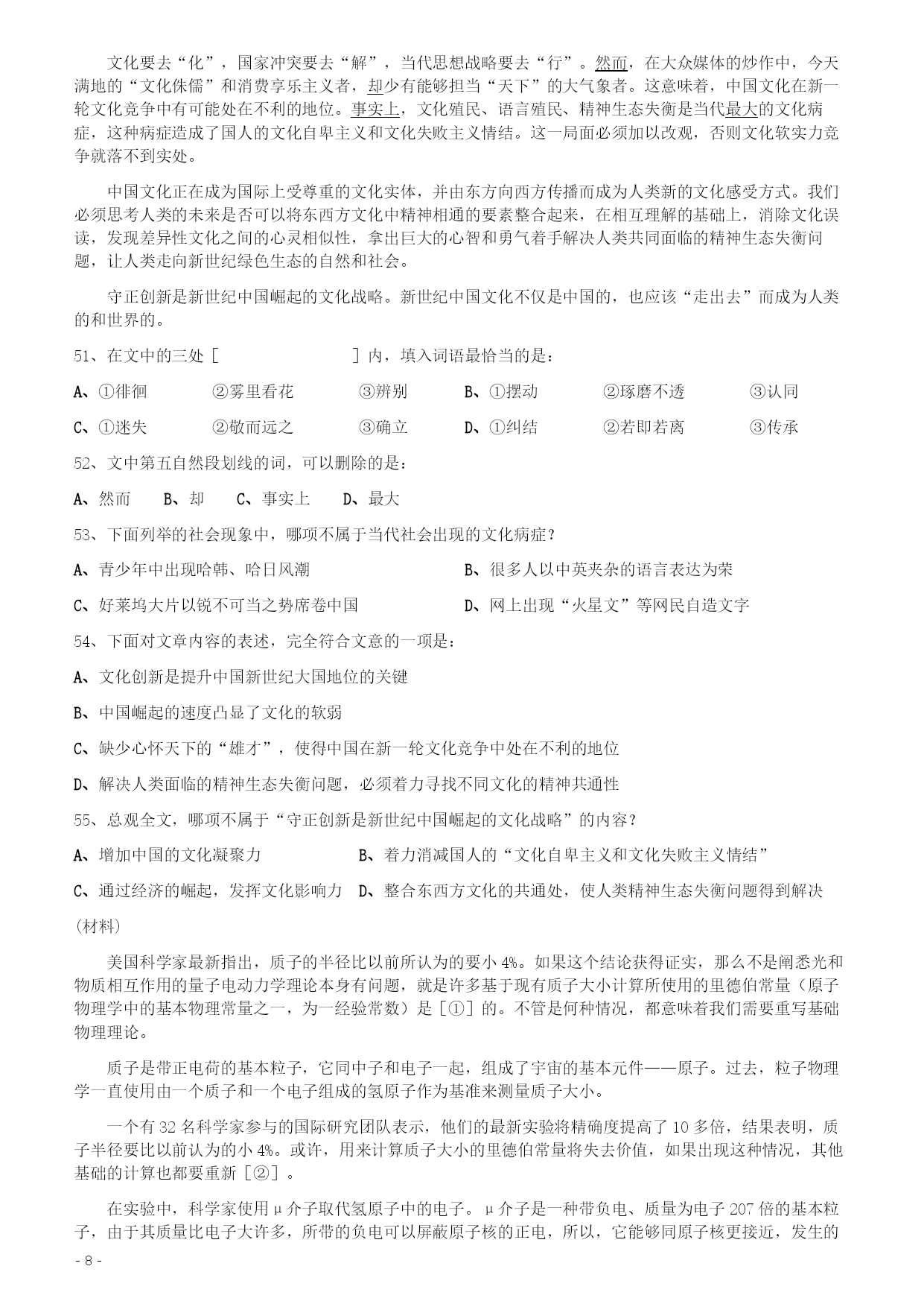 PAGE\*MERGEFORMAT-20-2010年北京公务员考试《行测》真题第一部分常识判断1、2009年12月5日至7日,中央经济工作会议在北京举行,会议提出2010年要实行()的财政政策和()的货币政策。A、积极适度宽松B、稳健适度从紧C、积极适度从紧D、稳健适度宽松2、2009年12月联合国气候变化大会在丹麦召开,会议在经历了曲折后,()以大会决定的形式发表。A、《京都议定书》B、《联合国气候变化框架公约》C、《哥本哈根协议》D、《巴厘岛路线图》3、2016年第31届夏季奥林匹克运动会在()举行。A、芝加哥B、东京C、马德里D、里约热内卢4、世界地球日是每年的:A、4月22日B、12月1日C、3月12日D、5月1日5、马克思指出,扩大再生产过程中的追加资本,“它一开始就没有一个价值原子不是由别人的无酬劳动产生的。”这句话表明:A、追加资本来源于资本家的劳动积累B、资本积累是扩大再生产的重要源泉C、资本积累是资本家节欲的结果D、剩余价值是资本积累的唯一源泉6、中国的佛教由印度传来,并在中国扎下根,兴盛了一千多年。可见:A、中国的佛教与印度是完全相同的B、印度的佛教一定比中国的兴盛C、中印的佛教有相似之处,但中国佛教已经融入了中国文化社会,与印度佛教不同了D、中印是一家人7、有一篇文章这样写道:“在元代,有这样脍炙人口的名句:‘落霞与孤鹜齐飞,秋水共长天一色。’”有个人看了这段话立即说“错了”,他的根据是:A、这两句诗是唐代而不是元代的B、这个人知识匮乏,不明所以C、这个人没听过这两句诗,所以并不能算名句D、诗的顺序不对8、地球自西向东自转,故从南极大陆中心向边缘地带吹的风:A、自南向北运行B、自北向南运行C、成顺时针方向D、成逆时针方向9、发现行星运行规律的天文学家是:A、哥白尼B、伽利略C、开普勒D、张衡10、关于地中海气候的叙述正确的是:A、受副极地低气压带与西风带交替影响B、夏季高温多雨,冬季温和少雨C、分布在大陆西岸南北纬30-40度之间D、典型植被为亚热带常绿阔叶林11、法律关系是由()保证的社会关系。A、国家法律B、国家权力C、国家强制力D、国家司法机关12、对农村社区特征表述不正确的是:A、人际关系以血缘为基础B、人口的同质性强,社区整合程度高C、与城市社区相比,人们的社区意识较差D、以传统道德和礼俗为社会控制的手段13、下列选项中,不属于全国人民代表大会职能范围的是:A、审查和批准国家的预算报告B、领导和管理经济工作和城乡建设C、选举最高人民法院院长D、监督宪法的实施14、通过百度对“金融危机预测”进行搜索,可以获得400多万条相关内容,也许正是因为金融危机现象复杂、变幻莫测,才吸引更多的人对其发展趋势进行研究。从哲学上看,这一项研究的最终目的在于:A、正确认识经济运行规律可以促使各国经济走向复苏B、通过复杂多变的经济现象把握经济运行的内在规律C、对金融危机的正确认识是世界经济由衰退转向复苏的动力D、通过不同的研究成果进一步感受此次金融危机的严峻性和复杂性15、政府理财的主导和基本环节是:A、信贷计划B、年度投资计划C、国民经济发展计划D、政府预算16、当经济过热,存在通货膨胀时,政府为实现控制总需求,抑制通货膨胀的目的可以采取的措施是:A、增加财政补贴B、增加财政支出C、减少税收D、减少财政支出17、19世纪中期,列强侵略激化了中国的社会矛盾,一场轰轰烈烈的农民运动在中国南方兴起。这场运动是:A、太平天国运动B、洋务运动C、维新变法运动D、义和团运动18、下列叙述正确的一项是:A、人类目前开发利用的太空资源主要是太阳能资源B、太空中对卫星最大的威胁来自太阳色球爆发C、人类对宇宙空间的探索已逐步进入到空间开发利用阶段D、太空垃圾主要是指卫星和终止寿命的航天器19、下列各项中,地表以肥沃的黑土著称的是:A、长江中下游平原B、珠江三角州C、东北平原D、华北平原20、京剧是我国的国粹,至今已有近二百年的历史,它主要是由:A、南方一些剧种传入北京后融合而成的B、北京地方剧种演化而成的C、流行于北方的剧种融合而成的D、元杂剧发展而来的21、下列关于全球气候变暖及其影响的叙述,符合实际情况的是:A、全球各地的气温持续上升B、我国各地的降水量普遍增多C、全球各地的河湖水位上升D、我国西部山地冰雪总量减少22、国家行政机关用来公布有关人民群众需要知道或必须遵守的事项的公文称为:A、公告B、布告C、通告D、广告23、(多选题)在下行文中提出执行要求时,要使受文者不折不扣地执行文件,应写做:A、参照执行B、遵照执行C、参酌执行D、按照执行24、检查煤气是否泄