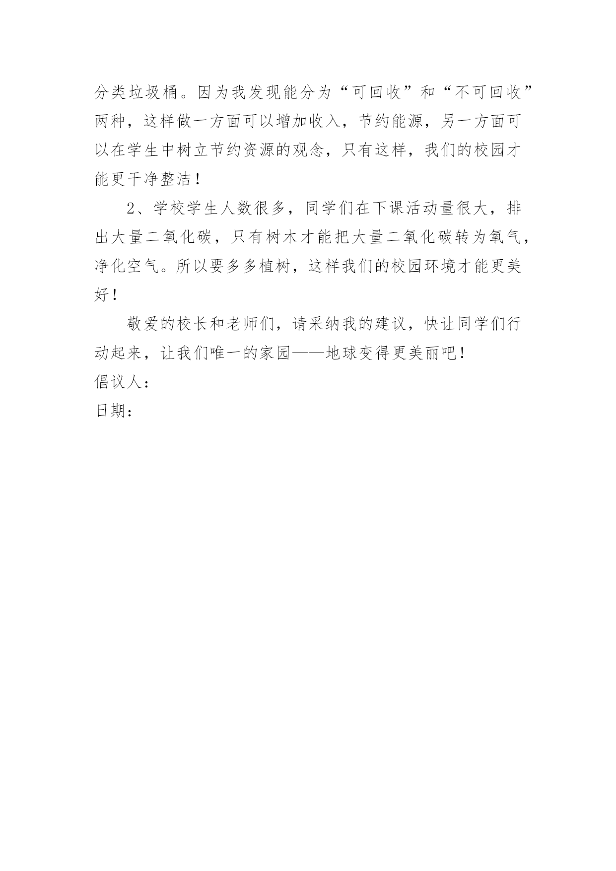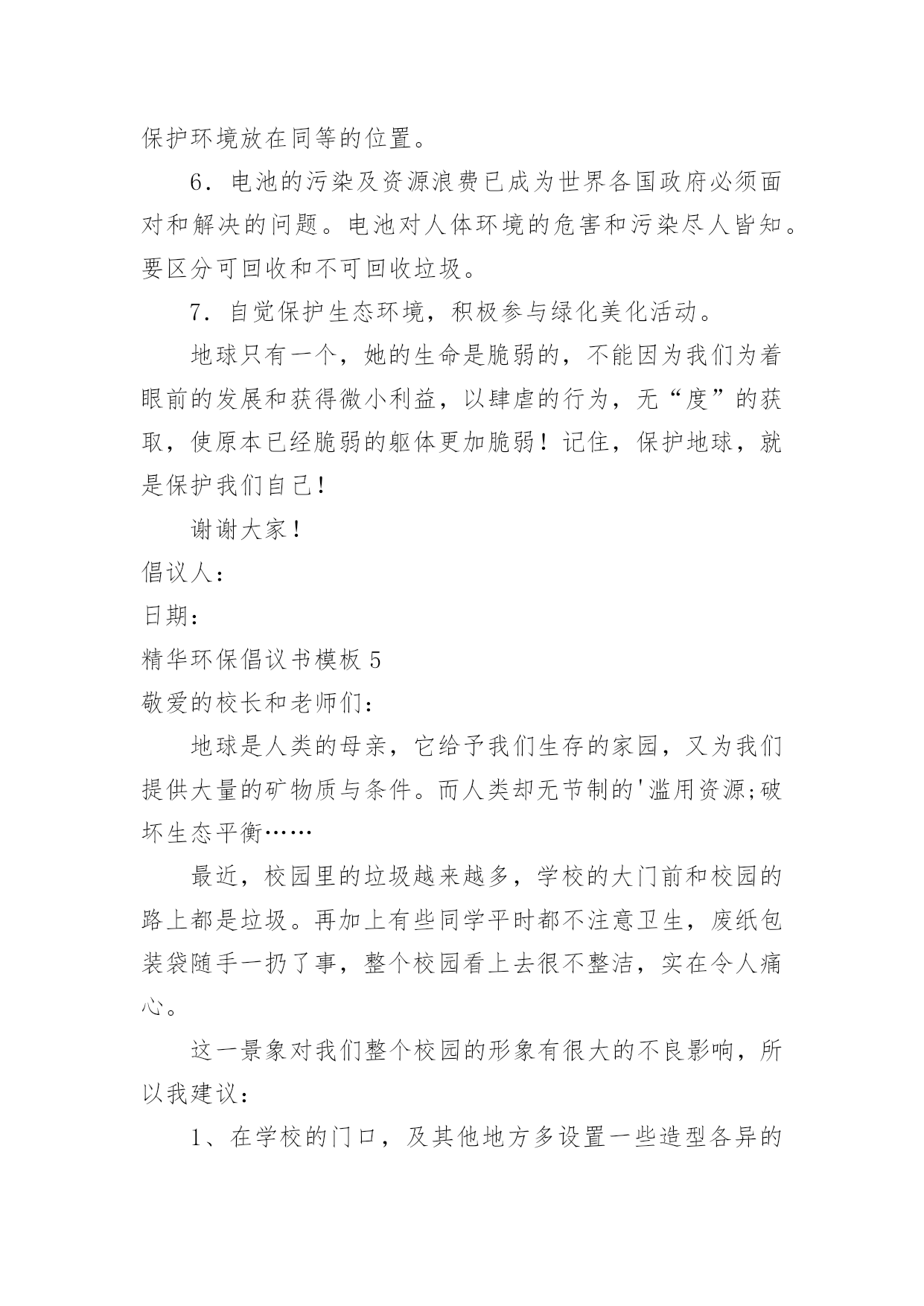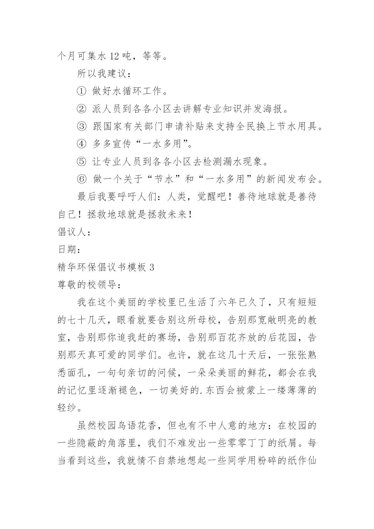 环保倡议书精华环保倡议书模板随着社会一步步向前发展,倡议书的使用频率越来越高,倡议书具有响应者不确定性的特征。在写之前,可以先参考范文,下面是小编帮大家整理的精华环保倡议书模板,欢迎阅读与收藏。精华环保倡议书模板1亲爱的同学们:你们好!环境是人类及自然界所有生物赖以生存的基础。爱护地球、保护环境,节约资源是我们义不容辞的责任。在新的一学期我们将开展以“节约一滴水、一张纸、一粒米、一度电”为主要内容的“节约资源保护环境做地球小主人”活动,在此我们大队委员会向全体队员发出倡议:一、节约水资源,随手关上水龙头,发现滴漏,及时报修,打扫卫生时用桶接水,做到一水多用。二、节约用电,随手关闭不需要使用的`电灯。三、节约粮食,不挑食,不剩饭菜,与父母外出吃饭时,饭菜点的适量,如有剩余,打包带回家。四、珍惜纸张,保护森林,节约使用练习本,用过一面的纸可装订成草稿本,将过期的挂历纸包书皮,不送精美的贺卡,积极宣传使用再生纸。五、做到垃圾分类投放,提倡绿色生活,绿色消费。六、做环保的宣传者。认真学习环保知识,积极参加环保实践活动。向我们的家人、邻居和朋友宣传环保的重要性和环保常识。七、做环保的执行者。从我做起,从现在做起,从身边做起,从点滴小事做起。积极、认真搞好校园以及居住社区、公共场所的绿化、美化、净化,清除工作,控制日常生活中产生的污染。八、做环保的小卫士。我们不但要宣传环保,在以身作则,保护环境的基础上,我们还要对周围的环境进行监督,坚决制止破坏环境的坏人坏事。亲爱的小伙伴们,让我们一起行动起来,尽自己的一分力量,从小养成节约资源、保护环境的意识和良好的行为习惯,充分发挥我们少先队员“小宣传员”、“小监督员”的作用,广泛带动家庭、社会加入到我们的环保行动中。“地球只有一个”,让我们共同保护我们的家园吧!倡议人:日期:精华环保倡议书模板2尊敬的市领导:你们好!在我还是一年级的时候,我们的校园到处都是节约的榜样,这让我们的校园更加的鸟语花香、生机勃勃。可今昔不同往日,这几年深圳飞速发展,现在我们的校园随处可见“白色垃圾”,浪费水资源的现象等等。据资料显示,我国每天制造”出的垃圾达几十亿吨,甚至更多。然而,人类处理它们的办法,只是埋到土里去。人们啊!你们可知道,这是在为地球的毁灭的时间缩短呀!据资料显示全中国每一天要流失60亿立方米的水,全世界每天要流失800亿立方米的水。据资料显示,一个关不紧的水龙头一个月流掉1至6立方米水,一个漏水的.马桶一个月流掉3至25立方米的水。家庭用水浪费种种,让人心痛!专家说,如果全国的城市家庭都把坐便器或淋浴器换成节水产品,每月就可望节水4.9亿吨。面对频频告急的全国用水形势,每个家庭的节水行动对建设节约型社会来说,都是不可或缺的。据统计,洗衣用水占到全部家庭用水的1/3。一般普通洗衣机洗一次衣服用水多在150—180升之间。目前我国城市洗衣机社会保有量约1.2亿台,以每周3次使用频率粗略估算,全部洗衣机每年耗水量至少30亿立方米。如把这些洗衣机全都换成节水洗衣机,一年大约能节出714个昆明湖或93个怀柔水库。北京节水管理中心的资料显示,家庭因为水龙头没关紧而“跑冒滴漏”造成的浪费是惊人的。据测定,“滴水”在一个小时里就可以集到3.6公斤水,一个月里可集到2.6吨水。如果是连续成线的小水流,每小时可集水17公斤,每个月可集水12吨,等等。所以我建议:①做好水循环工作。②派人员到各各小区去讲解专业知识并发海报。③跟国家有关部门申请补贴来支持全民换上节水用具。④多多宣传“一水多用”。⑤让专业人员到各各小区去检测漏水现象。⑥做一个关于“节水”和“一水多用”的新闻发布会。最后我要呼吁人们:人类,觉醒吧!善待地球就是善待自己!拯救地球就是拯救未来!倡议人:日期:精华环保倡议书模板3尊敬的校领导:我在这个美丽的学校里已生活了六年已久了,只有短短的七十几天,眼看就要告别这所母校,告别那宽敞明亮的教室,告别那你追我赶的赛场,告别那百花齐放的后花园,告别那天真可爱的同学们。也许,就在这几十天后,一张张熟悉面孔,一句句亲切的问候,一朵朵美丽的鲜花,都会在我的记忆里逐渐褪色,一切美好的.东西会被蒙上一缕薄薄的轻纱。虽然校园鸟语花香,但也有不中人意的地方:在校园的一些隐蔽的角落里,我们不难发出一些零零丁丁的纸屑。每当看到这些,我就情不自禁地想起一些同学用粉碎的纸作仙女散花的情景除此之外,校园里还有许多浪费现象,有一些同学写错了字竟不用橡皮而是把整张纸撕下来,揉成一团扔掉了当修理工人在厕所里捞到一些垃圾、红领巾、包装纸的时候,同学们竟若无其事地欢笑着。随意浪费,不讲文明这些难道是对学校的一份贡献吗?对此,我为了学校这朵美丽鲜花开放得更鲜艳,更夺目,而向各校领导们提出以下建议:1、校园里由领导们在广播里颂发十大杰出环保卫士,加以表扬、