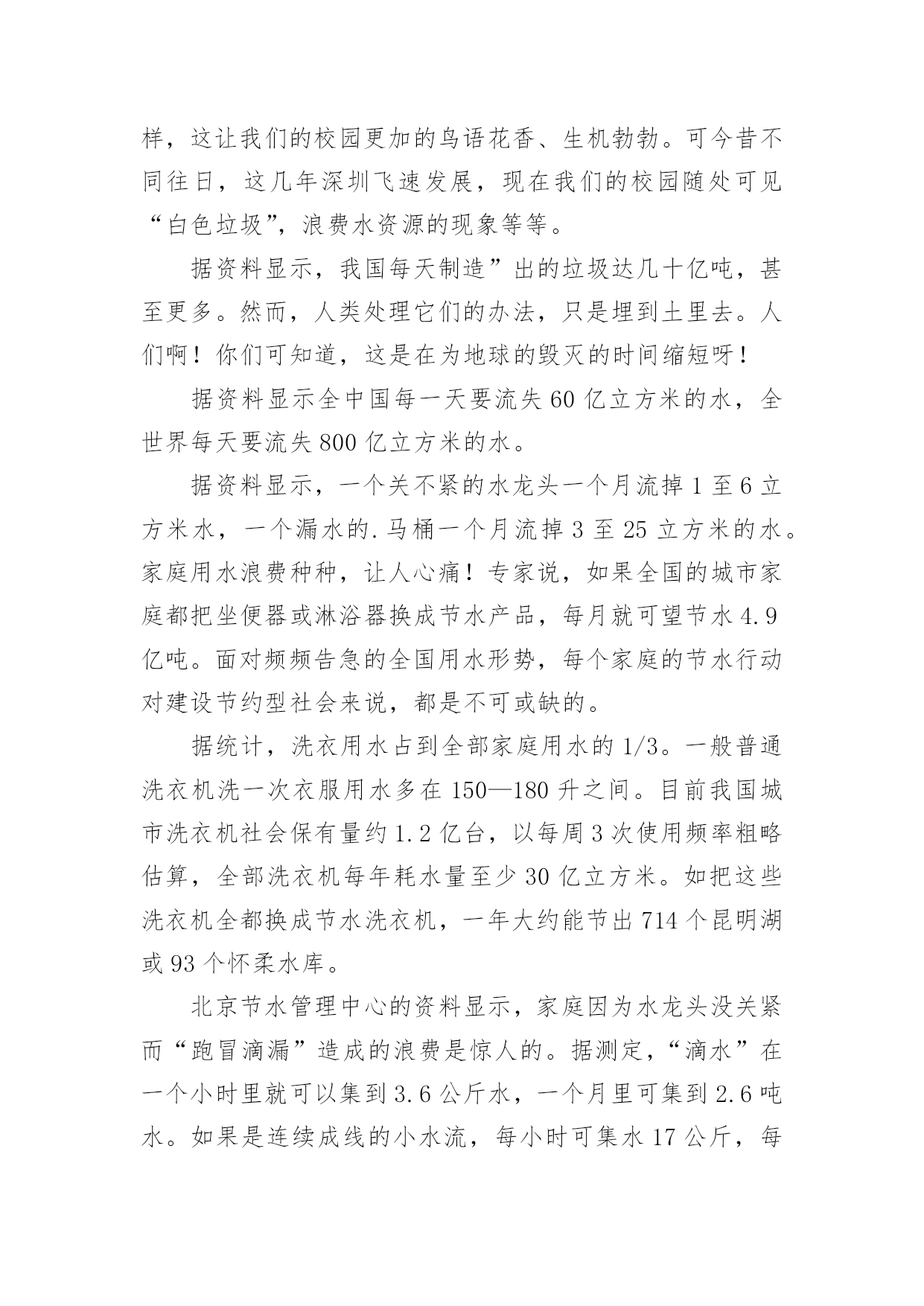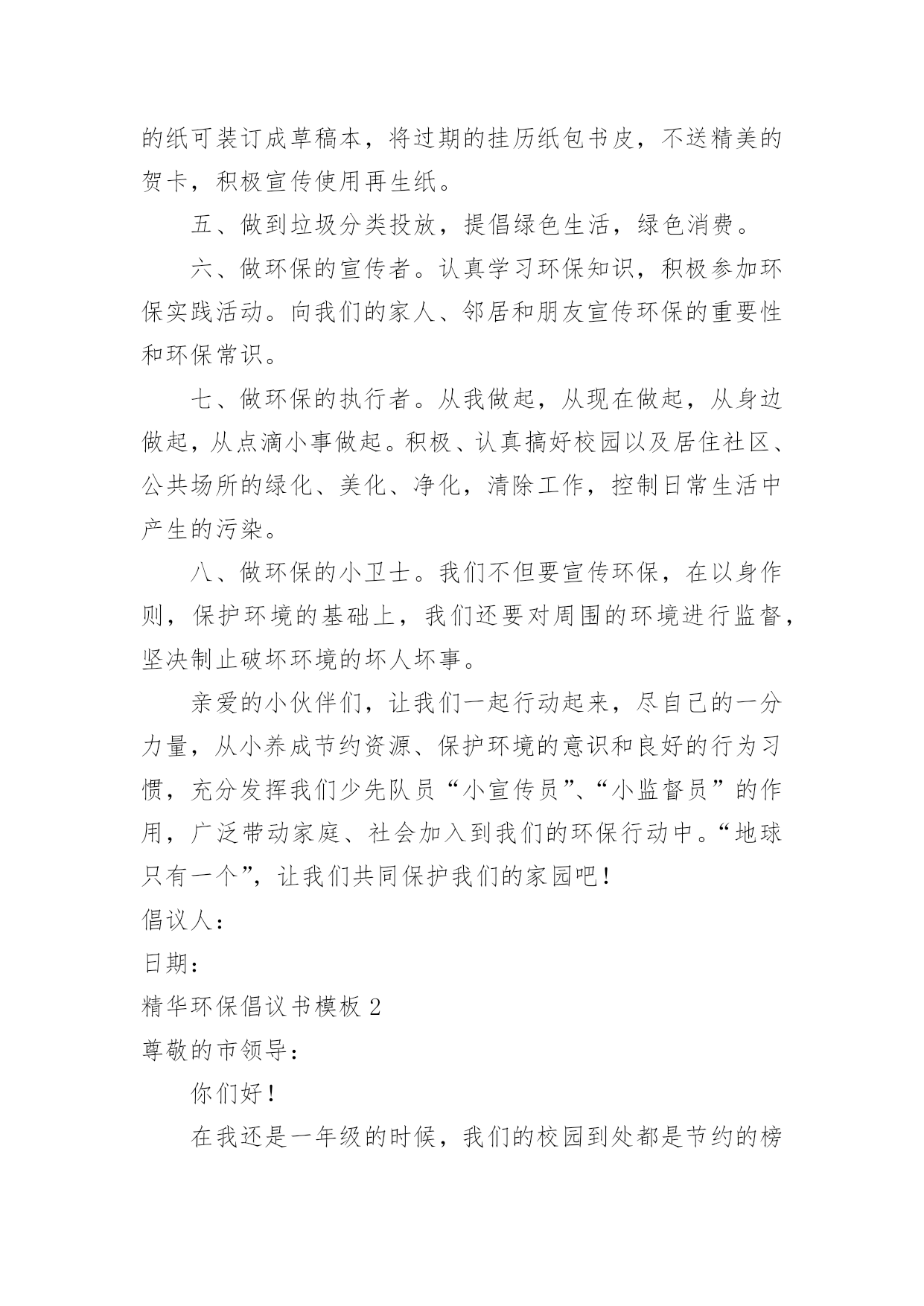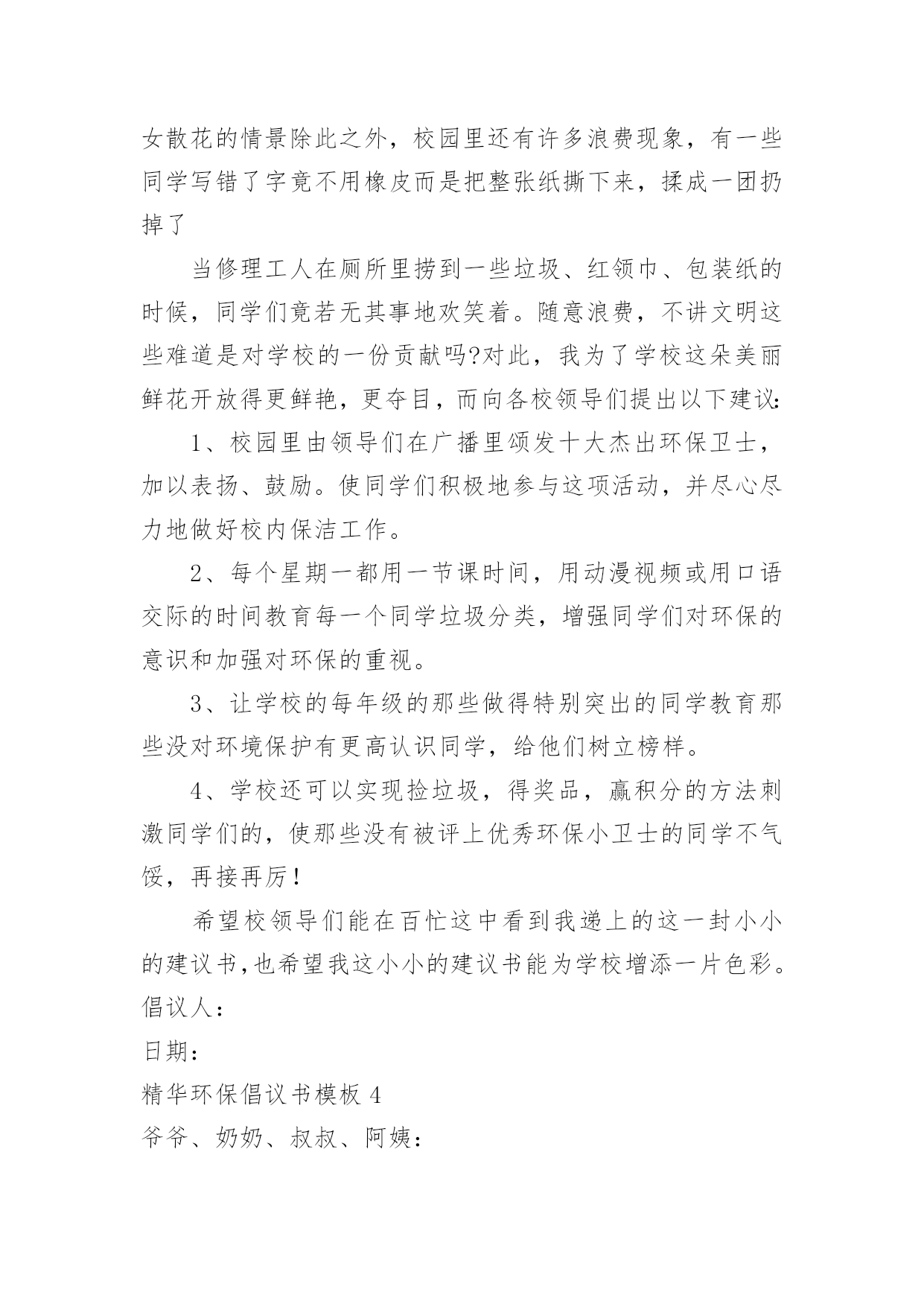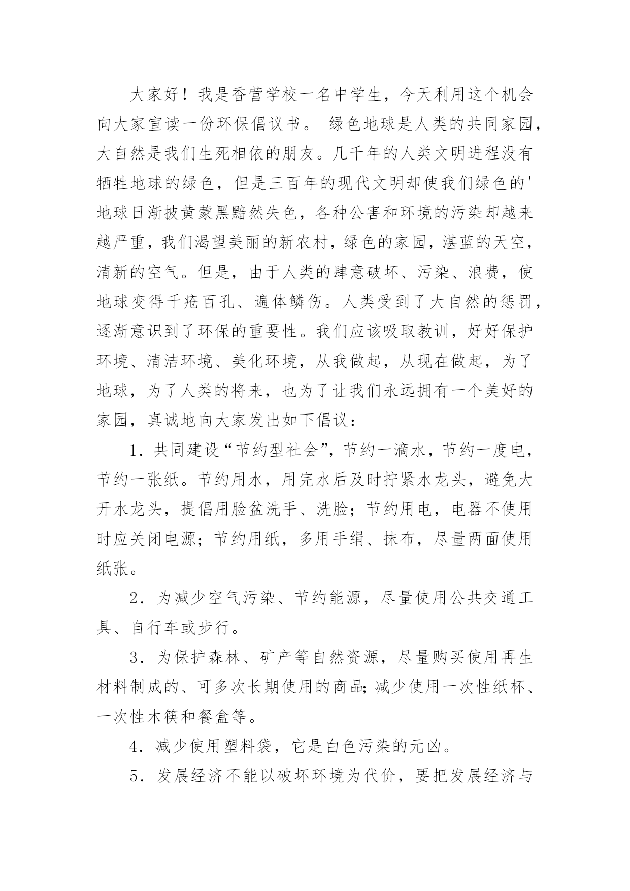 环保倡议书精华环保倡议书模板随着社会一步步向前发展,倡议书的使用频率越来越高,倡议书具有响应者不确定性的特征。在写之前,可以先参考范文,下面是小编帮大家整理的精华环保倡议书模板,欢迎阅读与收藏。精华环保倡议书模板1亲爱的同学们:你们好!环境是人类及自然界所有生物赖以生存的基础。爱护地球、保护环境,节约资源是我们义不容辞的责任。在新的一学期我们将开展以“节约一滴水、一张纸、一粒米、一度电”为主要内容的“节约资源保护环境做地球小主人”活动,在此我们大队委员会向全体队员发出倡议:一、节约水资源,随手关上水龙头,发现滴漏,及时报修,打扫卫生时用桶接水,做到一水多用。二、节约用电,随手关闭不需要使用的`电灯。三、节约粮食,不挑食,不剩饭菜,与父母外出吃饭时,饭菜点的适量,如有剩余,打包带回家。四、珍惜纸张,保护森林,节约使用练习本,用过一面的纸可装订成草稿本,将过期的挂历纸包书皮,不送精美的贺卡,积极宣传使用再生纸。五、做到垃圾分类投放,提倡绿色生活,绿色消费。六、做环保的宣传者。认真学习环保知识,积极参加环保实践活动。向我们的家人、邻居和朋友宣传环保的重要性和环保常识。七、做环保的执行者。从我做起,从现在做起,从身边做起,从点滴小事做起。积极、认真搞好校园以及居住社区、公共场所的绿化、美化、净化,清除工作,控制日常生活中产生的污染。八、做环保的小卫士。我们不但要宣传环保,在以身作则,保护环境的基础上,我们还要对周围的环境进行监督,坚决制止破坏环境的坏人坏事。亲爱的小伙伴们,让我们一起行动起来,尽自己的一分力量,从小养成节约资源、保护环境的意识和良好的行为习惯,充分发挥我们少先队员“小宣传员”、“小监督员”的作用,广泛带动家庭、社会加入到我们的环保行动中。“地球只有一个”,让我们共同保护我们的家园吧!倡议人:日期:精华环保倡议书模板2尊敬的市领导:你们好!在我还是一年级的时候,我们的校园到处都是节约的榜样,这让我们的校园更加的鸟语花香、生机勃勃。可今昔不同往日,这几年深圳飞速发展,现在我们的校园随处可见“白色垃圾”,浪费水资源的现象等等。据资料显示,我国每天制造”出的垃圾达几十亿吨,甚至更多。然而,人类处理它们的办法,只是埋到土里去。人们啊!你们可知道,这是在为地球的毁灭的时间缩短呀!据资料显示全中国每一天要流失60亿立方米的水,全世界每天要流失800亿立方米的水。据资料显示,一个关不紧的水龙头一个月流掉1至6立方米水,一个漏水的.马桶一个月流掉3至25立方米的水。家庭用水浪费种种,让人心痛!专家说,如果全国的城市家庭都把坐便器或淋浴器换成节水产品,每月就可望节水4.9亿吨。面对频频告急的全国用水形势,每个家庭的节水行动对建设节约型社会来说,都是不可或缺的。据统计,洗衣用水占到全部家庭用水的1/3。一般普通洗衣机洗一次衣服用水多在150—180升之间。目前我国城市洗衣机社会保有量约1.2亿台,以每周3次使用频率粗略估算,全部洗衣机每年耗水量至少30亿立方米。如把这些洗衣机全都换成节水洗衣机,一年大约能节出714个昆明湖或93个怀柔水库。北京节水管理中心的资料显示,家庭因为水龙头没关紧而“跑冒滴漏”造成的浪费是惊人的。据测定,“滴水”在一个小时里就可以集到3.6公斤水,一个月里可集到2.6吨水。如果是连续成线的小水流,每小时可集水17公斤,每个月可集水12吨,等等。所以我建议:①做好水循环工作。②派人员到各各小区去讲解专业知识并发海报。③跟国家有关部门申请补贴来支持全民换上节水用具。④多多宣传“一水多用”。⑤让专业人员到各各小区去检测漏水现象。⑥做一个关于“节水”和“一水多用”的新闻发布会。最后我要呼吁人们:人类,觉醒吧!善待地球就是善待自己!拯救地球就是拯救未来!倡议人:日期:精华环保倡议书模板3尊敬的校领导:我在这个美丽的学校里已生活了六年已久了,只有短短的七十几天,眼看就要告别这所母校,告别那宽敞明亮的教室,告别那你追我赶的赛场,告别那百花齐放的后花园,告别那天真可爱的同学们。也许,就在这几十天后,一张张熟悉面孔,一句句亲切的问候,一朵朵美丽的鲜花,都会在我的记忆里逐渐褪色,一切美好的.东西会被蒙上一缕薄薄的轻纱。虽然校园鸟语花香,但也有不中人意的地方:在校园的一些隐蔽的角落里,我们不难发出一些零零丁丁的纸屑。每当看到这些,我就情不自禁地想起一些同学用粉碎的纸作仙女散花的情景除此之外,校园里还有许多浪费现象,有一些同学写错了字竟不用橡皮而是把整张纸撕下来,揉成一团扔掉了当修理工人在厕所里捞到一些垃圾、红领巾、包装纸的时候,同学们竟若无其事地欢笑着。随意浪费,不讲文明这些难道是对学校的一份贡献吗?对此,我为了学校这朵美丽鲜花开放得更鲜艳,更夺目,而向各校领导们提出以下建议:1、校园里由领导们在广播里颂发十大杰出环保卫士,加以表扬、