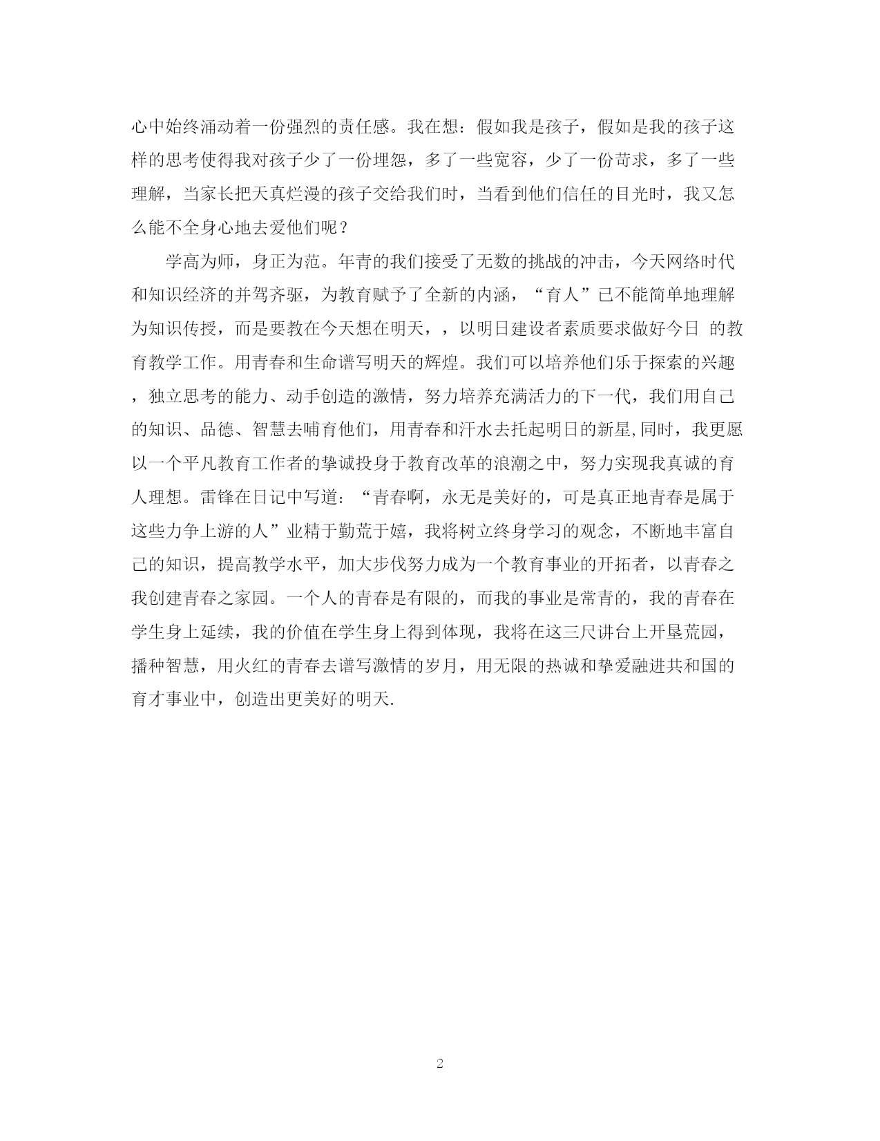 此资料由网络收集而来,如有侵权请告知上传者立即删除。资料共分享,我们负责传递知识。PAGEPAGE2青春畅想曲演讲稿—幼儿教育演讲稿人们用无数美好的词句来形容美丽的青春。的确,青春充满了理想与信念;充满了激情与希望。我常常在想,美丽的青春到底是什么?当我面对一群群活泼可爱的孩子,我恍然大悟,原来青春是一种责任。青春更是一种幸福,这种幸福便是我和孩子们在一起的快乐,它让我深刻地感受到了青春的激情会在孩子们中间迸发、激荡、升华。八年的幼儿教育生涯,使我深深的懂得,教育是爱的事业,教师的爱是博大的爱,她高于母爱、大于友爱、胜于情爱,师爱是严与爱的结合是理智而科学的爱,是积极主动的爱,这种爱是教育的桥梁,是教育的推动力,是后进生转变的催化剂,这种爱包涵了崇高的使命与责任,一位哲人曾经说过:“教师的爱是打开学生心灵大门的钥匙,教师的爱是用深情溶化学生心灵上久积而成的坚冰”,自从踏上这个工作岗位的那天起,我一直坚持努力以我全部的热情和爱心去滋润每一个孩子的心灵,铭刻在我心的是我的责任、我是老师,我要给这些寻梦孩子引路,在我所带的班级里,有这样一个孩子,她的名字叫曹彦,曹彦可爱幼稚,可是由于发育迟缓,长的几乎比同龄的孩子矮了一半,她性格内向,生活自理能力差,幼小的她多了几腼腆,少了几分活泼和开朗,她常常怯生生地躲到角落里看着别的孩子开心地游戏,那稚嫩的眼神里常常有让我心痛的自卑,深深地怜惜之余,我给了她更多的关怀,每当她害怕现表现自己的时候,我都用信任的眼光和激励的话语去鼓励她:“曹彦,你能行的,为什么不试试?”同时我给她找了很多好朋友去关心她,帮助她,有时她会把大小便拉在身上,给她换洗时阵阵难闻的气味让人反胃,对此我并没有太多的斥责,而是默默地给她换上干净的衣裤,把她轻轻拉在怀里嘱附她下一次一定要当心,很多时候都用眼神默默地和她交流,给她爱抚和帮助,给她信任和鼓励,曹彦在我的帮助下逐渐坚强起来,她稚嫩的脸上浮上了更多的笑容和欢乐。看着她和其他孩子快乐的在一起生活,看着她跳跃的动作我的心中就有说不出的欣慰。我用一片至真至诚的爱心去拥抱了每一个孩子,虽然有时也会因孩子的调皮而埋怨,有时也会感到很烦很累,但我的心中始终涌动着一份强烈的责任感。我在想:假如我是孩子,假如是我的孩子这样的思考使得我对孩子少了一份埋怨,多了一些宽容,少了一份苛求,多了一些理解,当家长把天真烂漫的孩子交给我们时,当看到他们信任的目光时,我又怎么能不全身心地去爱他们呢?学高为师,身正为范。年青的我们接受了无数的挑战的冲击,今天网络时代和知识经济的并驾齐驱,为教育赋予了全新的内涵,“育人”已不能简单地理解为知识传授,而是要教在今天想在明天,,以明日建设者素质要求做好今日的教育教学工作。用青春和生命谱写明天的辉煌。我们可以培养他们乐于探索的兴趣,独立思考的能力、动手创造的激情,努力培养充满活力的下一代,我们用自己的知识、品德、智慧去哺育他们,用青春和汗水去托起明日的新星,同时,我更愿以一个平凡教育工作者的挚诚投身于教育改革的浪潮之中,努力实现我真诚的育人理想。雷锋在日记中写道:“青春啊,永无是美好的,可是真正地青春是属于这些力争上游的人”业精于勤荒于嬉,我将树立终身学习的观念,不断地丰富自己的知识,提高教学水平,加大步伐努力成为一个教育事业的开拓者,以青春之我创建青春之家园。一个人的青春是有限的,而我的事业是常青的,我的青春在学生身上延续,我的价值在学生身上得到体现,我将在这三尺讲台上开垦荒园,播种智慧,用火红的青春去谱写激情的岁月,用无限的热诚和挚爱融进共和国的育才事业中,创造出更美好的明天.