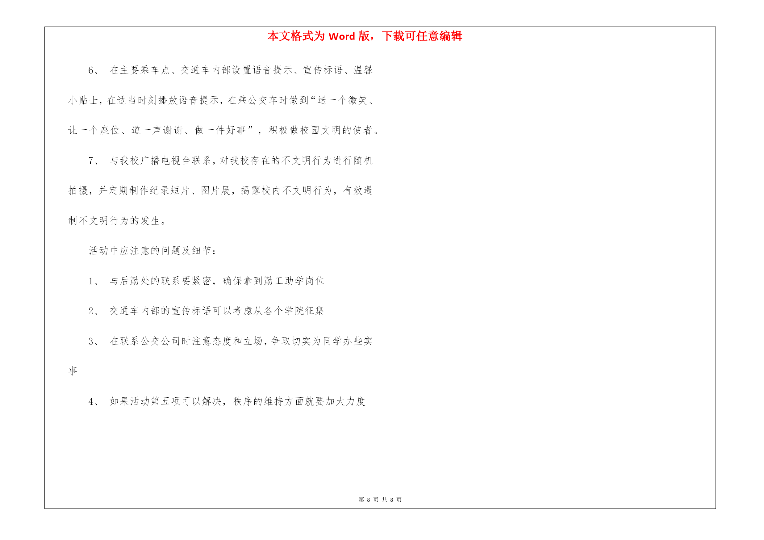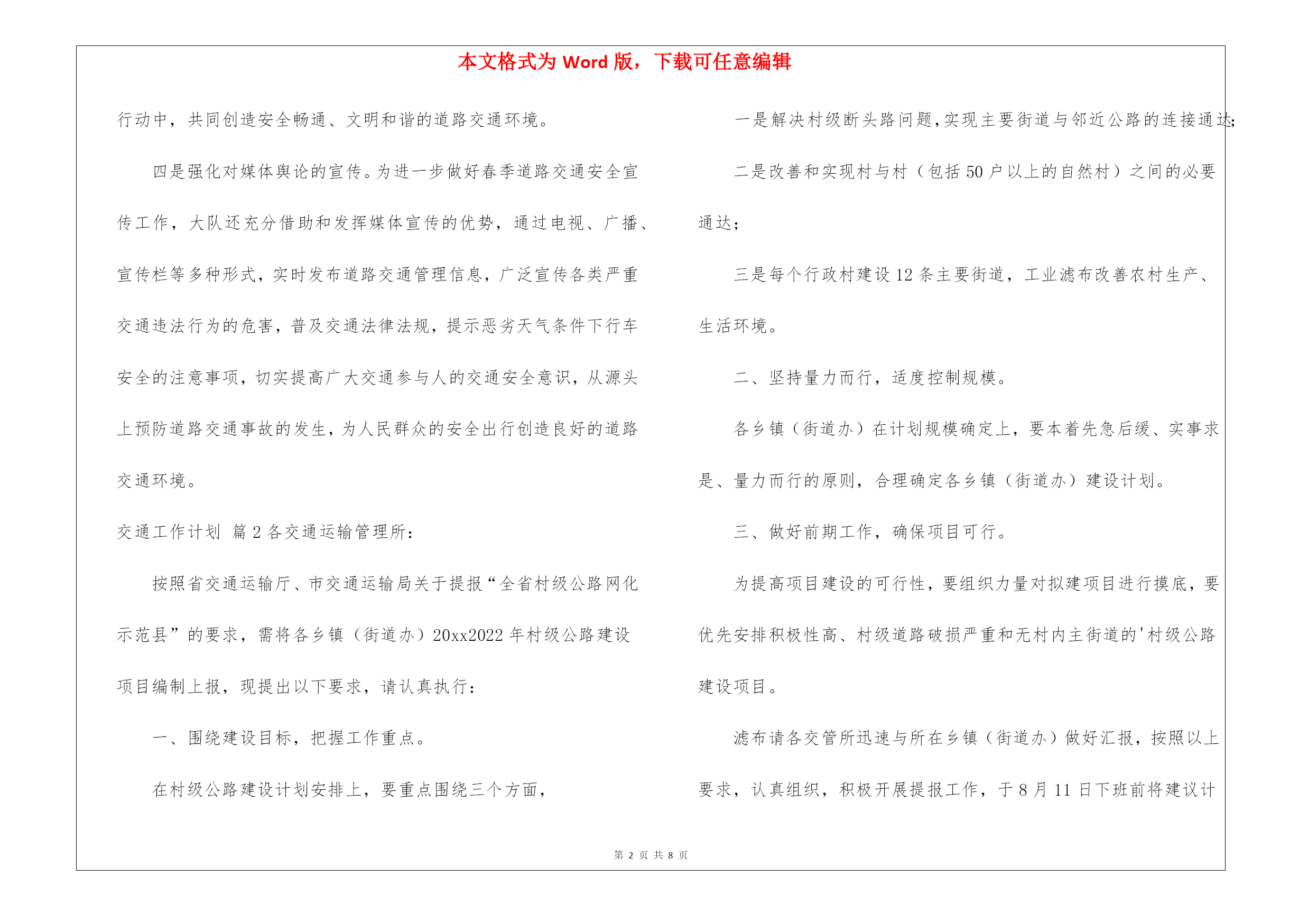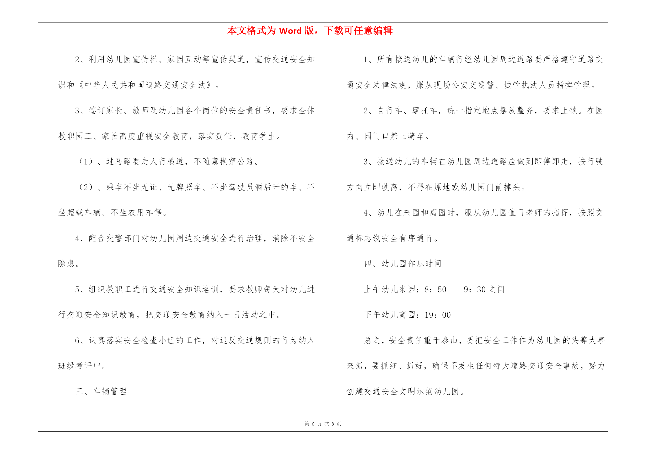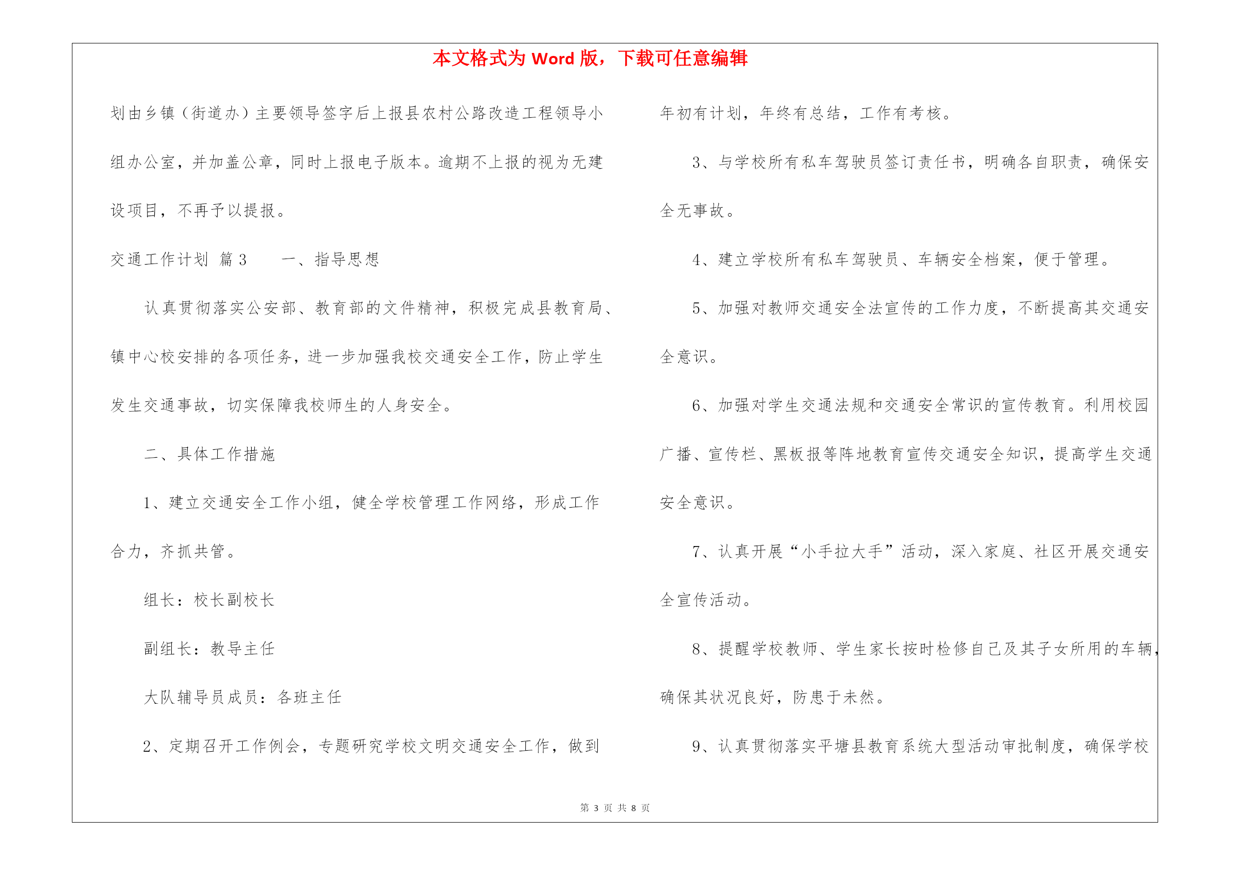 本文格式为Word版,下载可任意编辑第PAGE\*MERGEFORMAT8页共NUMPAGES\*MERGEFORMAT8页交通工作计划6篇交通工作计划篇1为切实增强交通参与人的交通安全意识和自我防护能力,坚决遏止重特大道路交通事故的发生,中旗大队立足实际,以“三超一疲劳”专项整治活动为载体,紧抓宣传教育工作不放松,积极开展春季道路交通安全宣传工作,不断提高广大群众的文明交通意识,净化辖区道路交通环境,为广大群众出行创造一个良好的道路交通环境。一是密切结合“三超一疲劳”专项行动宣传。根据“三超一疲劳”专项整治,大队一方面积极与交通、安监等部门联系,通过深入客、货运企业,要求客、货运企业落实交通安全主体责任,严格内部安全管理制度,督促运输企业建立健全交通安全教育制度,加强春季安全行车教育,提高客、货运驾驶人安全意识,从源头上遏制重特大交通事故的发生。另一方面,积极开展交通安全进企业活动,组织宣传民警为客运驾驶员上交通安全课,重点讲解超速、超员、疲劳驾驶、违法停车等严重违法行为的危害后果,宣讲交通安全法律法规和安全行车常识,并结合实际讲解春季驾驶注意事项,着力提升广大客货运驾驶人文明交通素养,营造良好氛围。二是强化对重点群体的宣传。大队结合实际,深入分析重点群体的特点,重点对广大驾驶员同志、广大中小学生等,适时适地组织开展有针对性的宣传教育,逐步提高广大群众的交通安全意识,筑牢道路交通事故源头防线。通过宣传交通标志等交通安全知识、预防交通事故和紧急避险的技巧,提醒他们在出行时注意防范交通危险,自觉遵守交通法规,真正做到安全行车、文明行车和有序行车。三是强化对主题活动的宣传。大队紧紧围绕“关爱生命,文明出行”的主题,精心组织开展形式多样、内容丰富多彩的主题宣传教育活动,掀起了春季道路交通安全宣传工作的高潮。通过开展活动,提高广大人民群众的文明交通意识,引导人民群众共同参与到文明交通行动中,共同创造安全畅通、文明和谐的道路交通环境。四是强化对媒体舆论的宣传。为进一步做好春季道路交通安全宣传工作,大队还充分借助和发挥媒体宣传的优势,通过电视、广播、宣传栏等多种形式,实时发布道路交通管理信息,广泛宣传各类严重交通违法行为的危害,普及交通法律法规,提示恶劣天气条件下行车安全的注意事项,切实提高广大交通参与人的交通安全意识,从源头上预防道路交通事故的发生,为人民群众的安全出行创造良好的道路交通环境。交通工作计划篇2各交通运输管理所:按照省交通运输厅、市交通运输局关于提报“全省村级公路网化示范县”的要求,需将各乡镇(街道办)20xx2022年村级公路建设项目编制上报,现提出以下要求,请认真执行:一、围绕建设目标,把握工作重点。在村级公路建设计划安排上,要重点围绕三个方面,一是解决村级断头路问题,实现主要街道与邻近公路的连接通达;二是改善和实现村与村(包括50户以上的自然村)之间的必要通达;三是每个行政村建设12条主要街道,工业滤布改善农村生产、生活环境。二、坚持量力而行,适度控制规模。各乡镇(街道办)在计划规模确定上,要本着先急后缓、实事求是、量力而行的原则,合理确定各乡镇(街道办)建设计划。三、做好前期工作,确保项目可行。为提高项目建设的可行性,要组织力量对拟建项目进行摸底,要优先安排积极性高、村级道路破损严重和无村内主街道的'村级公路建设项目。滤布请各交管所迅速与所在乡镇(街道办)做好汇报,按照以上要求,认真组织,积极开展提报工作,于8月11日下班前将建议计划由乡镇(街道办)主要领导签字后上报县农村公路改造工程领导小组办公室,并加盖公章,同时上报电子版本。逾期不上报的视为无建设项目,不再予以提报。交通工作计划篇3一、指导思想认真贯彻落实公安部、教育部的文件精神,积极完成县教育局、镇中心校安排的各项任务,进一步加强我校交通安全工作,防止学生发生交通事故,切实保障我校师生的人身安全。二、具体工作措施1、建立交通安全工作小组,健全学校管理工作网络,形成工作合力,齐抓共管。组长:校长副校长副组长:教导主任大队辅导员成员:各班主任2、定期召开工作例会,专题研究学校文明交通安全工作,做到年初有计划,年终有总结,工作有考核。3、与学校所有私车驾驶员签订责任书,明确各自职责,确保安全无事故。4、建立学校所有私车驾驶员、车辆安全档案,便于管理。5、加强对教师交通安全法宣传的工作力度,不断提高其交通安全意识。6、加强对学生交通法规和交通安全常识的宣传教育。利用校园广播、宣传栏、黑板报等阵地教育宣传交通安全知识,提高学生交通安全意识。7、认真开展“小手拉大手”活动,深入家庭、社区开展交通安全宣传活动。8、提醒学校教师、学生家长按时检修自己及其子女所用的车辆,确保其状况良好,防患于未然。9、认真贯彻落实平塘县教育系统大型活动审批制度,确保学校组