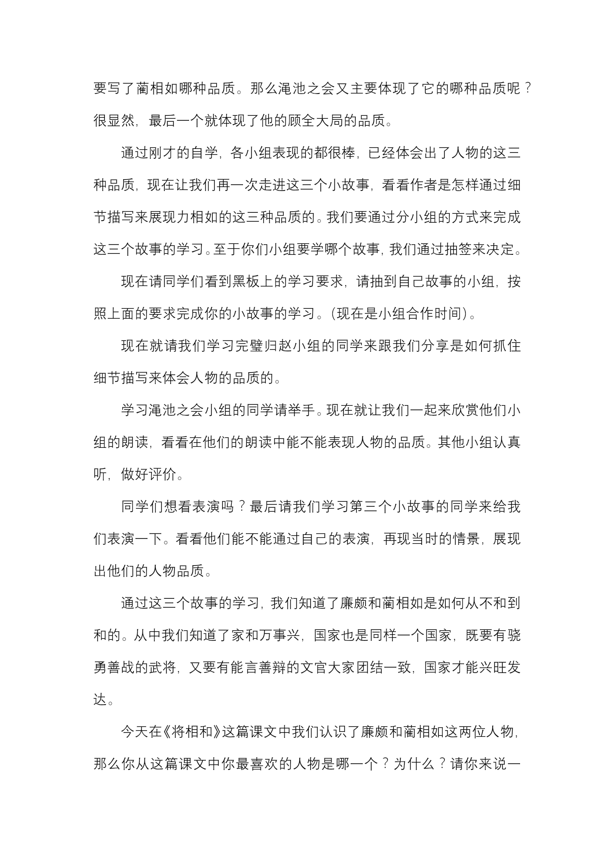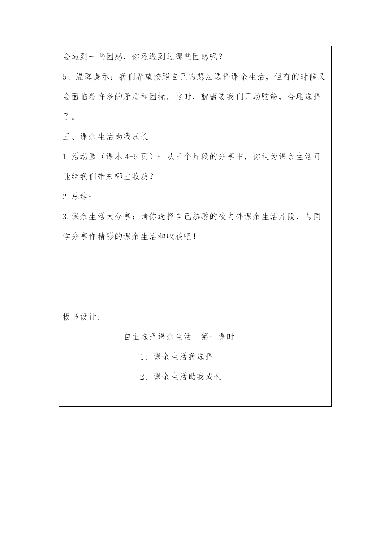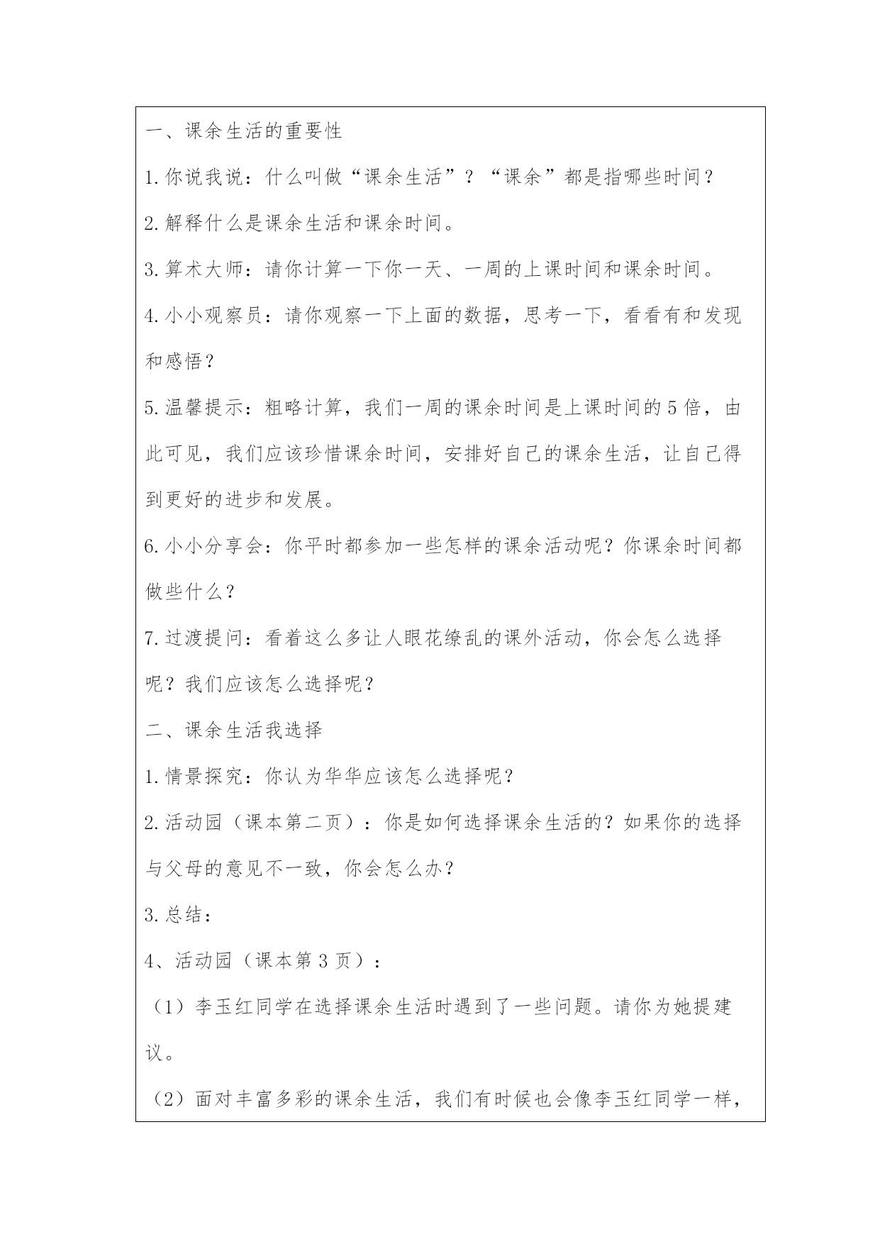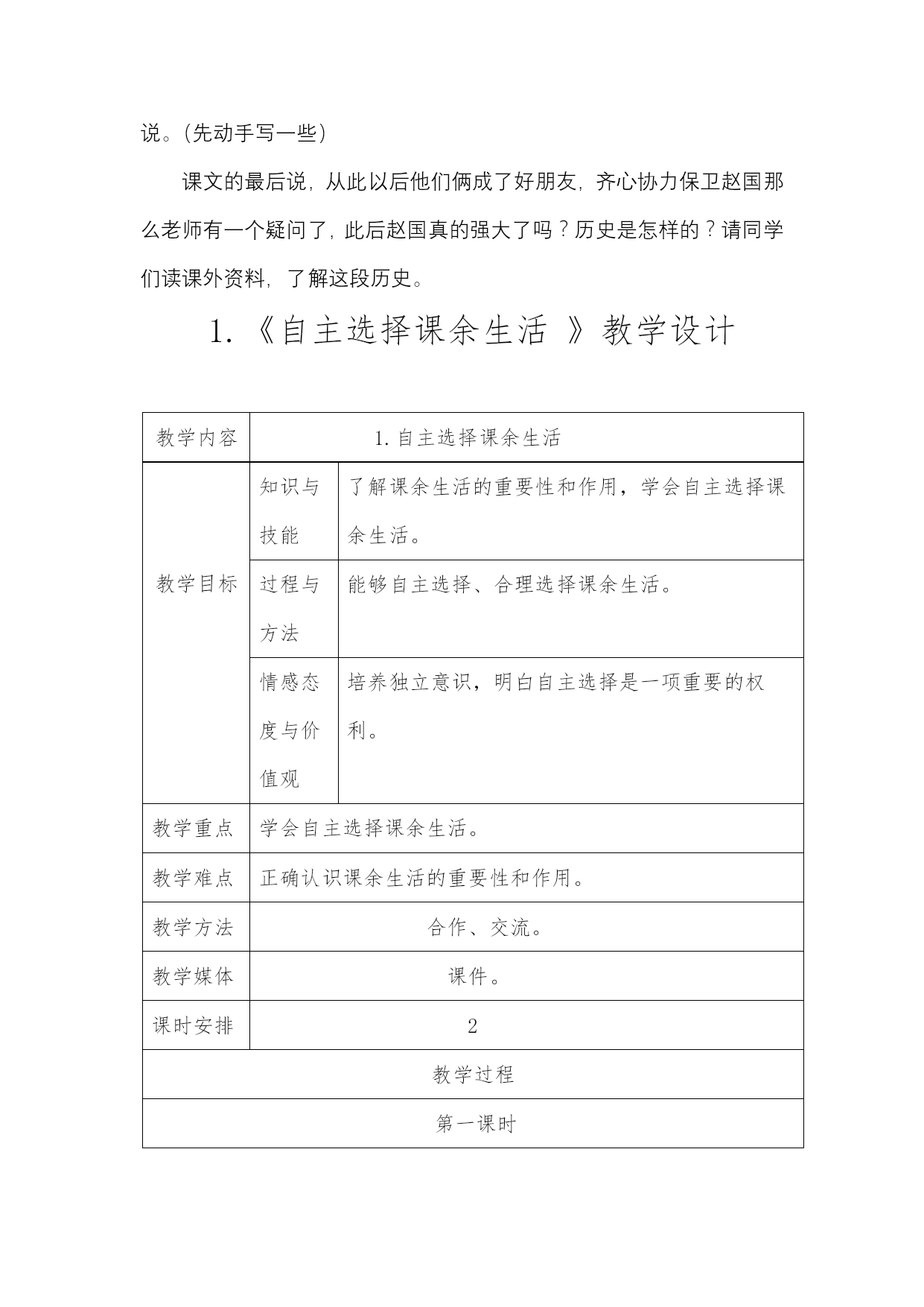 先在黑板上板书课题将相和。老师想问同学们,你们通过预习知道了将相分别指的是谁吗?将指的是廉颇,相指的是蔺相如。和又是什么意思呢?所以我们的题目的意思是。他们和好了现在我们就来学习这篇课文,看看他们是怎么回事吧,课文第一自然段谁来读读,从中我们知道了哪些信息。(故事发生在战国时期,秦国很强,在这里坐着为我们介绍了故事发生的历史背景,我们来了解一下,出示历史背景PPT)。请同学们根据自学提示自读课文,边读边勾画,边读边批注。谁来读一读老师出示的词语第一行。(剩下的开火车)。三个故事中的小标题,你们拟好了吗?谁来说说第一个。(这个时候要将其板书在黑板上)学生说第一个小标题是完璧归赵,第二个小标题是渑池之会。第三个小标题是负荆请罪,。小标题你们拟好了,那这三件事情解说了蔺相如的哪三种品质呢?现在请小组内交流形成小组意见,将三种品质分别写在草稿纸上,哪个小组最先写好就可以最先写在黑板上,其他小组有不同的也可以去写。黑板上出现这么多,那到底该留下哪三个呢?现在选择相近的词语把它去掉。同学们已经只留下了三种品质,那咱们具体来看看,第一个故事主要写了蔺相如哪种品质。那么渑池之会又主要体现了它的哪种品质呢?很显然,最后一个就体现了他的顾全大局的品质。通过刚才的自学,各小组表现的都很棒,已经体会出了人物的这三种品质,现在让我们再一次走进这三个小故事,看看作者是怎样通过细节描写来展现力相如的这三种品质的。我们要通过分小组的方式来完成这三个故事的学习。至于你们小组要学哪个故事,我们通过抽签来决定。现在请同学们看到黑板上的学习要求,请抽到自己故事的小组,按照上面的要求完成你的小故事的学习。(现在是小组合作时间)。现在就请我们学习完璧归赵小组的同学来跟我们分享是如何抓住细节描写来体会人物的品质的。学习渑池之会小组的同学请举手。现在就让我们一起来欣赏他们小组的朗读,看看在他们的朗读中能不能表现人物的品质。其他小组认真听,做好评价。同学们想看表演吗?最后请我们学习第三个小故事的同学来给我们表演一下。看看他们能不能通过自己的表演,再现当时的情景,展现出他们的人物品质。通过这三个故事的学习,我们知道了廉颇和蔺相如是如何从不和到和的。从中我们知道了家和万事兴,国家也是同样一个国家,既要有骁勇善战的武将,又要有能言善辩的文官大家团结一致,国家才能兴旺发达。今天在《将相和》这篇课文中我们认识了廉颇和蔺相如这两位人物,那么你从这篇课文中你最喜欢的人物是哪一个?为什么?请你来说一说。(先动手写一些)课文的最后说,从此以后他们俩成了好朋友,齐心协力保卫赵国那么老师有一个疑问了,此后赵国真的强大了吗?历史是怎样的?请同学们读课外资料,了解这段历史。1.《自主选择课余生活》教学设计教学内容1.自主选择课余生活教学目标知识与技能了解课余生活的重要性和作用,学会自主选择课余生活。过程与方法能够自主选择、合理选择课余生活。情感态度与价值观培养独立意识,明白自主选择是一项重要的权利。教学重点学会自主选择课余生活。教学难点正确认识课余生活的重要性和作用。教学方法合作、交流。教学媒体课件。课时安排2教学过程第一课时一、课余生活的重要性1.你说我说:什么叫做“课余生活”?“课余”都是指哪些时间?2.解释什么是课余生活和课余时间。3.算术大师:请你计算一下你一天、一周的上课时间和课余时间。4.小小观察员:请你观察一下上面的数据,思考一下,看看有和发现和感悟?5.温馨提示:粗略计算,我们一周的课余时间是上课时间的5倍,由此可见,我们应该珍惜课余时间,安排好自己的课余生活,让自己得到更好的进步和发展。6.小小分享会:你平时都参加一些怎样的课余活动呢?你课余时间都做些什么?7.过渡提问:看着这么多让人眼花缭乱的课外活动,你会怎么选择呢?我们应该怎么选择呢?二、课余生活我选择1.情景探究:你认为华华应该怎么选择呢?2.活动园(课本第二页):你是如何选择课余生活的?如果你的选择与父母的意见不一致,你会怎么办?3.总结:4、活动园(课本):(1)李玉红同学在选择课余生活时遇到了一些问题。请你为她提建议。(2)面对丰富多彩的课余生活,我们有时候也会像李玉红同学一样,会遇到一些困惑,你还遇到过哪些困惑呢?5、温馨提示:我们希望按照自己的想法选择课余生活,但有的时候又会面临着许多的矛盾和困扰。这时,就需要我们开动脑筋,合理选择了。三、课余生活助我成长1.活动园(课本4-5页):从三个片段的分享中,你认为课余生活可能给我们带来哪些收获?2.总结:3.课余生活大分享:请你选择自己熟悉的校内外课余生活片段,与同学分享你精彩的课余生活和收获吧!板书设计:自主选择课余生活第一课时1、课余生活我选择2、课余生活助我成长