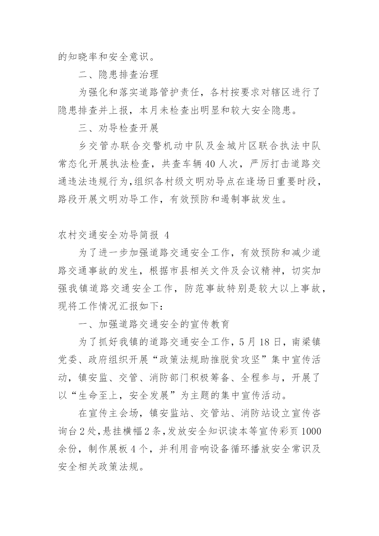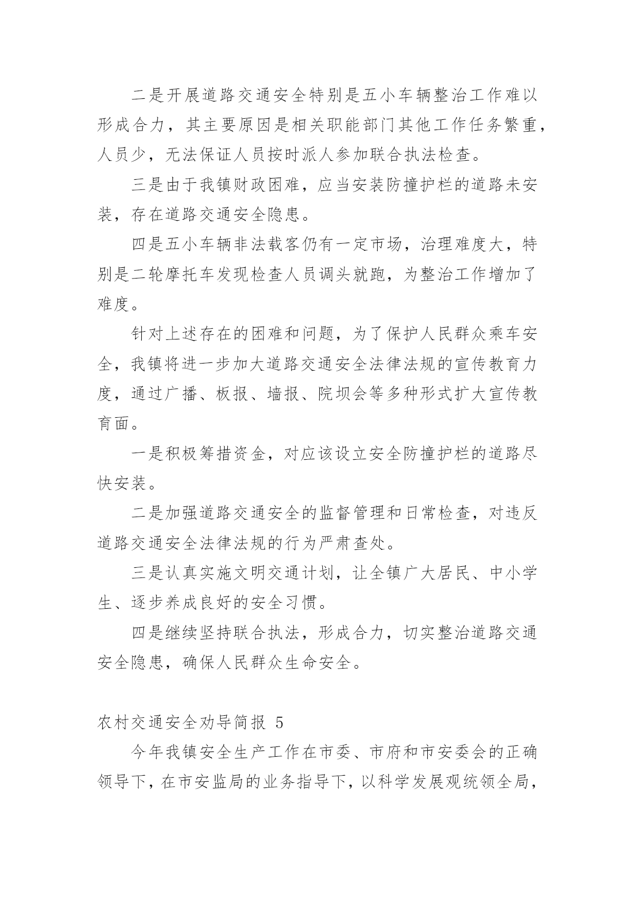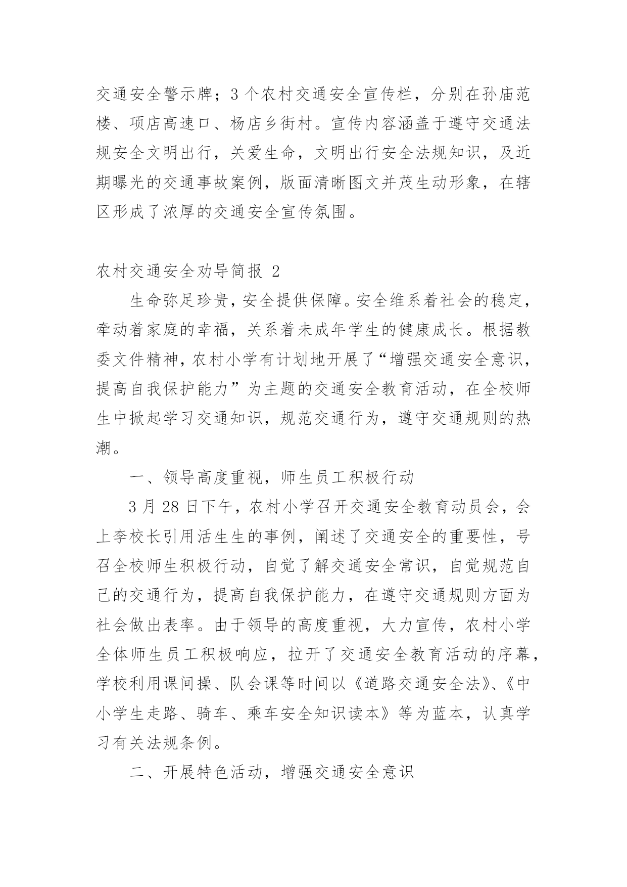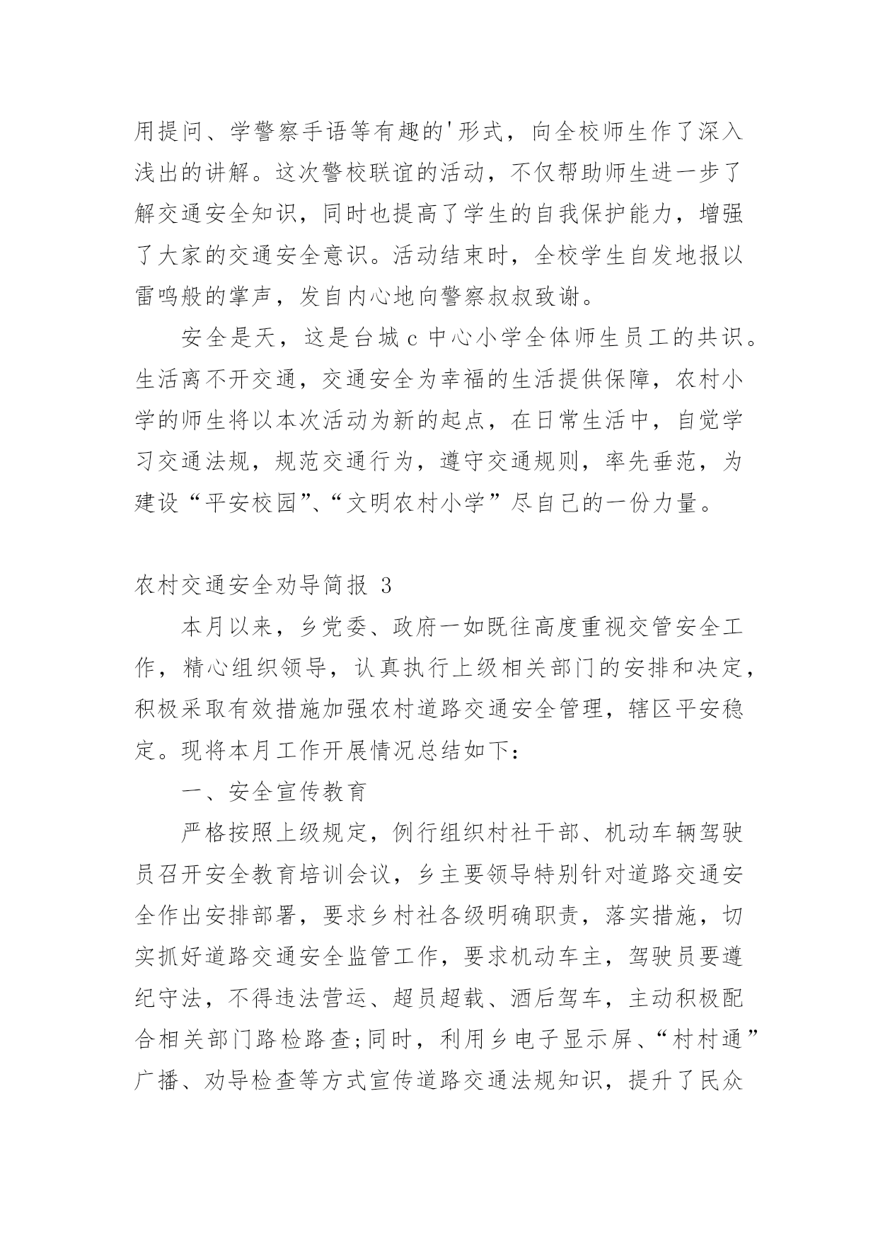 农村交通安全劝导简报随着社会一步步向前发展,越来越多地方需要用到简报,简报是传递某方面信息的简短的内部小报。你写简报时总是无从下手?以下是小编为大家整理的农村交通安全劝导简报范文,仅供参考,希望能够帮助到大家。农村交通安全劝导简报1为进一步做好道路交通事故预防“减量控大”工作,深入推进“美丽乡村行”、“一盔一带”等安全守护行动,努力创建安全文明交通环境、夯实交通事故防范基础,增强农村交通安全宣传教育,巩固强化农村道路交通安全宣传阵地建设,预防和减少农村地区道路交通事故,现将农村交通安全宣传工作情况汇报如下:20xx年上半年xx深入农村开展交通安全宣传和“美丽乡村行”巡回宣讲活动共31次。进农村中小学幼儿园开展交通安全宣传18次,利用清明、五一、端午、六一等节假日假期节点到各乡镇十字街开展农村交通安全宣传,以“一盔一带”“农用三轮车禁止载人”等内容为重点,详细讲解了驾乘车辆不系安全带、骑乘摩托车和电动自行车不佩戴头盔、无证驾驶、无牌上路、酒驾、人货混装车辆的危害性等交通违法行为的危害和后果,并结合身边发生的典型案例,以案说法,警示教育大家要做到知危险会避险,引导群众切实增强交通安全意识,提高自我防护意识。大队充分利用农村超市、农商银行、乡政府门口等有LED显示屏的'地方投放“车靠边、人撤离、即报警”、“拒绝酒驾”、“一盔一带”等宣传提示语,提醒广大驾驶员拒绝分心驾驶、严禁酒驾、超员、超载,做到文明驾驶,安全出行。还利用“农村大喇叭”广播范围广、宣传效果好的特点,结合辖区农村道路交通事故案例,编制通俗易懂的农村交通安全宣传资料,将交通安全法律法规、农村交通安全常识及酒后驾驶、一盔一带、分心驾驶等违法行为危害性等方面内容传递给村民。大队将近期xx辖区内交通事故典型案例制作《农村交通安全知识》宣传彩页3000份,制作《一盔一带安全常在》宣传单6000份、大队各单位深入乡镇“红白喜事”操办现场,向操办负责人发放了《家庭操办“红白喜事”告知书》,对此间的交通安全注意事项予以温馨提示;不要将机动车在道路上乱停乱放,造成交通拥堵;在道路上举行喜丧事仪式时,提醒亲朋好友一定要注意交通安全,注意沿途通行的车辆,防止发生交通事故,大队印发《农村红白喜事交通安全告知书》宣传单3000份,制作《城乡居民交通安全常识》、《一盔一带安全守护行动》宣传册30000余份,制作农村交通安全宣传海报200余张。制作宣传简易易拉宝4个。农村国省道沿线13个乡镇村庄的宣传阵地建设,共安装38块,针对每个乡镇道路通行环境在执行的路上设置开车滥用远光灯,在需要拐弯的路段设置行车变道请打转向,在陡河沿桥设置禁止超速、禁止酒后驾驶、禁止疲劳驾驶等交通安全警示牌;3个农村交通安全宣传栏,分别在孙庙范楼、项店高速口、杨店乡街村。宣传内容涵盖于遵守交通法规安全文明出行,关爱生命,文明出行安全法规知识,及近期曝光的交通事故案例,版面清晰图文并茂生动形象,在辖区形成了浓厚的交通安全宣传氛围。农村交通安全劝导简报2生命弥足珍贵,安全提供保障。安全维系着社会的稳定,牵动着家庭的幸福,关系着未成年学生的健康成长。根据教委文件精神,农村小学有计划地开展了“增强交通安全意识,提高自我保护能力”为主题的交通安全教育活动,在全校师生中掀起学习交通知识,规范交通行为,遵守交通规则的热潮。一、领导高度重视,师生员工积极行动3月28日下午,农村小学召开交通安全教育动员会,会上李校长引用活生生的事例,阐述了交通安全的重要性,号召全校师生积极行动,自觉了解交通安全常识,自觉规范自己的交通行为,提高自我保护能力,在遵守交通规则方面为社会做出表率。由于领导的高度重视,大力宣传,农村小学全体师生员工积极响应,拉开了交通安全教育活动的序幕,学校利用课间操、队会课等时间以《道路交通安全法》、《中小学生走路、骑车、乘车安全知识读本》等为蓝本,认真学习有关法规条例。二、开展特色活动,增强交通安全意识学校大队部把3月28日~4月1日定为交通安全活动周。大队部在校园举行《道路交通安全常识》图片展,积极营造良好氛围,各中队根据学生年龄特点,开展学生乐于参加的活动,让学生在活动中学习,在活动中受教育。具体安排是办好一期“安全版报”,开展一次“交通安全”主题队会,备好一次“安全知识竞赛”。学校大队辅导员利用晨会组织学生学习《小学生安全常识》,指挥齐读琅琅上口的“安全常识顺口溜”、“一条道路分道行,车来人往忙不停,行人走路要安全,须把交规记在心。行人要走人行道,无故莫上车道行,如果没有人行道,千万记住靠边行,横穿马路过叉口,要在人行横道走,车辆临近莫横穿,平安幸福牵你手。莫在路上玩游戏,车辆最是无情义,猛跑打闹更危险,不闹不玩要牢记。”全校“雀声”飞扬,把交通安全教育活动推向了高潮。3月31日下午,农村小学举行了交通知识主题竞赛。
