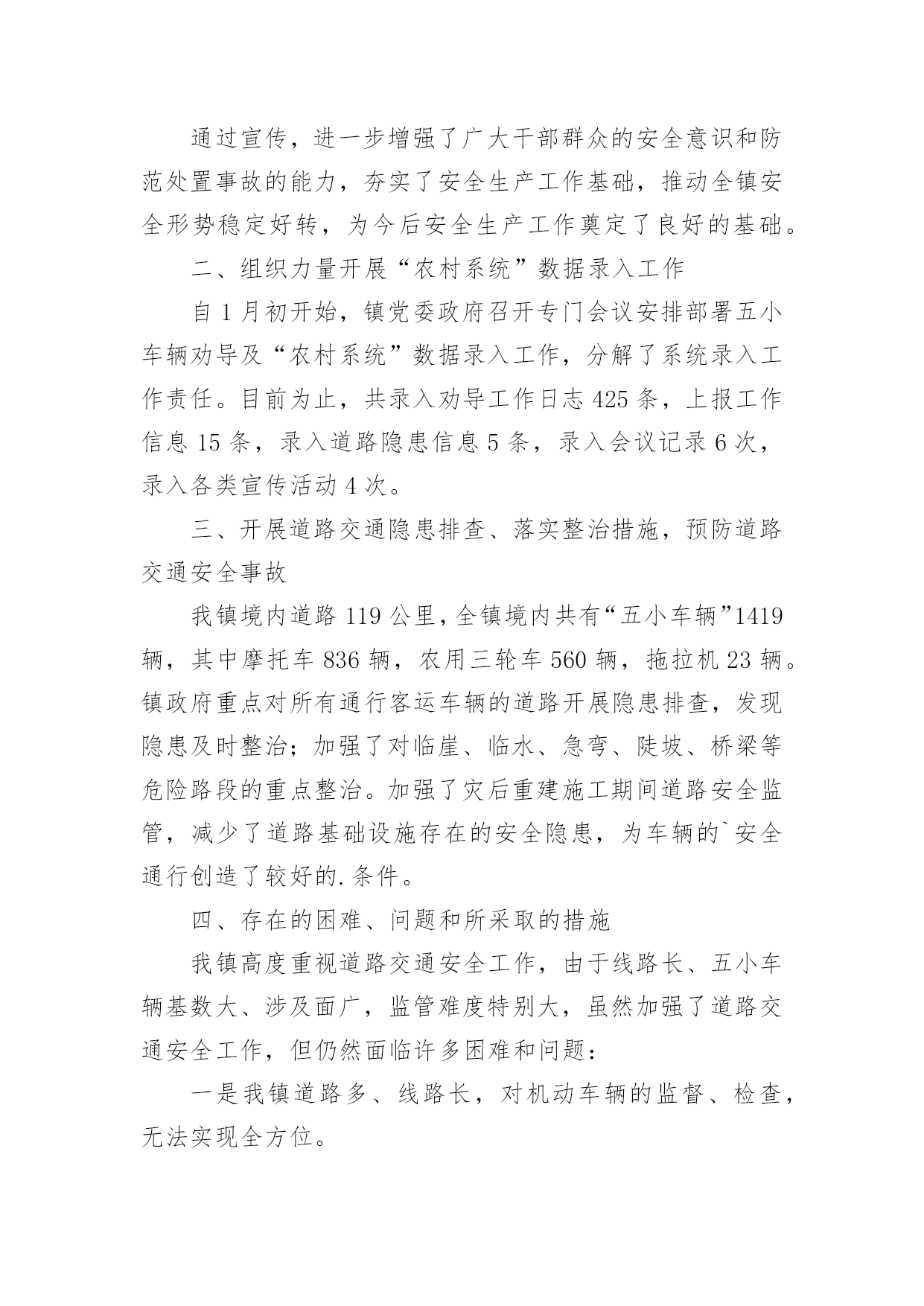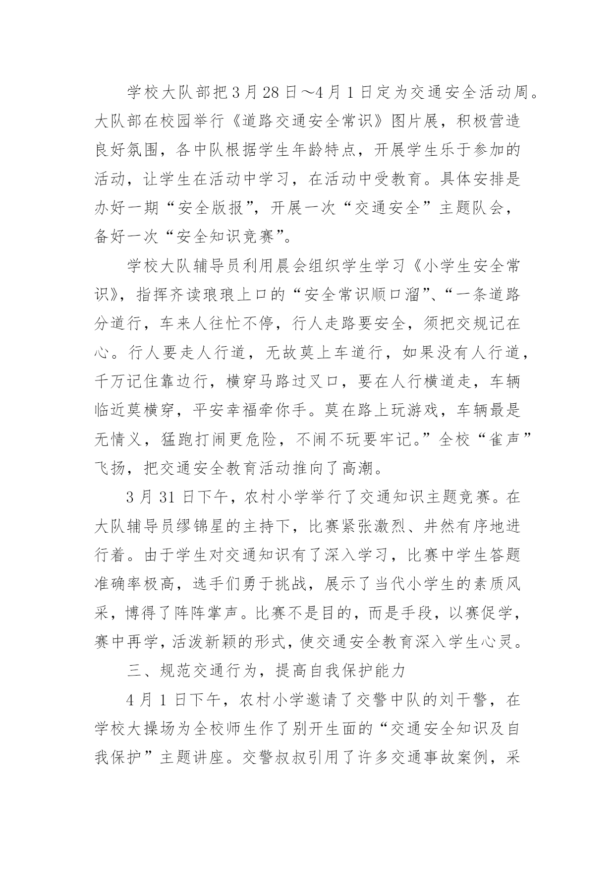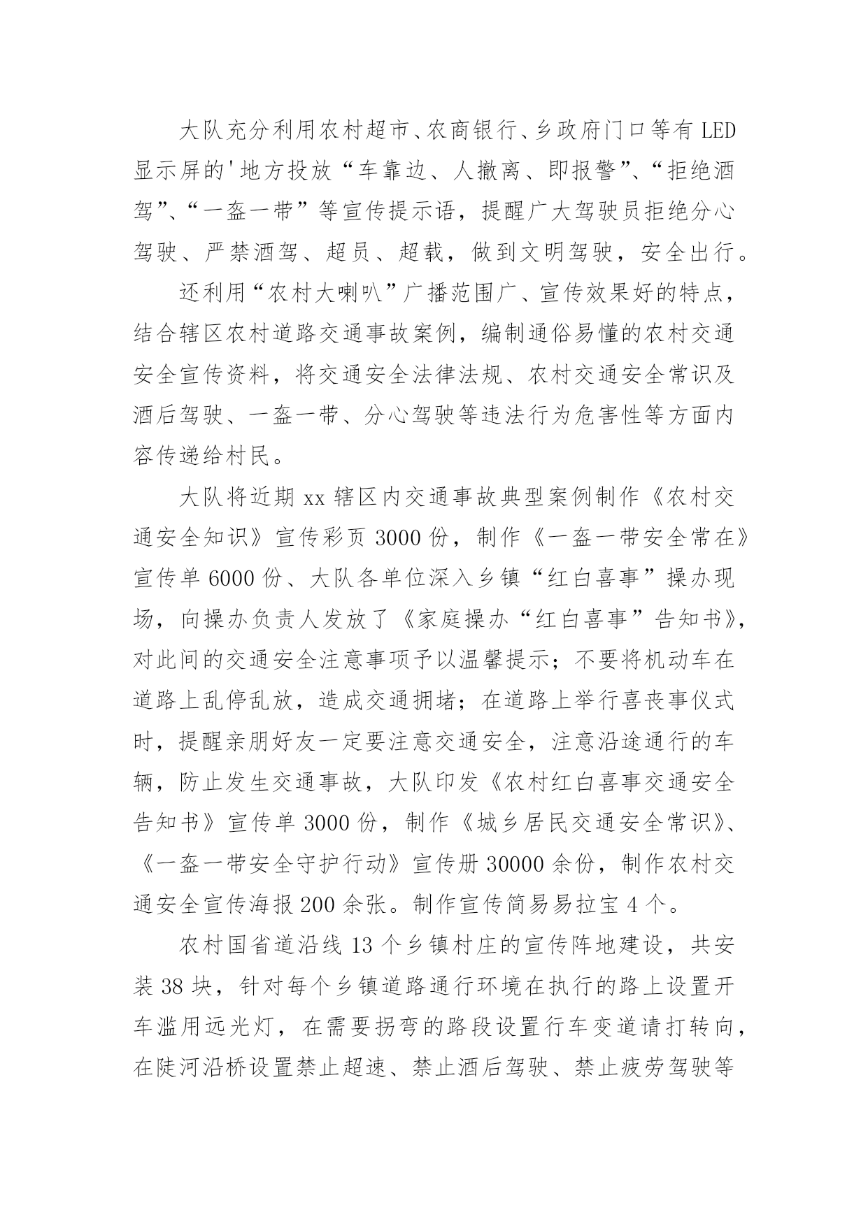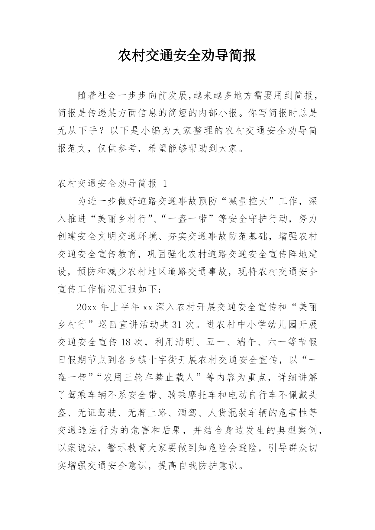 农村交通安全劝导简报随着社会一步步向前发展,越来越多地方需要用到简报,简报是传递某方面信息的简短的内部小报。你写简报时总是无从下手?以下是小编为大家整理的农村交通安全劝导简报范文,仅供参考,希望能够帮助到大家。农村交通安全劝导简报1为进一步做好道路交通事故预防“减量控大”工作,深入推进“美丽乡村行”、“一盔一带”等安全守护行动,努力创建安全文明交通环境、夯实交通事故防范基础,增强农村交通安全宣传教育,巩固强化农村道路交通安全宣传阵地建设,预防和减少农村地区道路交通事故,现将农村交通安全宣传工作情况汇报如下:20xx年上半年xx深入农村开展交通安全宣传和“美丽乡村行”巡回宣讲活动共31次。进农村中小学幼儿园开展交通安全宣传18次,利用清明、五一、端午、六一等节假日假期节点到各乡镇十字街开展农村交通安全宣传,以“一盔一带”“农用三轮车禁止载人”等内容为重点,详细讲解了驾乘车辆不系安全带、骑乘摩托车和电动自行车不佩戴头盔、无证驾驶、无牌上路、酒驾、人货混装车辆的危害性等交通违法行为的危害和后果,并结合身边发生的典型案例,以案说法,警示教育大家要做到知危险会避险,引导群众切实增强交通安全意识,提高自我防护意识。大队充分利用农村超市、农商银行、乡政府门口等有LED显示屏的'地方投放“车靠边、人撤离、即报警”、“拒绝酒驾”、“一盔一带”等宣传提示语,提醒广大驾驶员拒绝分心驾驶、严禁酒驾、超员、超载,做到文明驾驶,安全出行。还利用“农村大喇叭”广播范围广、宣传效果好的特点,结合辖区农村道路交通事故案例,编制通俗易懂的农村交通安全宣传资料,将交通安全法律法规、农村交通安全常识及酒后驾驶、一盔一带、分心驾驶等违法行为危害性等方面内容传递给村民。大队将近期xx辖区内交通事故典型案例制作《农村交通安全知识》宣传彩页3000份,制作《一盔一带安全常在》宣传单6000份、大队各单位深入乡镇“红白喜事”操办现场,向操办负责人发放了《家庭操办“红白喜事”告知书》,对此间的交通安全注意事项予以温馨提示;不要将机动车在道路上乱停乱放,造成交通拥堵;在道路上举行喜丧事仪式时,提醒亲朋好友一定要注意交通安全,注意沿途通行的车辆,防止发生交通事故,大队印发《农村红白喜事交通安全告知书》宣传单3000份,制作《城乡居民交通安全常识》、《一盔一带安全守护行动》宣传册30000余份,制作农村交通安全宣传海报200余张。制作宣传简易易拉宝4个。农村国省道沿线13个乡镇村庄的宣传阵地建设,共安装38块,针对每个乡镇道路通行环境在执行的路上设置开车滥用远光灯,在需要拐弯的路段设置行车变道请打转向,在陡河沿桥设置禁止超速、禁止酒后驾驶、禁止疲劳驾驶等交通安全警示牌;3个农村交通安全宣传栏,分别在孙庙范楼、项店高速口、杨店乡街村。宣传内容涵盖于遵守交通法规安全文明出行,关爱生命,文明出行安全法规知识,及近期曝光的交通事故案例,版面清晰图文并茂生动形象,在辖区形成了浓厚的交通安全宣传氛围。农村交通安全劝导简报2生命弥足珍贵,安全提供保障。安全维系着社会的稳定,牵动着家庭的幸福,关系着未成年学生的健康成长。根据教委文件精神,农村小学有计划地开展了“增强交通安全意识,提高自我保护能力”为主题的交通安全教育活动,在全校师生中掀起学习交通知识,规范交通行为,遵守交通规则的热潮。一、领导高度重视,师生员工积极行动3月28日下午,农村小学召开交通安全教育动员会,会上李校长引用活生生的事例,阐述了交通安全的重要性,号召全校师生积极行动,自觉了解交通安全常识,自觉规范自己的交通行为,提高自我保护能力,在遵守交通规则方面为社会做出表率。由于领导的高度重视,大力宣传,农村小学全体师生员工积极响应,拉开了交通安全教育活动的序幕,学校利用课间操、队会课等时间以《道路交通安全法》、《中小学生走路、骑车、乘车安全知识读本》等为蓝本,认真学习有关法规条例。二、开展特色活动,增强交通安全意识学校大队部把3月28日~4月1日定为交通安全活动周。大队部在校园举行《道路交通安全常识》图片展,积极营造良好氛围,各中队根据学生年龄特点,开展学生乐于参加的活动,让学生在活动中学习,在活动中受教育。具体安排是办好一期“安全版报”,开展一次“交通安全”主题队会,备好一次“安全知识竞赛”。学校大队辅导员利用晨会组织学生学习《小学生安全常识》,指挥齐读琅琅上口的“安全常识顺口溜”、“一条道路分道行,车来人往忙不停,行人走路要安全,须把交规记在心。行人要走人行道,无故莫上车道行,如果没有人行道,千万记住靠边行,横穿马路过叉口,要在人行横道走,车辆临近莫横穿,平安幸福牵你手。莫在路上玩游戏,车辆最是无情义,猛跑打闹更危险,不闹不玩要牢记。”全校“雀声”飞扬,把交通安全教育活动推向了高潮。3月31日下午,农村小学举行了交通知识主题竞赛。