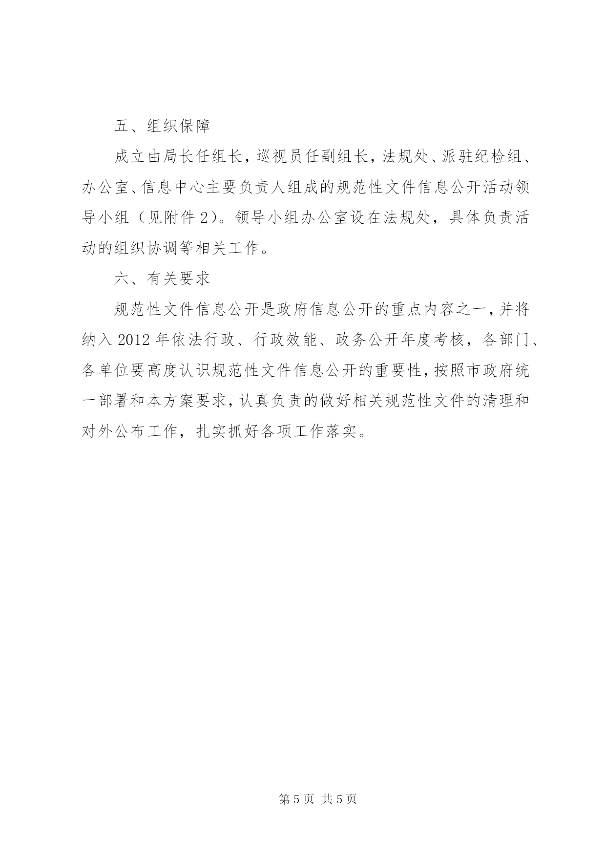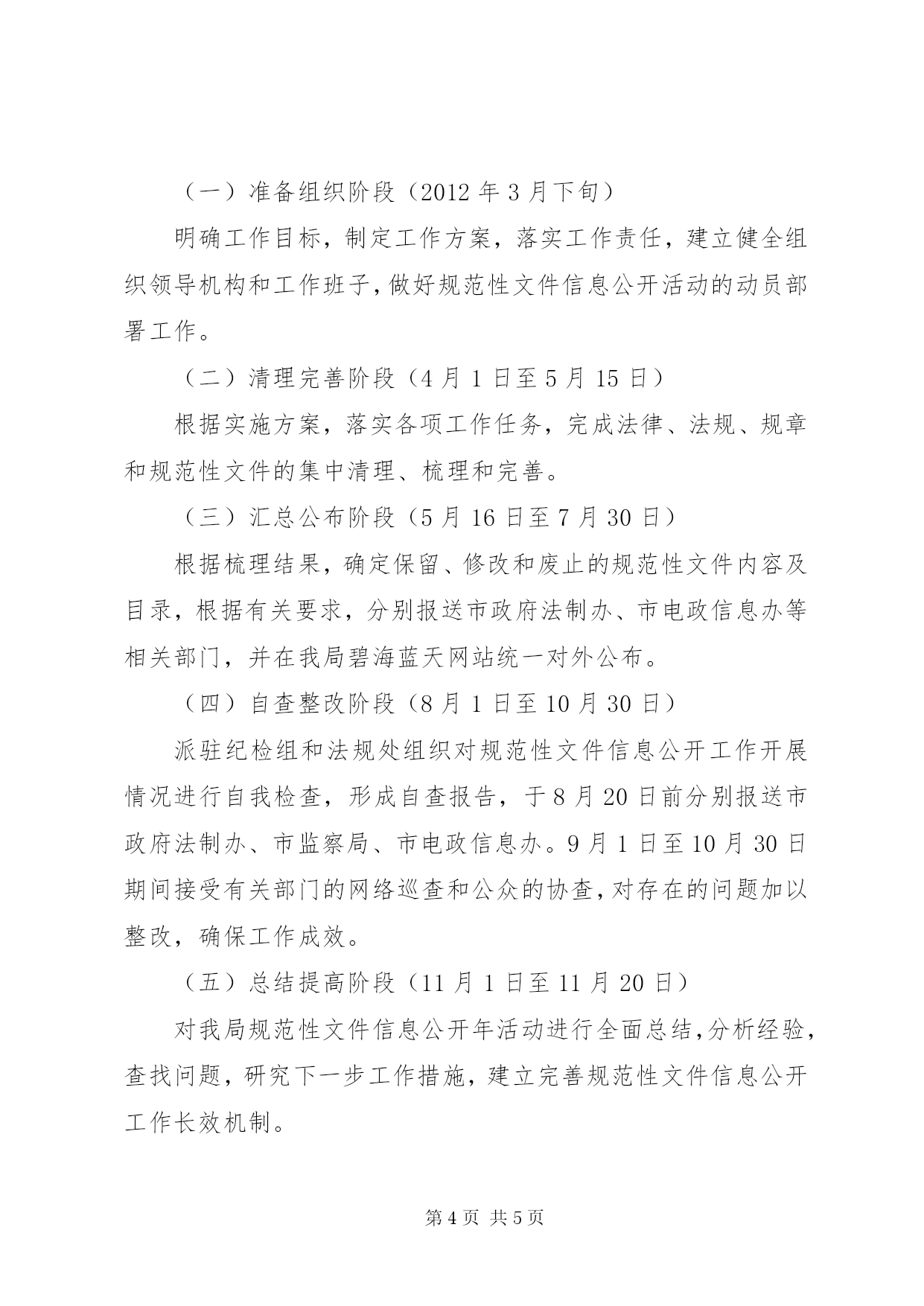 第PAGE\*Arabic\*MERGEFORMAT5页共NUMPAGES\*MERGEFORMAT5页环保局信息公开活动方案其他组织的合法权益,按照市政府法制办、市监察局、市电政信息办《关于开展规范性文件信息公开年活动的实施意见》的统一要求和《中华人民共和国政府信息公开条例》、《国务院关于全面推进依法行政实施纲要》、《省行政程序规定》的有关规定,结合我局实际,制定本方案。一、工作目标通过开展规范性文件信息公开活动,实现现行有效的环保法律、法规、规章和其他规范性文件的对外公开,完成我局颁布实施的规范性文件的清理和公布,严格规范性文件“三统一”制度,规范公开内容和公开方式,进一步落实法治政府、服务政府、阳光政府建设要求。二、规范性文件信息公开内容和方式(一)公开内容环保系统相关的法律、行政法规、地方性法规、国家部门规章、地方性法规、地方政府规章和其他规范性文件以及配套实施的政策性规定。重点是我市制定的涉及环保方面的地方性法规、政府规章和其他规范性文件以及我局制定的规范性文件。(二)公开方式1、通过政务网向社会公开市地方性法规、政府规章、市政府规范性文件、市政府部门规范性文件编入本级政府和部门信息公开目录,通过政务网向社会公开,提供“一站式”服务。自2012年3月13日起,我局新制定的规范性文件,应当在办理统一登记编号后5日内,通过金宏办公系统提请市电政信息办予以公开。2、通过本部门网站集中公布由我局负责实施的法律、法规、规章和其他规范性文件应当通过碧海蓝天网站集中公布。本通知印发前的上述文件,应当进行集中梳理完善后公开;新发布的上述文件,应当自印发后5日内予以公开。对已经废止的上述文件,也应当梳理后标注废止时间予以公开。3、通过市政府法制网站登载公开自2012年3月13日起,我局新制定的规范性文件应当在发送市电政信息办的同时转发市政府法制办研究中心,并在市政府法制网站登载公开。三、工作任务和分工(一)集中清理部门规范性文件并公布。机关各处室、局属各单位按照“谁起草、谁实施、谁负责”的原则,对我局2009年1月1日以来制定发布的规范性文件由文件起草或实施部门具体负责清理工作,根据上级有关规定和当前工作实际,提出保留、废止或者修改的意见和理由,并填写《市环境保护局规范性文件清理意见表》(附件1),经本部门主要负责人签字确认后于2012年5月15日前连同电子版报送法规处,由法规处负责汇总并提交审核确认。对2009年1月1日以前我局印发的规范性文件,各部门和单位可以查阅《市环境保护局关于公布规范性文件清理结果的通知》,有废止或修改意见的可一并提出。对清理后保留和修改后的规范性文件,由办公室编入我局信息公开目录,并由法规处提交市电政信息办予以公开。信息中心负责通过我局碧海蓝天网站对外公布。(二)梳理我市制定的环保地方性法规、政府规章和我局起草的市政府规范性文件并公布。法规处对我市制定的环保地方性法规、政府规章和我局起草的市政府规范性文件进行统一梳理,经有关部门和单位确认后,由信息中心通过我局碧海蓝天网站对外公布。(三)根据近期有关法律法规规章和规范性文件颁布实施和废止情况,法规处在我局网站更新环保相关的法律、行政法规、国家部门规章和省地方性法规、政府规章以及省级以上的规范性文件,确保公开信息的有效性。(四)各区市有关环保的规范性文件备案。各分局、五市环保局对本级政府和本单位发布的涉及环保方面的规范性文件,应当进行集中梳理完善后,报市局法规处备案。四、实施步骤(一)准备组织阶段(2012年3月下旬)明确工作目标,制定工作方案,落实工作责任,建立健全组织领导机构和工作班子,做好规范性文件信息公开活动的动员部署工作。(二)清理完善阶段(4月1日至5月15日)根据实施方案,落实各项工作任务,完成法律、法规、规章和规范性文件的集中清理、梳理和完善。(三)汇总公布阶段(5月16日至7月30日)根据梳理结果,确定保留、修改和废止的规范性文件内容及目录,根据有关要求,分别报送市政府法制办、市电政信息办等相关部门,并在我局碧海蓝天网站统一对外公布。(四)自查整改阶段(8月1日至10月30日)派驻纪检组和法规处组织对规范性文件信息公开工作开展情况进行自我检查,形成自查报告,于8月20日前分别报送市政府法制办、市监察局、市电政信息办。9月1日至10月30日期间接受有关部门的网络巡查和公众的协查,对存在的问题加以整改,确保工作成效。(五)总结提高阶段(11月1日至11月20日)对我局规范性文件信息公开年活动进行全面总结,分析经验,查找问题,研究下一步工作措施,建立完善规范性文件信息公开工作长效机制。五、组织保障成立由局长任组长,巡视员任副组长,法规处、派驻纪检组、办公室、信息中心主要负责人组成的规范性文件信息公开活动领导小组(见附件2)