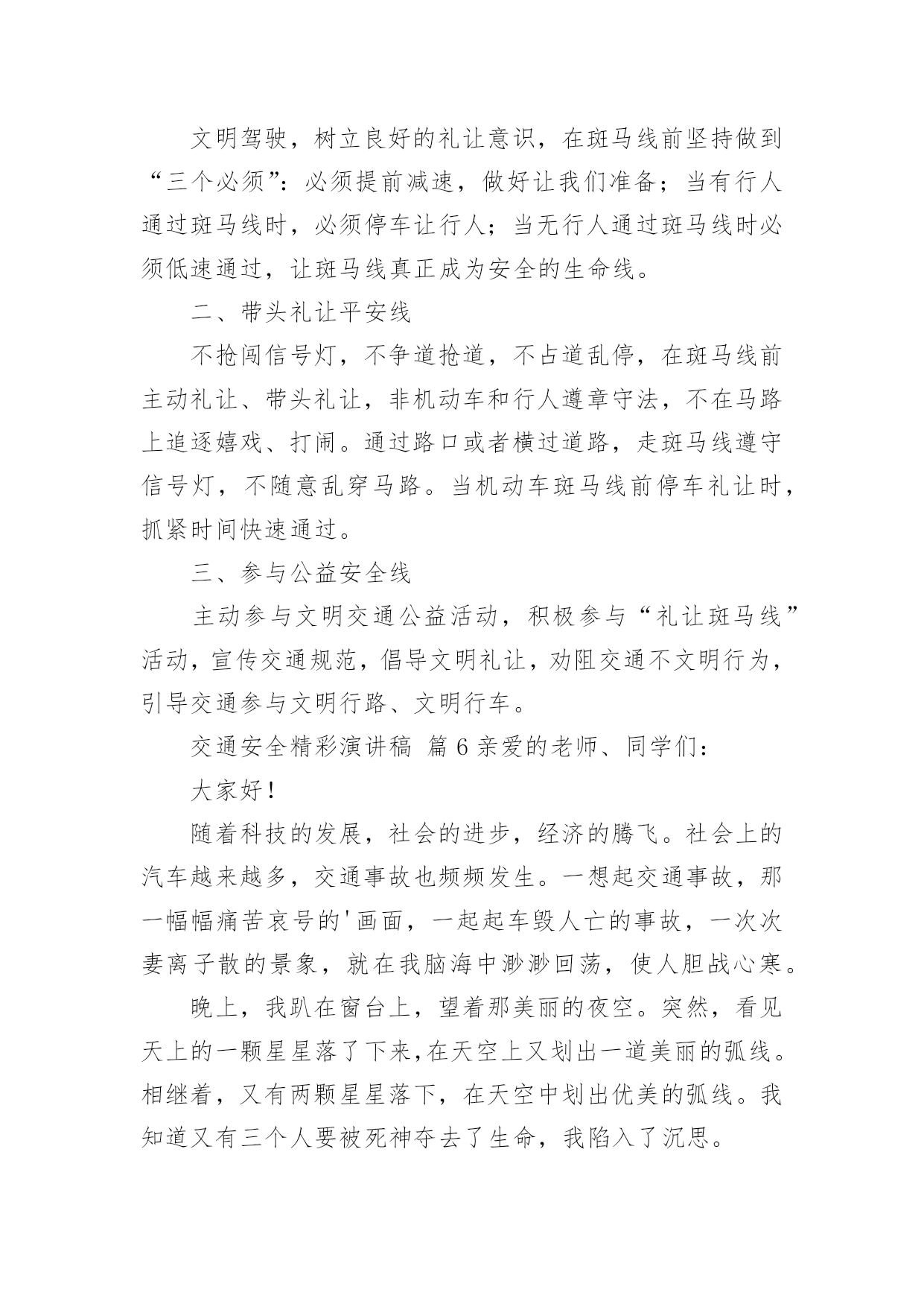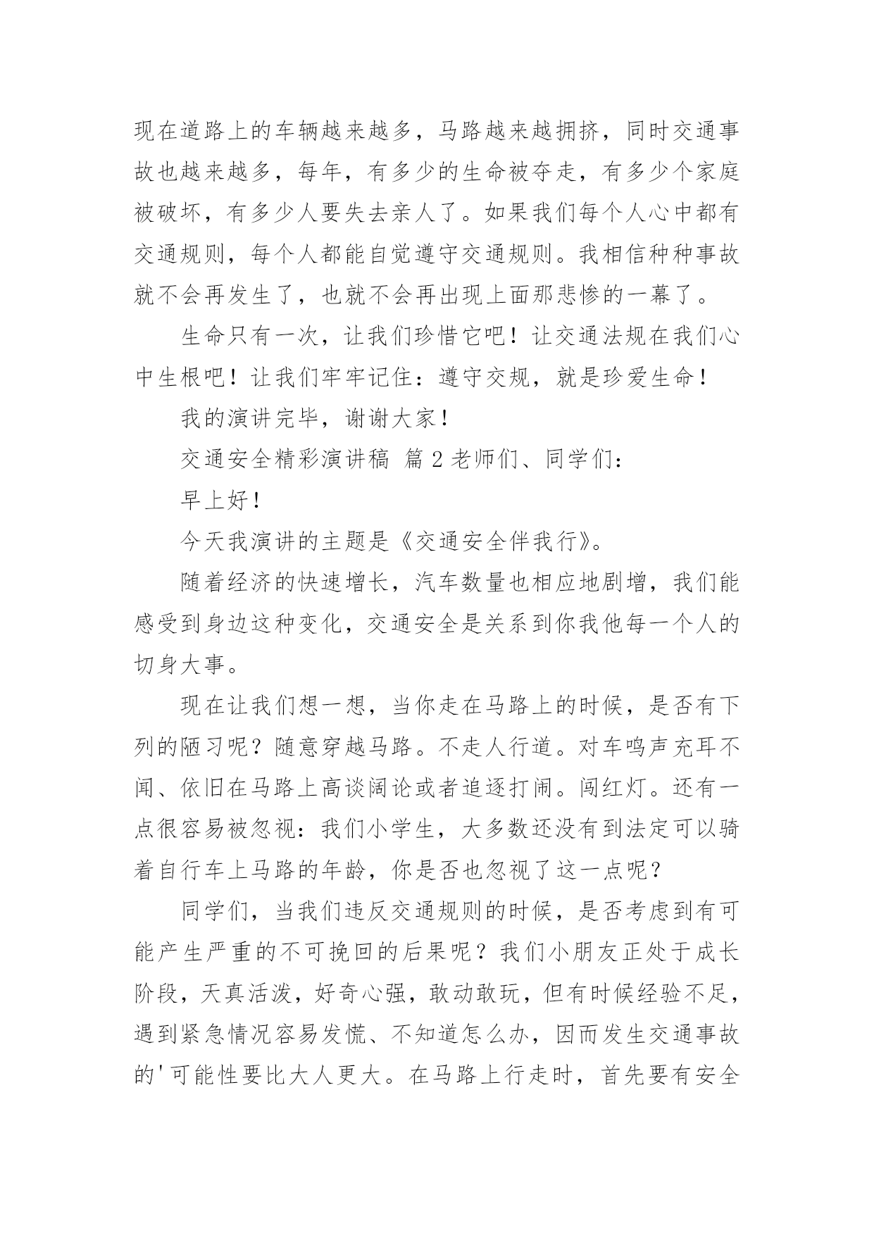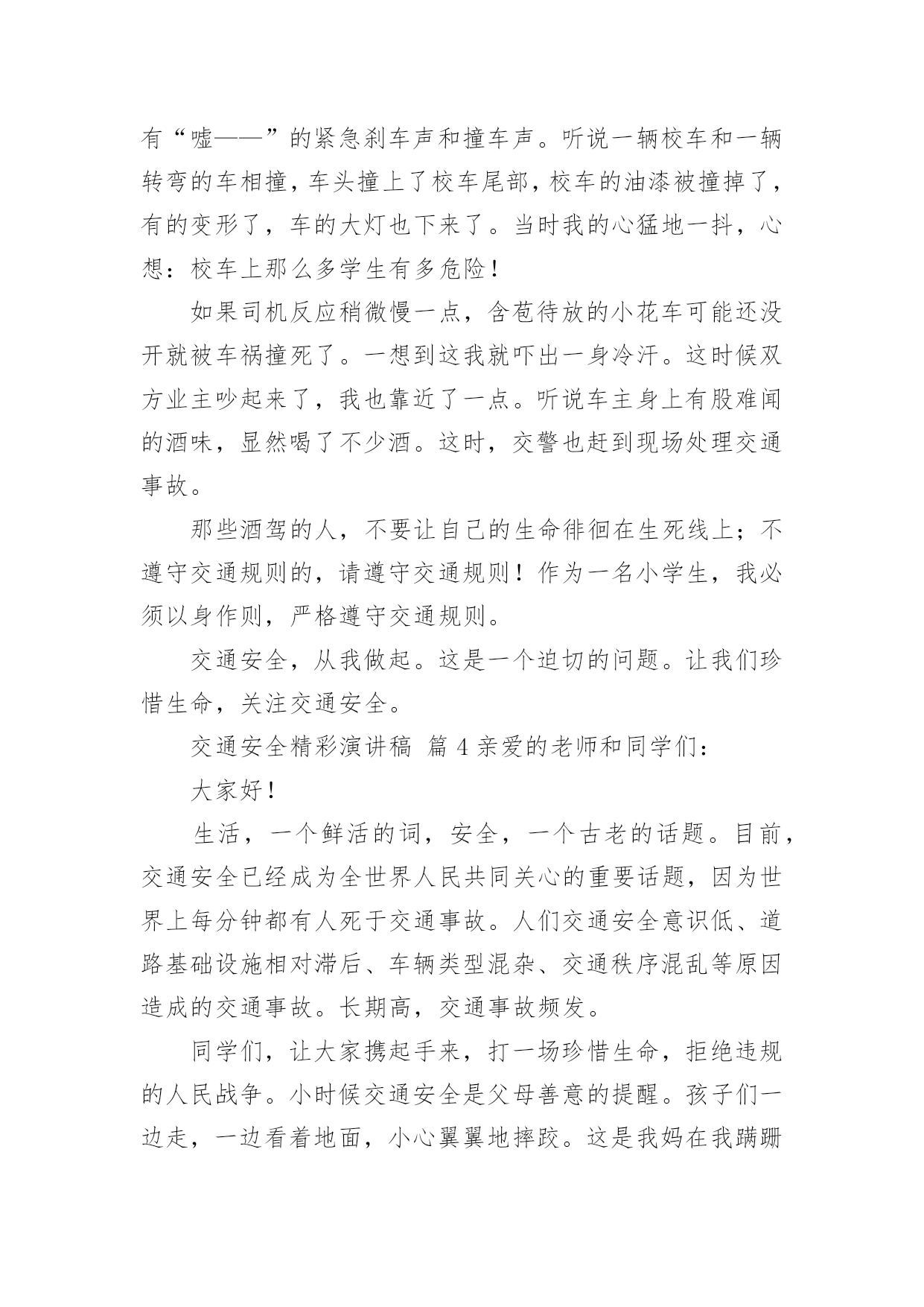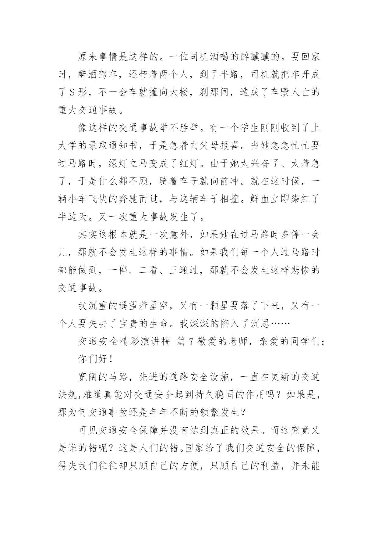 交通安全精彩演讲稿交通安全精彩演讲稿演讲稿是一种实用性比较强的文稿,是为演讲准备的书面材料。在当下社会,很多地方都会使用到演讲稿,为了让您在写演讲稿时更加简单方便,下面是小编帮大家整理的交通安全精彩演讲稿,希望能够帮助到大家。交通安全精彩演讲稿篇1亲爱的老师、同学们:大家好!交通事故时时刻刻都会发生,它就像颗威力十足的炸弹,一时大意,这颗埋伏在我们生活中的炸弹就会爆炸,炸得家庭破碎,炸得人心悲苦。所以我们要遵守交通规则。记得有一次,我在上学的路上,看到一位20多岁的青年男子骑着一辆自行车,由于赶时间,他看到十字路口的红灯亮时,竟不顾生命危险,以飞快的速度向前驶去。这时,有一辆从左往右行驶的大卡车,向他驶来,说时迟,那时快,当司机看到他时,急刹车,但是已经来不及了,大卡车已经撞上了青年男子,把青年男子被大卡车连人带车撞飞到10多米外。那位青年男子由于失血过多,当场死亡。当我亲眼目睹了一条年轻生命的'消失。我心里想,这责任在于谁呢?这显然是那位青年的责任,要是他不闯红灯,要是他不违反交通规则……真可谓是宁等三分,不抢一秒啊。交通事故是那么可怕啊,一刹那间,就夺走了人的生命。现在道路上的车辆越来越多,马路越来越拥挤,同时交通事故也越来越多,每年,有多少的生命被夺走,有多少个家庭被破坏,有多少人要失去亲人了。如果我们每个人心中都有交通规则,每个人都能自觉遵守交通规则。我相信种种事故就不会再发生了,也就不会再出现上面那悲惨的一幕了。生命只有一次,让我们珍惜它吧!让交通法规在我们心中生根吧!让我们牢牢记住:遵守交规,就是珍爱生命!我的演讲完毕,谢谢大家!交通安全精彩演讲稿篇2老师们、同学们:早上好!今天我演讲的主题是《交通安全伴我行》。随着经济的快速增长,汽车数量也相应地剧增,我们能感受到身边这种变化,交通安全是关系到你我他每一个人的切身大事。现在让我们想一想,当你走在马路上的时候,是否有下列的陋习呢?随意穿越马路。不走人行道。对车鸣声充耳不闻、依旧在马路上高谈阔论或者追逐打闹。闯红灯。还有一点很容易被忽视:我们小学生,大多数还没有到法定可以骑着自行车上马路的年龄,你是否也忽视了这一点呢?同学们,当我们违反交通规则的时候,是否考虑到有可能产生严重的不可挽回的后果呢?我们小朋友正处于成长阶段,天真活泼,好奇心强,敢动敢玩,但有时候经验不足,遇到紧急情况容易发慌、不知道怎么办,因而发生交通事故的'可能性要比大人更大。在马路上行走时,首先要有安全意识,时时防范意外,这就对我们自己提出了更高的要求。在此,我向同学们发出以下倡议:1、积极学习交通安全知识,时刻注意交通安全,自觉遵守交通规则。2、走人行道,不在公路上嬉戏、打闹,不使用滑板、旱冰鞋等滑行工具上街,不要在车前车后乱跑。3、未满12周岁的同学不骑车上公路。4、过马路时,不贪图方便去翻越交通隔离护栏。5、过马路要看红绿灯,红灯停,绿灯行。如果没有红绿灯,要先往左看,再往右看,注意来往车辆。6、乘坐汽车时,不要把头和胳膊伸出窗外。7、从自己身边做起,劝告自己的家人、亲戚要珍爱生命,严格遵守交通规则,安全乘车、安全走路。同学们,我们的交通安全,不光要靠全社会的方方面面来关心、支持,还要靠我们自觉地遵守交通法规。牢记交通安全,我们的道路交通才会有序、安全、畅通,我们的社会才会更加和谐,大家的生活更加美满幸福!交通安全精彩演讲稿篇3尊敬的老师、亲爱的同学们:大家好!在现代社会,我们的生活离不开交通,交通安全也是一个不容忽视的问题,必须言出必行,从我做起。然而,有些人不注意交通安全。你有没有想过,一点点的.疏忽,可能会让你后悔一辈子?记得有一次,我从学校走回家的路上,突然听到不远处有“嘘——”的紧急刹车声和撞车声。听说一辆校车和一辆转弯的车相撞,车头撞上了校车尾部,校车的油漆被撞掉了,有的变形了,车的大灯也下来了。当时我的心猛地一抖,心想:校车上那么多学生有多危险!如果司机反应稍微慢一点,含苞待放的小花车可能还没开就被车祸撞死了。一想到这我就吓出一身冷汗。这时候双方业主吵起来了,我也靠近了一点。听说车主身上有股难闻的酒味,显然喝了不少酒。这时,交警也赶到现场处理交通事故。那些酒驾的人,不要让自己的生命徘徊在生死线上;不遵守交通规则的,请遵守交通规则!作为一名小学生,我必须以身作则,严格遵守交通规则。交通安全,从我做起。这是一个迫切的问题。让我们珍惜生命,关注交通安全。交通安全精彩演讲稿篇4亲爱的老师和同学们:大家好!生活,一个鲜活的词,安全,一个古老的话题。目前,交通安全已经成为全世界人民共同关心的重要话题,因为世界上每分钟都有人死于交通事故。人们交通安全意识低、道路基础设施相对滞后、车辆类型混杂、交通秩序混乱等原因造成的交通事故。长期高,交通事故频发。同学们,让大家携起手来,打一场珍惜生命,拒绝
