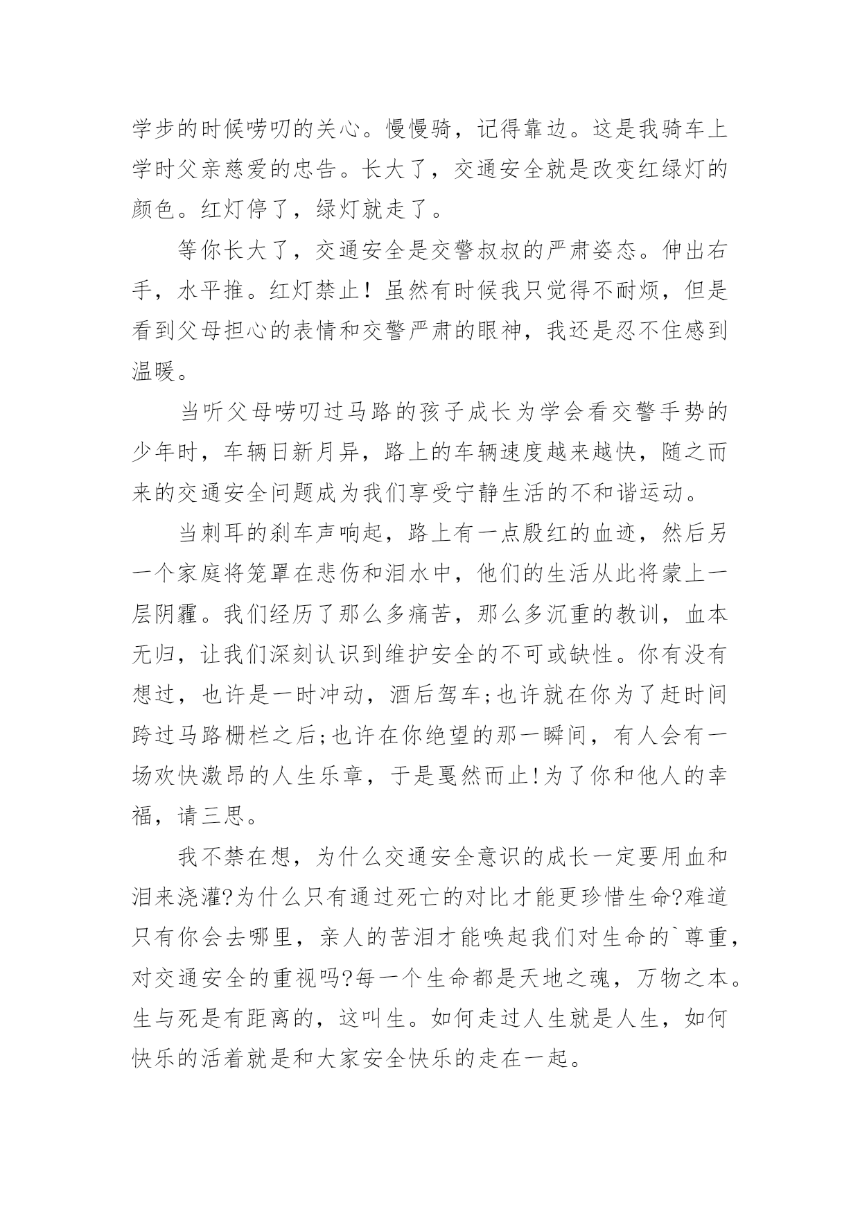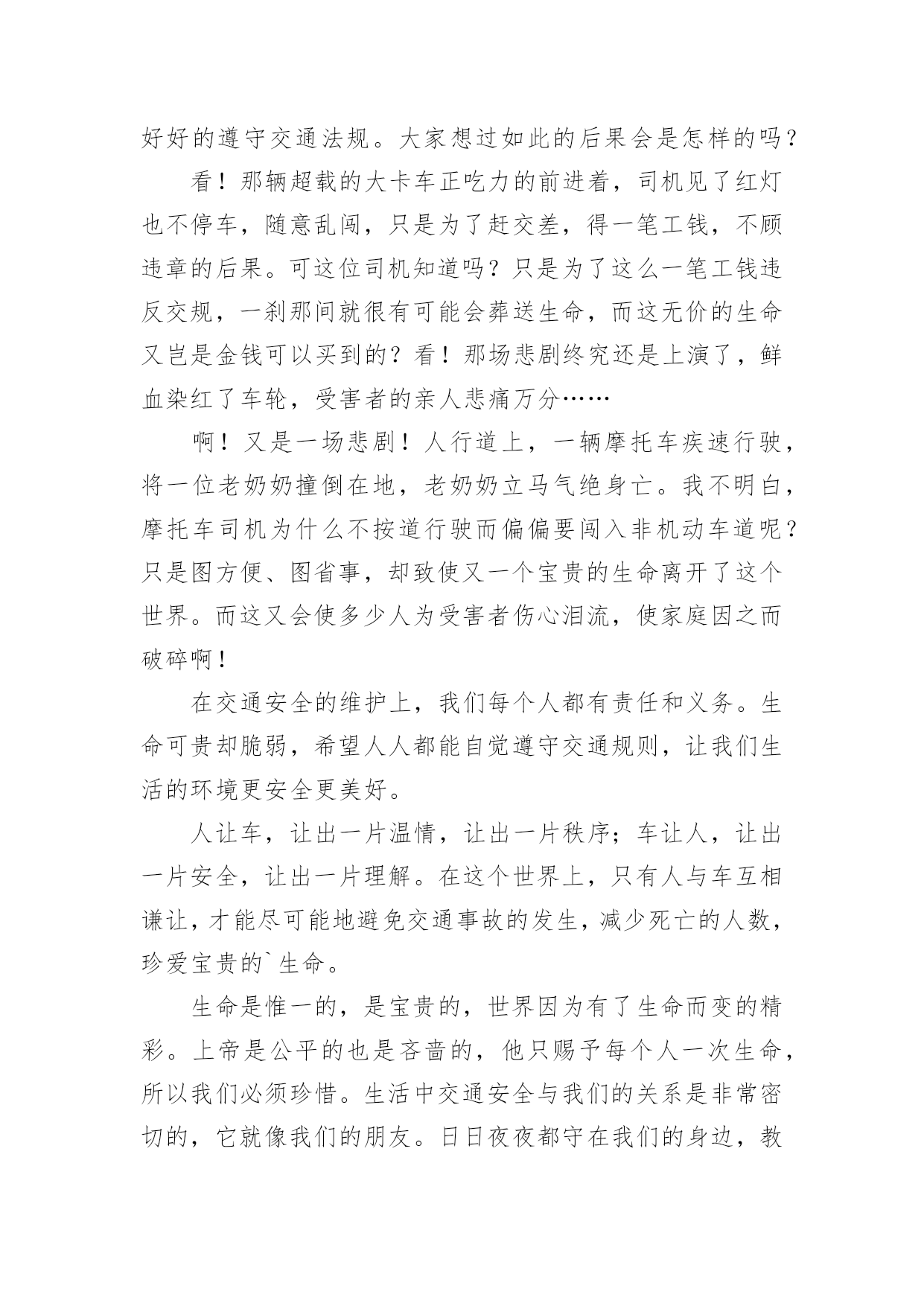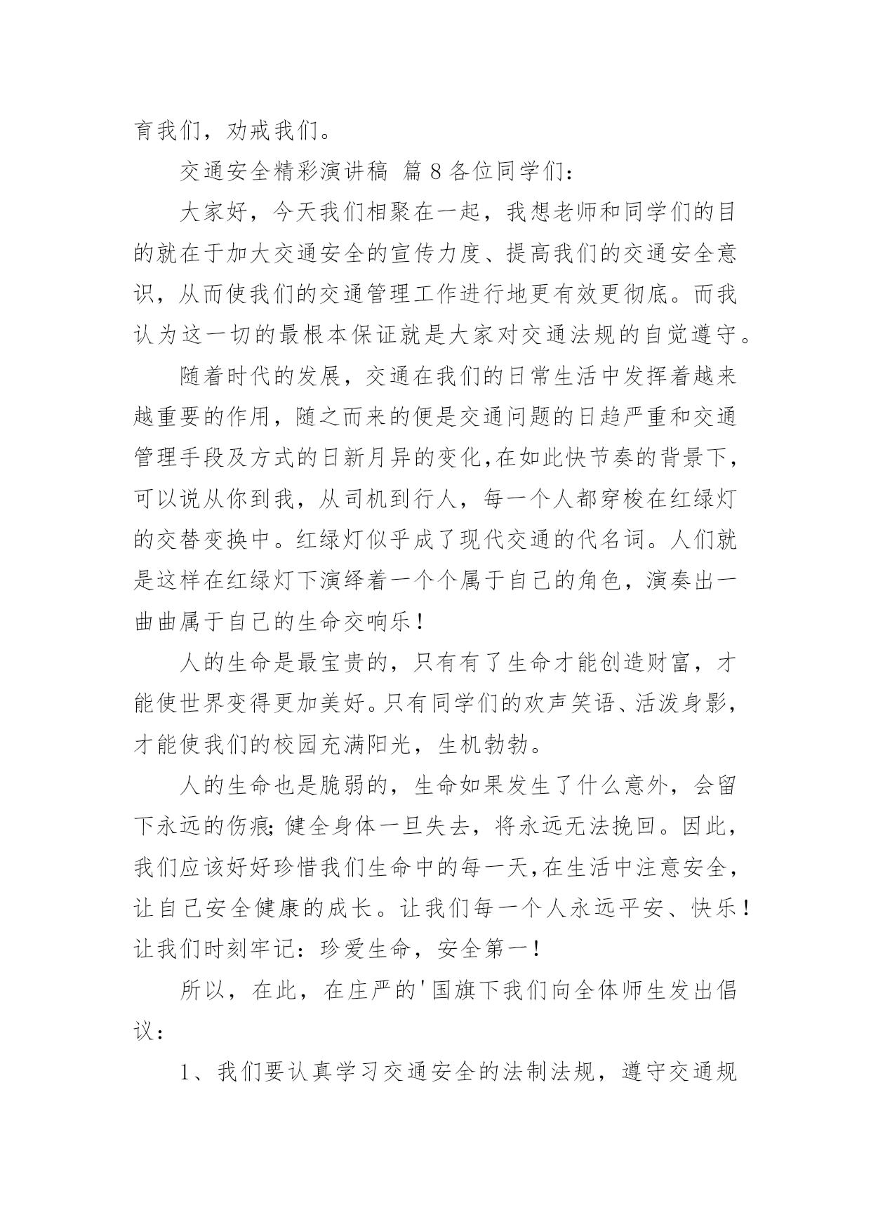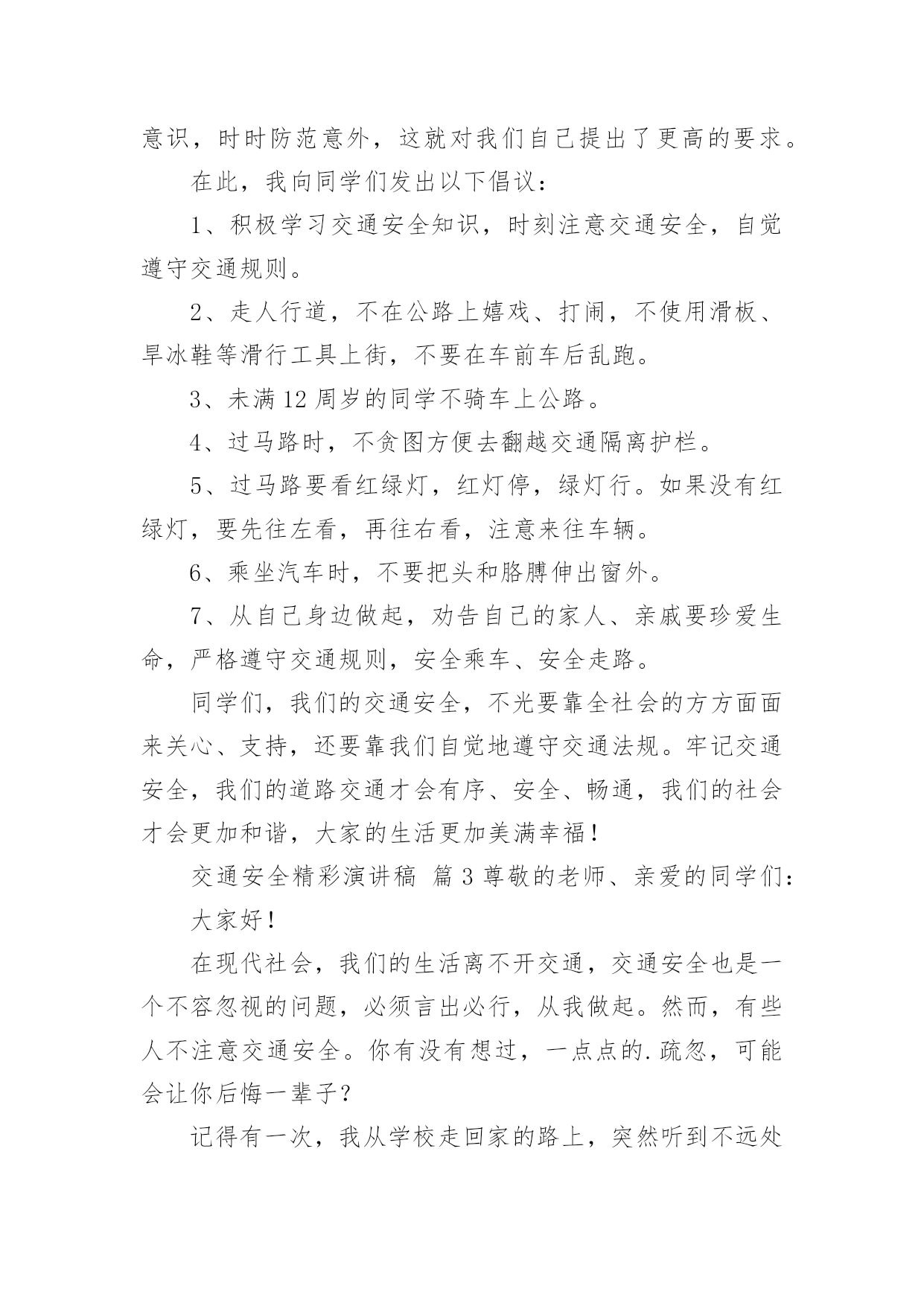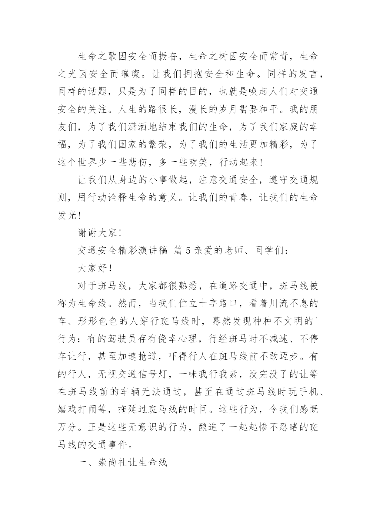 交通安全精彩演讲稿交通安全精彩演讲稿演讲稿是一种实用性比较强的文稿,是为演讲准备的书面材料。在当下社会,很多地方都会使用到演讲稿,为了让您在写演讲稿时更加简单方便,下面是小编帮大家整理的交通安全精彩演讲稿,希望能够帮助到大家。交通安全精彩演讲稿篇1亲爱的老师、同学们:大家好!交通事故时时刻刻都会发生,它就像颗威力十足的炸弹,一时大意,这颗埋伏在我们生活中的炸弹就会爆炸,炸得家庭破碎,炸得人心悲苦。所以我们要遵守交通规则。记得有一次,我在上学的路上,看到一位20多岁的青年男子骑着一辆自行车,由于赶时间,他看到十字路口的红灯亮时,竟不顾生命危险,以飞快的速度向前驶去。这时,有一辆从左往右行驶的大卡车,向他驶来,说时迟,那时快,当司机看到他时,急刹车,但是已经来不及了,大卡车已经撞上了青年男子,把青年男子被大卡车连人带车撞飞到10多米外。那位青年男子由于失血过多,当场死亡。当我亲眼目睹了一条年轻生命的'消失。我心里想,这责任在于谁呢?这显然是那位青年的责任,要是他不闯红灯,要是他不违反交通规则……真可谓是宁等三分,不抢一秒啊。交通事故是那么可怕啊,一刹那间,就夺走了人的生命。现在道路上的车辆越来越多,马路越来越拥挤,同时交通事故也越来越多,每年,有多少的生命被夺走,有多少个家庭被破坏,有多少人要失去亲人了。如果我们每个人心中都有交通规则,每个人都能自觉遵守交通规则。我相信种种事故就不会再发生了,也就不会再出现上面那悲惨的一幕了。生命只有一次,让我们珍惜它吧!让交通法规在我们心中生根吧!让我们牢牢记住:遵守交规,就是珍爱生命!我的演讲完毕,谢谢大家!交通安全精彩演讲稿篇2老师们、同学们:早上好!今天我演讲的主题是《交通安全伴我行》。随着经济的快速增长,汽车数量也相应地剧增,我们能感受到身边这种变化,交通安全是关系到你我他每一个人的切身大事。现在让我们想一想,当你走在马路上的时候,是否有下列的陋习呢?随意穿越马路。不走人行道。对车鸣声充耳不闻、依旧在马路上高谈阔论或者追逐打闹。闯红灯。还有一点很容易被忽视:我们小学生,大多数还没有到法定可以骑着自行车上马路的年龄,你是否也忽视了这一点呢?同学们,当我们违反交通规则的时候,是否考虑到有可能产生严重的不可挽回的后果呢?我们小朋友正处于成长阶段,天真活泼,好奇心强,敢动敢玩,但有时候经验不足,遇到紧急情况容易发慌、不知道怎么办,因而发生交通事故的'可能性要比大人更大。在马路上行走时,首先要有安全意识,时时防范意外,这就对我们自己提出了更高的要求。在此,我向同学们发出以下倡议:1、积极学习交通安全知识,时刻注意交通安全,自觉遵守交通规则。2、走人行道,不在公路上嬉戏、打闹,不使用滑板、旱冰鞋等滑行工具上街,不要在车前车后乱跑。3、未满12周岁的同学不骑车上公路。4、过马路时,不贪图方便去翻越交通隔离护栏。5、过马路要看红绿灯,红灯停,绿灯行。如果没有红绿灯,要先往左看,再往右看,注意来往车辆。6、乘坐汽车时,不要把头和胳膊伸出窗外。7、从自己身边做起,劝告自己的家人、亲戚要珍爱生命,严格遵守交通规则,安全乘车、安全走路。同学们,我们的交通安全,不光要靠全社会的方方面面来关心、支持,还要靠我们自觉地遵守交通法规。牢记交通安全,我们的道路交通才会有序、安全、畅通,我们的社会才会更加和谐,大家的生活更加美满幸福!交通安全精彩演讲稿篇3尊敬的老师、亲爱的同学们:大家好!在现代社会,我们的生活离不开交通,交通安全也是一个不容忽视的问题,必须言出必行,从我做起。然而,有些人不注意交通安全。你有没有想过,一点点的.疏忽,可能会让你后悔一辈子?记得有一次,我从学校走回家的路上,突然听到不远处有“嘘——”的紧急刹车声和撞车声。听说一辆校车和一辆转弯的车相撞,车头撞上了校车尾部,校车的油漆被撞掉了,有的变形了,车的大灯也下来了。当时我的心猛地一抖,心想:校车上那么多学生有多危险!如果司机反应稍微慢一点,含苞待放的小花车可能还没开就被车祸撞死了。一想到这我就吓出一身冷汗。这时候双方业主吵起来了,我也靠近了一点。听说车主身上有股难闻的酒味,显然喝了不少酒。这时,交警也赶到现场处理交通事故。那些酒驾的人,不要让自己的生命徘徊在生死线上;不遵守交通规则的,请遵守交通规则!作为一名小学生,我必须以身作则,严格遵守交通规则。交通安全,从我做起。这是一个迫切的问题。让我们珍惜生命,关注交通安全。交通安全精彩演讲稿篇4亲爱的老师和同学们:大家好!生活,一个鲜活的词,安全,一个古老的话题。目前,交通安全已经成为全世界人民共同关心的重要话题,因为世界上每分钟都有人死于交通事故。人们交通安全意识低、道路基础设施相对滞后、车辆类型混杂、交通秩序混乱等原因造成的交通事故。长期高,交通事故频发。同学们,让大家携起手来,打一场珍惜生命,拒绝