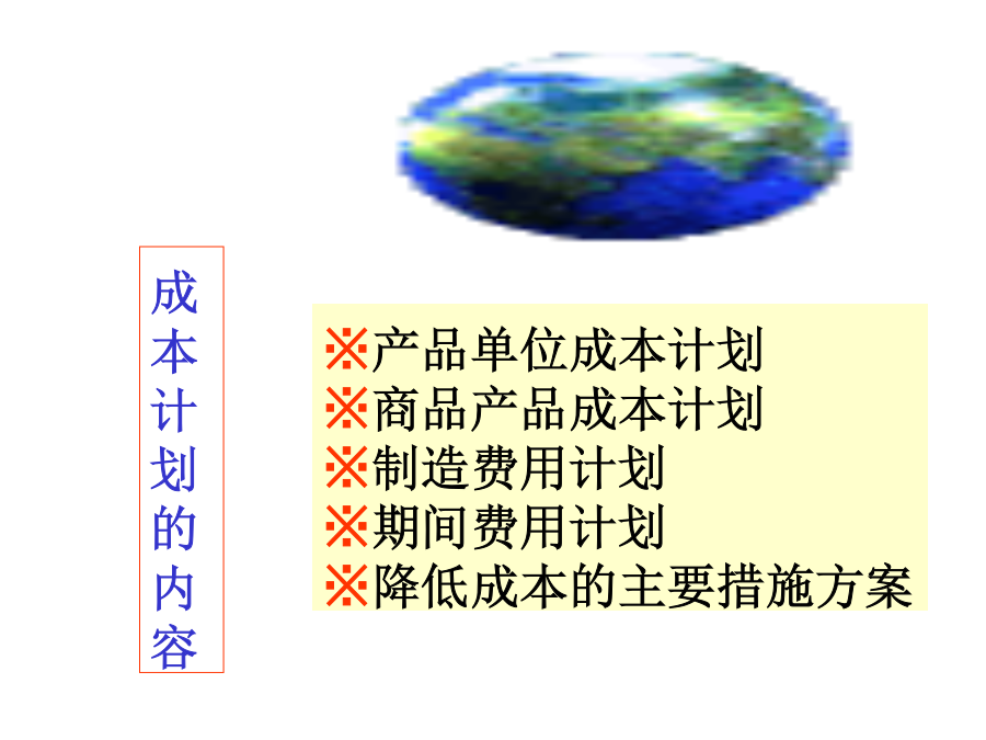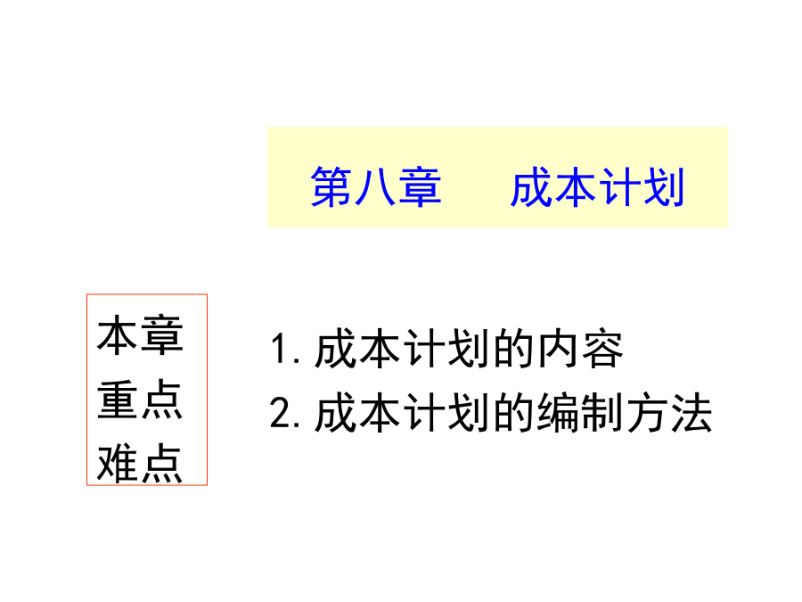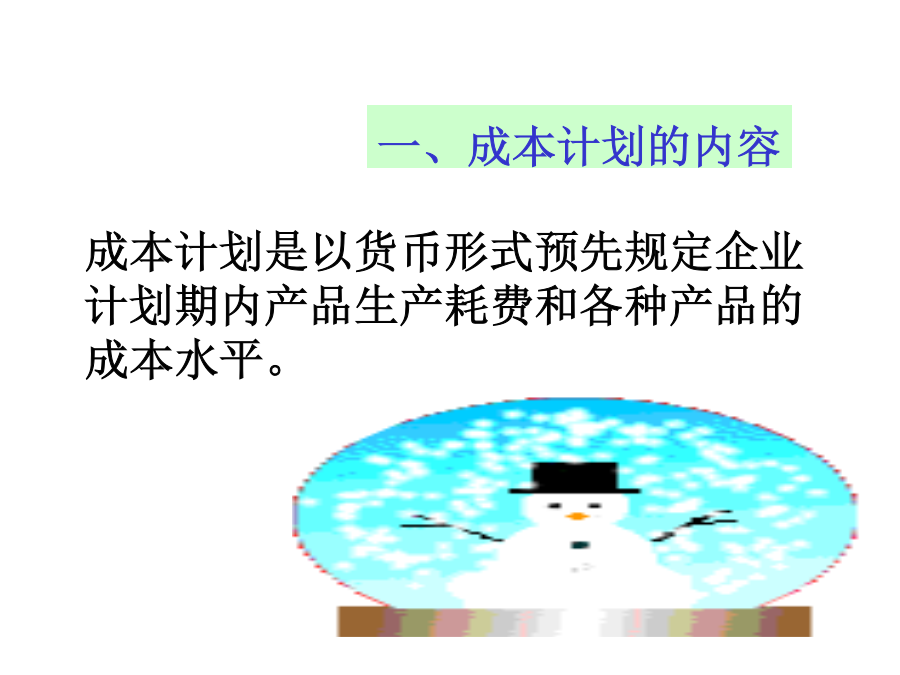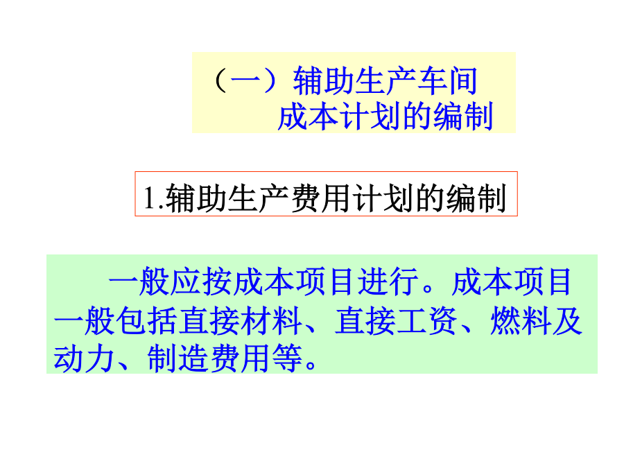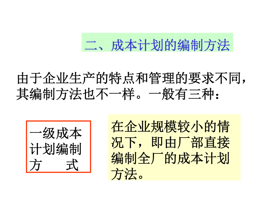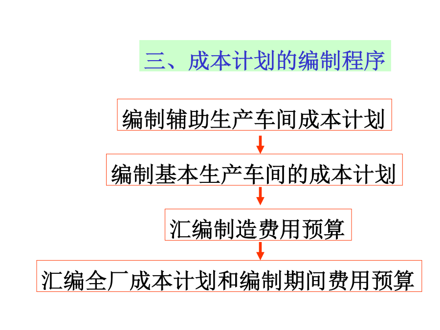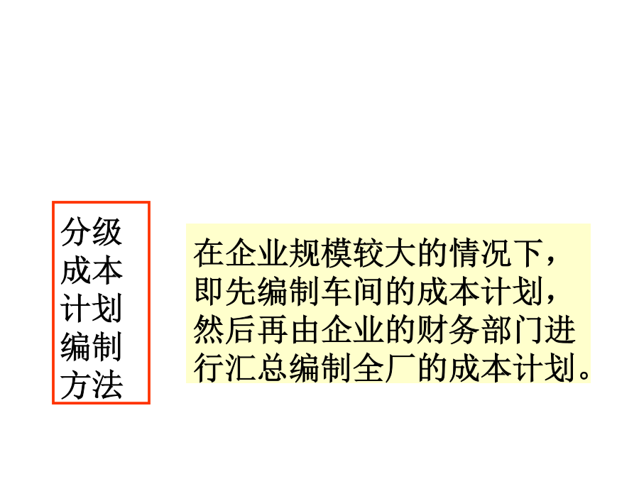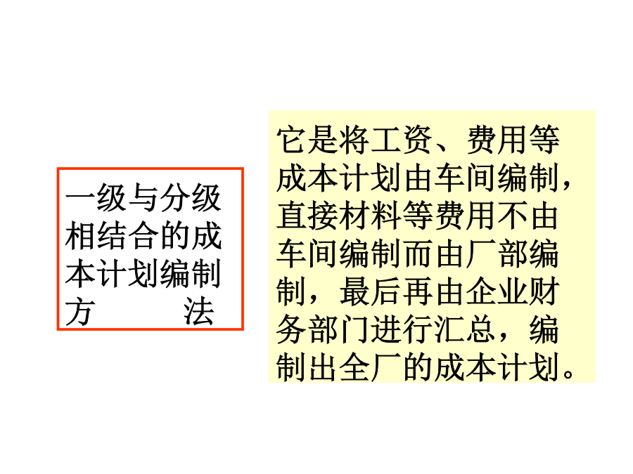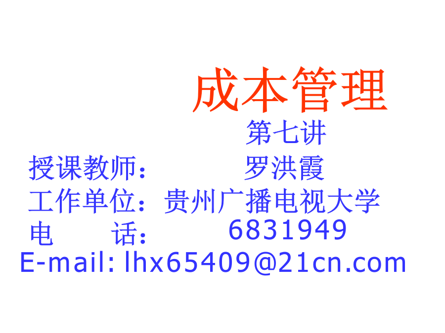 同学们好成本管理第七讲授课教师:罗洪霞工作单位:贵州广播电视大学电话:6831949E-mail:lhx65409@21cn.com第八章成本计划一、成本计划的内容※产品单位成本计划※商品产品成本计划※制造费用计划※期间费用计划※降低成本的主要措施方案二、成本计划的编制方法在企业规模较大的情况下,即先编制车间的成本计划,然后再由企业的财务部门进行汇总编制全厂的成本计划。一级与分级相结合的成本计划编制方法三、成本计划的编制程序(一)辅助生产车间成本计划的编制(1)直接材料、直接工资和燃料及动力的计算方法(2)制造费用计划的计算②③④2.辅助生产费用分配计划的编制在生产一种产品或一种劳务的车间。它所发生的全部费用为直接计入费用,即直接列入到该种产品或劳务的成本中。所以,其分配率的计算公式为:当辅助生产车间生产多种产品或提供多种劳务时在计划单位成本计算出来以后,根据计划单位成本和各车间、部门耗用辅助生产费用的数量,就可以计算出其应分配的辅助生产费用在基本生产车间较多的企业,基本生产成本计划应按每一个车间进行编制。(三)制造费用总预算的编制(四)全厂成本计划的编制全厂商品产品成本计划表按上年实际单位成本计算的总成本可比产品成本计划降低额如果可比产品计划降低任务为50000元,而在上述成本计划中,可比产品成本降低额为52000元,能够完成计划降低任务。所以,可以以此作为正式的成本计划。第九章成本报表一、商品产品成本表的构成及编制(二)商品产品成本表的编制本月总成本本年累计总成本(三)主要产品单位成本表的结构(四)制造费用明细表第十章成本分析1.影响成本分析的基本因素及成本分析的方法;2.因素分析法的计算;3.全部商品产品成本计划完成情况的分析;4.可比产品成本降低任务完成情况的分析;5.主要产品单位成本分析一、影响成本分析的基本因素影响成本分析的基本因素在进行成本分析中,通常采用的技术方法有三种,即:三、因素分析法例如,某企业生产甲产品,本月份产量及其他有关材料费用的资料如下表:分析对象=100000-108000=-8000(元)由于产量变动对材料费用的影响=(2)–(1)=86400-108000=-21600(元)由于材料单价变动对材料费用的影响=200×50×(10-9)=10000(元)四、全部商品产品成本计划完成情况分析1.按产品别分析成本降低额和降低率的计算公式如下:产量及单位成本资料甲产品成本降低额=100×1900-100×2000=-10000全部商品产品成本计划完成情况分析表2.按成本项目分析全部商品产品成本计划成本完成情况分析表五、可比产品成本降务完成情况的分析(一)可比产品成本降低任务完成情况分析所需各项指标:实际成本降低额分析对象:实例分析:假设某企业200×年12份有关可比产品成本资料如下:实际成本资料单位:千元降低额(二)各因素变动对可比产品成本降低任务完成情况的影响产品产量增减,就会使成本降低额发生同比例的增减,但不影响成本降低率的变动。由于各种可比产品成本降低率不同,如果成本降低率大的产品在全部可比产品中所占的比重比计划提高,那么,全部可比产品成本降低率就会多降低,降低额也会相应地多降低;反之降低额和降低率则会少降低。产量变动对成本降低额的影响产品品种结构变动对成本降低额的影响产品品种结构变动对成本降低率的影响=∑产品单位成本变动对成本降低率的影响实例分析:假定某企业某年生产甲、乙两种可比产品,其有关成本资料如下:(2)采用因素分析法计算分析各因素变动对成本降低任务完成情况.1.本年累计总成本计算列表如下:则可比产品成本降低任务完成情况:降低额=实际降低额-计划降低额=2725-1820=905(元)降低率=实际降低率-计划降低率=5.19%-3.684%=1.506%可见,实际降低额比计划降低额多降低905元,实际降低率比计划降低率多降低1.506%,完成了计划任务.2.分析各因素变动对成本降低任务完成的情况各因素变动对成本降低额和降低率的影响:降低额=114+116+675=905降低率=0.221%+1.285%=1.506%四、主要产品单位成本分析各因素变动对材料费用的影响的计算公式如下:例如,某企业生产甲产品,材料项目的有关资料如下表:(2)直接材料受材料耗用量、价格和材料配比三个因素的影响。其计算公式如下:材料配比变动对单位成本的影响=∑材料名称要求:根据上述资料,分析单位产品材料耗用总量、材料配比和材料价格变动对单位成本的影响程度.单位材料消耗总量变动对单位成本的影响(1)在企业采用计时工资制度的情况下,若只生产一种产品,生产工人的工资可直接计入产品成本