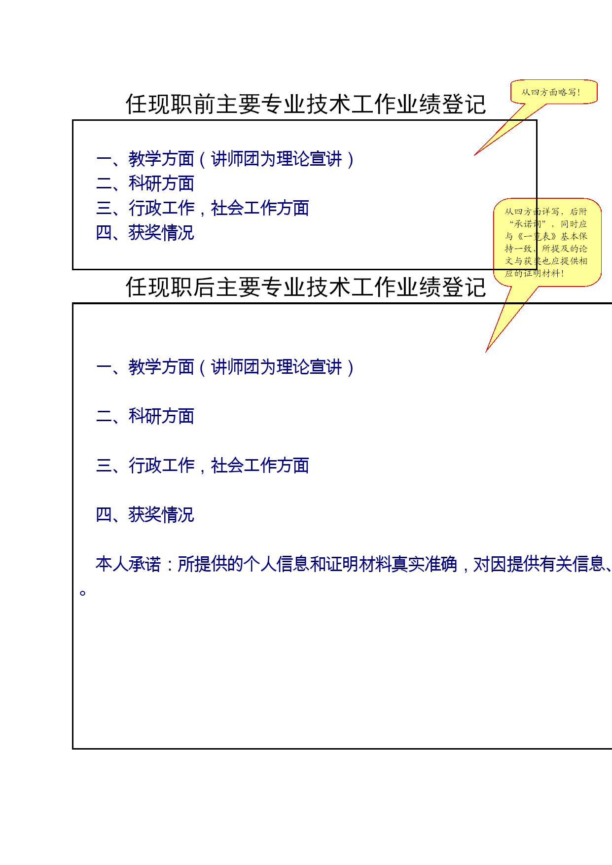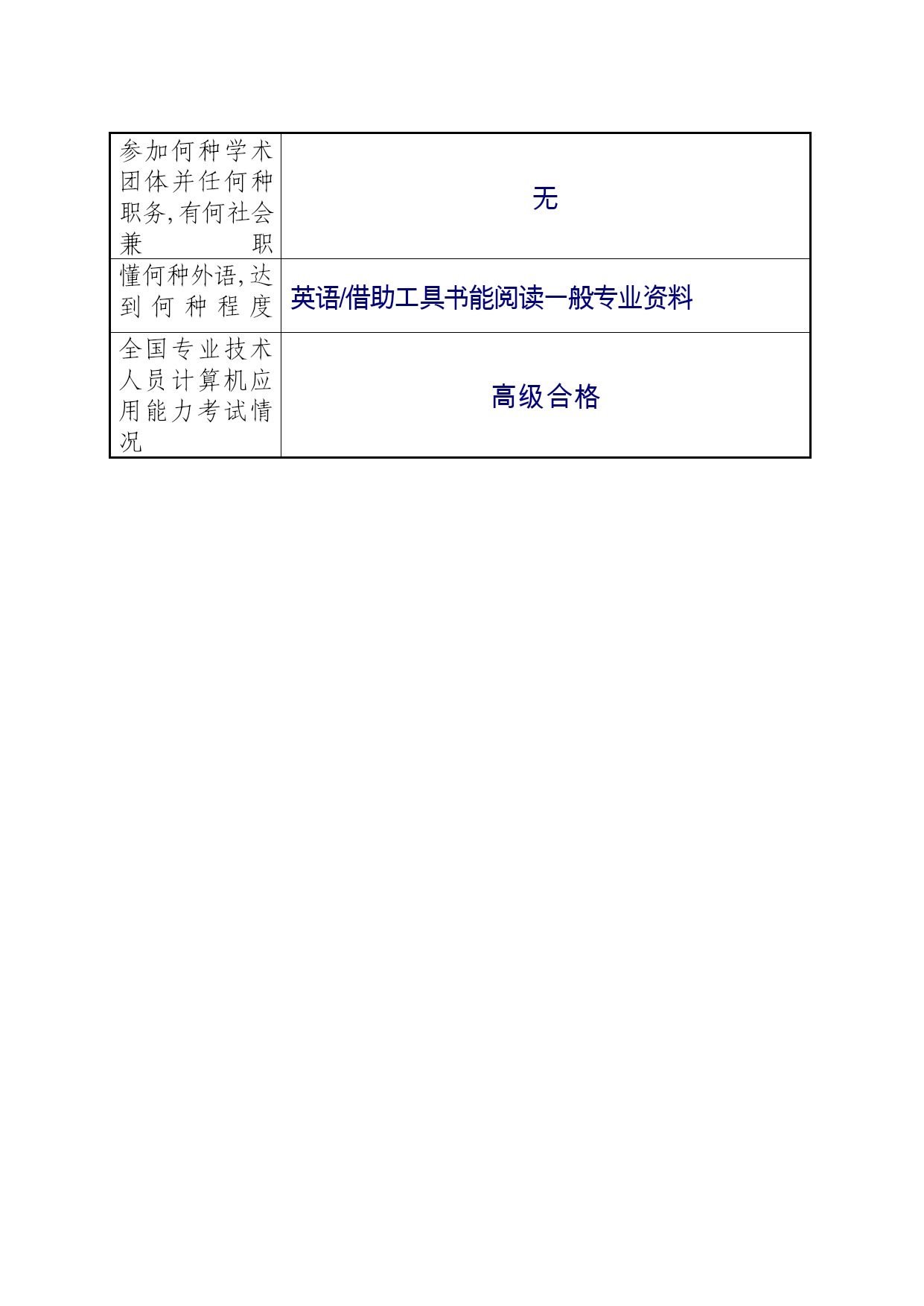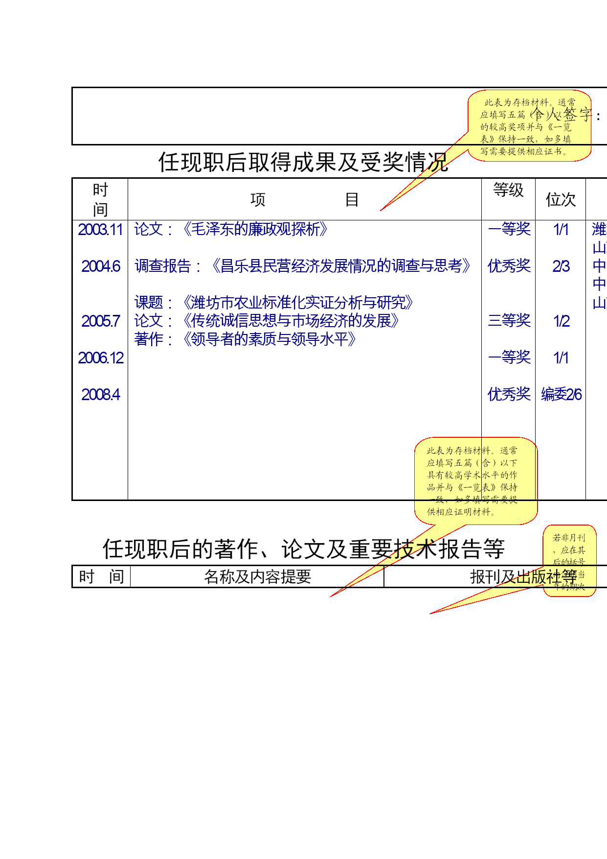 此表只能由人工填写!山东省专业技术职称评审表单位:中共潍坊市奎文区委党校半姓名:陈斌半现任专业技术职务:讲师半申报专业技术职务任职资格:高级讲师半填表时间:2008年9月28日山东省人事厅制填表说明1、本表主要由单位组织填写,基本情况栏目也可由专业技术人员本人填写。2、一律用钢笔或毛笔填写,内容要具体、真实,字迹要工整、清楚。3、经评审委员会评审通过并由主管部门审核公布的,将此表存入本人档案。与《简表》相关内容的填写要求同《简表》。基本情况姓名现名陈斌性别男民族汉贴照片曾用名无出生年月1967.10籍贯山东省诸城市与证书为一致!参加工作时间1989.7身体状况健康学历毕(肄结)业时间学校专业学制学位1989.7昌潍师专教育二无1994.12中共山东省委党校法学三无现专业技术职称、聘任现职务时间及年限讲师/2003.10/5年现从事何种专业技术工作法学教学与科研现任(含兼任)行政职务及任职时间副教育长/2003.12任现职以来各年度考核结果2005年度考核优秀,其它年度为合格任职届满考核结果2003.10-2005.9任期考核合格参加何种学术团体并任何种职务,有何社会兼职无懂何种外语,达到何种程度英语/借助工具书能阅读一般专业资料全国专业技术人员计算机应用能力考试情况高级合格工作经历起止时间单位从事何种专业技术工作职务1989.7-1992.3诸城市繁华中学思想政治教育无1992.4-2003.11中共潍坊市奎文区委党校法学教学与科研无2003.12至今中共潍坊市奎文区委党校法学教学与科研副教育长需有证书证明!学习培训经历(包括参加专业学习、培训、国内外进修等)起止时间专业或主要内容学习地点证明人1991.9-10中学思想政治教育骨干集训昌潍师专李明春1998.12-1999.2邓小平哲学思想山东大学姜伟杰2007.11十七大理论骨干培训中共潍坊市委党校孙晓霏任现职前主要专业技术工作业绩登记从四方面略写!一、教学方面(讲师团为理论宣讲)二、科研方面三、行政工作,社会工作方面四、获奖情况从四方面详写,后附“承诺词”,同时应与《一览表》基本保持一致,所提及的论文与获奖也应提供相应的证明材料!任现职后主要专业技术工作业绩登记一、教学方面(讲师团为理论宣讲)二、科研方面三、行政工作,社会工作方面四、获奖情况本人承诺:所提供的个人信息和证明材料真实准确,对因提供有关信息、证件不实或违反有关规定造成的后果,责任自负。个人签字:陈斌此表为存档材料。通常应填写五篇(含)以下的较高奖项并与《一览表》保持一致,如多填写需要提供相应证书。任现职后取得成果及受奖情况时间项目等级位次批准机关2003.112004.62005.72006.122008.4论文:《毛泽东的廉政观探析》调查报告:《昌乐县民营经济发展情况的调查与思考》课题:《潍坊市农业标准化实证分析与研究》论文:《传统诚信思想与市场经济的发展》著作:《领导者的素质与领导水平》一等奖优秀奖三等奖一等奖优秀奖1/12/31/21/1编委2/6潍坊市优秀社科成果评选委员会山东省委党校优秀科研成果评选委员会中国区域经济发展研究院中国国际教育学会山东领导科学学会此表为存档材料。通常应填写五篇(含)以下具有较高学术水平的作品并与《一览表》保持一致,如多填写需要提供相应证明材料。若非月刊,应在其后的括号内注明当年的期次!任现职后的著作、论文及重要技术报告等时间名称及内容提要报刊及出版社等位次发表于报纸上论文要具体到日!2003.122004.52005.102006.1.32007.3论文:《论悬赏广告的法律效力》著作:《农村合作经济》专著:《中化伦理范畴—慈》论文:《实现公平促进和谐提高效率》课题:《统筹城乡发展建设新型农村》《山东省农业管理干部学院学报》(第6期)黄河出版社中国社会科学出版社《中国改革报》山东省社科规划办课题1/2副主编2/21/12/32/2审查及呈报意见单位意见情况属实,同意上报。(公章)负责人:常务副校长2008年10月8日上级主管部门审查意见同意上报(公章)负责人:区职改办领导2008年10月20日呈报部门意见同意申报(公章)负责人:市职改办领导2008年10月24日评议评审审核意见专业学科组评议意见组长签字:年月日评审委员会意见评委人数参加投票人数表决情况同意票数不同意票数(公章)主任委员签字:年月日主管部门审核意见(公章)年月日备注