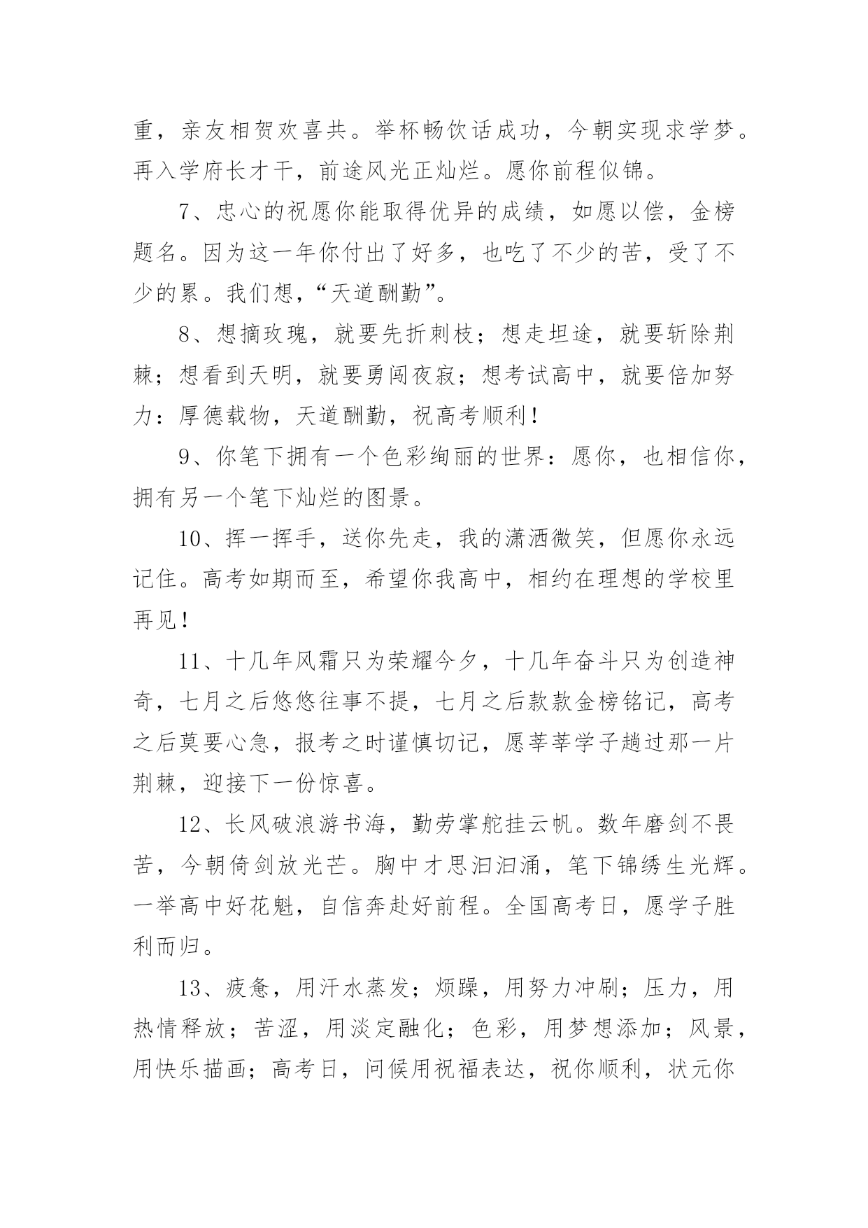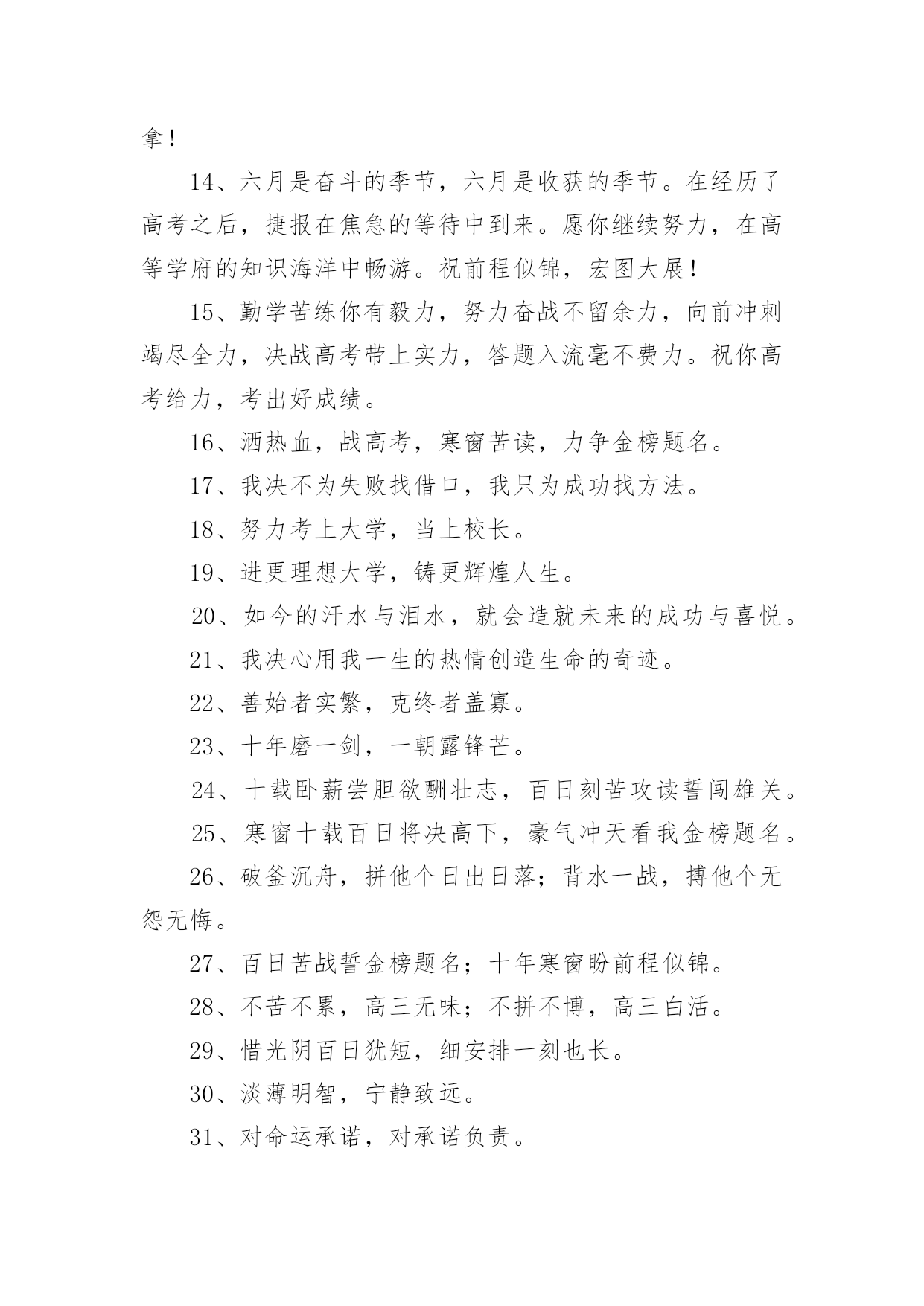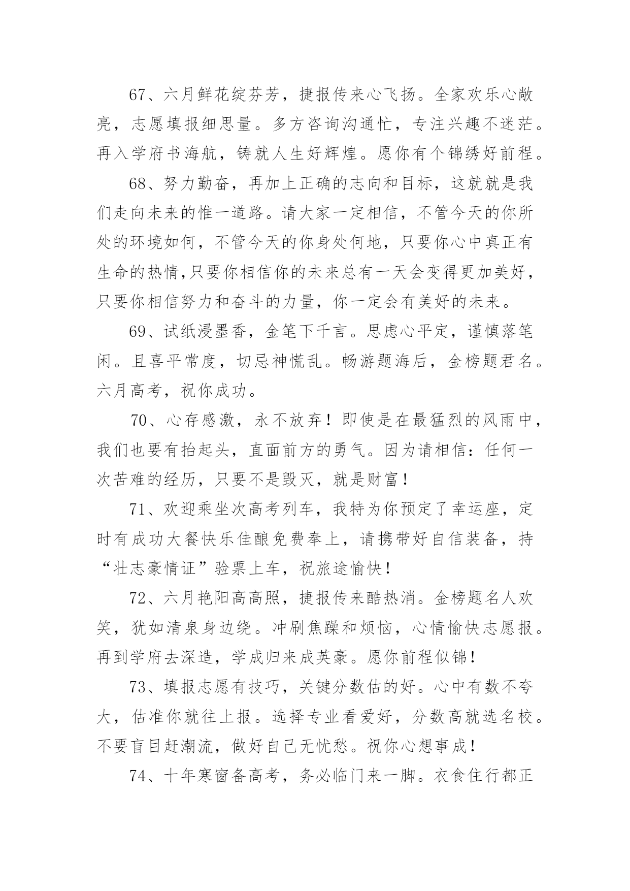 高考寄语简短唯美句子在平时的学习、工作或生活中,大家都尝试过写寄语吧,寄语是人们所传的话语,有时也指自己的期望或是祝福的话语。你会写寄语吗?以下是小编精心整理的高考寄语简短唯美句子,欢迎大家借鉴与参考,希望对大家有所帮助。1、诗书满腹才华高,高考成绩一枝俏,理想没有大和小,真实善良就美好,实现价值光闪耀,成功将会把你绕。祝福你被理想学校录取。2、一份付出十年功,一份坚持一个梦。一朝征战一人行,一笔生金胜宝剑。万千才思似水流,一份考卷圆满完。一举折桂正此时,圆梦成功心甚欢。全国高考日,愿考生们捷报频传。3、高考结束了,捷报传来了,大学开学了,梦想打开了,走进新天地,认识新朋友,祝福短信到,盼望你如鱼得水,学业有成,收获满满,将来造福社会!4、曾经我也面对高考,现在有点旁观咯,祝福他们吧,现实象个石头,精神象个蛋,石头虽然坚硬,可蛋才就就是生命。5、大考小考几十遭,放松心态微微笑;量力而为不拔苗,人生道路千万条;你走你的阳光道,我过我的独木桥;考好考差已尽心,坦然面对无烦扰。祝高考顺利!6、六月花开香气浓,捷报翩翩别样红。快乐蔓延数万重,亲友相贺欢喜共。举杯畅饮话成功,今朝实现求学梦。再入学府长才干,前途风光正灿烂。愿你前程似锦。7、忠心的祝愿你能取得优异的成绩,如愿以偿,金榜题名。因为这一年你付出了好多,也吃了不少的苦,受了不少的累。我们想,“天道酬勤”。8、想摘玫瑰,就要先折刺枝;想走坦途,就要斩除荆棘;想看到天明,就要勇闯夜寂;想考试高中,就要倍加努力:厚德载物,天道酬勤,祝高考顺利!9、你笔下拥有一个色彩绚丽的世界:愿你,也相信你,拥有另一个笔下灿烂的图景。10、挥一挥手,送你先走,我的潇洒微笑,但愿你永远记住。高考如期而至,希望你我高中,相约在理想的学校里再见!11、十几年风霜只为荣耀今夕,十几年奋斗只为创造神奇,七月之后悠悠往事不提,七月之后款款金榜铭记,高考之后莫要心急,报考之时谨慎切记,愿莘莘学子趟过那一片荆棘,迎接下一份惊喜。12、长风破浪游书海,勤劳掌舵挂云帆。数年磨剑不畏苦,今朝倚剑放光芒。胸中才思汩汩涌,笔下锦绣生光辉。一举高中好花魁,自信奔赴好前程。全国高考日,愿学子胜利而归。13、疲惫,用汗水蒸发;烦躁,用努力冲刷;压力,用热情释放;苦涩,用淡定融化;色彩,用梦想添加;风景,用快乐描画;高考日,问候用祝福表达,祝你顺利,状元你拿!14、六月是奋斗的季节,六月是收获的季节。在经历了高考之后,捷报在焦急的等待中到来。愿你继续努力,在高等学府的知识海洋中畅游。祝前程似锦,宏图大展!15、勤学苦练你有毅力,努力奋战不留余力,向前冲刺竭尽全力,决战高考带上实力,答题入流毫不费力。祝你高考给力,考出好成绩。16、洒热血,战高考,寒窗苦读,力争金榜题名。17、我决不为失败找借口,我只为成功找方法。18、努力考上大学,当上校长。19、进更理想大学,铸更辉煌人生。20、如今的汗水与泪水,就会造就未来的成功与喜悦。21、我决心用我一生的热情创造生命的奇迹。22、善始者实繁,克终者盖寡。23、十年磨一剑,一朝露锋芒。24、十载卧薪尝胆欲酬壮志,百日刻苦攻读誓闯雄关。25、寒窗十载百日将决高下,豪气冲天看我金榜题名。26、破釜沉舟,拼他个日出日落;背水一战,搏他个无怨无悔。27、百日苦战誓金榜题名;十年寒窗盼前程似锦。28、不苦不累,高三无味;不拼不博,高三白活。29、惜光阴百日犹短,细安排一刻也长。30、淡薄明智,宁静致远。31、对命运承诺,对承诺负责。32、矢志不移,决战高考。33、高考口号:百日冲刺战高考;一鼓作气创辉煌。34、竞则进,颓则退,不进则退!35、讲究方法,保质保量;顽强拼搏,不弃不放。36、高考寄语简短37、遵循生活规律,保持良好心态。38、人好学,虽死犹存;不学者,虽存犹灭39、脚踏实地沉着备战,相信自己相信未来。40、莫找借口失败,只找理由成功。41、任何的限制,都是从自己的内心开始的。42、人格自尊,行为自律,学习自主,生活自理。43、天行健,君子以自强不息!44、低头需要勇气,抬头需要实力;低头做事,抬头做人!9有来路,没退路;留退路,是绝路。45、面对目标,信心百倍,人生能有几次搏?面对成绩,心胸豁达,条条大路通罗马。46、找到差距是一种水平,承认差距是一种气度,缩小差距是一种能力。47、我自信,我出色:我拼搏,我成功!48、把握现在就是创造未来。49、看清楚,想透彻,答准每道题。50、今日寒窗苦读,必定有我;明朝独占熬头,舍我其谁?16对命运承诺,对承诺负责51、既然选择了远方,便只顾风雨兼程!52、没有平日的失败,就没有最终的成功。重要的是分析失败原因并吸取教训。53、学中进,搏中胜。54、不想当将军的士兵不是好士兵,不想考清华的学生不是好学生!55、不问收获,但问耕耘!天道酬勤。56、百