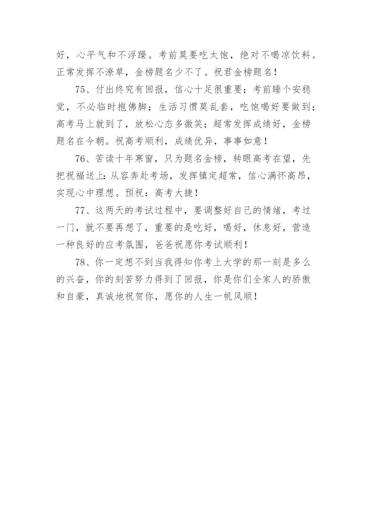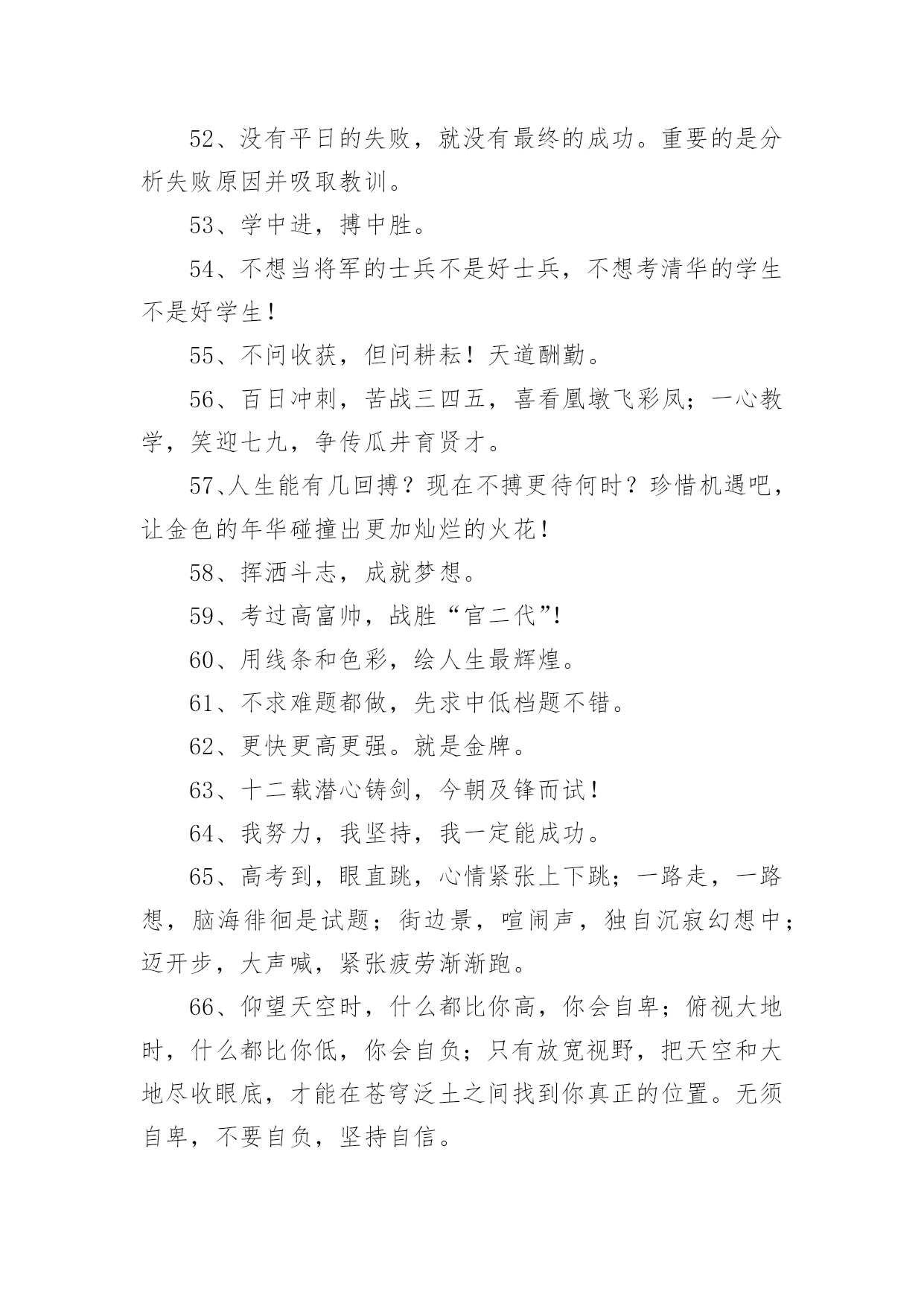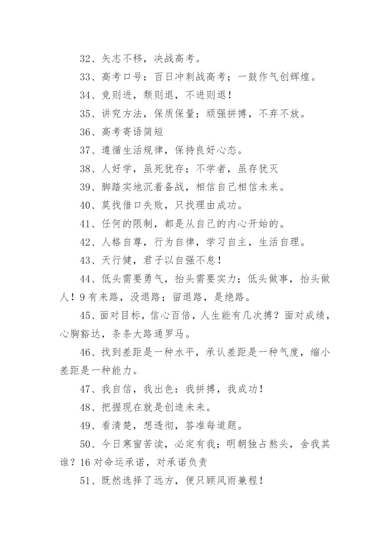 高考寄语简短唯美句子在平时的学习、工作或生活中,大家都尝试过写寄语吧,寄语是人们所传的话语,有时也指自己的期望或是祝福的话语。你会写寄语吗?以下是小编精心整理的高考寄语简短唯美句子,欢迎大家借鉴与参考,希望对大家有所帮助。1、诗书满腹才华高,高考成绩一枝俏,理想没有大和小,真实善良就美好,实现价值光闪耀,成功将会把你绕。祝福你被理想学校录取。2、一份付出十年功,一份坚持一个梦。一朝征战一人行,一笔生金胜宝剑。万千才思似水流,一份考卷圆满完。一举折桂正此时,圆梦成功心甚欢。全国高考日,愿考生们捷报频传。3、高考结束了,捷报传来了,大学开学了,梦想打开了,走进新天地,认识新朋友,祝福短信到,盼望你如鱼得水,学业有成,收获满满,将来造福社会!4、曾经我也面对高考,现在有点旁观咯,祝福他们吧,现实象个石头,精神象个蛋,石头虽然坚硬,可蛋才就就是生命。5、大考小考几十遭,放松心态微微笑;量力而为不拔苗,人生道路千万条;你走你的阳光道,我过我的独木桥;考好考差已尽心,坦然面对无烦扰。祝高考顺利!6、六月花开香气浓,捷报翩翩别样红。快乐蔓延数万重,亲友相贺欢喜共。举杯畅饮话成功,今朝实现求学梦。再入学府长才干,前途风光正灿烂。愿你前程似锦。7、忠心的祝愿你能取得优异的成绩,如愿以偿,金榜题名。因为这一年你付出了好多,也吃了不少的苦,受了不少的累。我们想,“天道酬勤”。8、想摘玫瑰,就要先折刺枝;想走坦途,就要斩除荆棘;想看到天明,就要勇闯夜寂;想考试高中,就要倍加努力:厚德载物,天道酬勤,祝高考顺利!9、你笔下拥有一个色彩绚丽的世界:愿你,也相信你,拥有另一个笔下灿烂的图景。10、挥一挥手,送你先走,我的潇洒微笑,但愿你永远记住。高考如期而至,希望你我高中,相约在理想的学校里再见!11、十几年风霜只为荣耀今夕,十几年奋斗只为创造神奇,七月之后悠悠往事不提,七月之后款款金榜铭记,高考之后莫要心急,报考之时谨慎切记,愿莘莘学子趟过那一片荆棘,迎接下一份惊喜。12、长风破浪游书海,勤劳掌舵挂云帆。数年磨剑不畏苦,今朝倚剑放光芒。胸中才思汩汩涌,笔下锦绣生光辉。一举高中好花魁,自信奔赴好前程。全国高考日,愿学子胜利而归。13、疲惫,用汗水蒸发;烦躁,用努力冲刷;压力,用热情释放;苦涩,用淡定融化;色彩,用梦想添加;风景,用快乐描画;高考日,问候用祝福表达,祝你顺利,状元你拿!14、六月是奋斗的季节,六月是收获的季节。在经历了高考之后,捷报在焦急的等待中到来。愿你继续努力,在高等学府的知识海洋中畅游。祝前程似锦,宏图大展!15、勤学苦练你有毅力,努力奋战不留余力,向前冲刺竭尽全力,决战高考带上实力,答题入流毫不费力。祝你高考给力,考出好成绩。16、洒热血,战高考,寒窗苦读,力争金榜题名。17、我决不为失败找借口,我只为成功找方法。18、努力考上大学,当上校长。19、进更理想大学,铸更辉煌人生。20、如今的汗水与泪水,就会造就未来的成功与喜悦。21、我决心用我一生的热情创造生命的奇迹。22、善始者实繁,克终者盖寡。23、十年磨一剑,一朝露锋芒。24、十载卧薪尝胆欲酬壮志,百日刻苦攻读誓闯雄关。25、寒窗十载百日将决高下,豪气冲天看我金榜题名。26、破釜沉舟,拼他个日出日落;背水一战,搏他个无怨无悔。27、百日苦战誓金榜题名;十年寒窗盼前程似锦。28、不苦不累,高三无味;不拼不博,高三白活。29、惜光阴百日犹短,细安排一刻也长。30、淡薄明智,宁静致远。31、对命运承诺,对承诺负责。32、矢志不移,决战高考。33、高考口号:百日冲刺战高考;一鼓作气创辉煌。34、竞则进,颓则退,不进则退!35、讲究方法,保质保量;顽强拼搏,不弃不放。36、高考寄语简短37、遵循生活规律,保持良好心态。38、人好学,虽死犹存;不学者,虽存犹灭39、脚踏实地沉着备战,相信自己相信未来。40、莫找借口失败,只找理由成功。41、任何的限制,都是从自己的内心开始的。42、人格自尊,行为自律,学习自主,生活自理。43、天行健,君子以自强不息!44、低头需要勇气,抬头需要实力;低头做事,抬头做人!9有来路,没退路;留退路,是绝路。45、面对目标,信心百倍,人生能有几次搏?面对成绩,心胸豁达,条条大路通罗马。46、找到差距是一种水平,承认差距是一种气度,缩小差距是一种能力。47、我自信,我出色:我拼搏,我成功!48、把握现在就是创造未来。49、看清楚,想透彻,答准每道题。50、今日寒窗苦读,必定有我;明朝独占熬头,舍我其谁?16对命运承诺,对承诺负责51、既然选择了远方,便只顾风雨兼程!52、没有平日的失败,就没有最终的成功。重要的是分析失败原因并吸取教训。53、学中进,搏中胜。54、不想当将军的士兵不是好士兵,不想考清华的学生不是好学生!55、不问收获,但问耕耘!天道酬勤。56、百