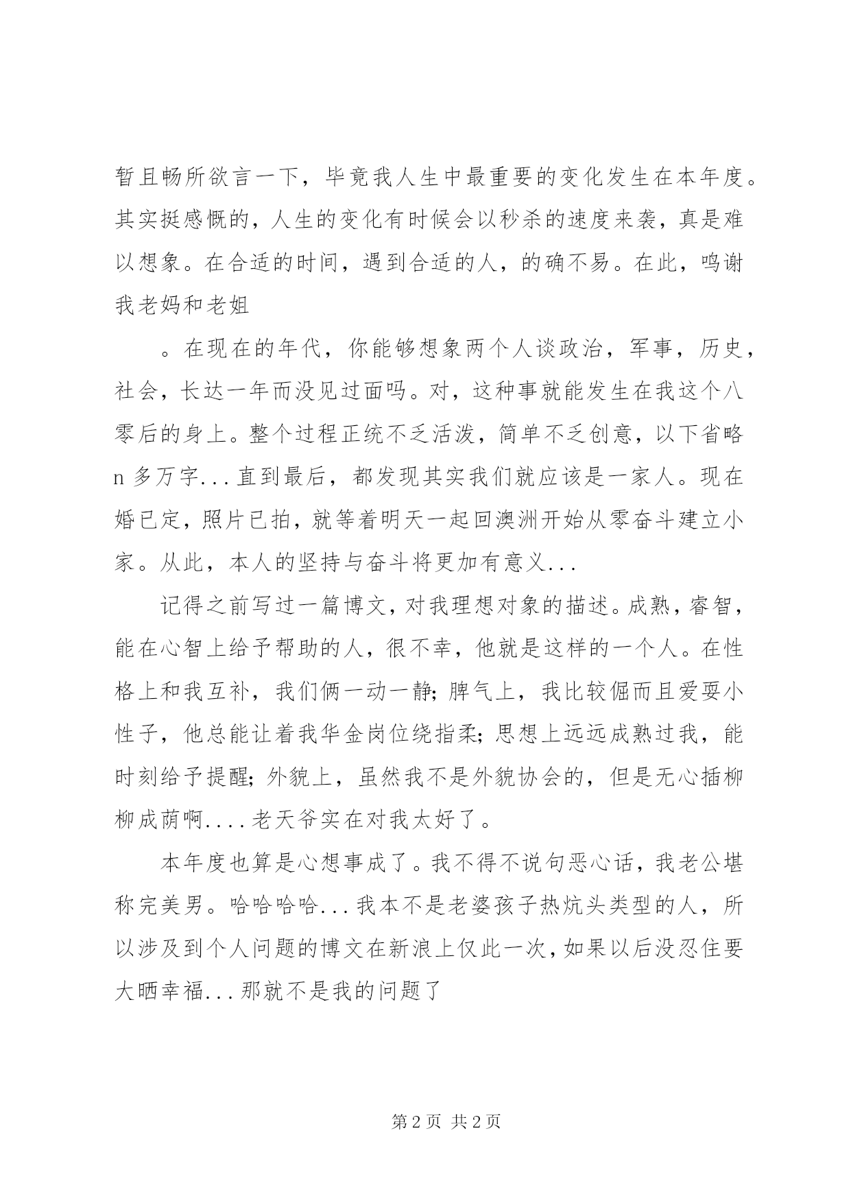 第PAGE\*Arabic\*MERGEFORMAT2页共NUMPAGES\*MERGEFORMAT2页年度个人生活总结今天做总结虽然有点早,但是对我来说是最合适的,因为从明天开始我的人生将进入一个崭新的篇章。本年度是最折腾的一年短短的时间经历了两个性质完全不同的工作,也经历了心理上的折磨,更加明确了自己的方向。终于明白了,原来这个世界上不是所有人都能像自己一样守信用,说话原来可以像开空头支票一样虚无缥缈。以往自己心无城府,太容易相信人,傻憨傻憨的总是把一切想得太完美了,吃亏后才发现,世界上有的是无法兑现的承诺。不过我始终觉得吃亏是福,作为我自己来说,无论做什么事情,尽力做到最好总是不会错的,别人负我可以,我绝不负人。幸亏老天爷让我脱离了苦海,我才发现了更加美好的大千世界。虽然经历了一段时间心智的折磨,我认为总体来说还是值得的,人只有在逆境中才会成长,总结自己的方向,当现实与理想有差别的时候,我们只能通过分析去调整自己,有了一次挫折的经历,我终于找到了自己的目标,而且有了很清晰的思路,终于让我在第二分工作中尝到了一点甜头,确信自己的想法没有错误,并且完美的完成了第二份工作。我想接下来应该会渐入佳境越来越好。本年度最大的收获是找到了另一半我从来不在博客里谈到私人话题,不过既然做年度总结,就暂且畅所欲言一下,毕竟我人生中最重要的变化发生在本年度。其实挺感慨的,人生的变化有时候会以秒杀的速度来袭,真是难以想象。在合适的时间,遇到合适的人,的确不易。在此,鸣谢我老妈和老姐。在现在的年代,你能够想象两个人谈政治,军事,历史,社会,长达一年而没见过面吗。对,这种事就能发生在我这个八零后的身上。整个过程正统不乏活泼,简单不乏创意,以下省略n多万字...直到最后,都发现其实我们就应该是一家人。现在婚已定,照片已拍,就等着明天一起回澳洲开始从零奋斗建立小家。从此,本人的坚持与奋斗将更加有意义...记得之前写过一篇博文,对我理想对象的描述。成熟,睿智,能在心智上给予帮助的人,很不幸,他就是这样的一个人。在性格上和我互补,我们俩一动一静;脾气上,我比较倔而且爱耍小性子,他总能让着我华金岗位绕指柔;思想上远远成熟过我,能时刻给予提醒;外貌上,虽然我不是外貌协会的,但是无心插柳柳成荫啊....老天爷实在对我太好了。本年度也算是心想事成了。我不得不说句恶心话,我老公堪称完美男。哈哈哈哈...我本不是老婆孩子热炕头类型的人,所以涉及到个人问题的博文在新浪上仅此一次,如果以后没忍住要大晒幸福...那就不是我的问题了